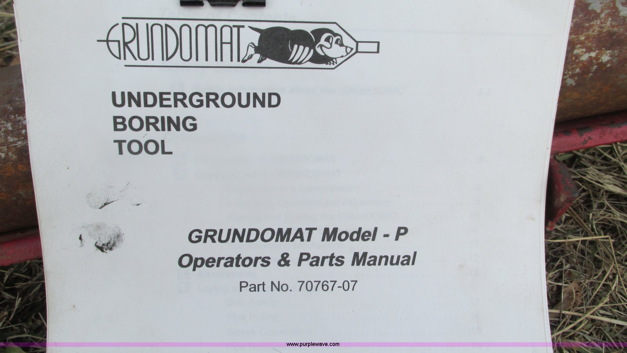 Purple Wave is selling a used Pipe Pusher or Piercing Mole in Missouri. This item is a Grundomat P underground boring tool with the following: Pneumatic driven, Operations and parts manuals