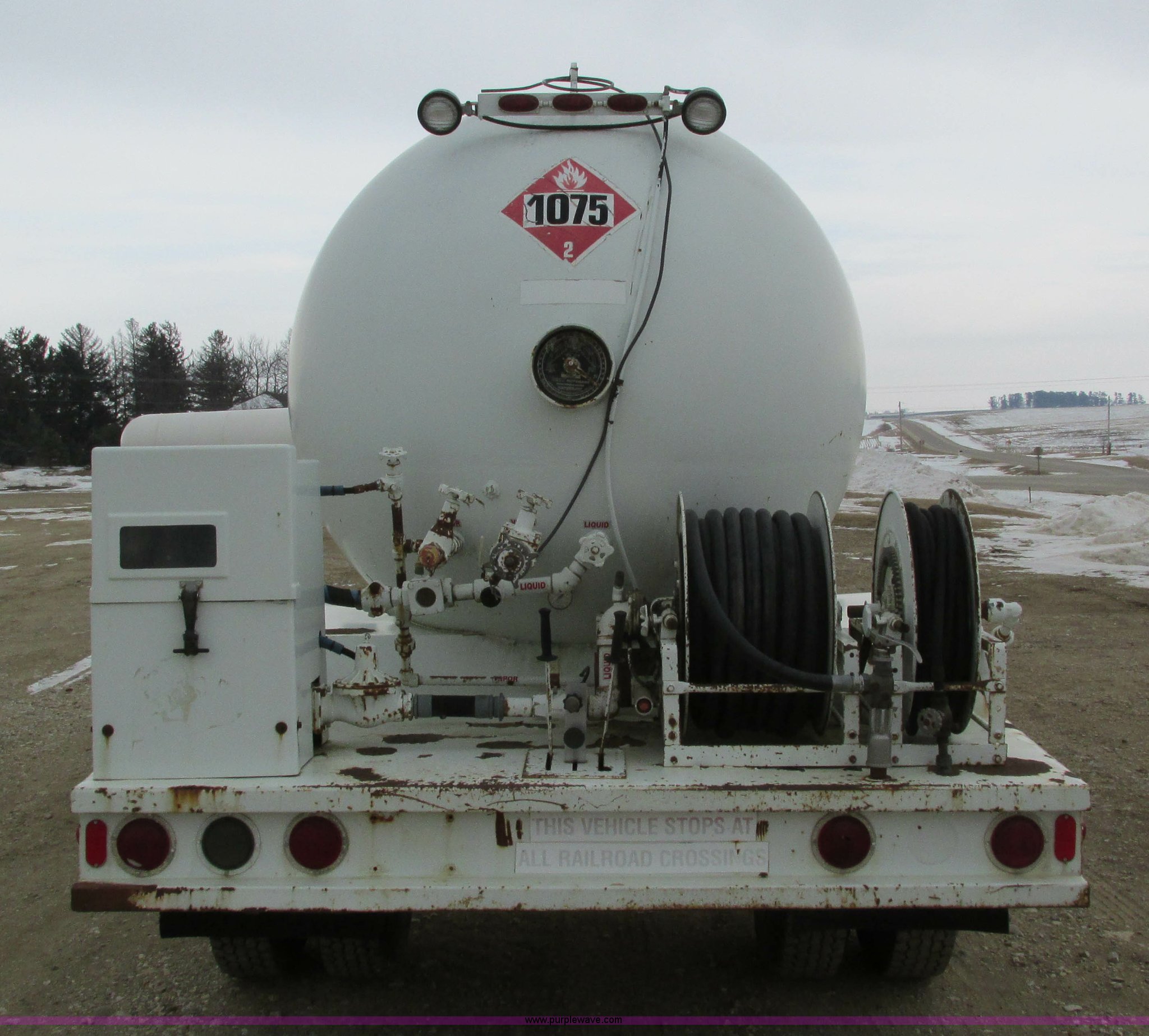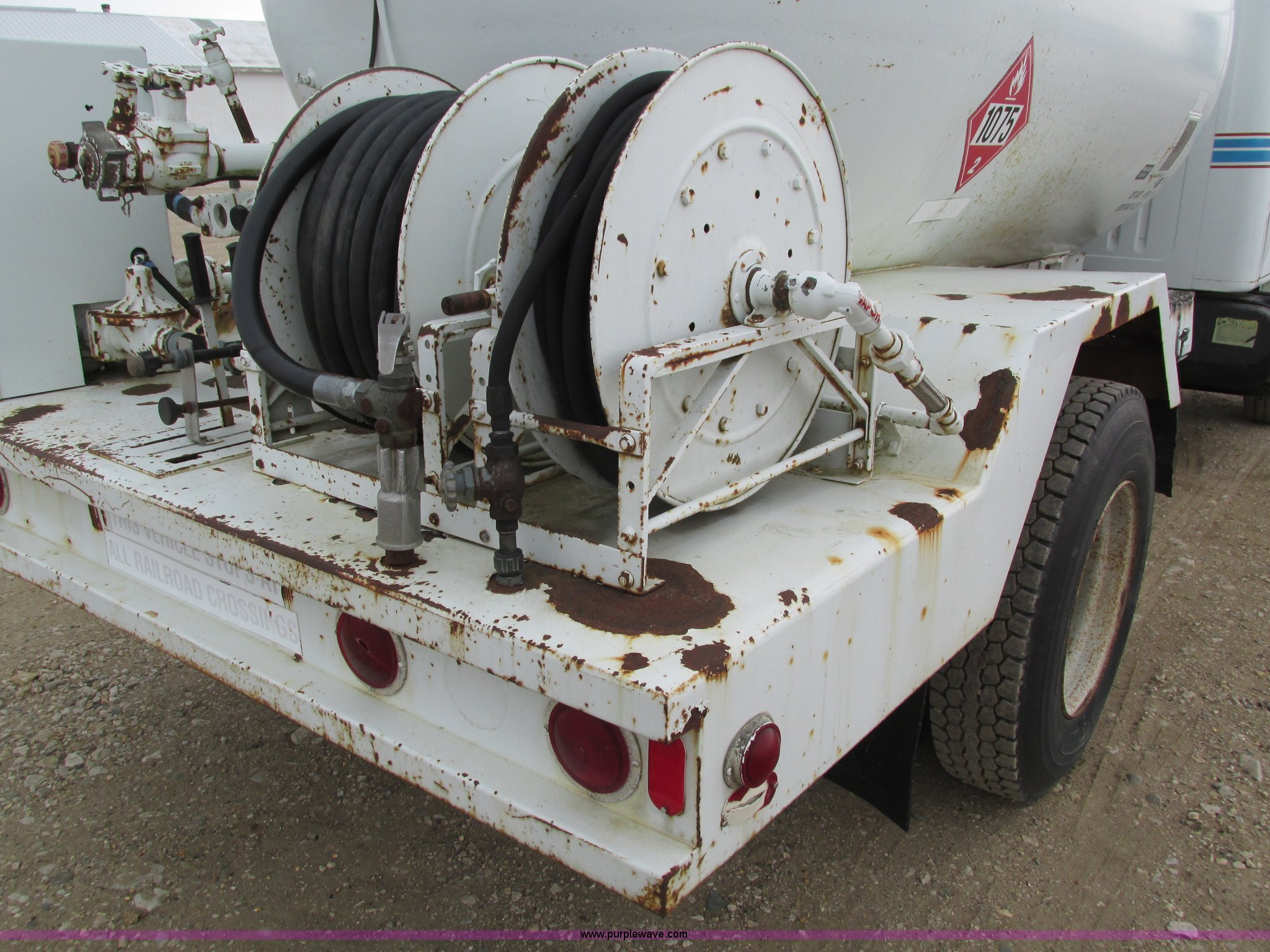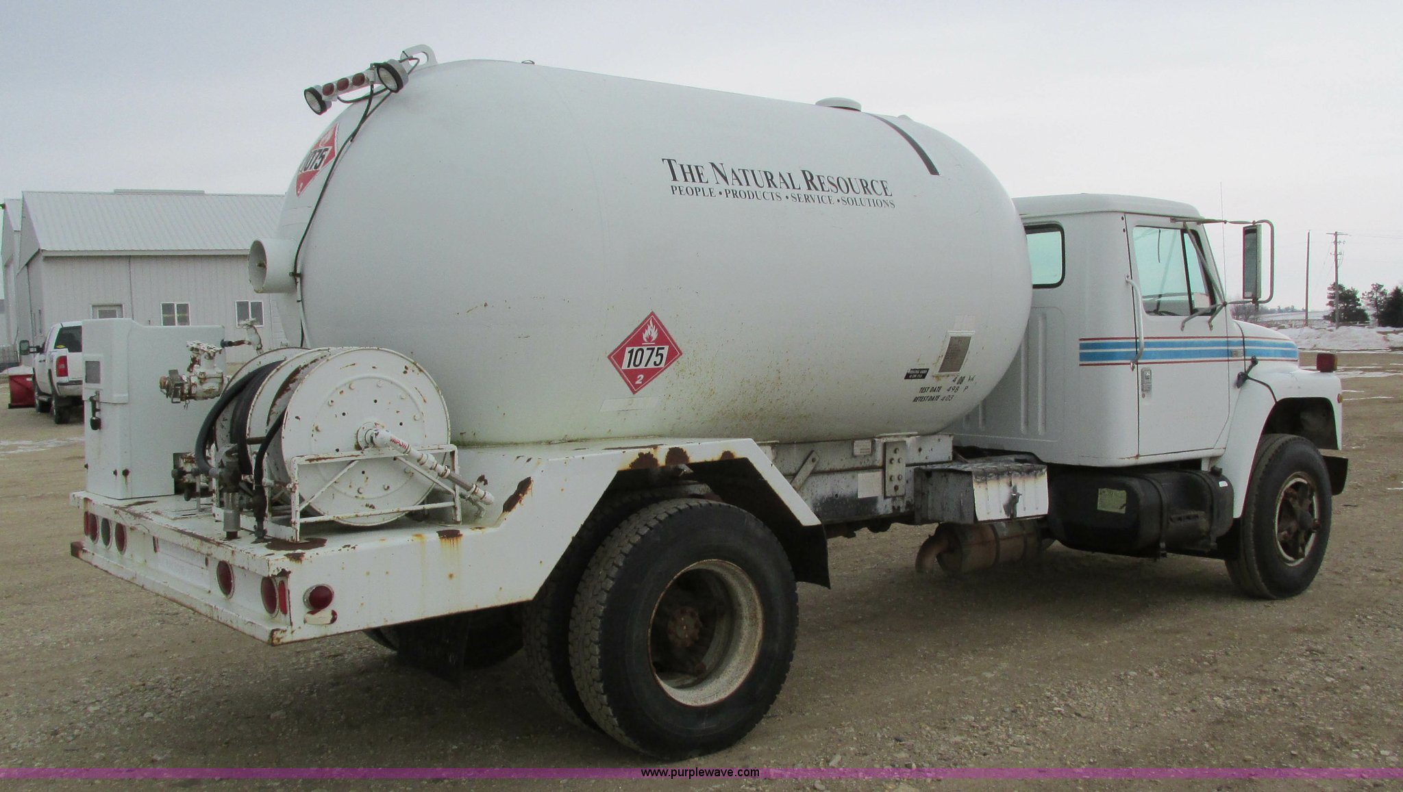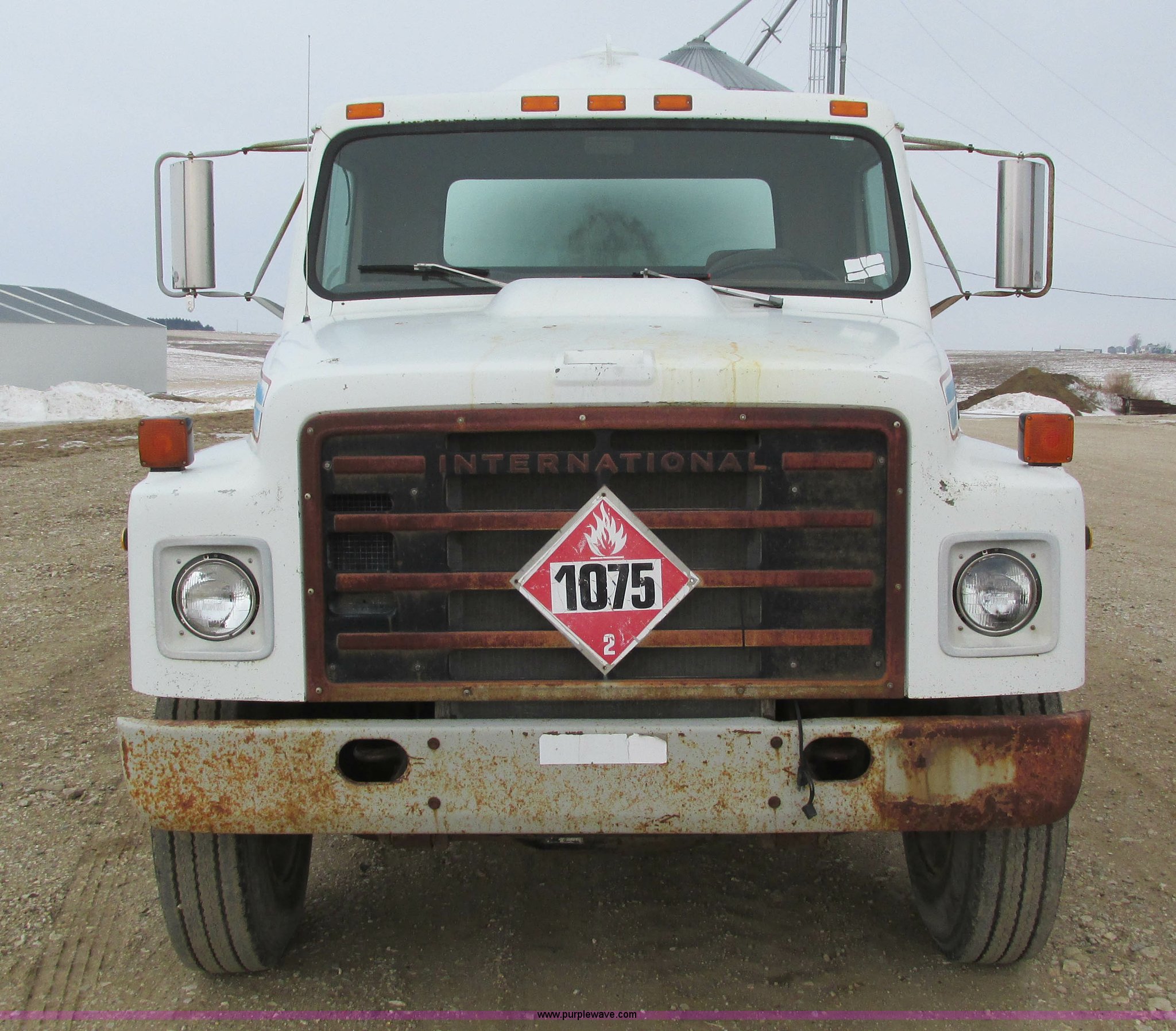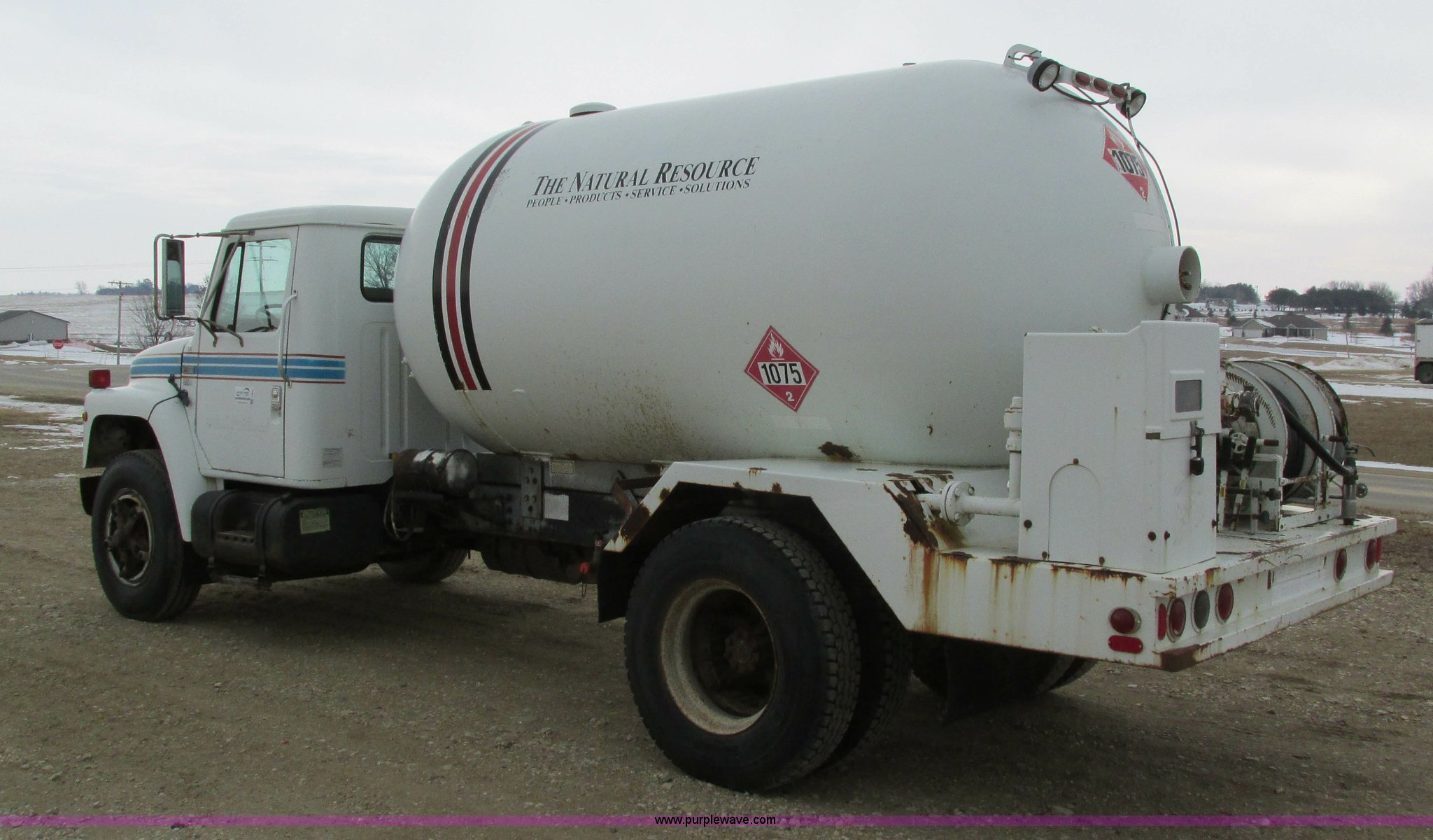 Purple Wave is selling a used Fuel Truck in Iowa. This item is a 1986 International 1754 propane delivery truck with the following: 134,000 miles on odometer, International eight cylinder diesel engine, Spcier Double Duty D five speed manual transmission, Two speed rear end, Heat, AM, Spring suspension seat, Arrow propane tank, 2,500 gallon capacity, (2) hose reels, Approx. 50 gallon fuel tank, PTO, Spring suspension, Hydraulic brakes, 11R22.5 tires, GVWR 28,000 lbs, FAWR 9,000 lbs, RAWR 19,000 lbs