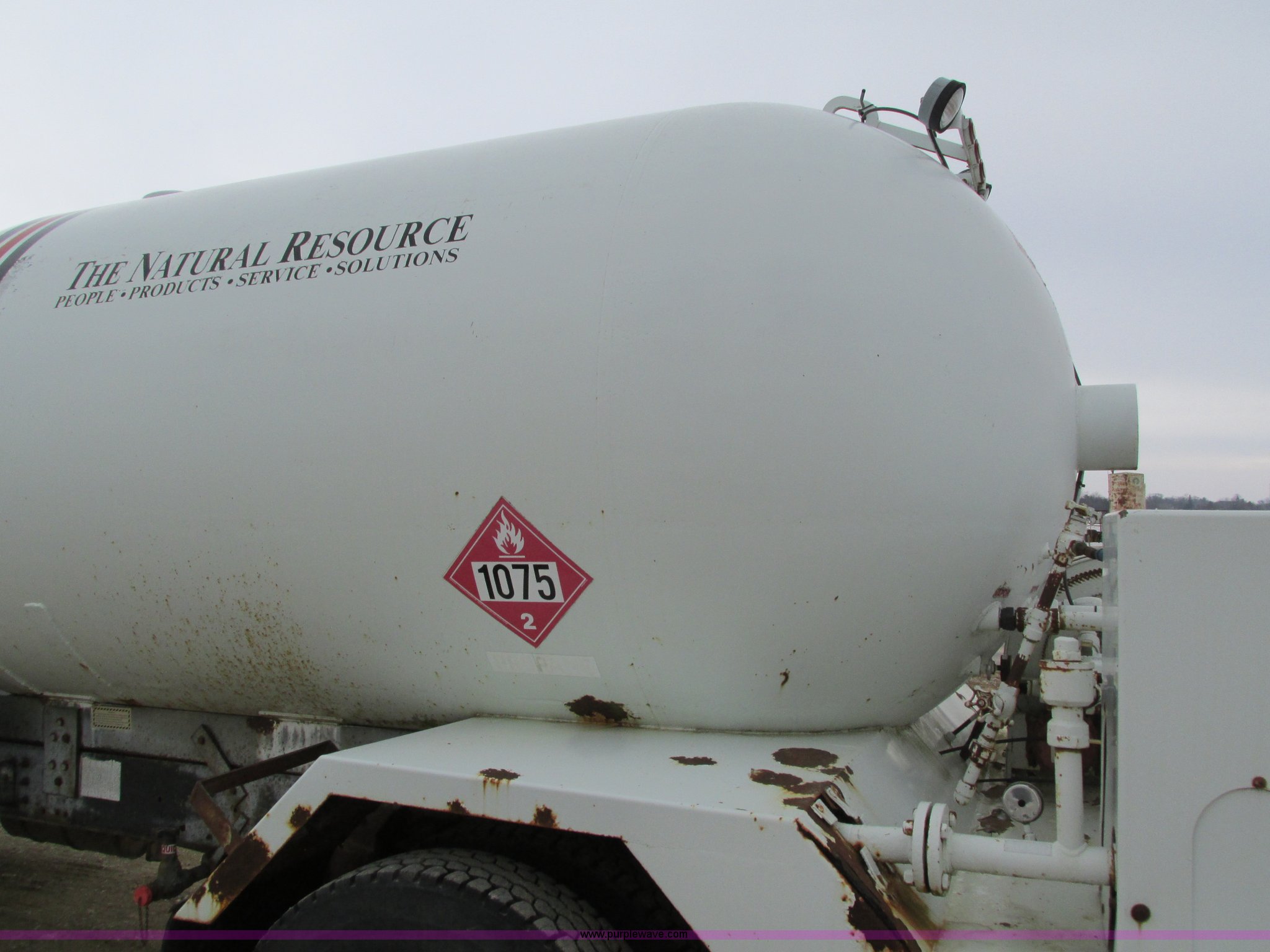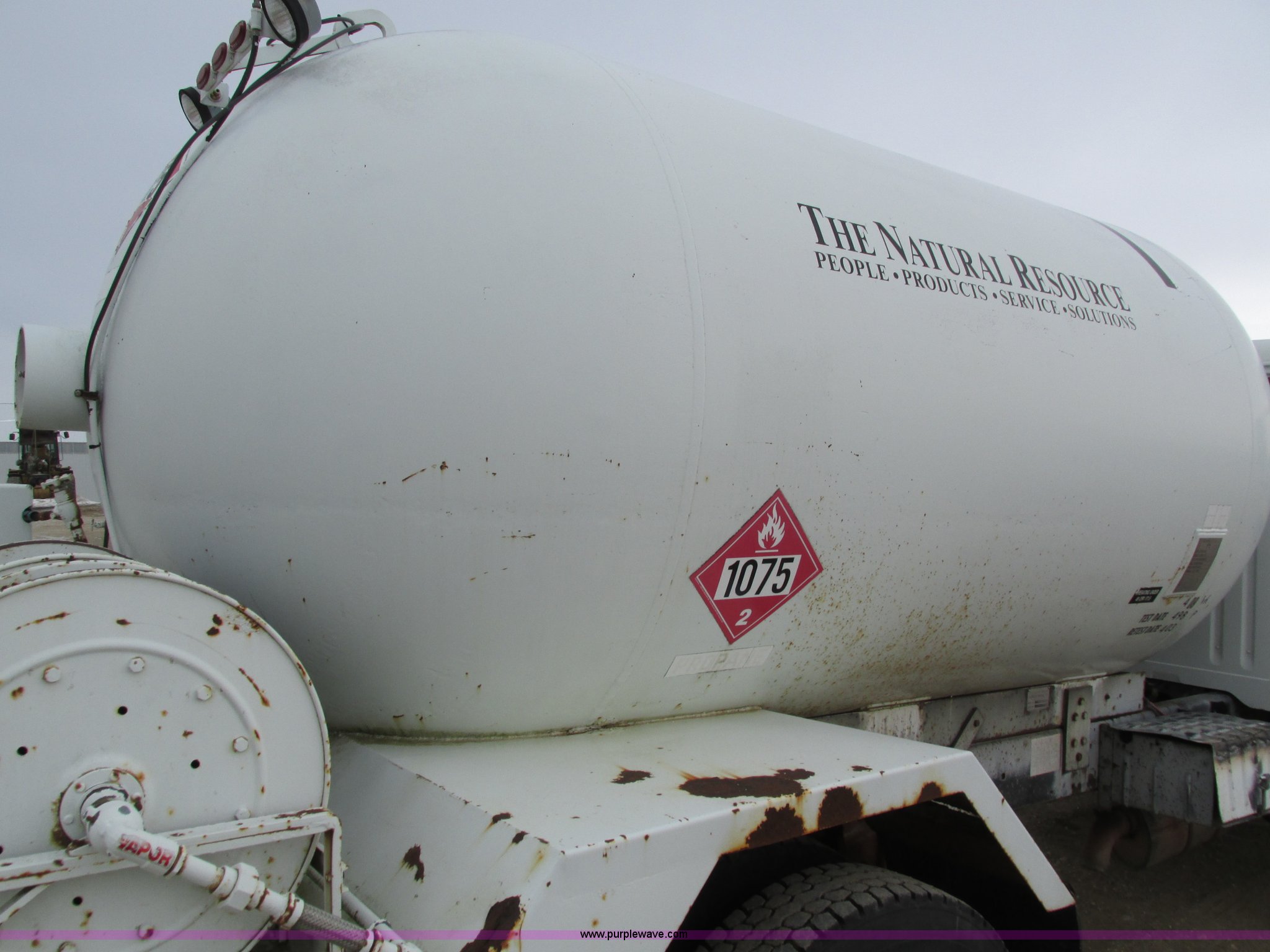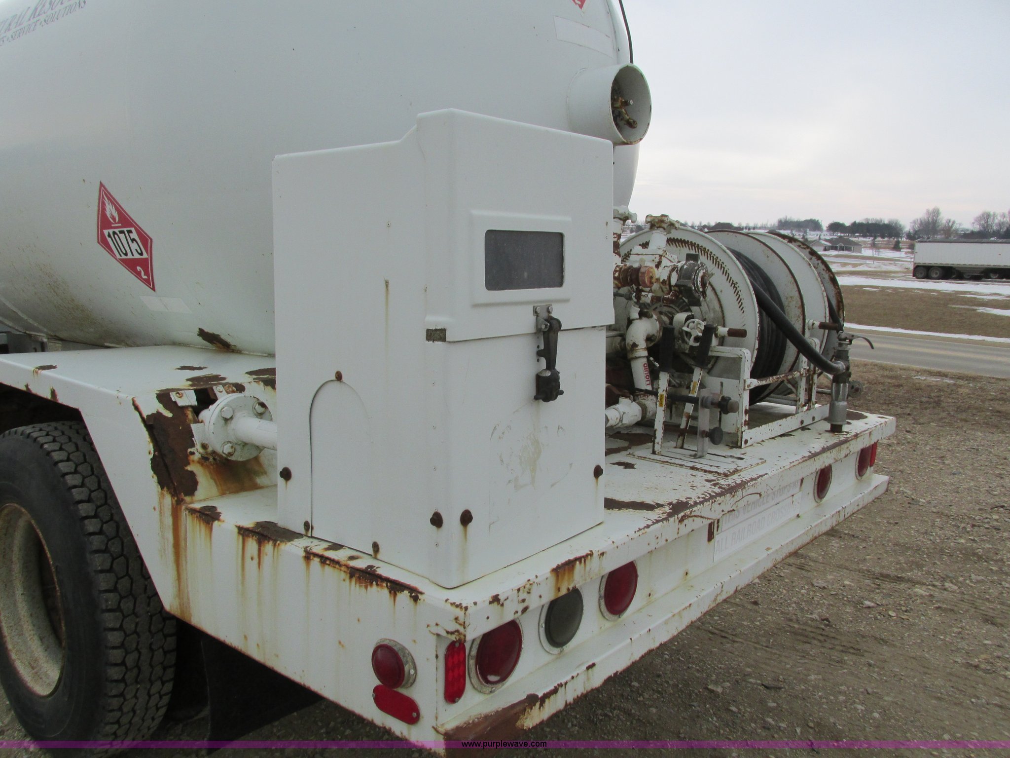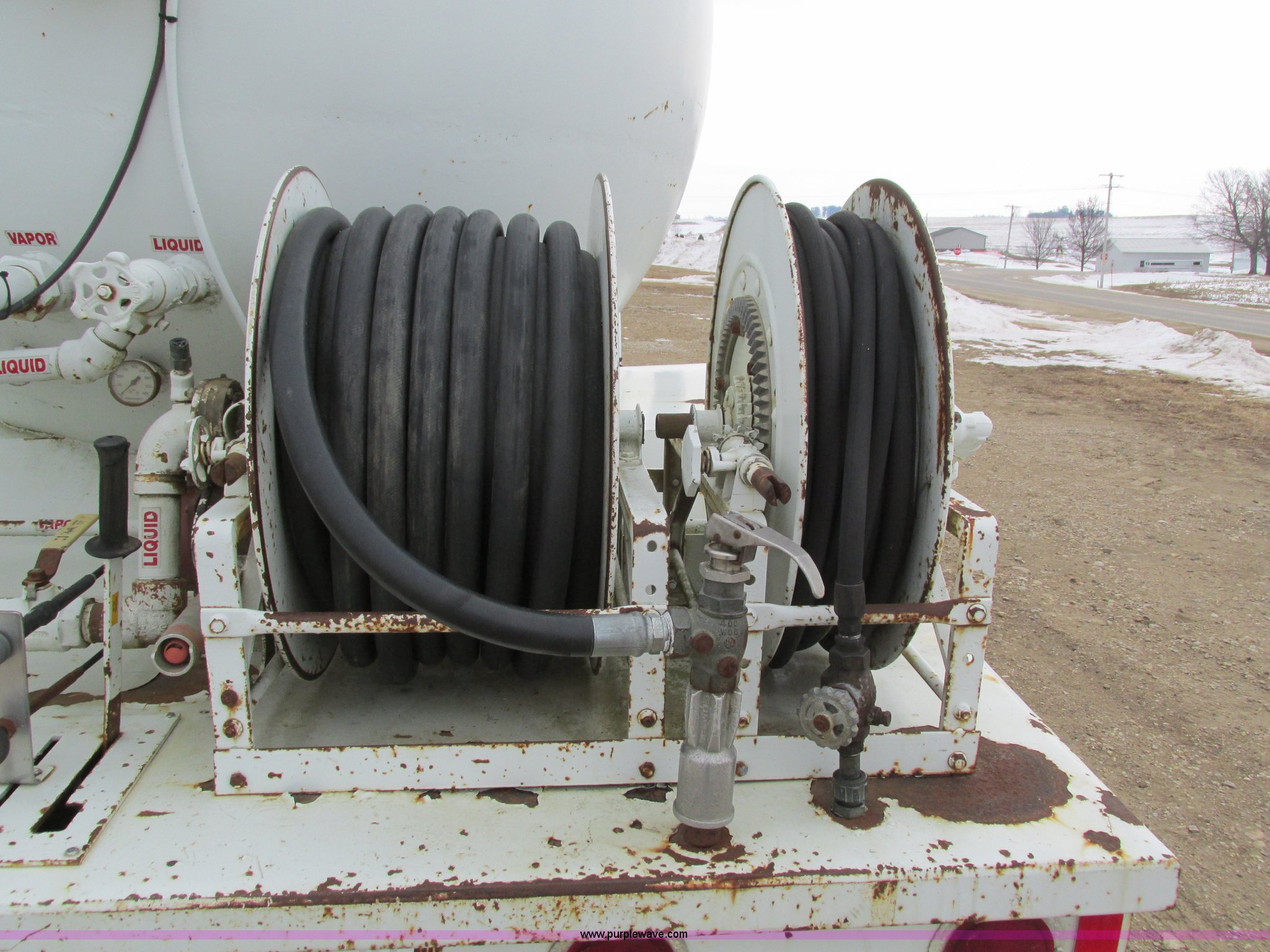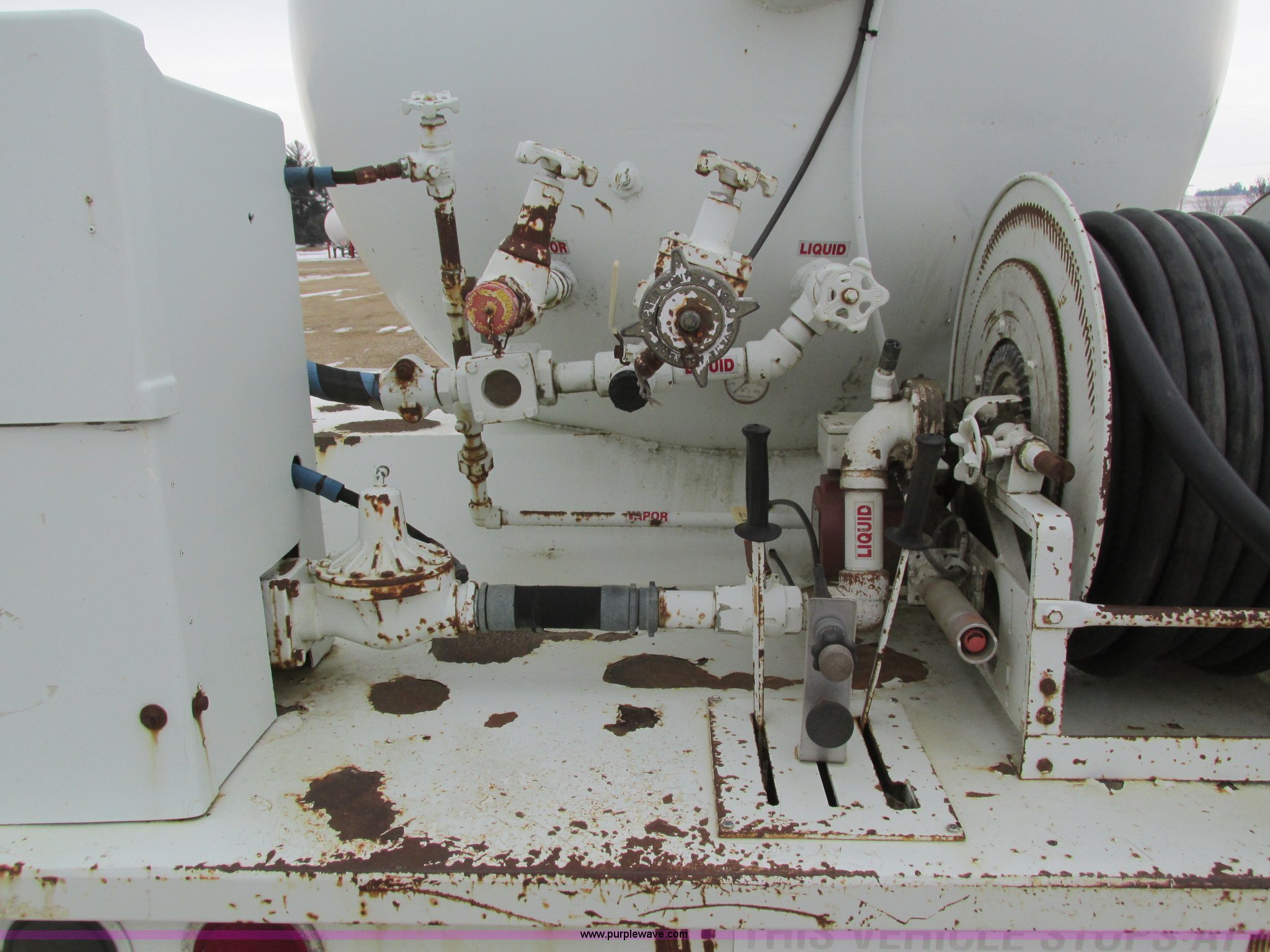 Purple Wave is selling a used Fuel Truck in Iowa. This item is a 1986 International 1754 propane delivery truck with the following: 134,000 miles on odometer, International eight cylinder diesel engine, Spcier Double Duty D five speed manual transmission, Two speed rear end, Heat, AM, Spring suspension seat, Arrow propane tank, 2,500 gallon capacity, (2) hose reels, Approx. 50 gallon fuel tank, PTO, Spring suspension, Hydraulic brakes, 11R22.5 tires, GVWR 28,000 lbs, FAWR 9,000 lbs, RAWR 19,000 lbs
