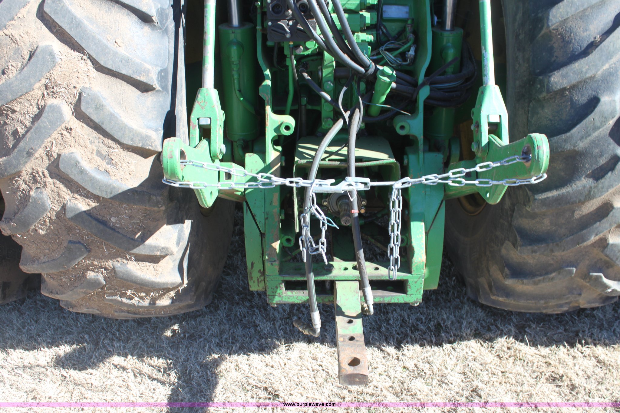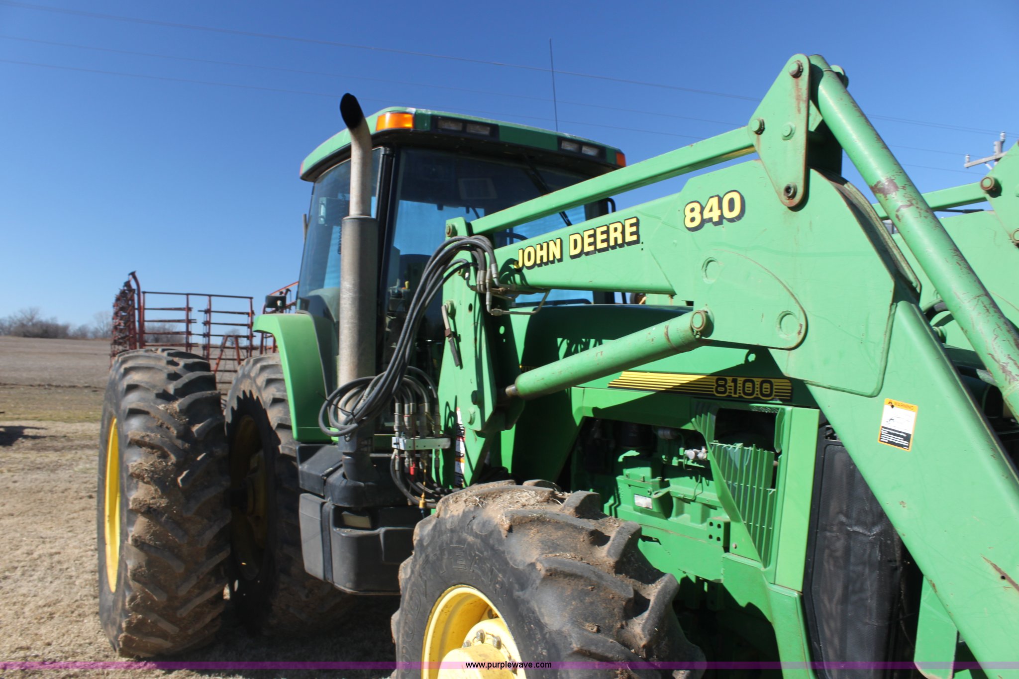 Purple Wave is selling a used Tractor in Oklahoma. This item is a 1998 John Deere 8100 MFWD tractor with the following: 6,078 hours on meter, John Deere 8.1L six cylinder turbo diesel engine, Serial 6081HRW06, Powershift transmission, 16F-4R gears, AC and heat, John Deere 840 loader, Quick attach loader, Quick attach bucket, Park stand in loader, Front remote on loader, Grill guard, Three point, Draw bar, 540/1000 PTO, (5) rear hydraulic remotes, Front hydraulic remote, 16.9R28 front tires, 20.8R38 dual rear tires, Two way radio not included, Serial RW8100P020330