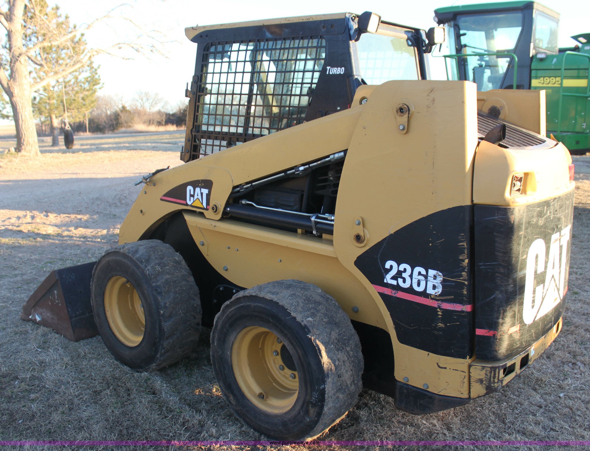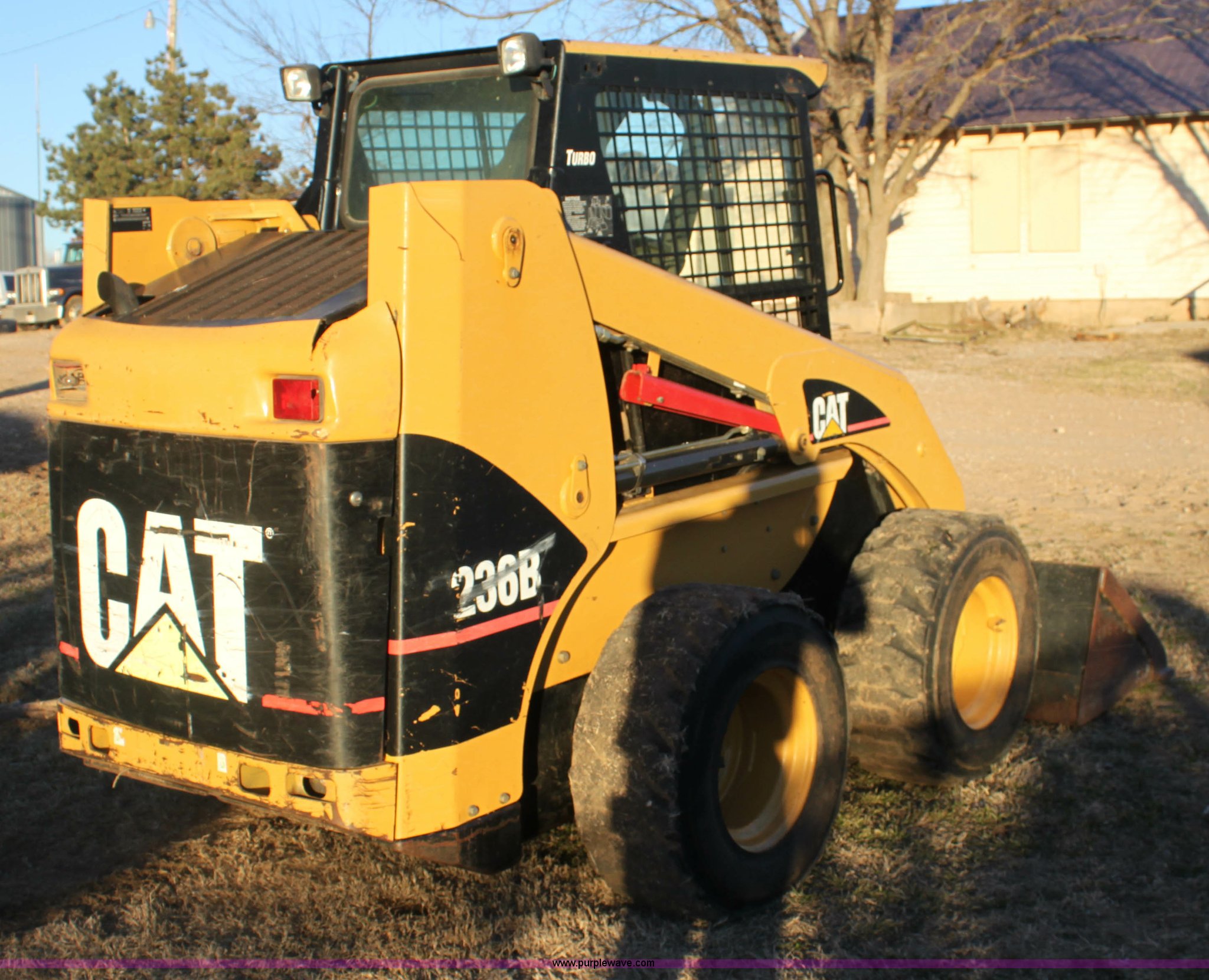 Purple Wave is selling a used Skid Steer Loader in Oklahoma. This item is a 2006 Caterpillar 236B skid steer with the following: 1,313 hours on meter, Hours may vary, unit is still in use, Caterpillar four cylinder turbo diesel engine, 70 HP, Hydrostatic transmission, Enclosed cab, AC and heat, Non-operational AC, Joystick controls, Foot throttle control, EMS panel, Backup alarm, Front and rear work lights, Auxiliary hydraulics, Auxiliary electrical outlet, Manual quick coupler, 6'W bucket, Bolt-on cutting edge, 12-16.5 tires, 7,007 lbs. base operating weight, Unattached door is included, door is sprung, EMS panel will not light up, Right joystick inoperable, when front exterior lights are on, Serial CAT0236BVHEN03860