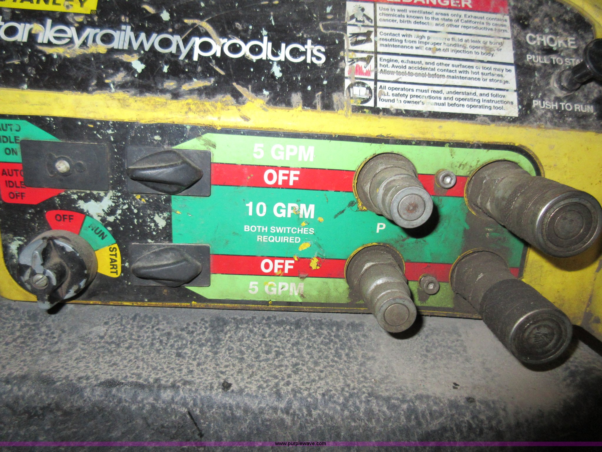 Purple Wave is selling a used Tools in Missouri. This item is a Stanley hydraulic power pack with the following: 23 hours on meter, Honda GX620 V-twin gas engine, 20 HP, Electric start, Dual five gallon per minute or one 10 gallon per minute output