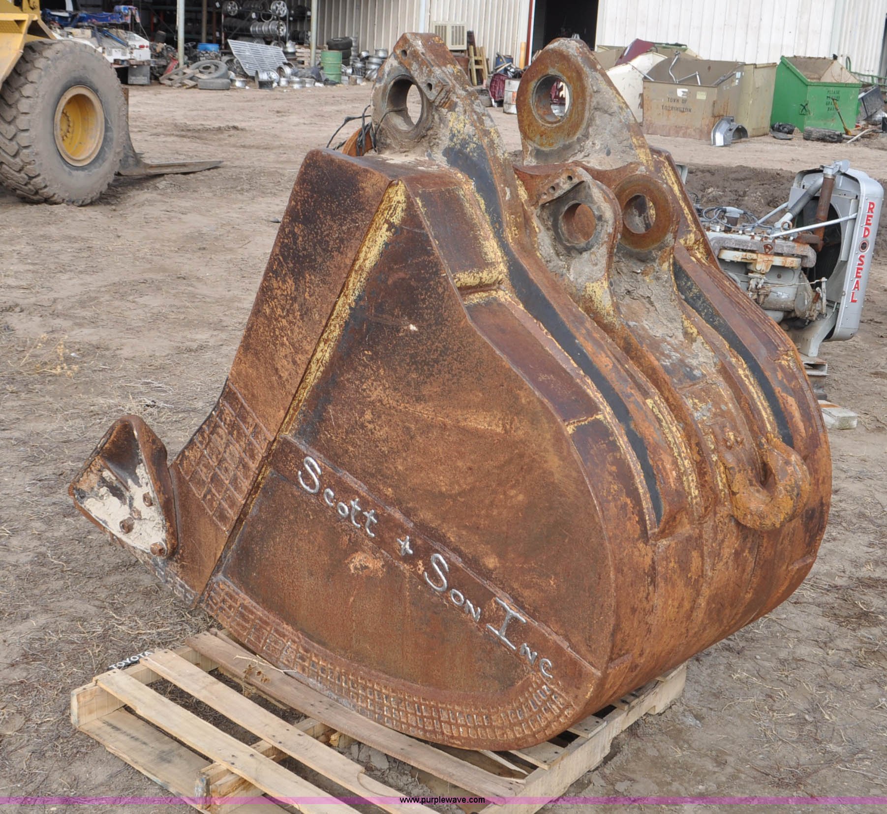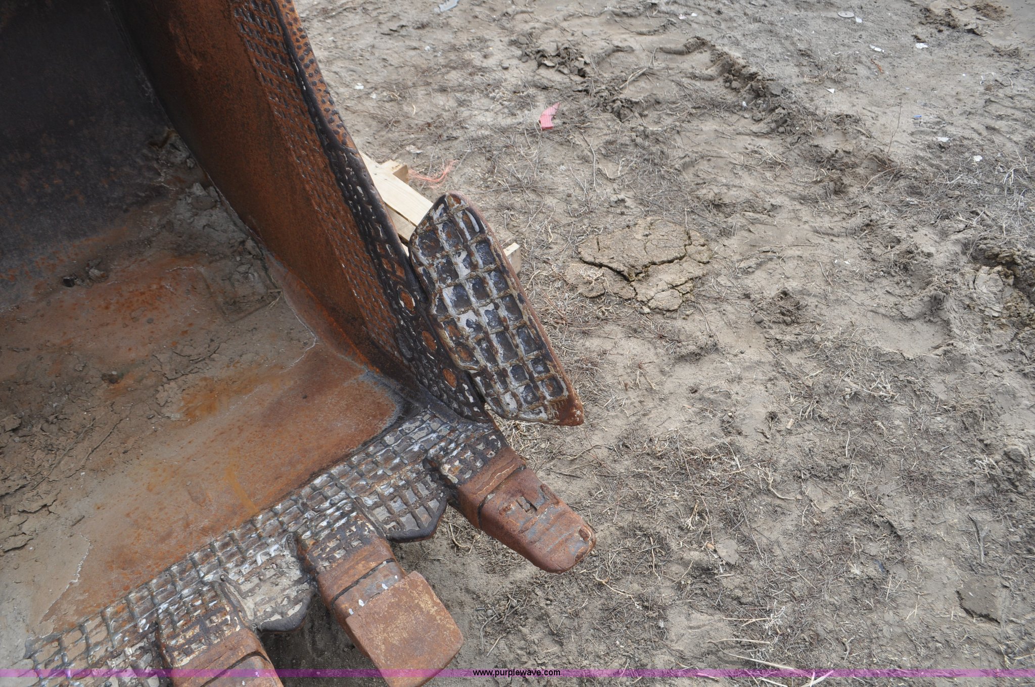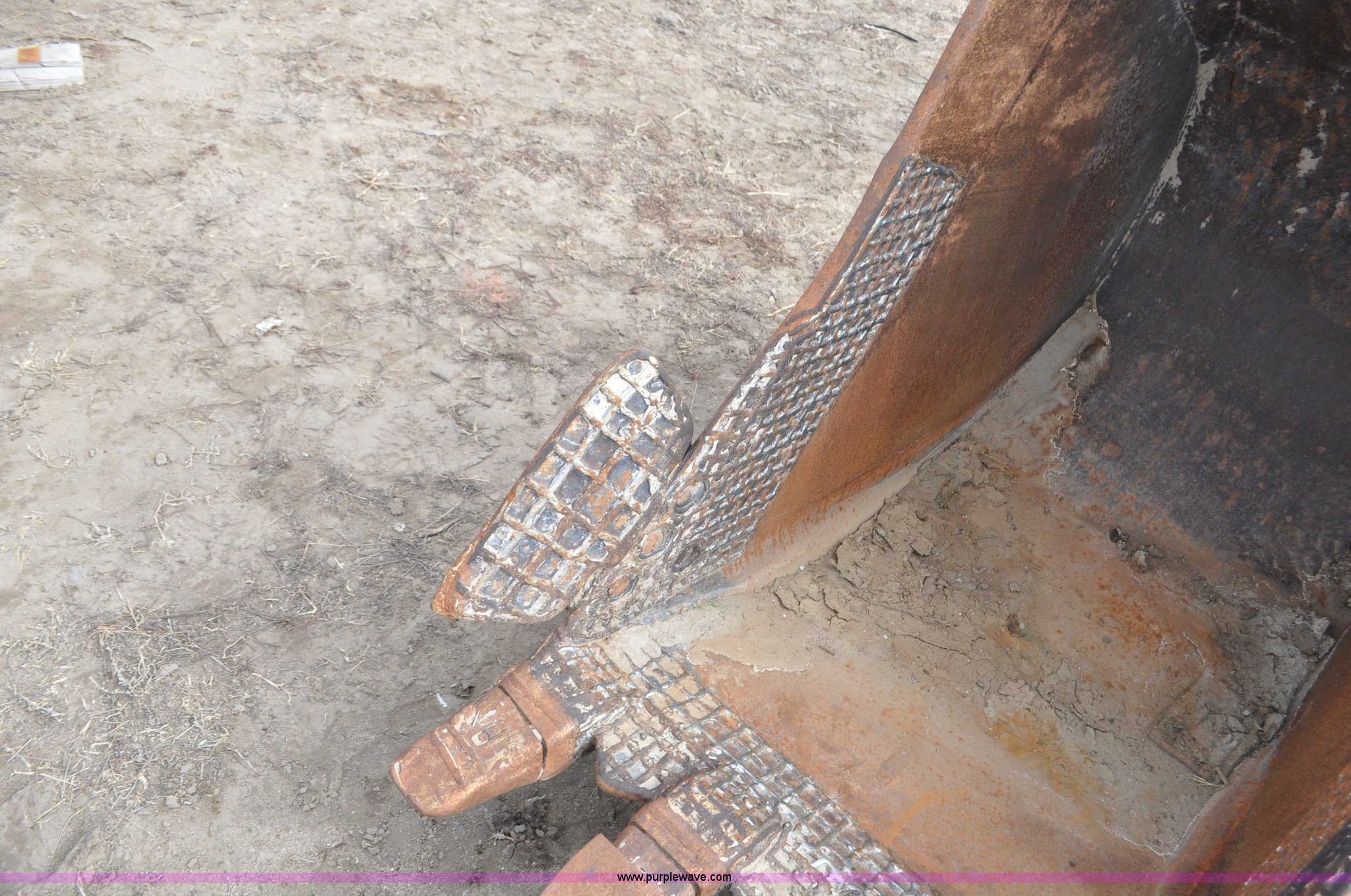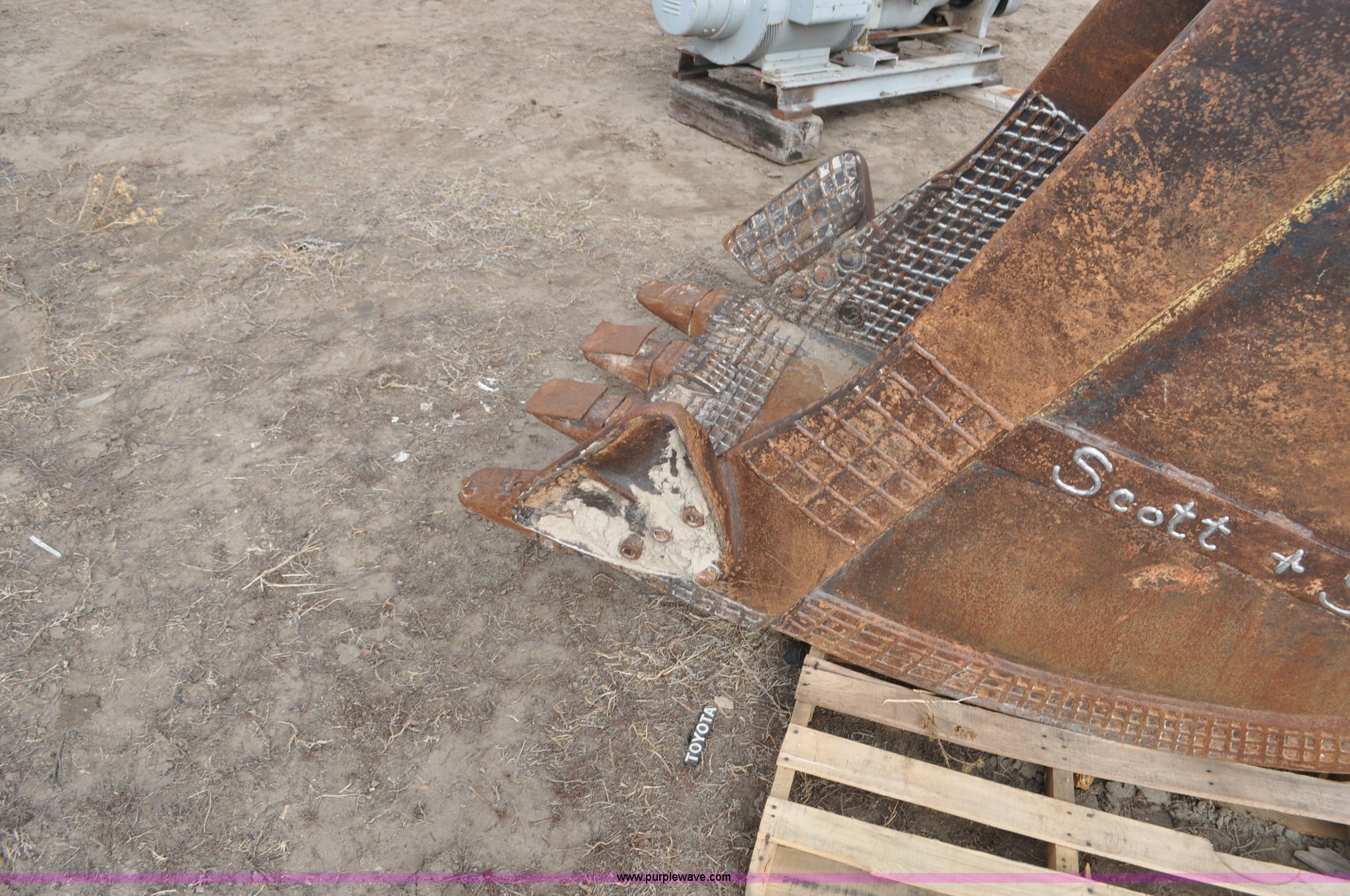 Purple Wave is selling a used Excavator Attach. in Wyoming. This item is a Excavator bucket with the following: 38"W, 45" overall width with side cutters, (4) teeth, Cable hook, Front 4 1/4" pin holes, 17" opening, 3 1/4" rear pin holes, 7" opening, Rear holes worn