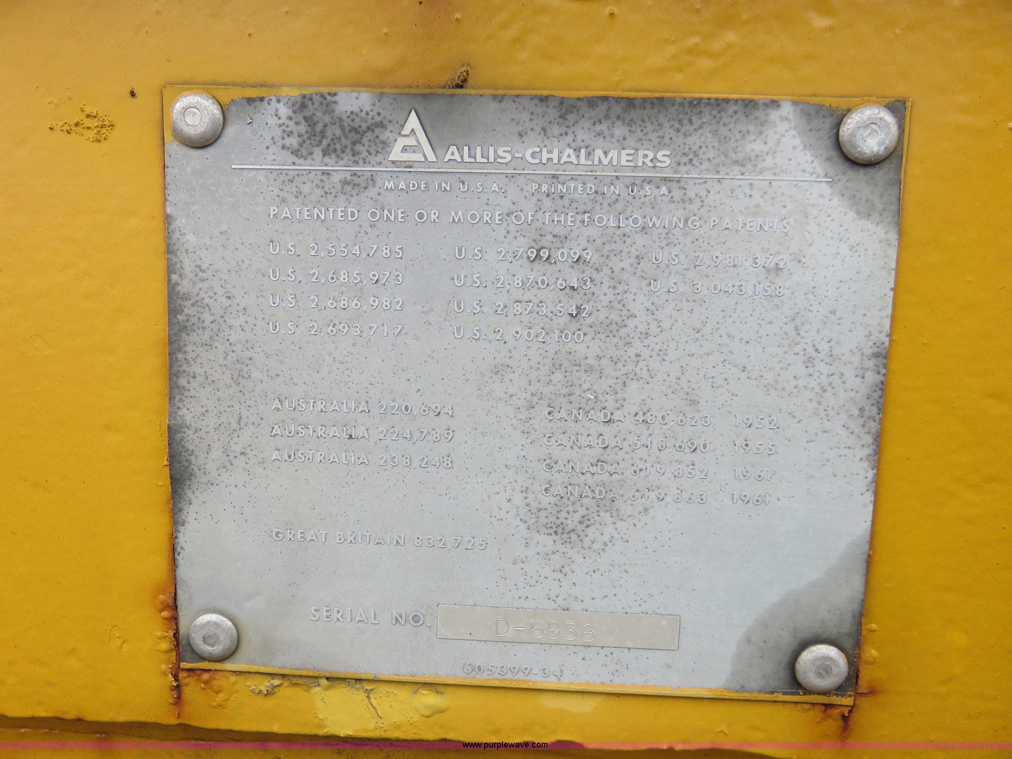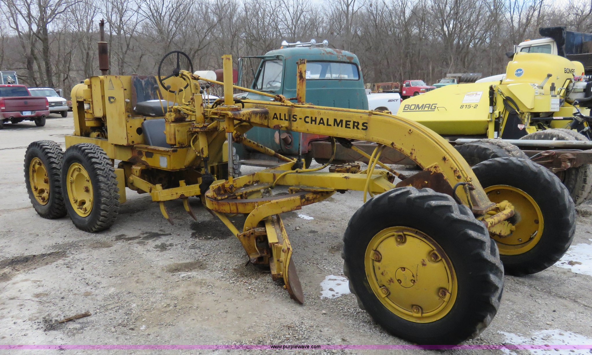 Purple Wave is selling a used Motor Grader in Kansas. This item is a 1969 Allis Chalmers D rigid motor grader with the following: Four cylinder gas engine, Direct-drive transmission, 4F-1R gears, OROPS, 10' moldboard, Side shift, Mid mount scarifier, (4) shanks, 8.25-20 tires, 8,800 lbs. base operating weight, Brakes need work, Serial D-6838