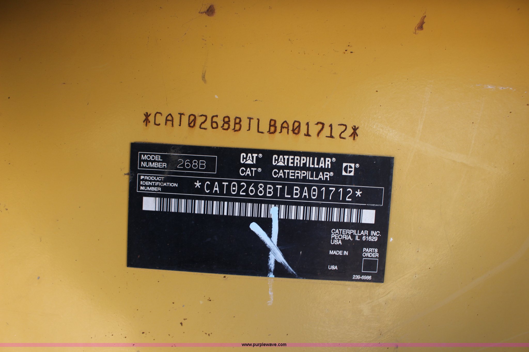 Purple Wave is selling a used Tracked Skid Steer Loader in Oklahoma. This item is a 2006 Caterpillar 268B skid steer with the following: 1,691 hours on meter, Perkins Caterpillar 2.8L four cylinder diesel engine, Two speed hydrostatic transmission, Enclosed cab, AC and heat, Blower motor needs repair, Hand and foot throttle controls, Joystick loader controls, Windshield wipers, Front and rear work lights, 6'W bucket, Bolt-on cutting edge, Hydraulic quick attach, High flow XPS auxiliary hydraulics, (2) hydrualic remotes, Loegering suspension, VTS S9R rubber tracks, 7,995 lbs. base operating weight, Minor hydraulic leak, Serial CAT0268BTLBA01712
