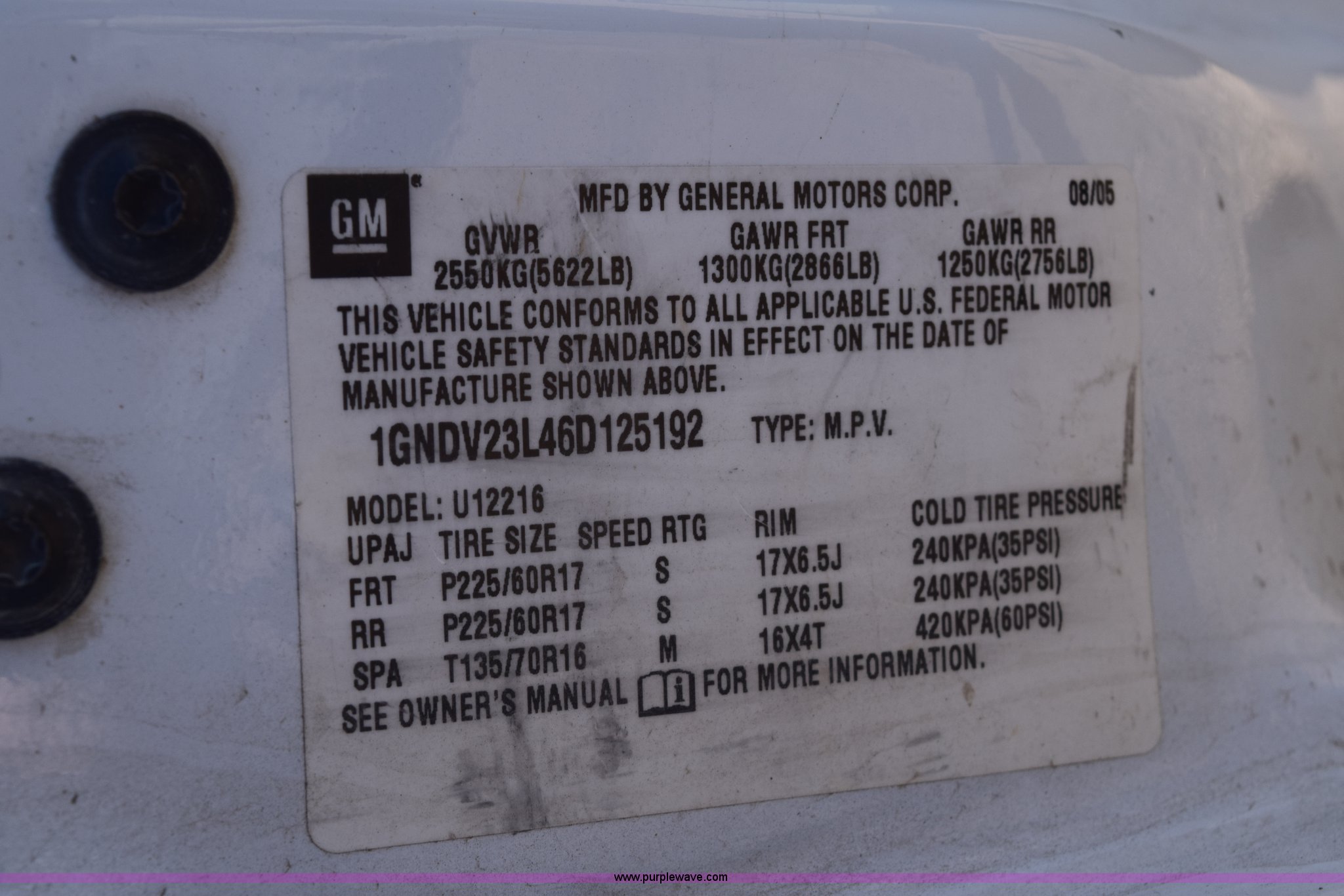 2006 Chevrolet Uplander EXT LS SUV. Unknown miles on odometer, 3.5L V6 OHV 16V gas engine, Automatic transmission, AC and heat, Cruise, AM/FM, Power windows and locks, Cloth interior, 225/60R17 tires, Contents included, Substantial front end damage, Windshield cracked, Air bags deployed, Wheels bent, Tires flat, Case# 14C084149. Vehicle is abandoned. Condition and history are unknown. No additional information is available. Vehicle does not have keys unless notated otherwise in the item listing.. View City Of Wichita Terms for title acquisition and item removal requirements.. 1GNDV23L46D125192. Happy Hooker Towing & Transport. 3750 South Broadway. Wichita, KS 67216