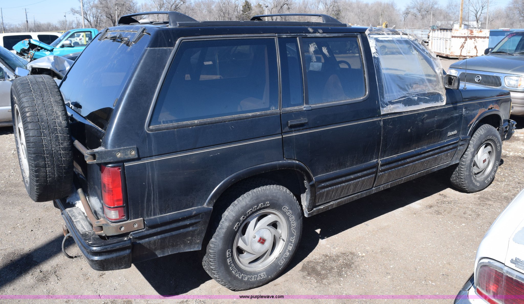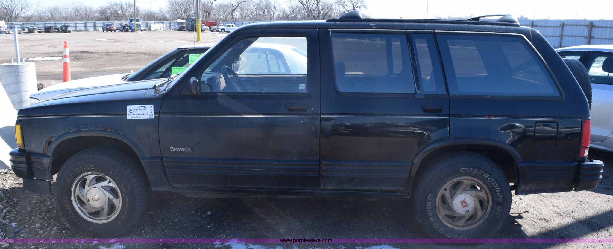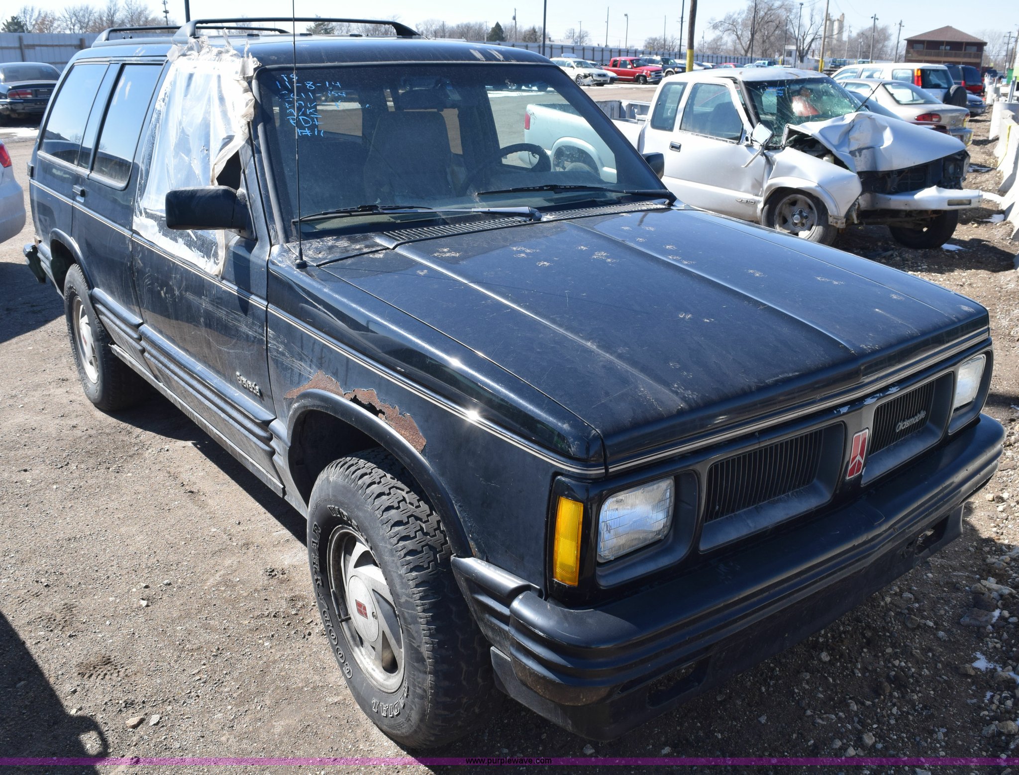 Purple Wave is selling a used Passenger Vehicle in Kansas. This item is a 1992 Oldsmobile Bravada SUV with the following: Unknown miles on odometer, 4.3L V6 OHV 12V gas engine, Automatic transmission, AC and heat, Cruise, AM/FM/cassette, Power windows, locks, and seats, Leather interior, Receiver hitch, Trailer wiring, P235/75R15 tires, Passenger window broken, Interior/exterior cosmetic damage, Seat torn, Rust, Dents and scratches, Contents included, Case# 14C075253
