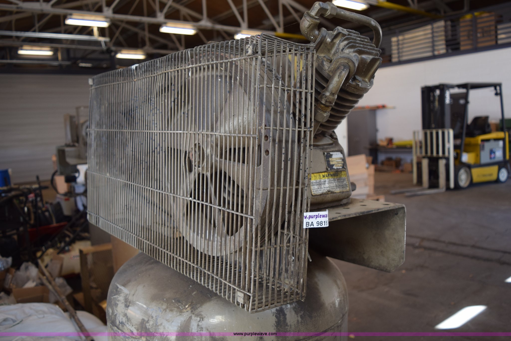 Purple Wave is selling a used Air Compressor in Kansas. This item is a 1994 Wayne TRU5N air compressor with the following: Two stage compressor, 5 HP motor, 80 gallon capacity, Unit was damaged in a building fire, Unknown operating condition, Unknown safety condition, Serial 86621, KDOT ID 031-4394