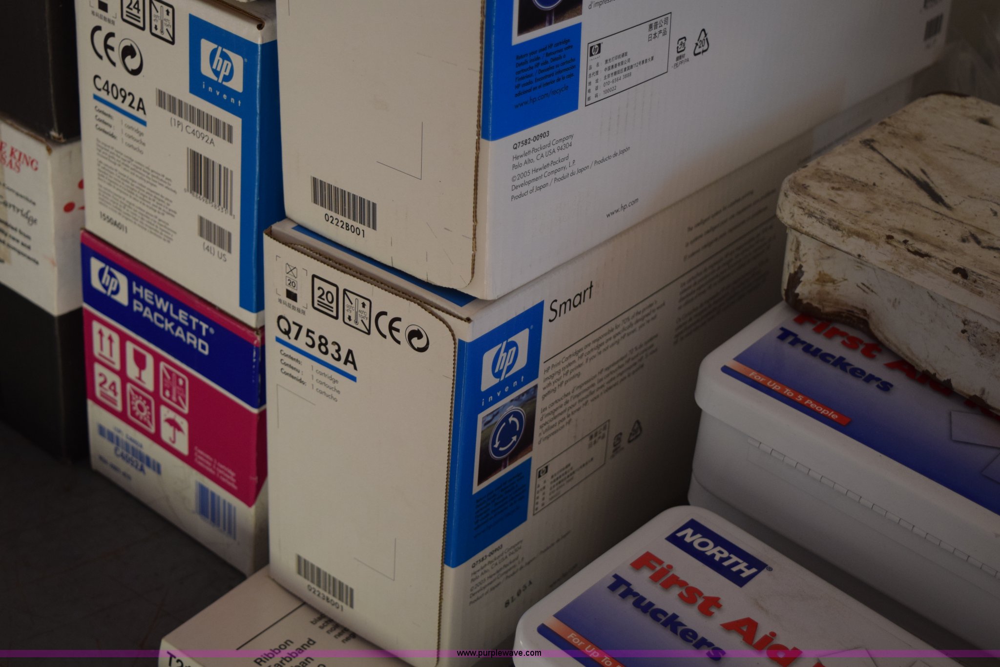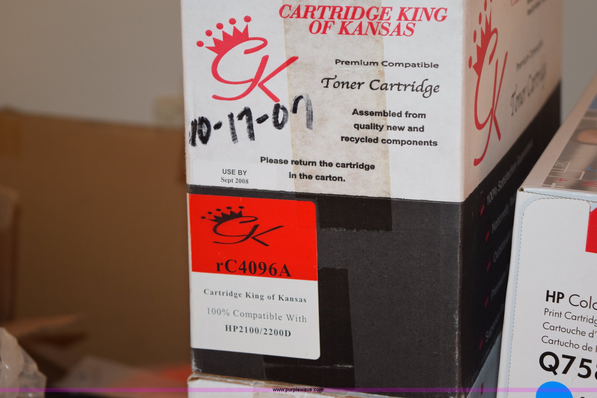 Purple Wave is selling a used Electronics in Kansas. This item is a (39) HP printer cartridges with the following: (8) various toner cartridges, Talley ribbon, KDOT ID 2763000-27