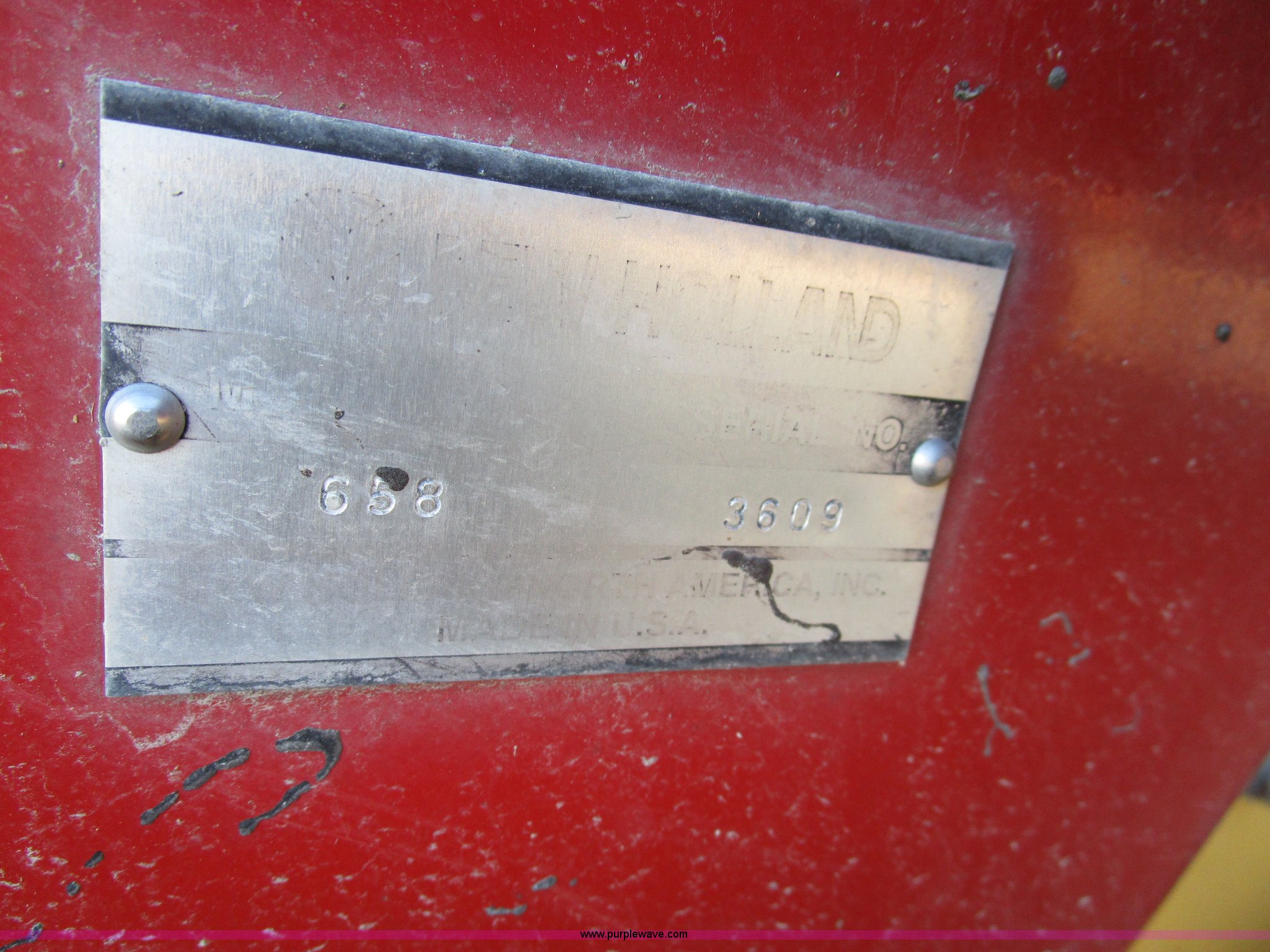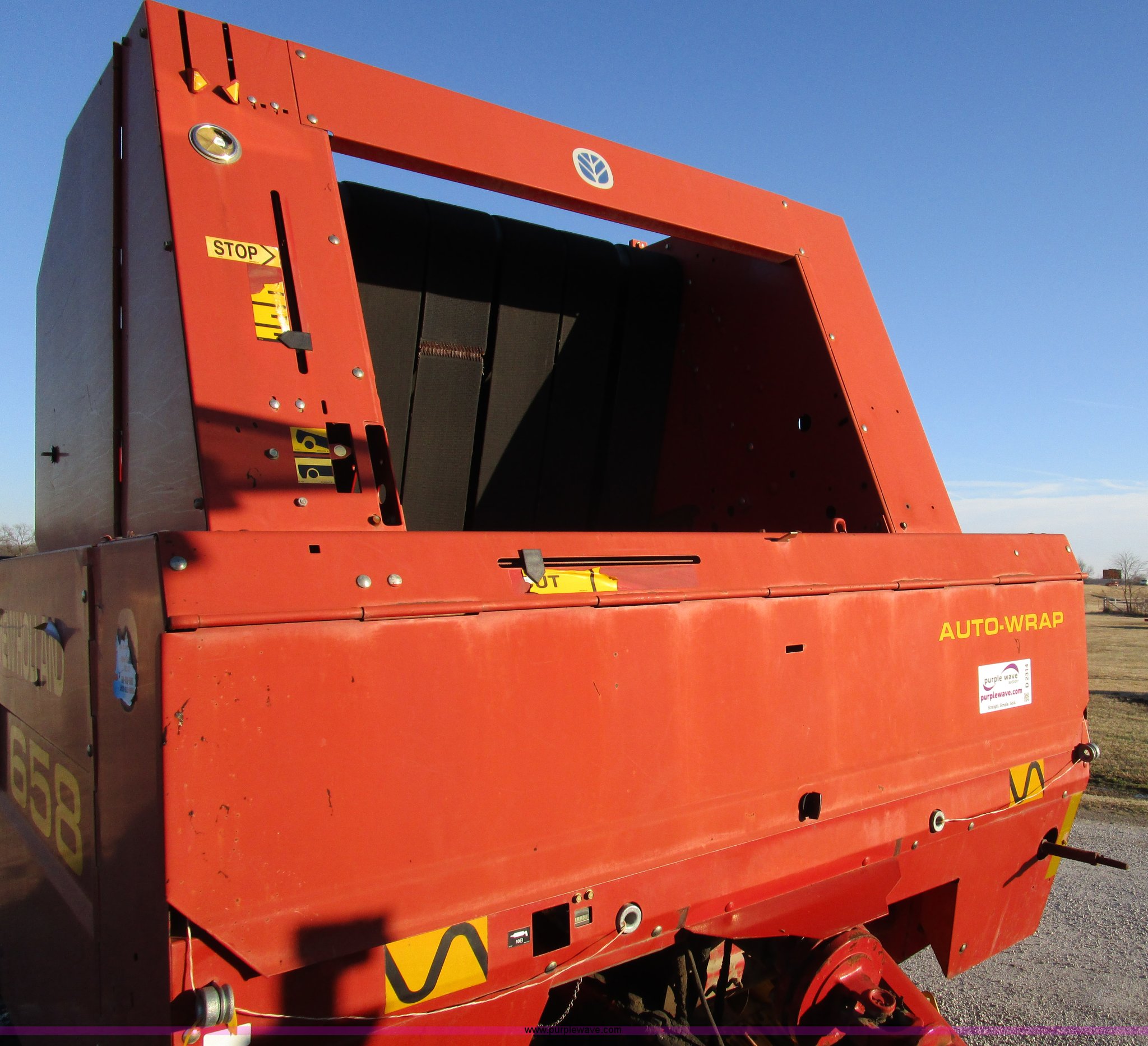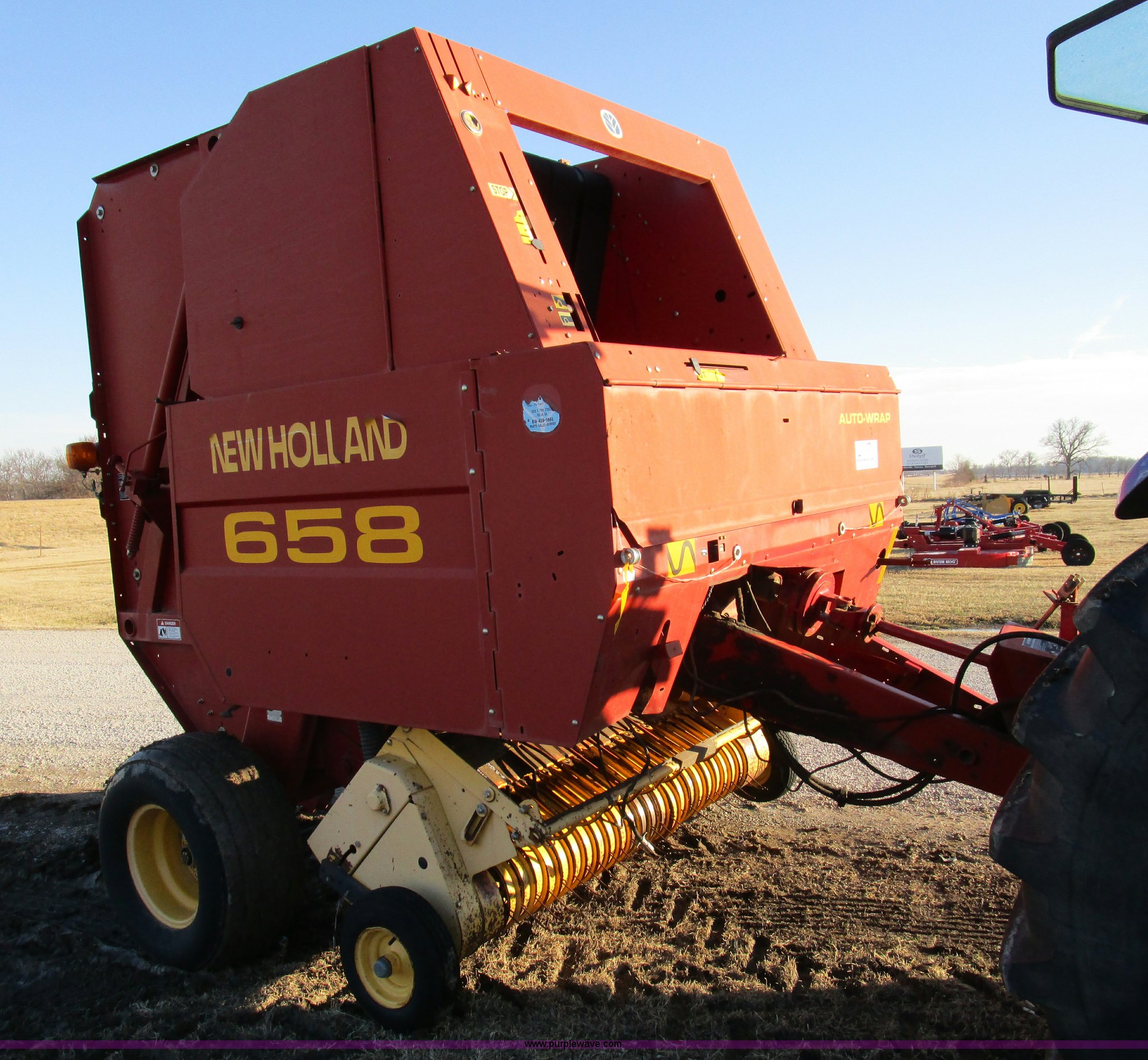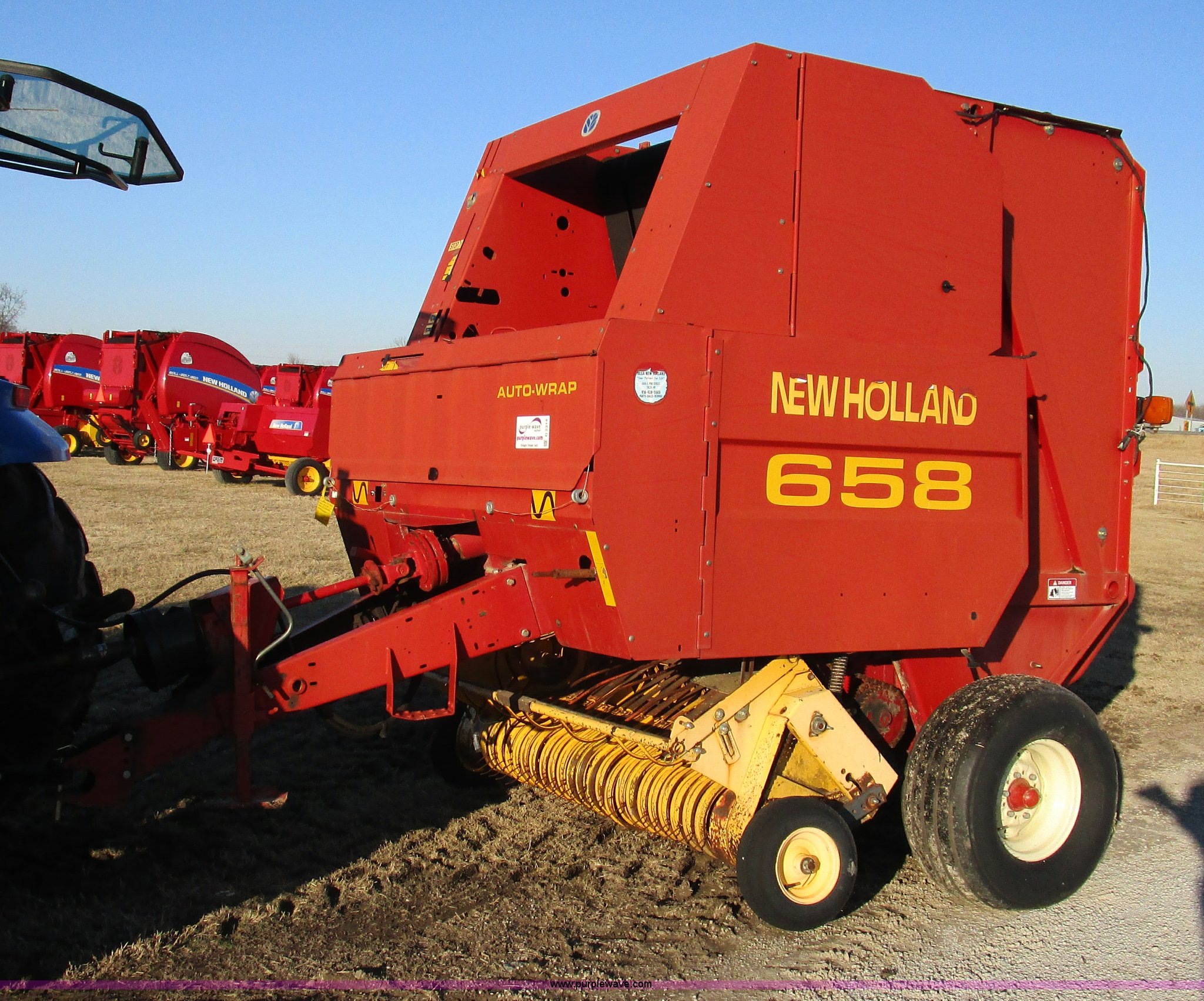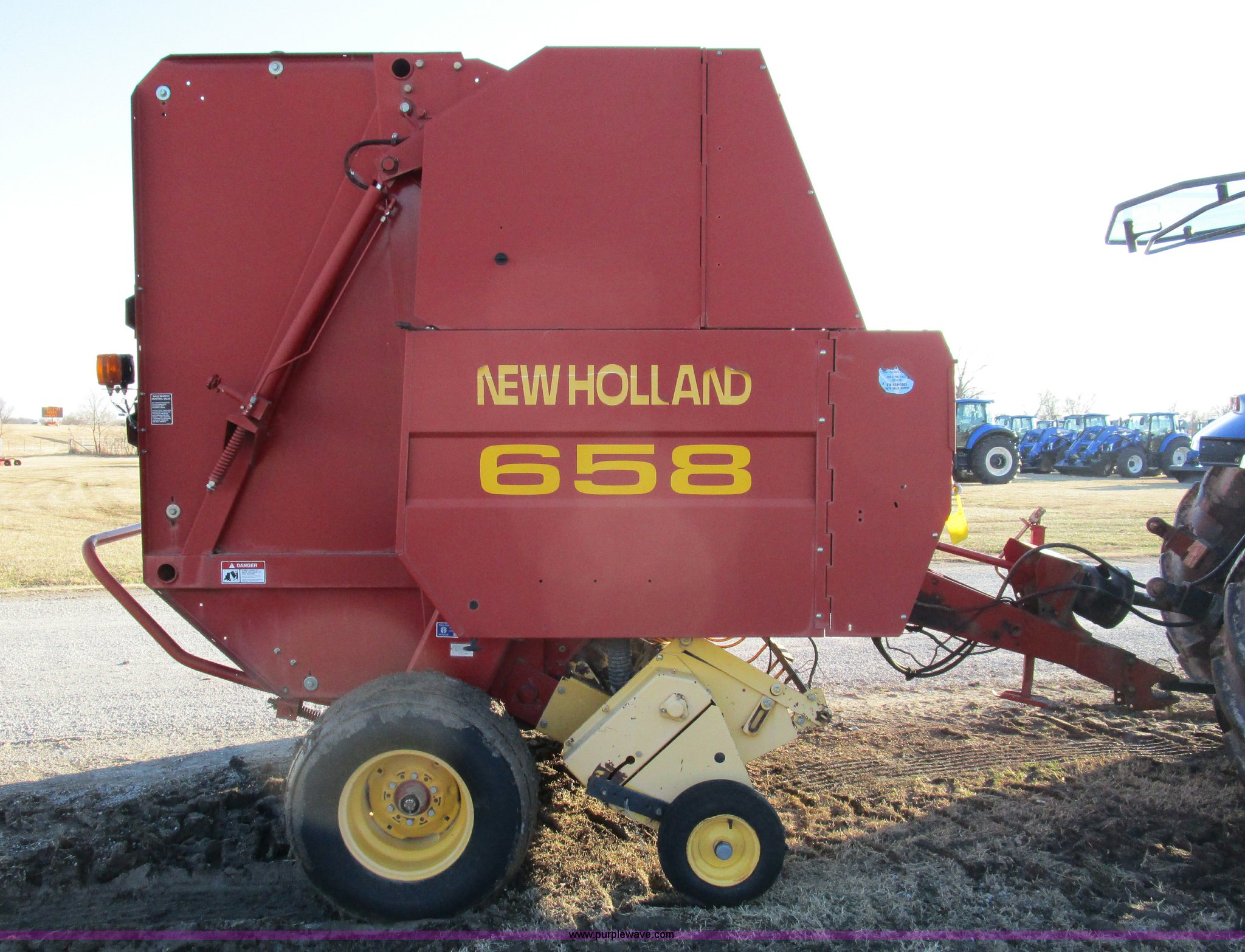 Purple Wave is selling a used Round Baler in Oklahoma. This item is a 2002 New Holland 658 round baler with the following: 4' x 6' bale capacity, 540 PTO, Twin twine tie, Auto-tie, Bale ramp, Transport lights, Pin hitch, 4.80-8 gauge wheels, 31x13.50-15 tires, Serial 3609