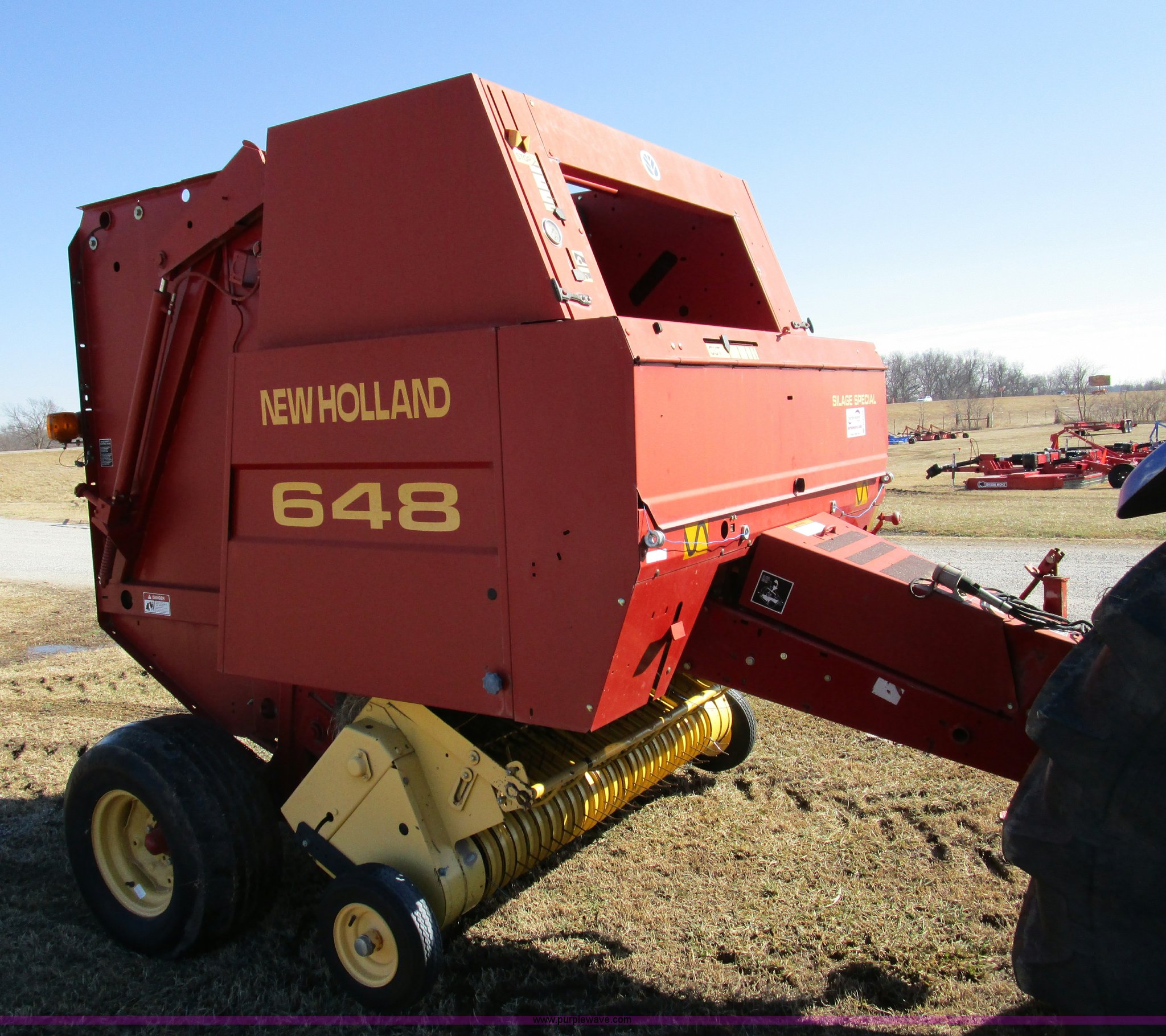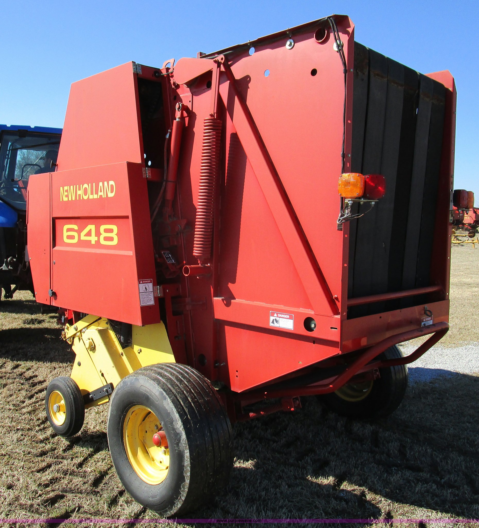 Purple Wave is selling a used Round Baler in Oklahoma. This item is a 2000 New Holland 648 round baler with the following: 4' x 5' bale capacity, 540 PTO, Twin twine tie, Auto-tie, 5'W pickup, Silage special, Bale kicker, Transport lights, Pin hitch, 4.80-8 gauge wheels, 31x13.50-15 NHS tires, Serial 989824