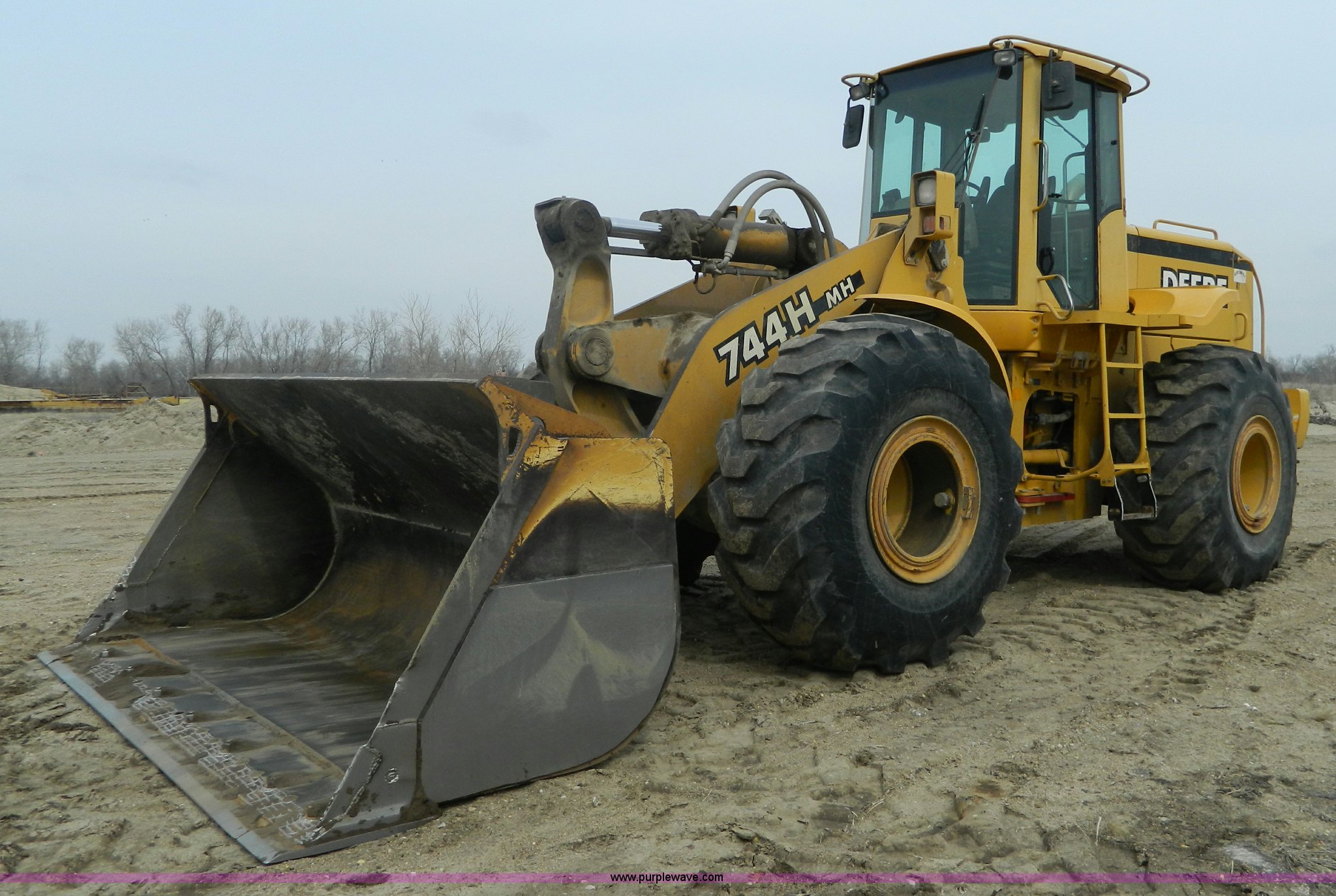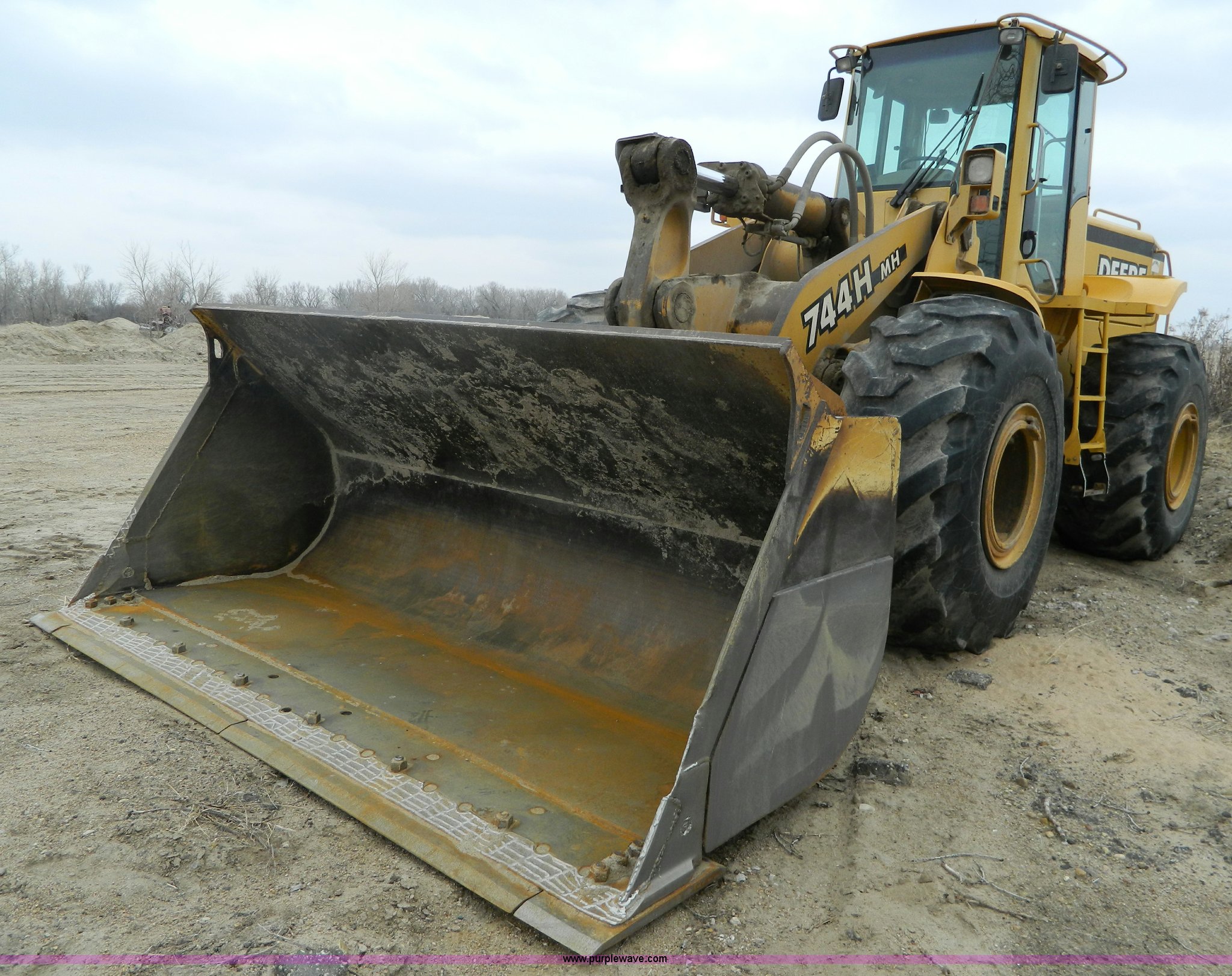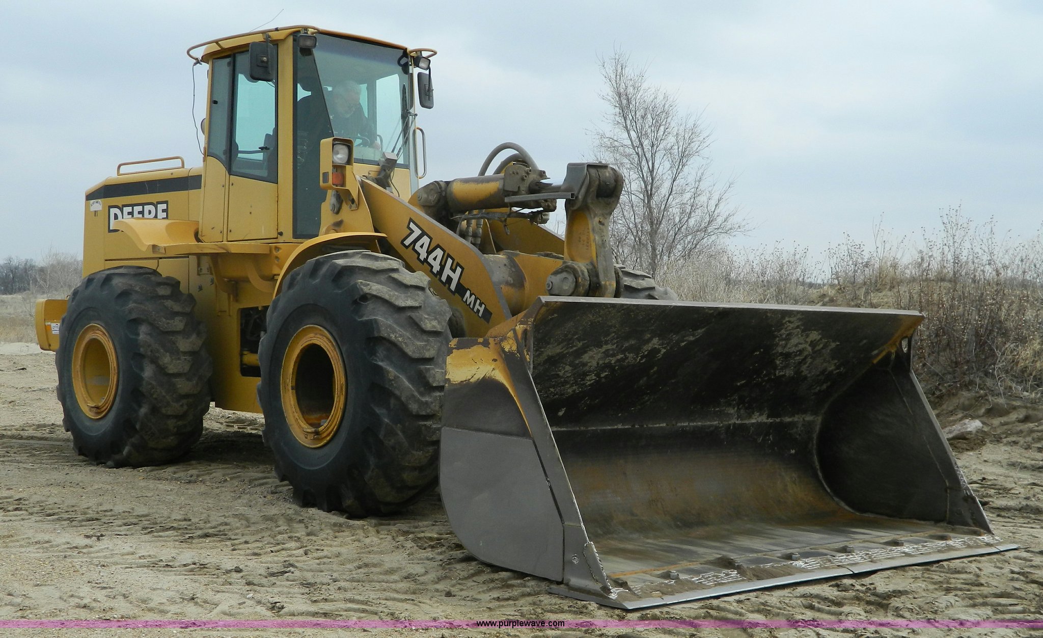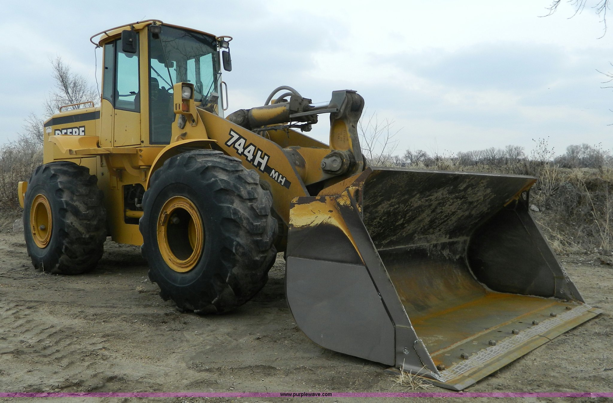 Purple Wave is selling a used Wheel Loader in Kansas. This item is a 2001 John Deere 744H wheel loader with the following: 20,073 hours on meter, John Deere six cylinder diesel engine, 260 HP, Engine overhaul completed at 11,250 hours by CTI Concordia, Powershift transmission, 4F-3R gears, ROPS, AC and heat, AM/FM/Weatherband, Tilt steering wheel, Air suspension seat, EMS panel, Joystick controls, Front and rear work lights, Windshield wipers, Engine enclosures, 129"W bucket, Bolt-on cutting edge, Block heater, Back-up alarm, Rear pin hitch, Firestone 26.5-25 tires, 50,300 lbs. base operating weight, New tires fall of 2014, Service records available, Serial DW744HM578692