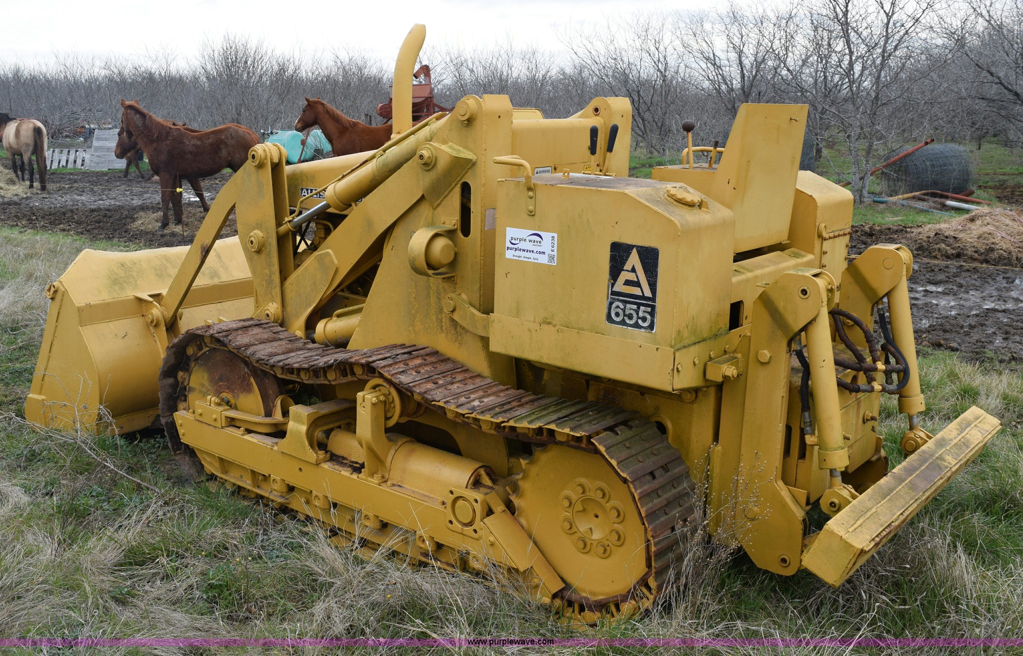 Purple Wave is selling a used Crawler Loader in Texas. This item is a Allis Chalmers 655 track loader with the following: Allis Chalmers 200 C.I.D. four cylinder diesel engine, Direct injection, 59 HP, Shuttle shift transmission, 3F-3R gears, 65"W toothed bucket, Rear scarifier bar, 12"W tracks, Torque converter is bad, Injectors need to be cleaned