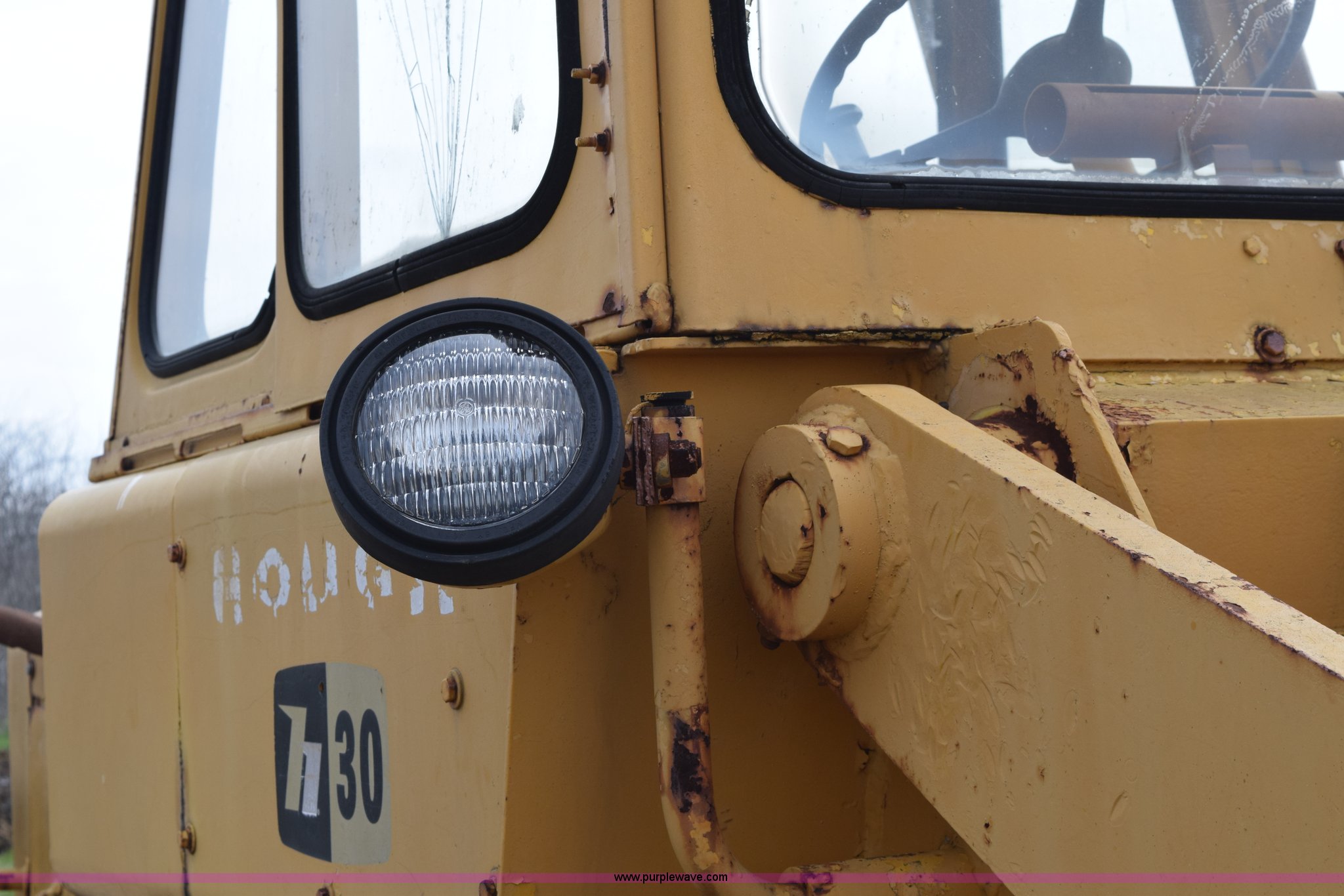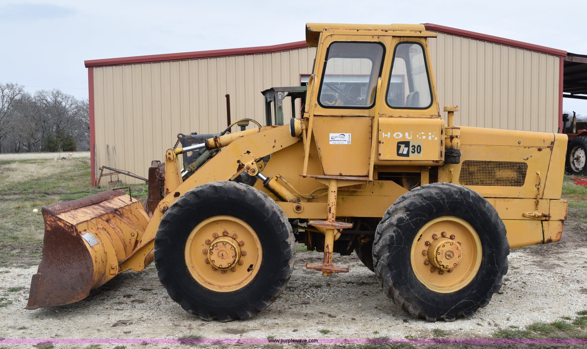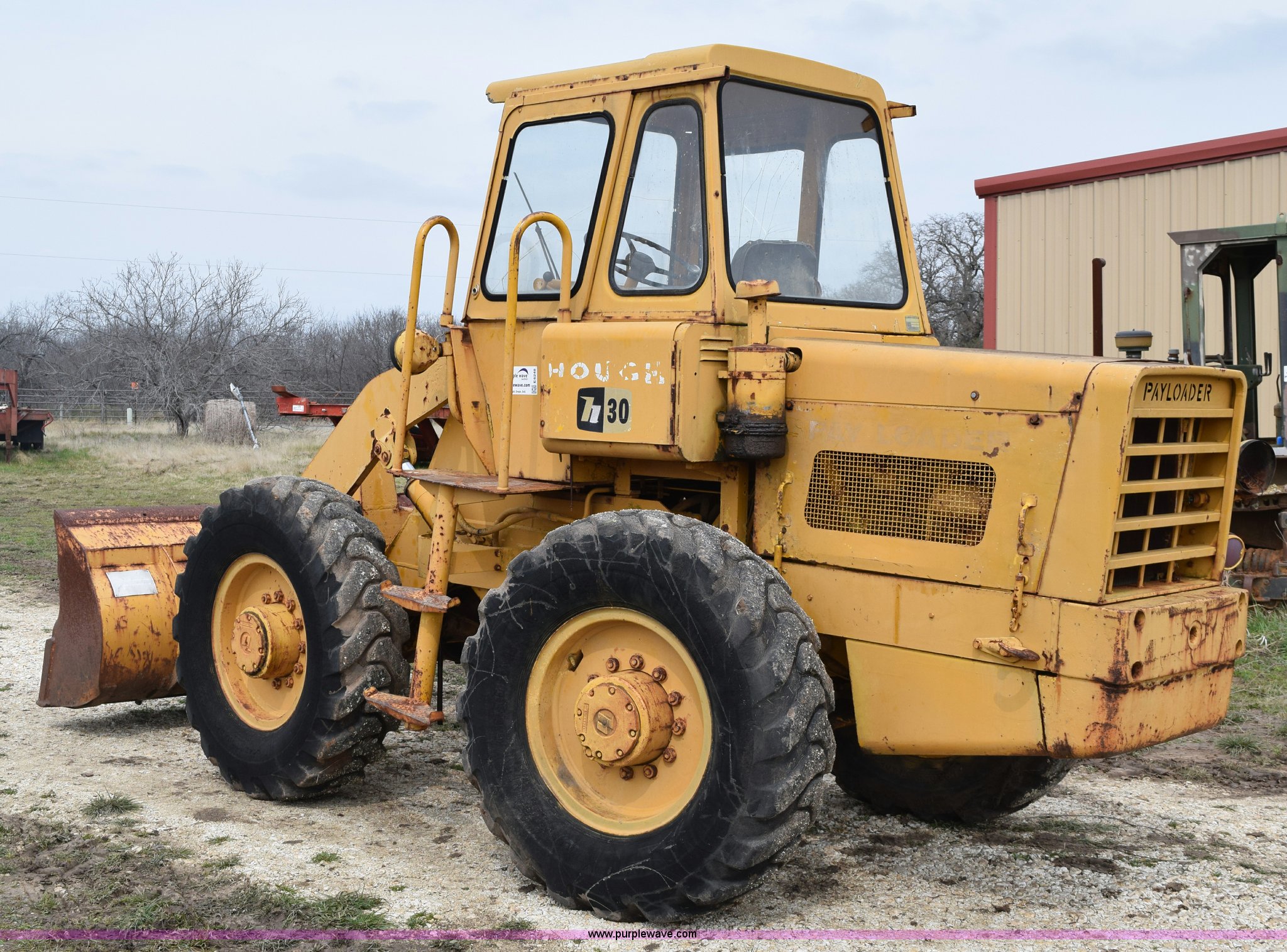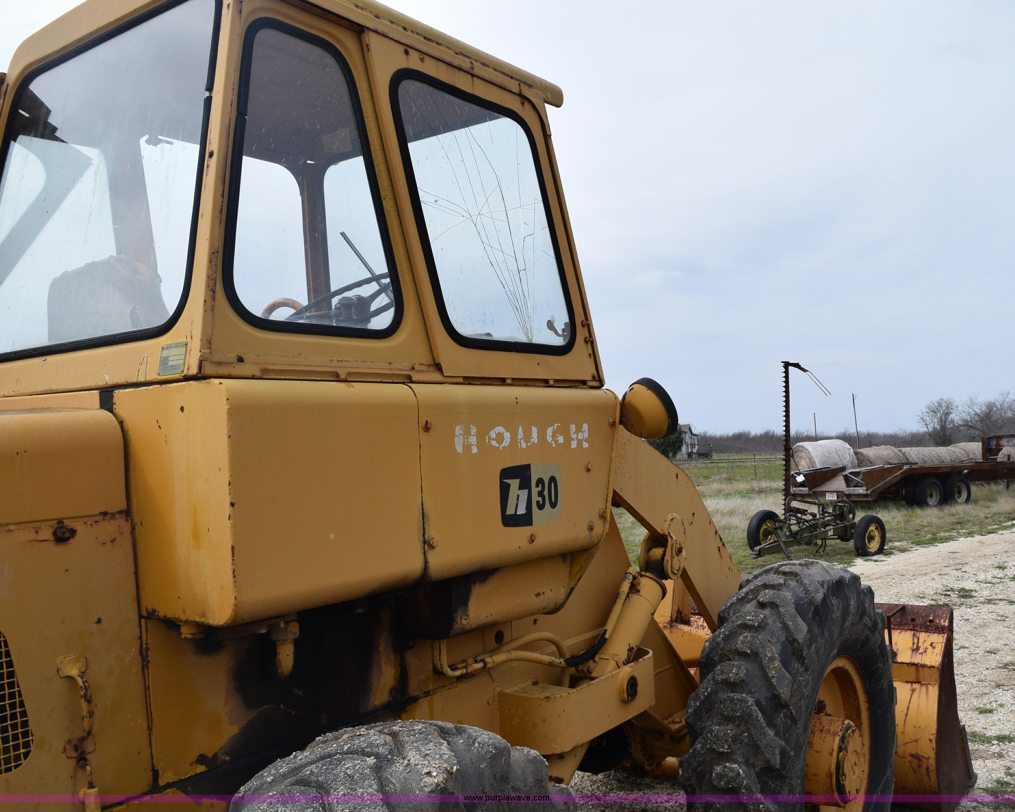 Purple Wave is selling a used Wheel Loader in Texas. This item is a Hough H30 wheel loader with the following: 5,012 hours on meter, International six cylinder gas engine, Three speed hydrostatic transmission, Four wheel drive, EROPS, Two stick loader control, 80"W toothed bucket, Serial 208091, Work lights, 13.00-24 tires, Rust, Window cracked, Non-operational hydraulic pump, Seat torn, Serial 27357