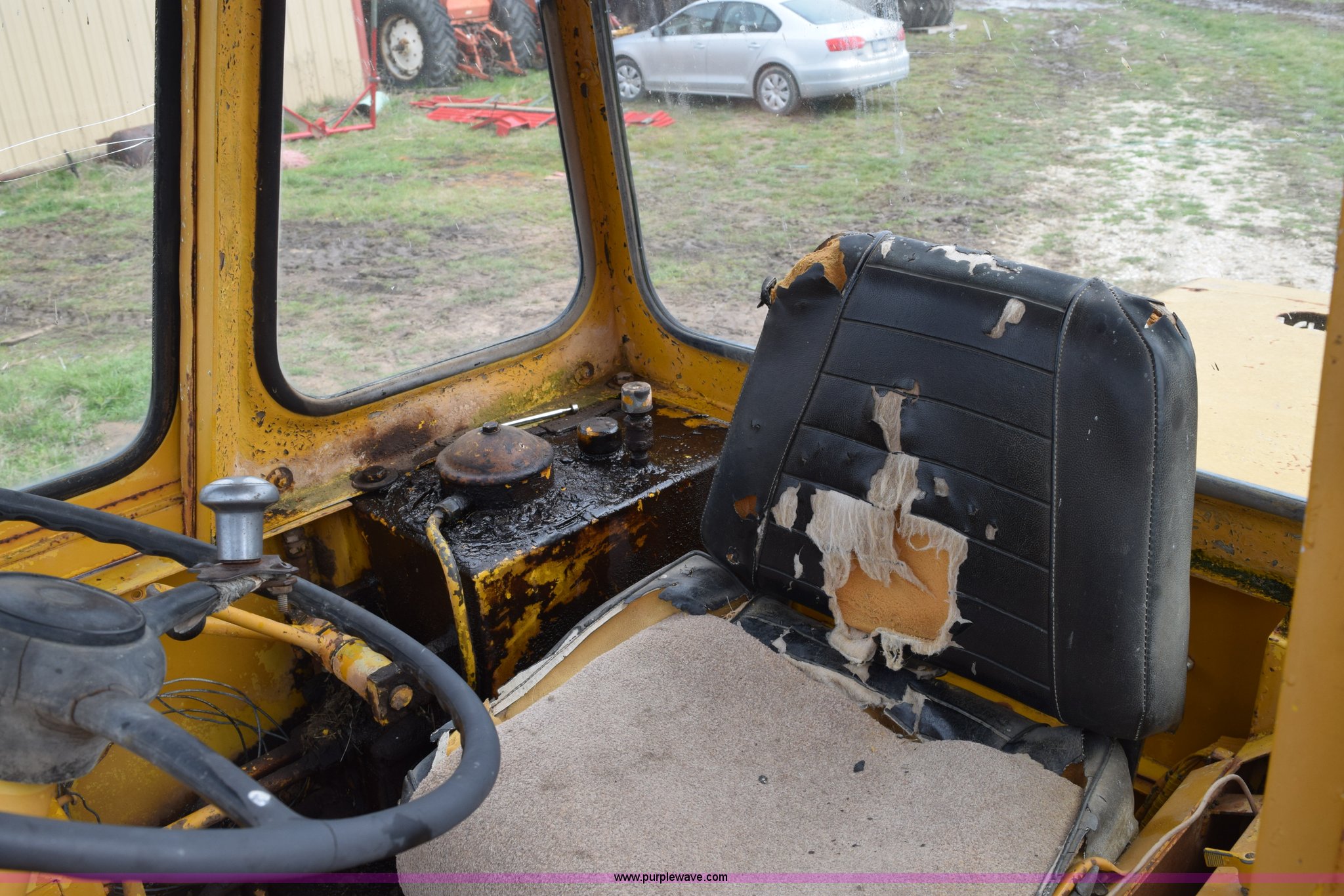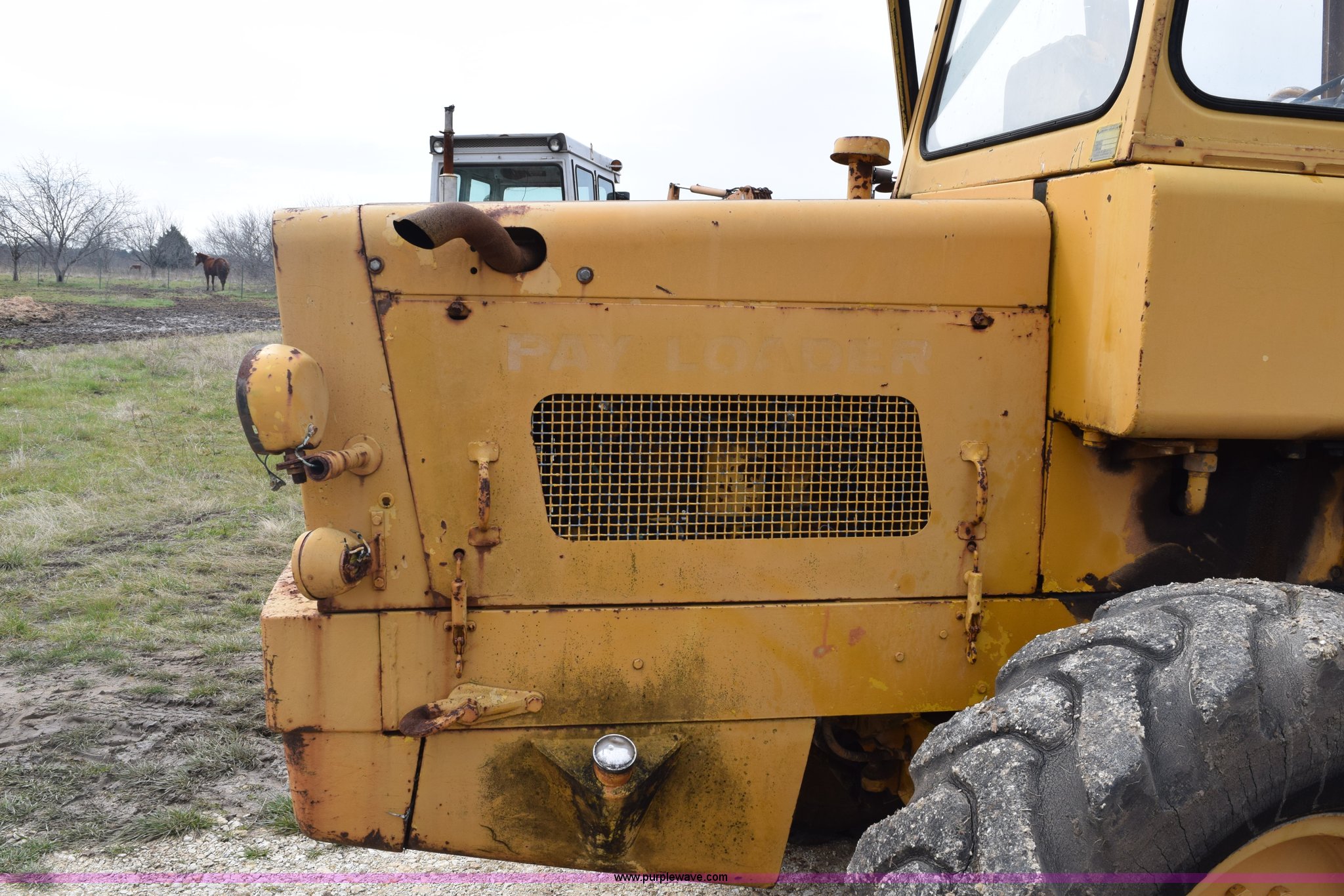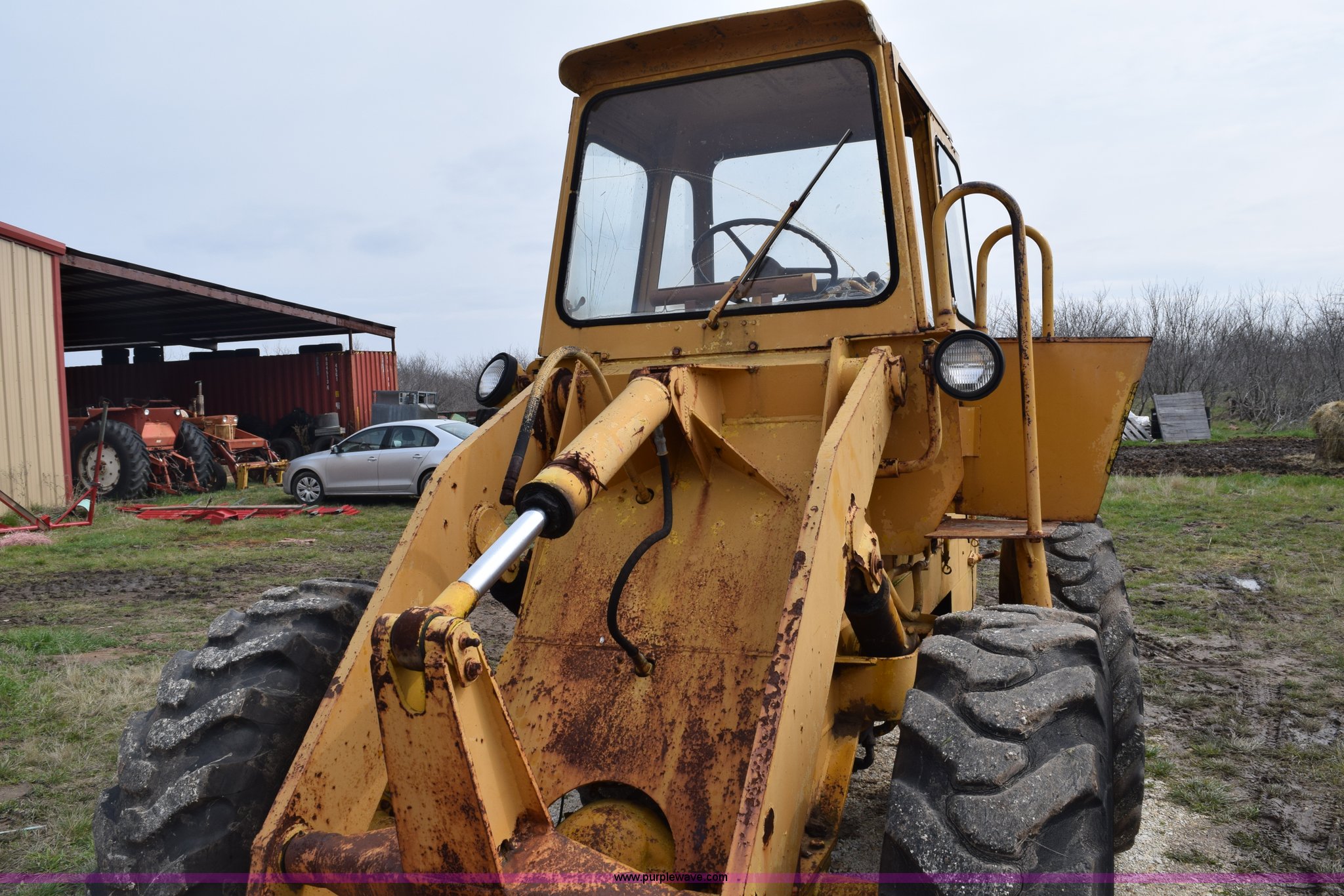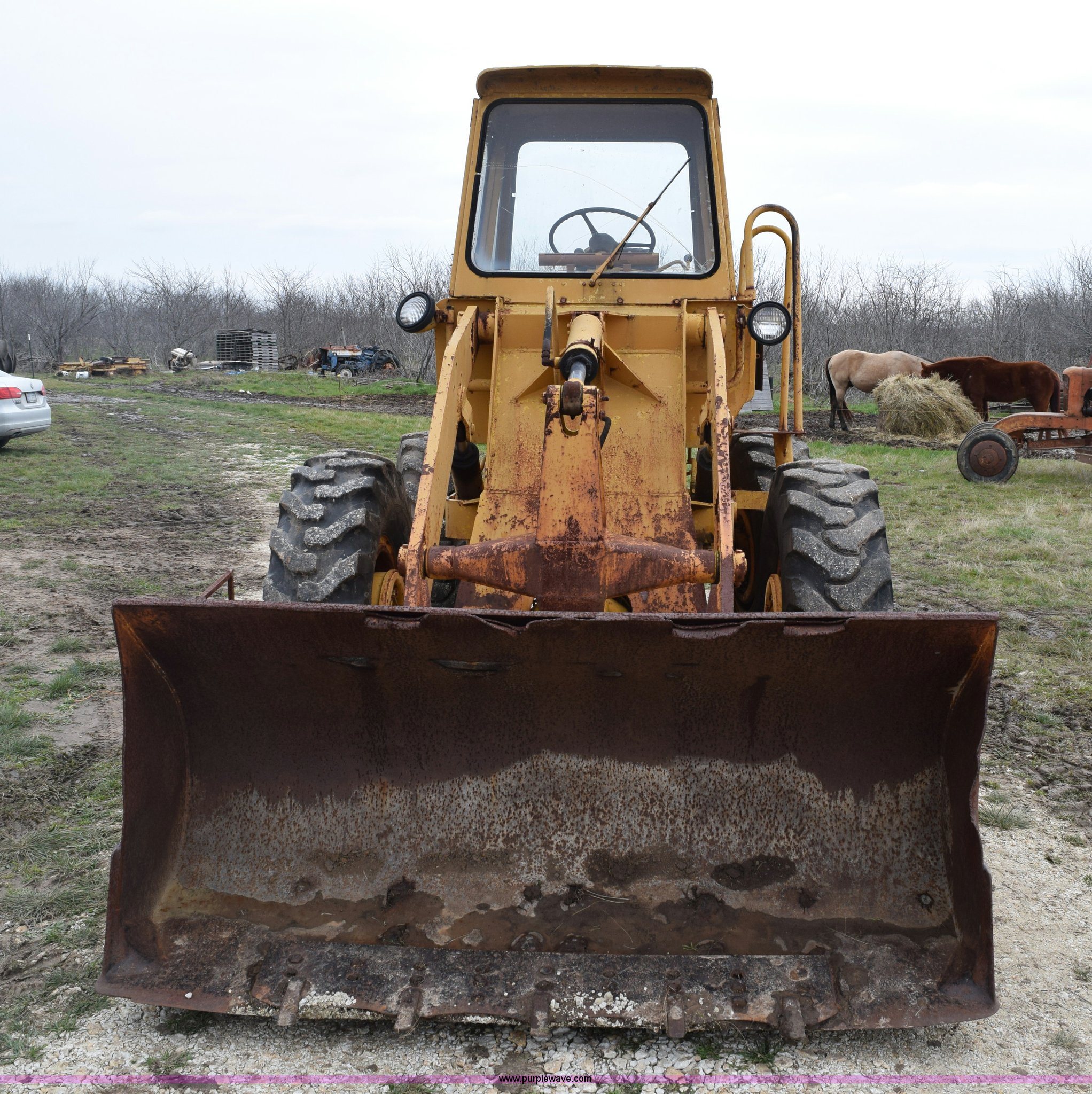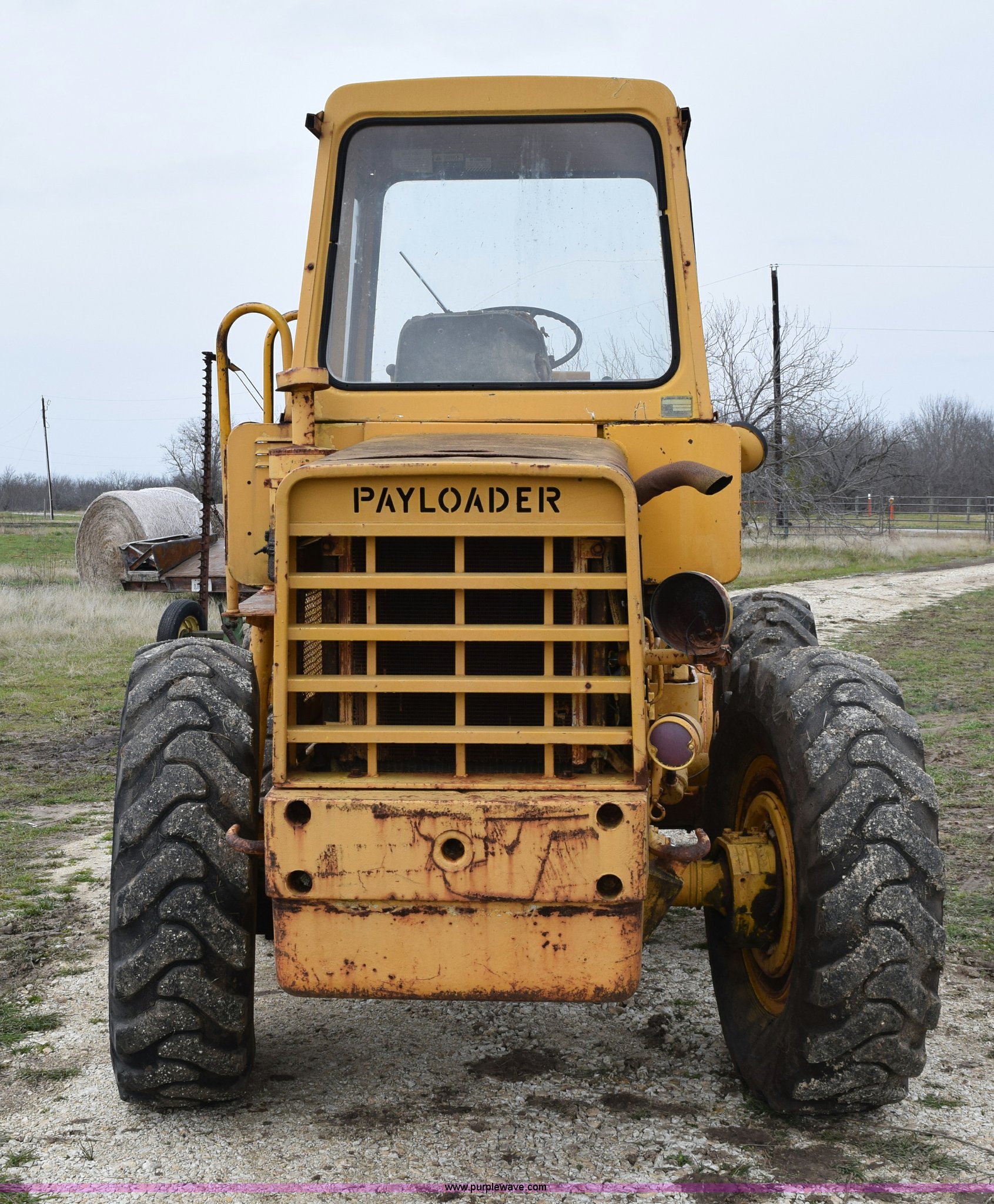 Purple Wave is selling a used Wheel Loader in Texas. This item is a Hough H30 wheel loader with the following: 5,012 hours on meter, International six cylinder gas engine, Three speed hydrostatic transmission, Four wheel drive, EROPS, Two stick loader control, 80"W toothed bucket, Serial 208091, Work lights, 13.00-24 tires, Rust, Window cracked, Non-operational hydraulic pump, Seat torn, Serial 27357