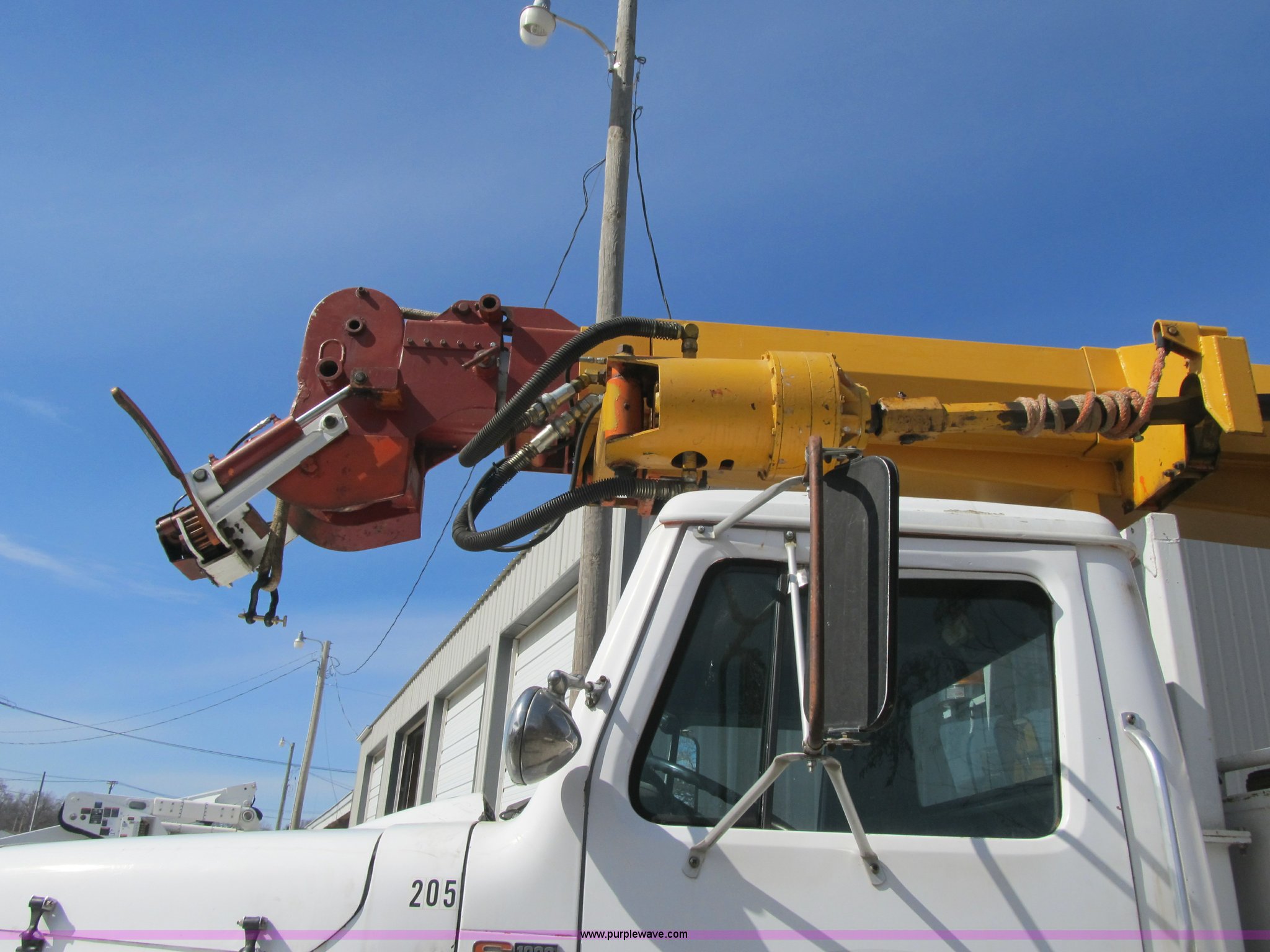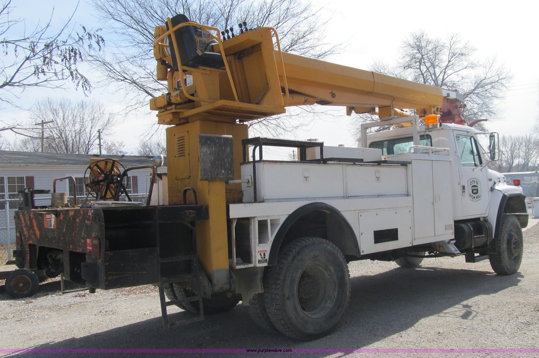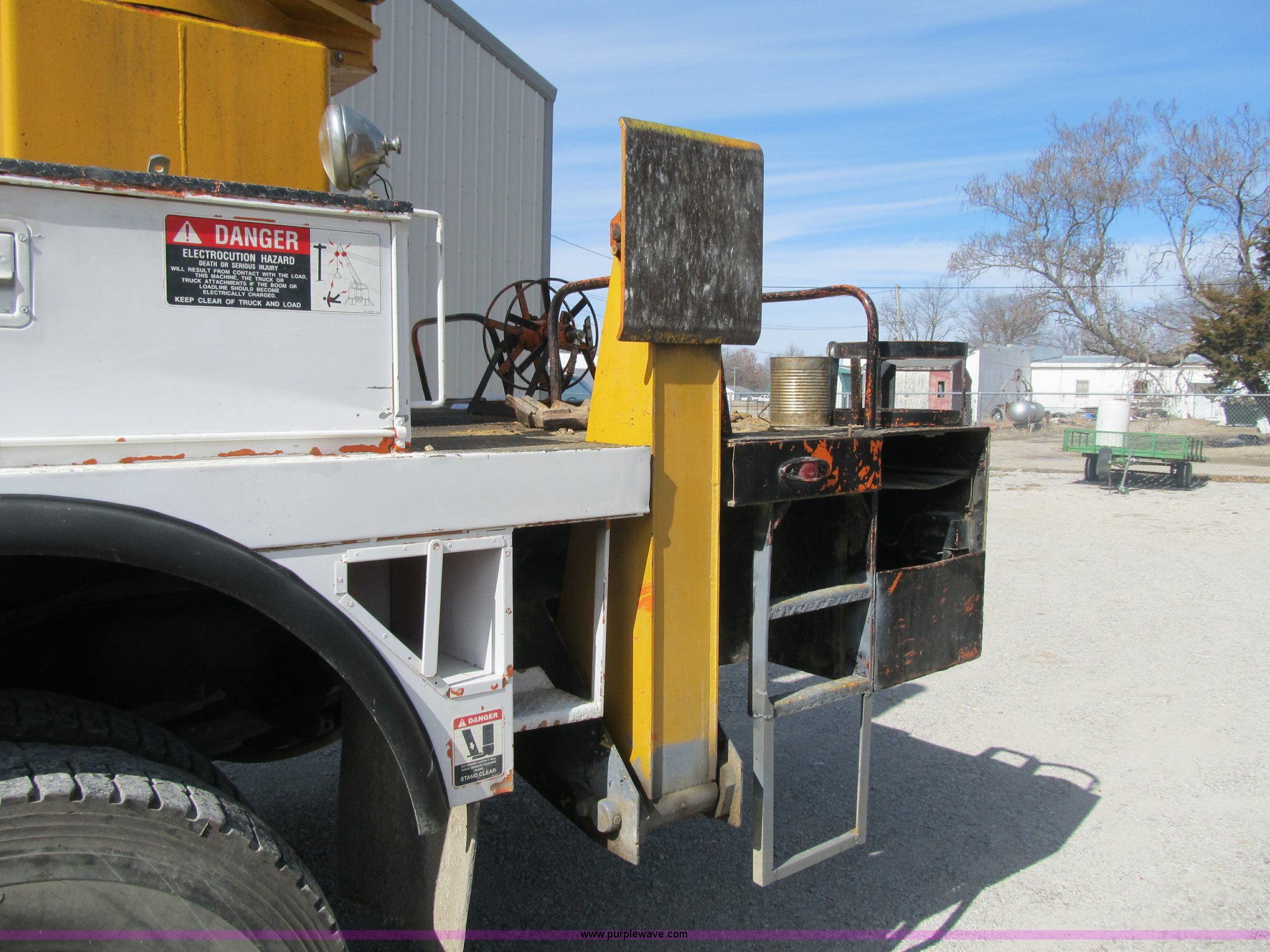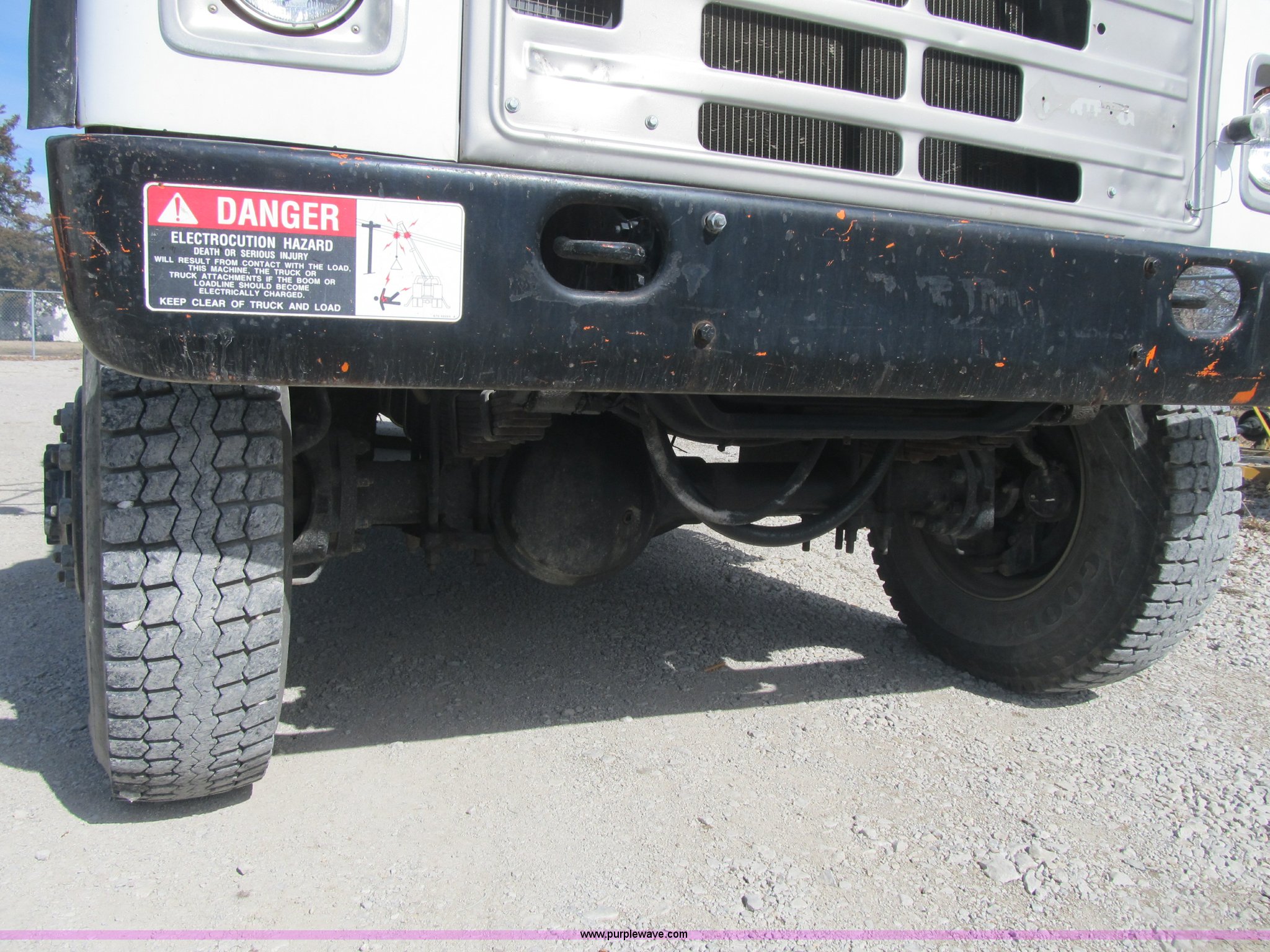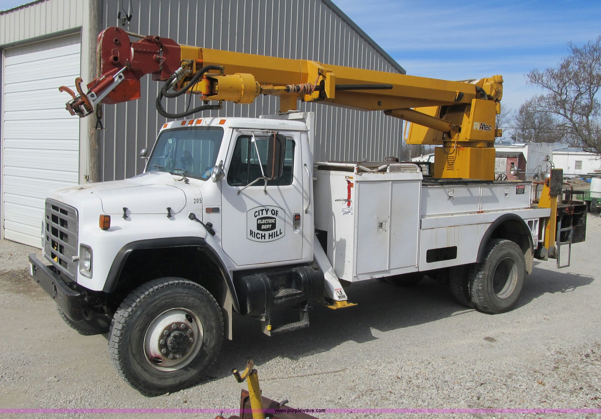 Purple Wave is selling a used Digger Derrick Truck in Missouri. This item is a 1988 International 1854 digger derrick truck with the following: 71,736 actual miles, International DT466 7.6L L6 diesel engine, Automatic transmission, Heat, PTO, Altec bed, (8) storage bay doors, Serial 17-4023011-84, D-1090-T digger derrick, 45'H, 10,800 lbs maximum lift capacity, Electric over hydraulic, Pole clamp, Auger shaft, Serial 0884-C0420, Front and rear hydraulic outriggers, Block heater, 50 gallon fuel tank, Pintle hitch, Trailer wiring, Spring suspension, Air brakes, 176" wheelbase, 12R22.5 tires