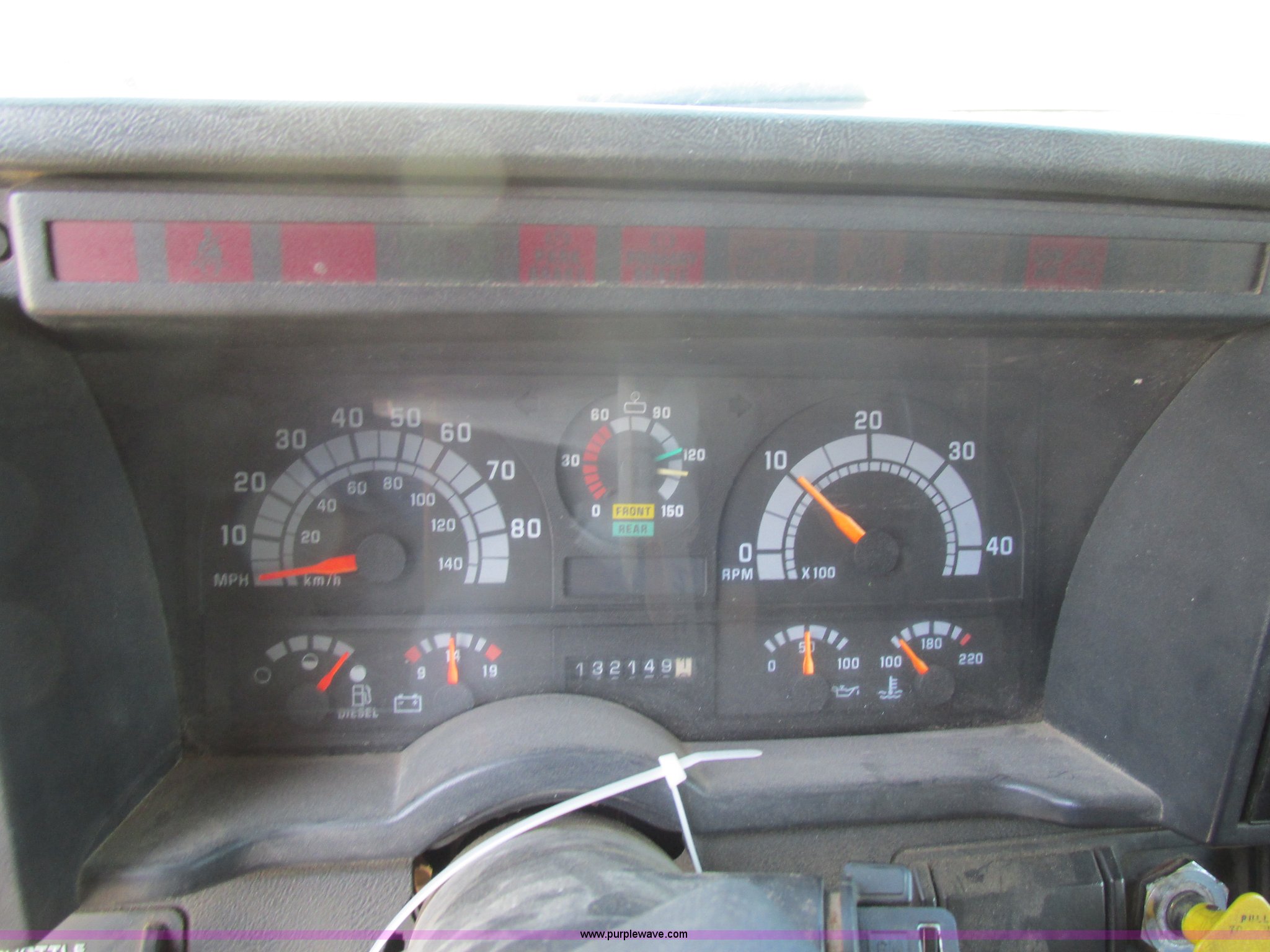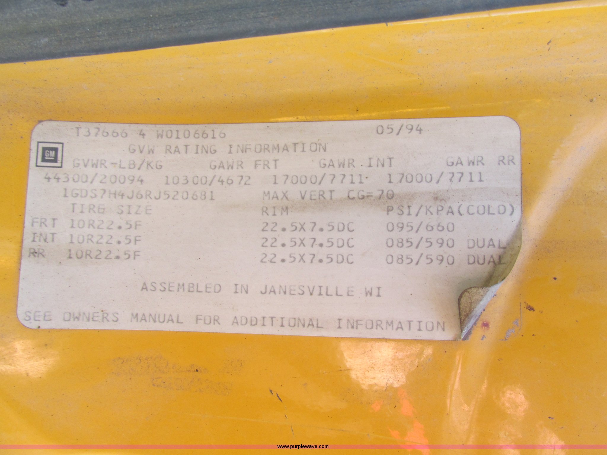 Purple Wave is selling a used Construction Dump Truck in Missouri. This item is a 1994 GMC TopKick dump truck with the following: 132,149 actual miles, 6,615 hours on meter, Caterpillar 3126 diesel engine, Automatic transmission, Transmission rebuilt fewer than 200 miles ago, Heat, 11'L dump bed, 34"H side boards, 10"H tip-top boards, Single ram three stage hoist, Air operated end gate, Manual rollover tarp, Front snow plow mount, In-cab controls, Cab guard, Dual 35 gallon fuel tanks, Spring suspension, Air brakes, 11R22.5 tires, GVWR 44,300 lbs, FAWR 10,300 lbs, IAWR 17,000 lbs, RAWR 17,000 lbs, Recently replaced muffler, Rust