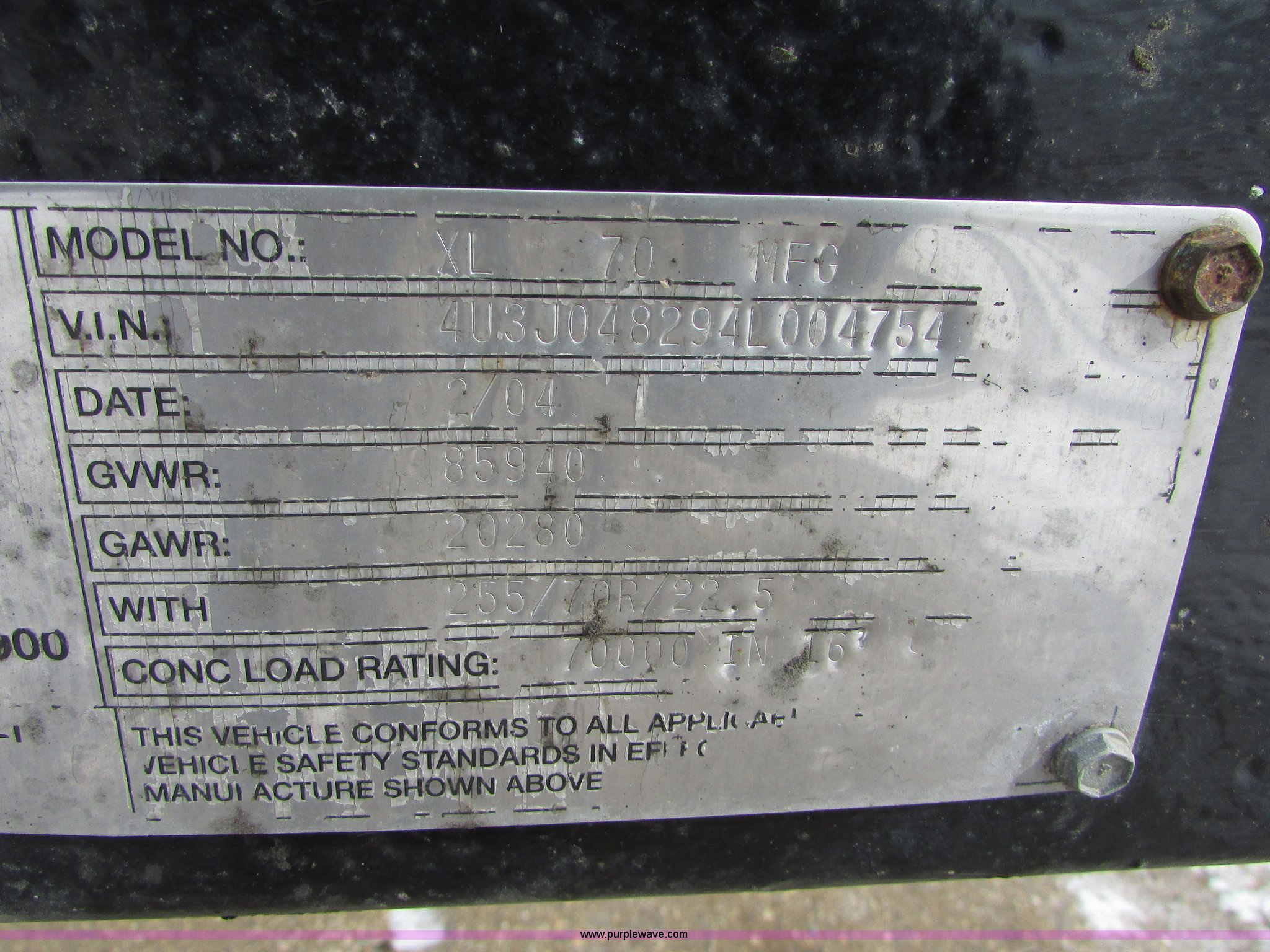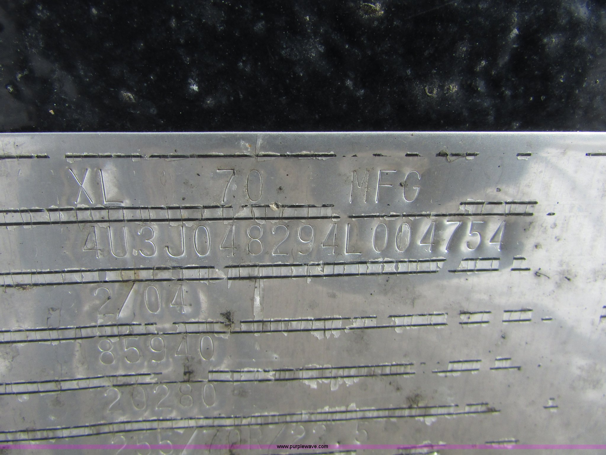 2004 XL Specialized XL 70 lowboy trailer. 48' overall length, 10'L x 102"W top deck, 29'L x 102"W well, 9'L x 102"W rear deck, Deck extenders, D-ring tie downs, Mechanical detachable neck, Rear air and auxiliary hookups, Air suspension , Air brakes, 255/70R22.5 tires, GVWR 85,940 lbs, GAWR 20,280 lbs per axle, Fourth axle selling as item I6586. Title distribution may be delayed up to 14 days from verification of funds. 4U3J048294L004754. 105 East 1st Avenue. Stockholm, SD 57264