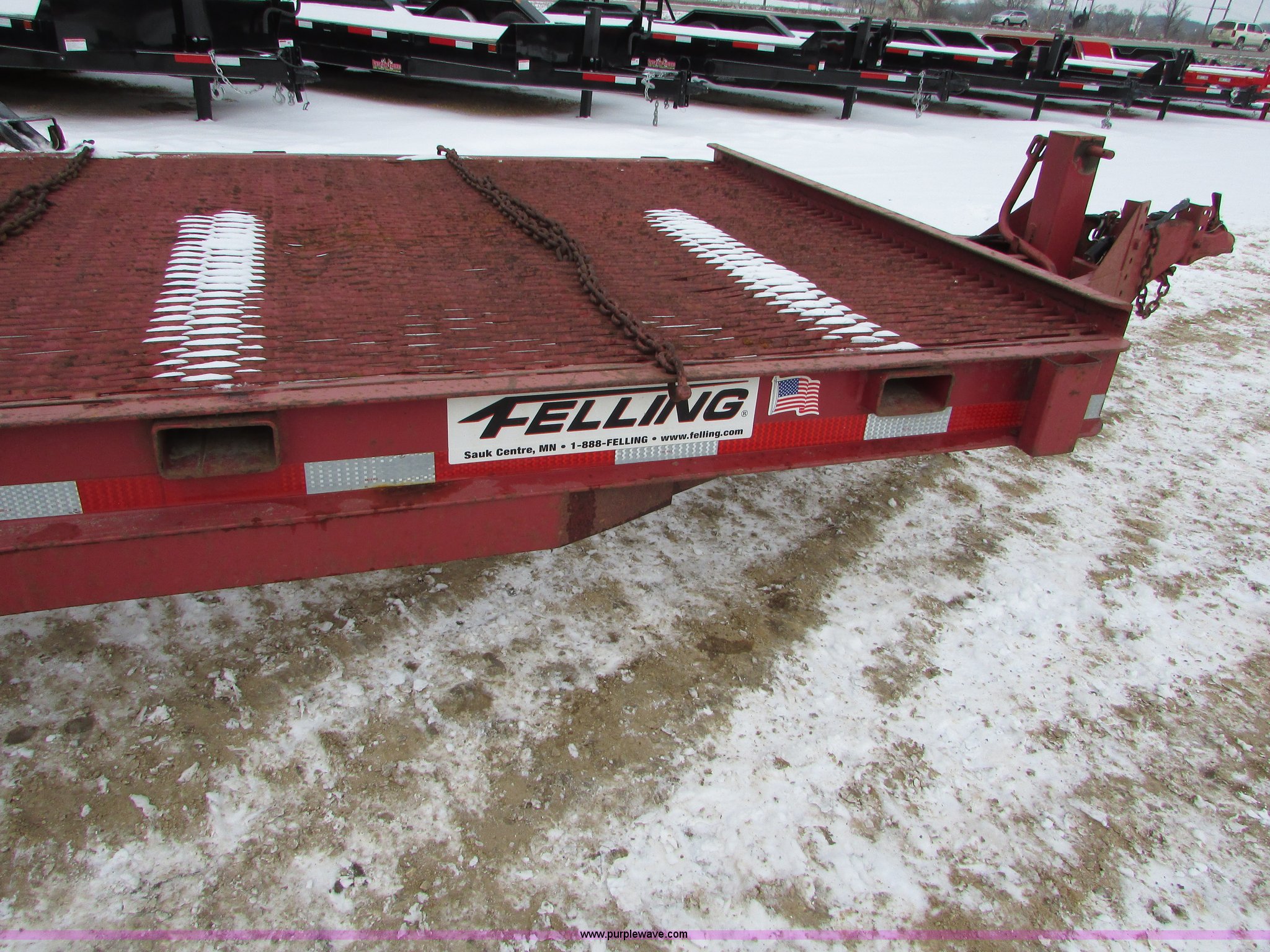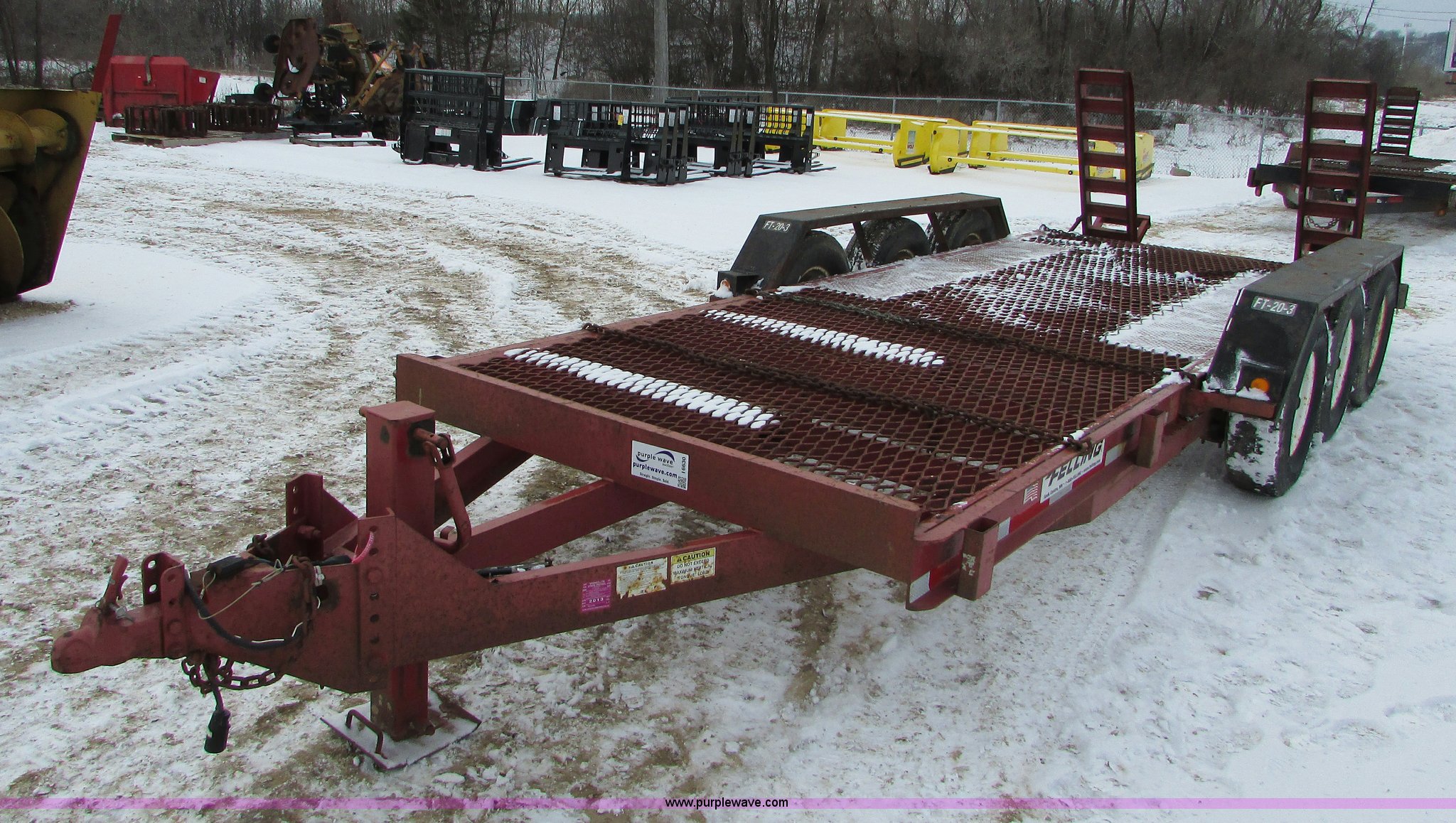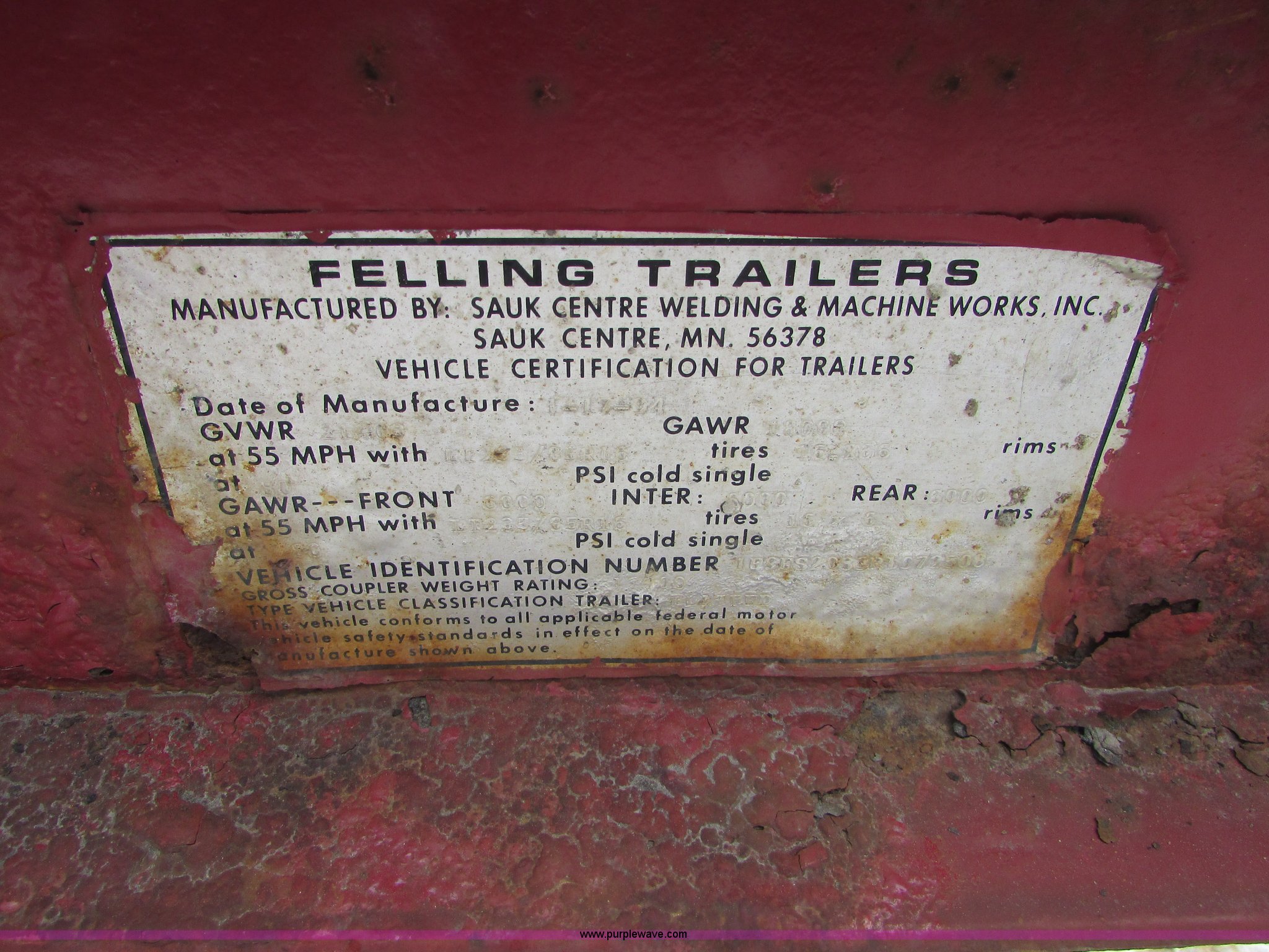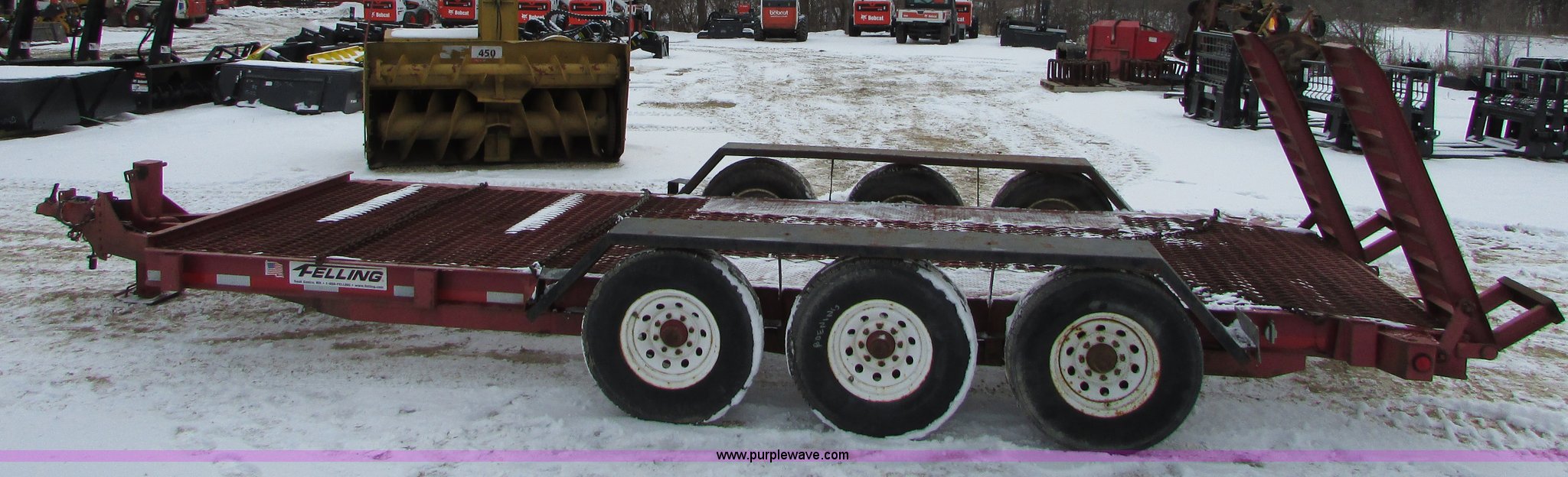 Purple Wave is selling a used Equip. Trailer in Minnesota. This item is a 1994 Felling FT-20-3 equipment trailer with the following: 18'L x 80"W deck, 2'L beavertail, Approximately 26'L x 103"W overall dimensions, 56"L x 15"W ramps, Stake side pockets, Fork holder, Jack stand, 2 5/16" ball hitch, Electric brakes, LT235/85R16 tires, GVWR 21,000 lbs, GAWR 6,000 lbs per axle