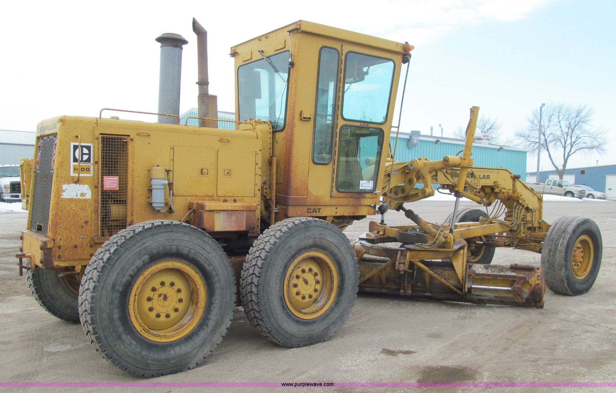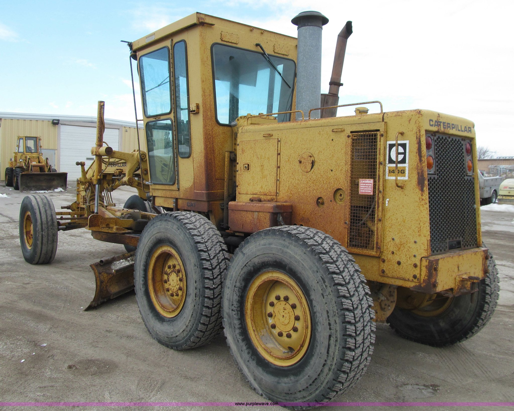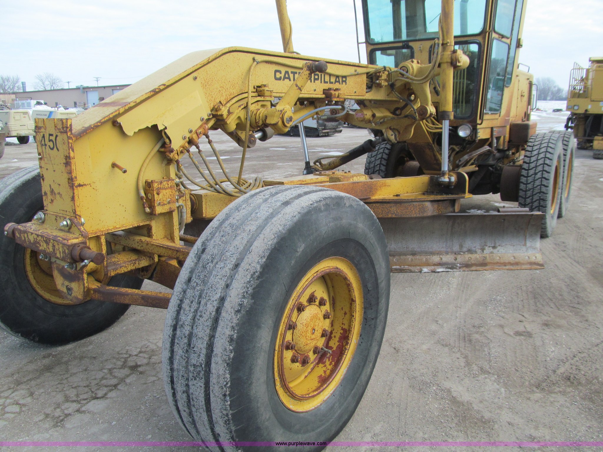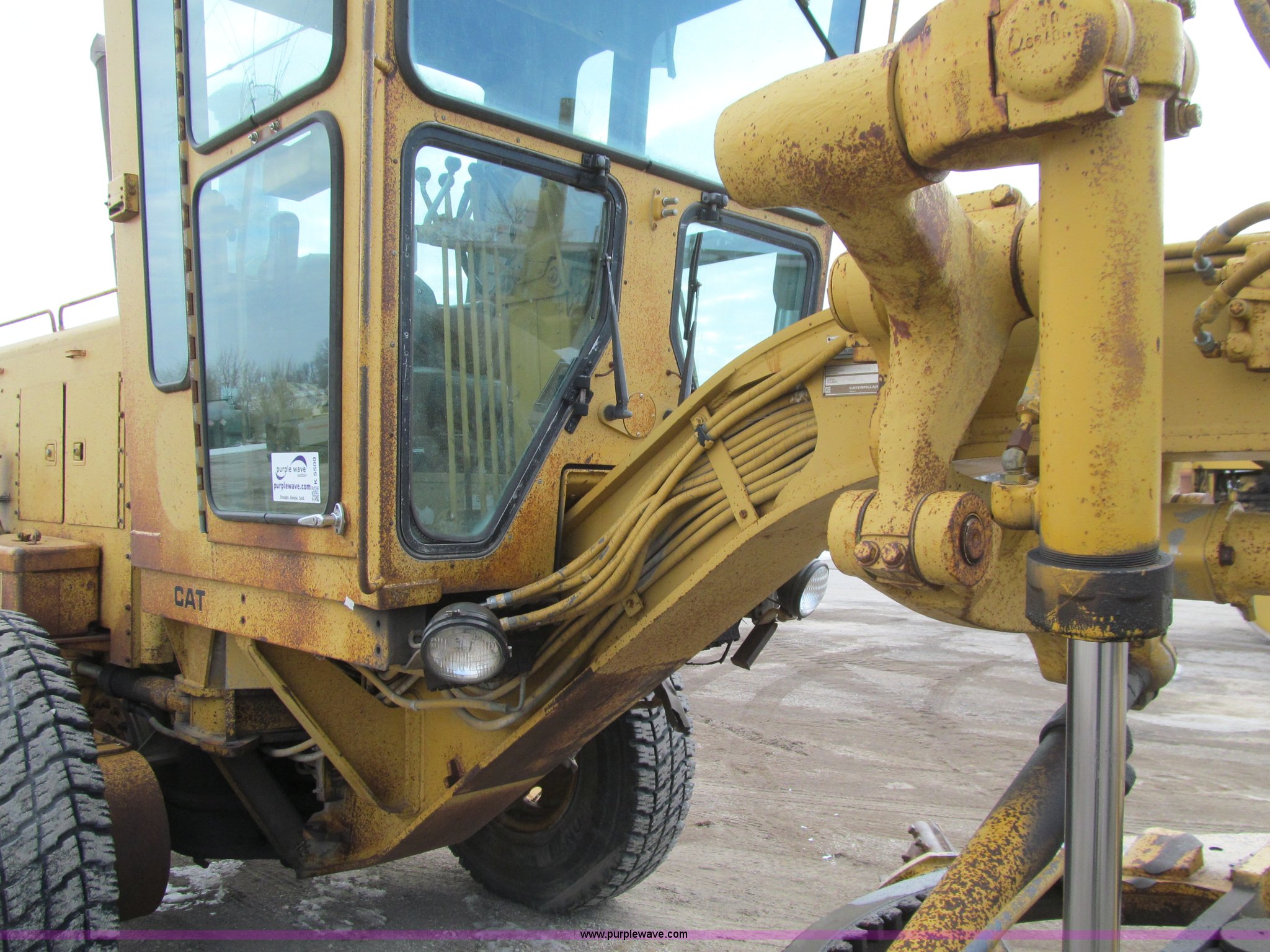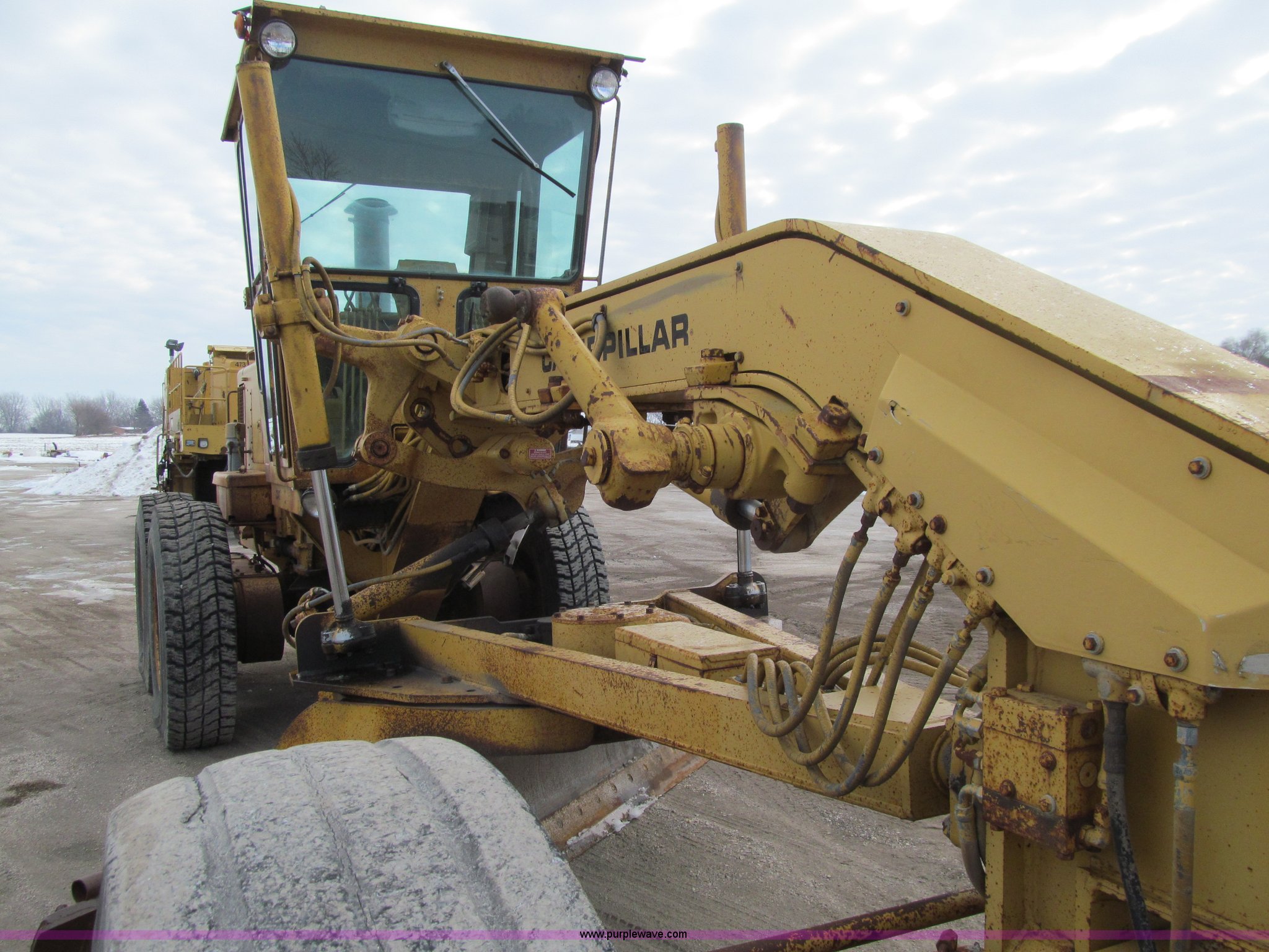 Purple Wave is selling a used Motor Grader in Iowa. This item is a 1984 Caterpillar 140G articulated motor grader with the following: 13,250 hours on meter, Caterpillar 3306 six cylinder turbo diesel engine, Powershift transmission, 6F-6R gears, EROPS, Heat, EMS panel, Suspension seat, High cab profile, Front work lights, Front and rear wipers, 12'W moldboard, Tip control, Side shift, Right and left moldboard bank slope, Mid-mount scarifier, (6) shanks, Unattached unit, 14.00-24 tires, 29,175 lbs. base operating weight, Moldboard lift cylinders seeping, Cab entry step bent, Door glass cracked, Headliner loose, Serial 72V07232