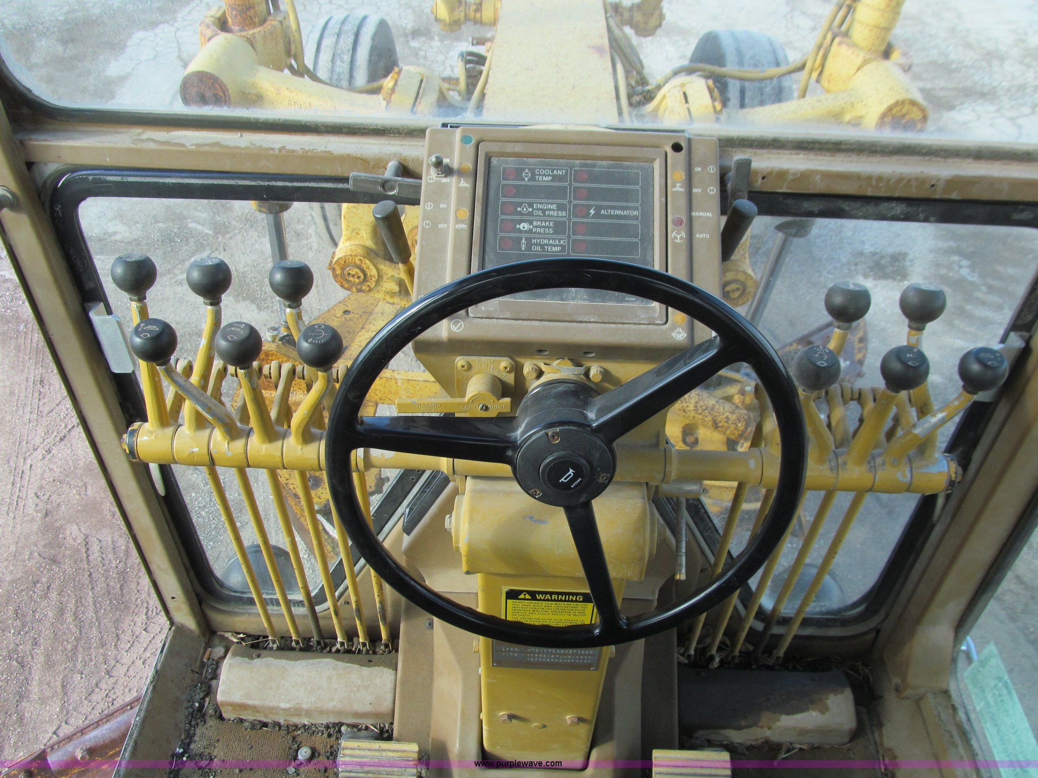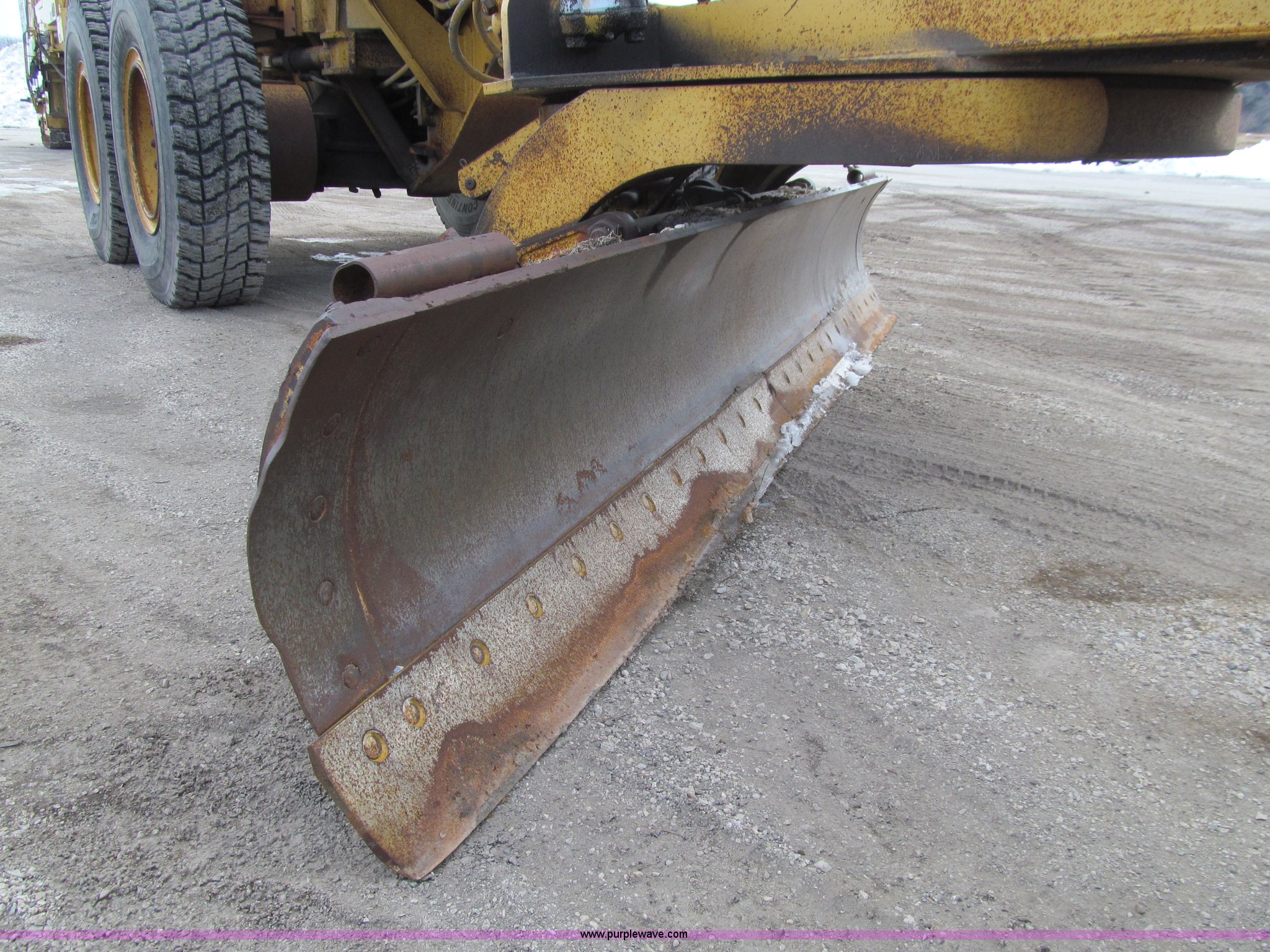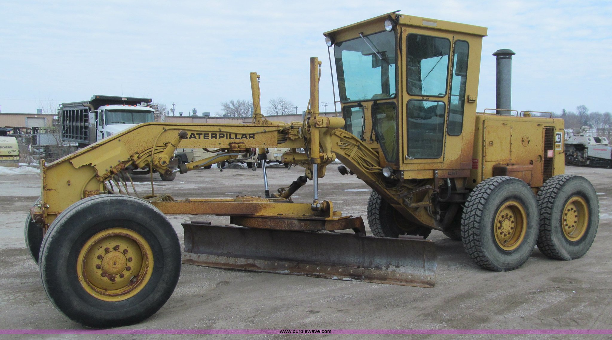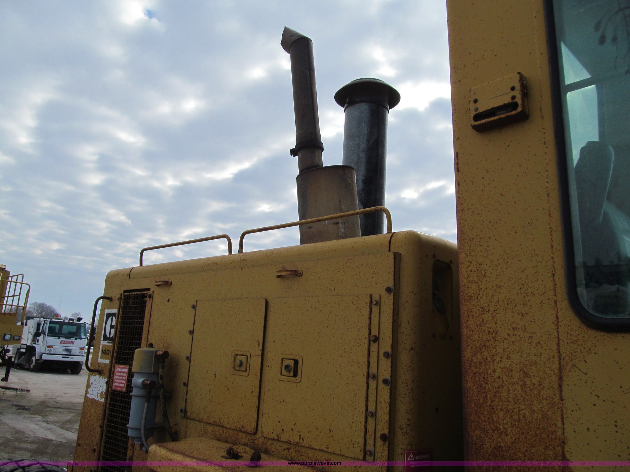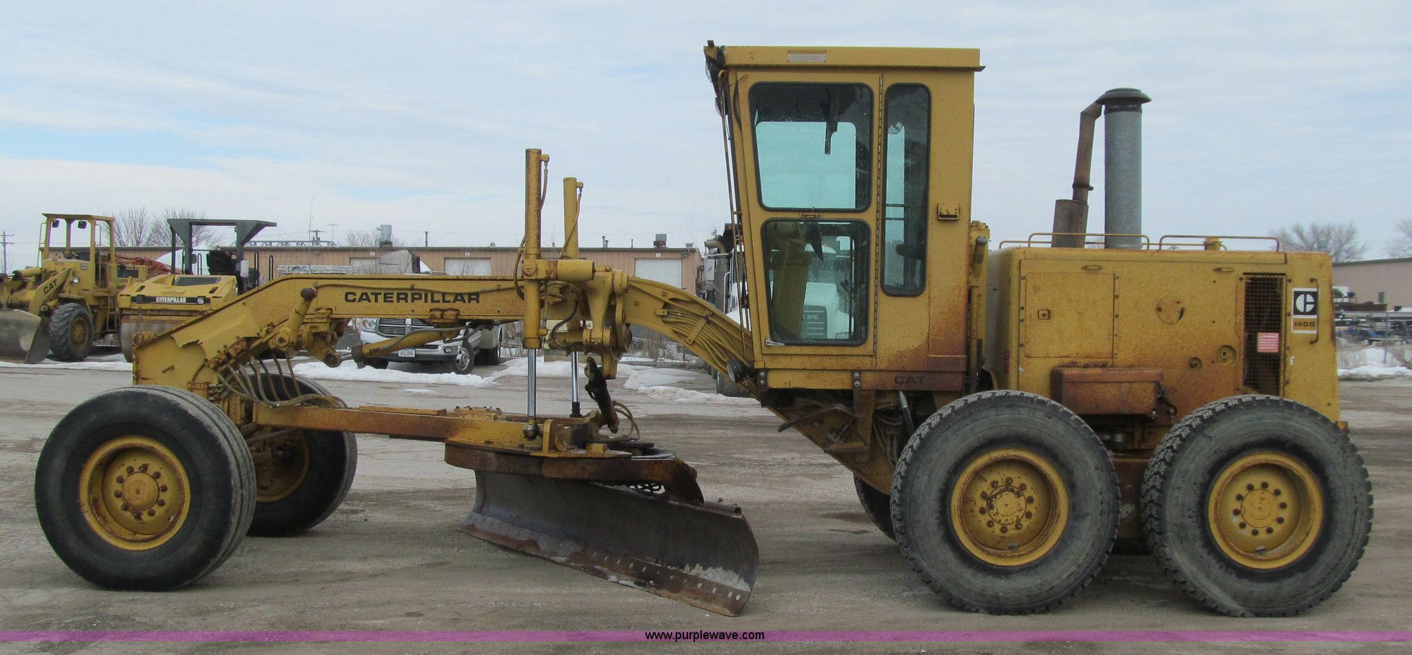 Purple Wave is selling a used Motor Grader in Iowa. This item is a 1984 Caterpillar 140G articulated motor grader with the following: 13,250 hours on meter, Caterpillar 3306 six cylinder turbo diesel engine, Powershift transmission, 6F-6R gears, EROPS, Heat, EMS panel, Suspension seat, High cab profile, Front work lights, Front and rear wipers, 12'W moldboard, Tip control, Side shift, Right and left moldboard bank slope, Mid-mount scarifier, (6) shanks, Unattached unit, 14.00-24 tires, 29,175 lbs. base operating weight, Moldboard lift cylinders seeping, Cab entry step bent, Door glass cracked, Headliner loose, Serial 72V07232