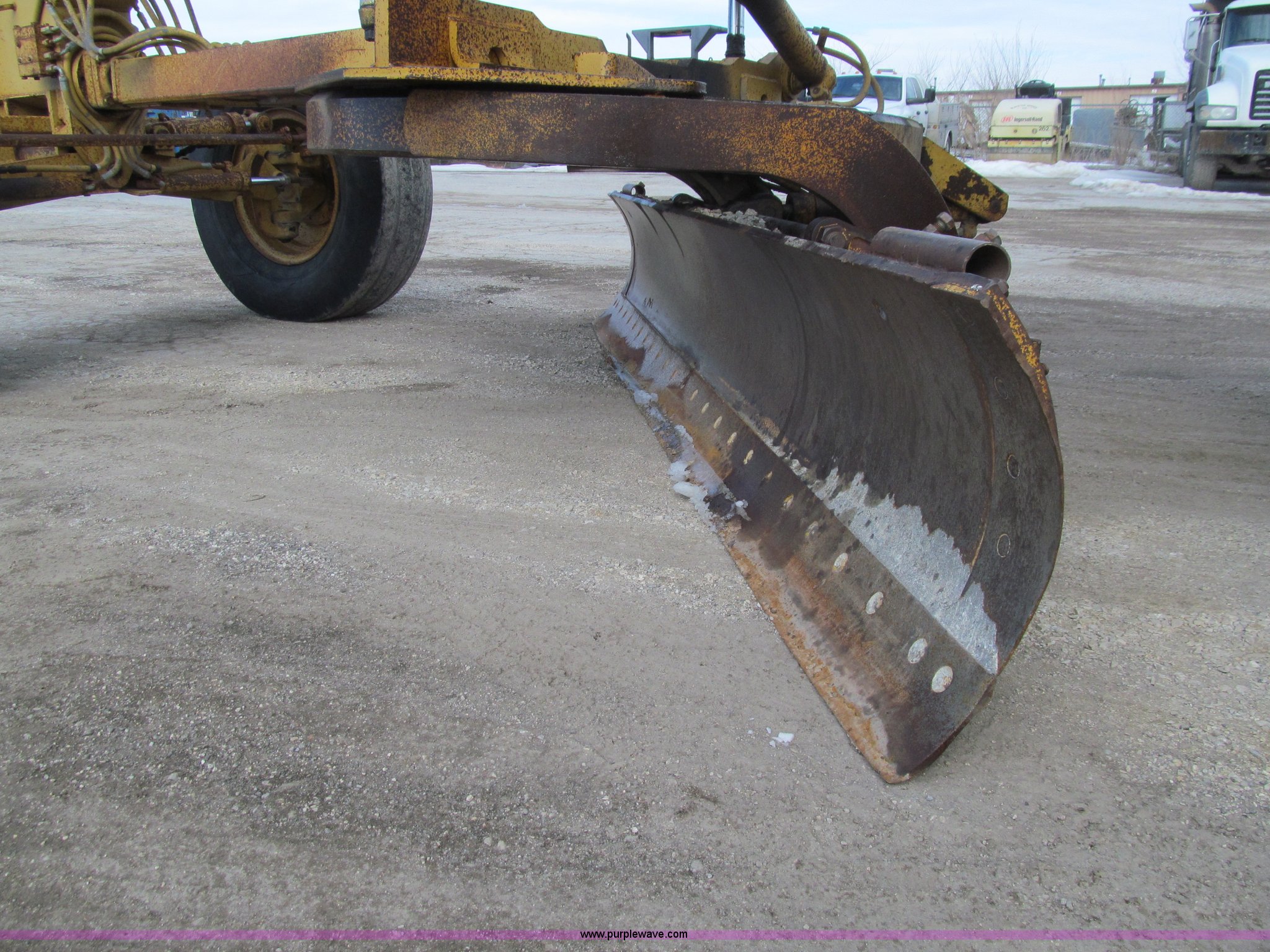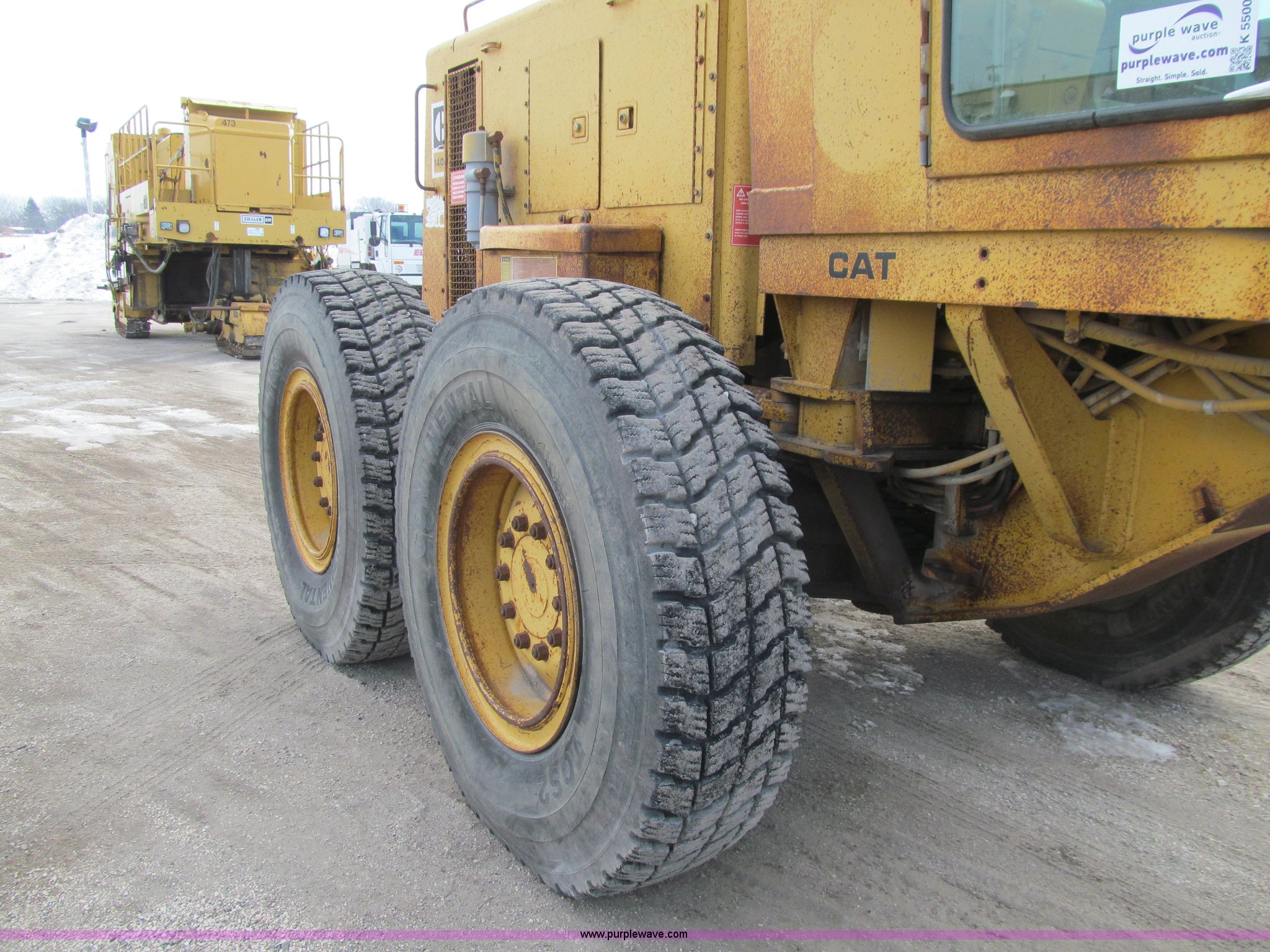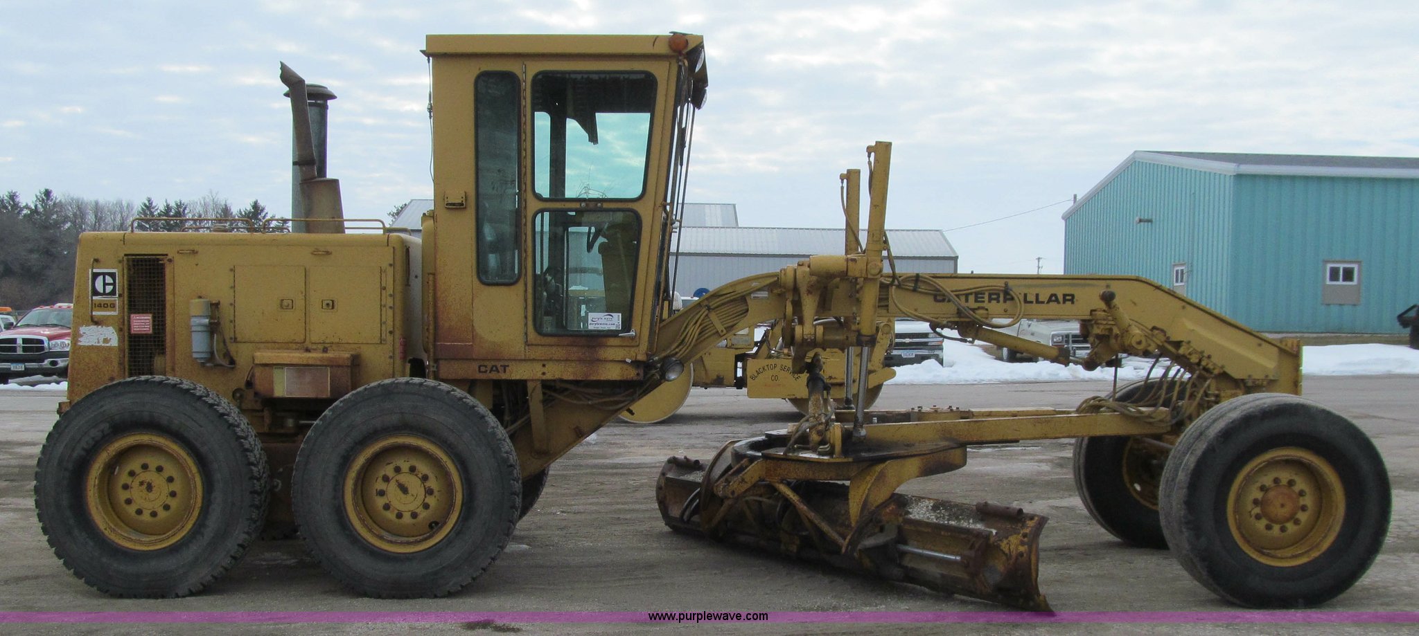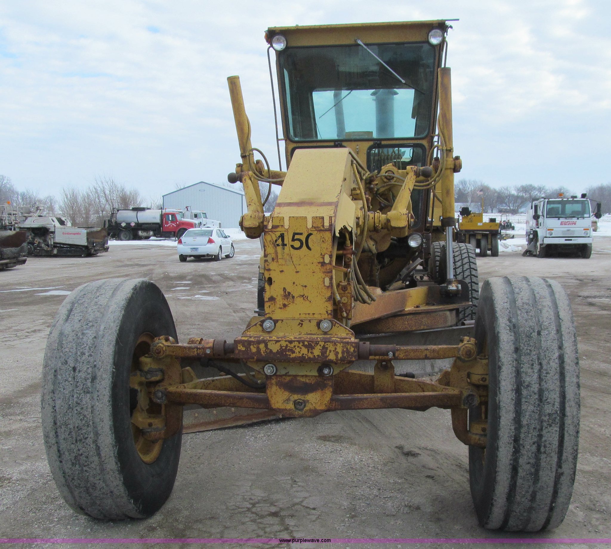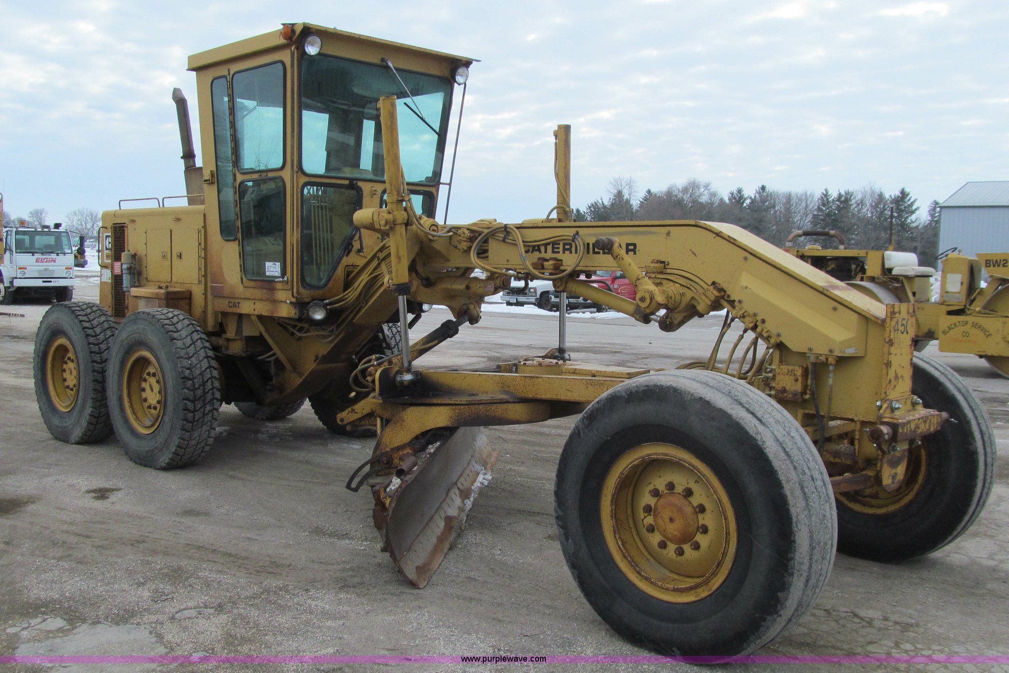Purple Wave is selling a used Motor Grader in Iowa. This item is a 1984 Caterpillar 140G articulated motor grader with the following: 13,250 hours on meter, Caterpillar 3306 six cylinder turbo diesel engine, Powershift transmission, 6F-6R gears, EROPS, Heat, EMS panel, Suspension seat, High cab profile, Front work lights, Front and rear wipers, 12'W moldboard, Tip control, Side shift, Right and left moldboard bank slope, Mid-mount scarifier, (6) shanks, Unattached unit, 14.00-24 tires, 29,175 lbs. base operating weight, Moldboard lift cylinders seeping, Cab entry step bent, Door glass cracked, Headliner loose, Serial 72V07232