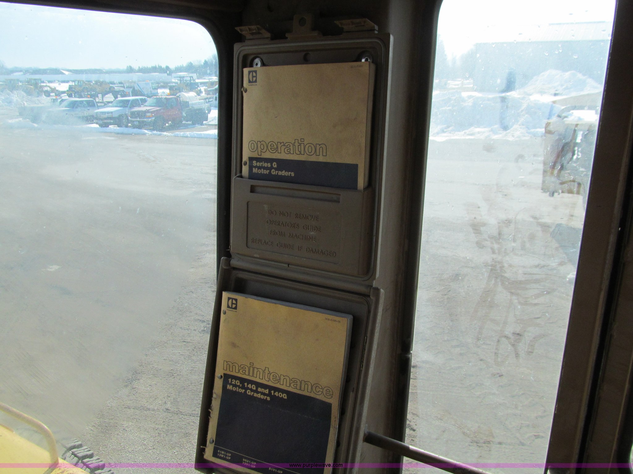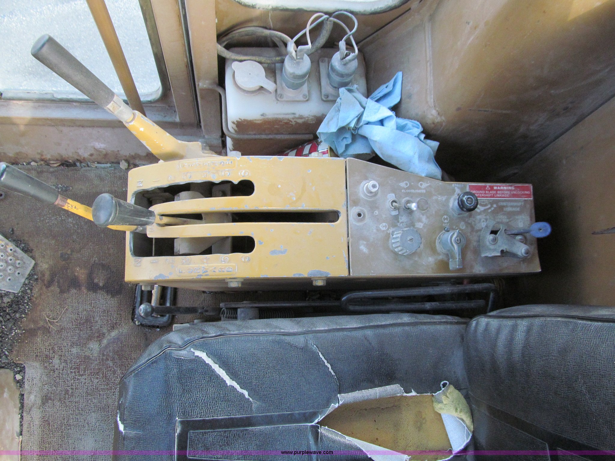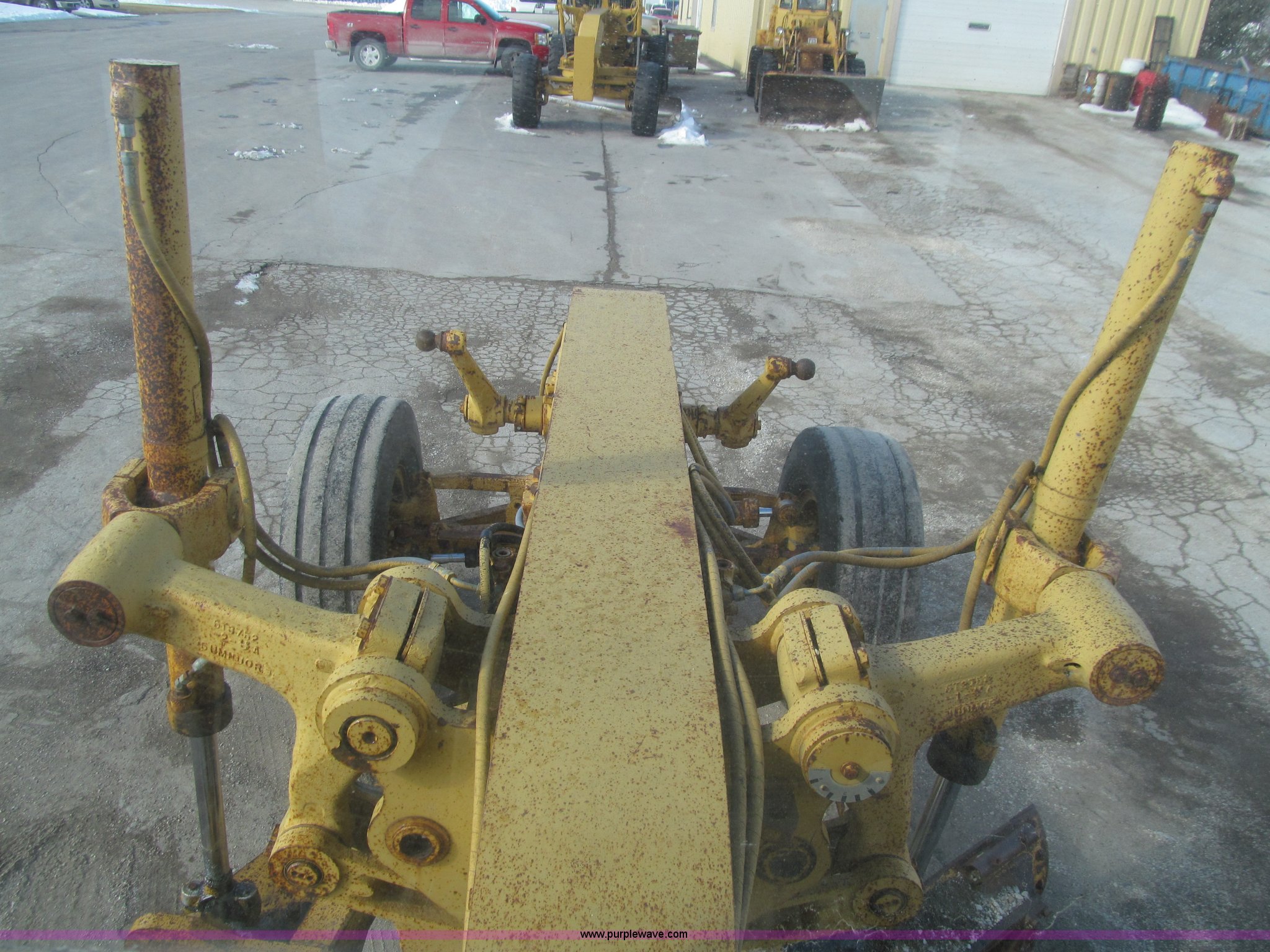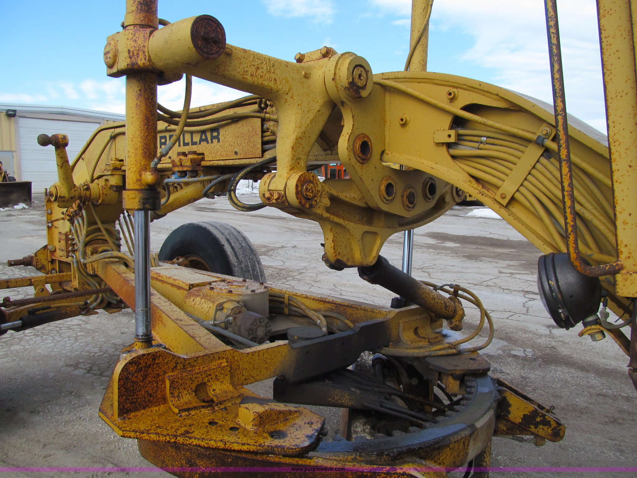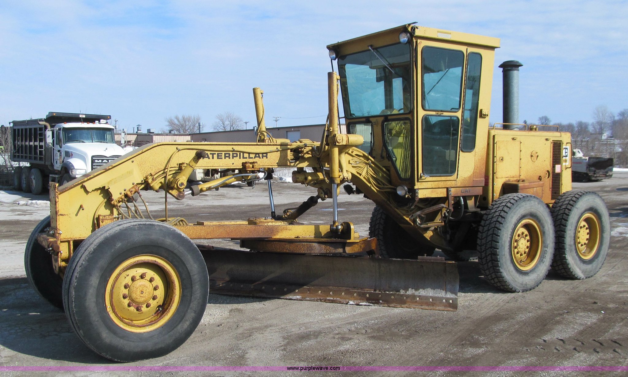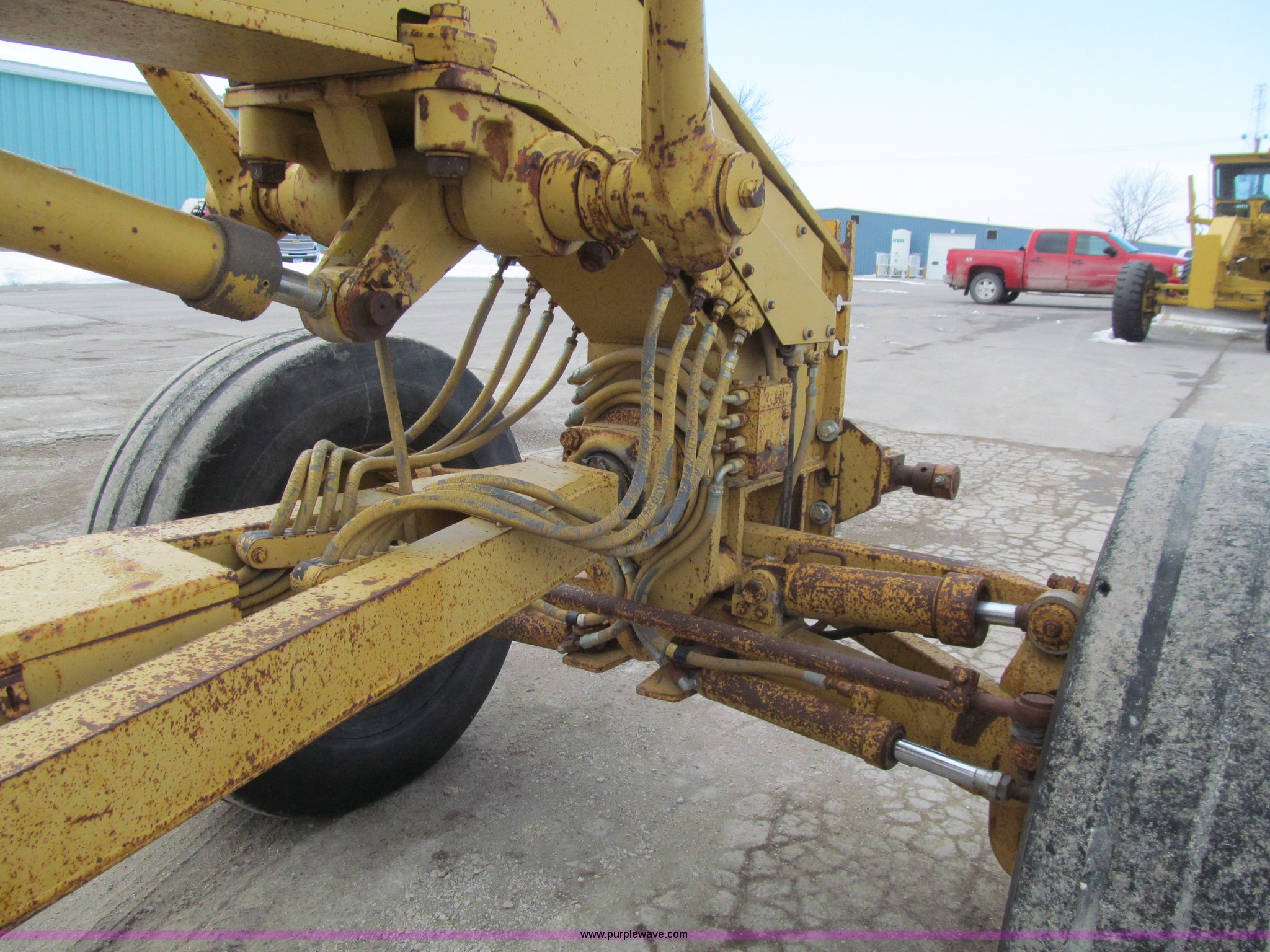 Purple Wave is selling a used Motor Grader in Iowa. This item is a 1984 Caterpillar 140G articulated motor grader with the following: 13,250 hours on meter, Caterpillar 3306 six cylinder turbo diesel engine, Powershift transmission, 6F-6R gears, EROPS, Heat, EMS panel, Suspension seat, High cab profile, Front work lights, Front and rear wipers, 12'W moldboard, Tip control, Side shift, Right and left moldboard bank slope, Mid-mount scarifier, (6) shanks, Unattached unit, 14.00-24 tires, 29,175 lbs. base operating weight, Moldboard lift cylinders seeping, Cab entry step bent, Door glass cracked, Headliner loose, Serial 72V07232