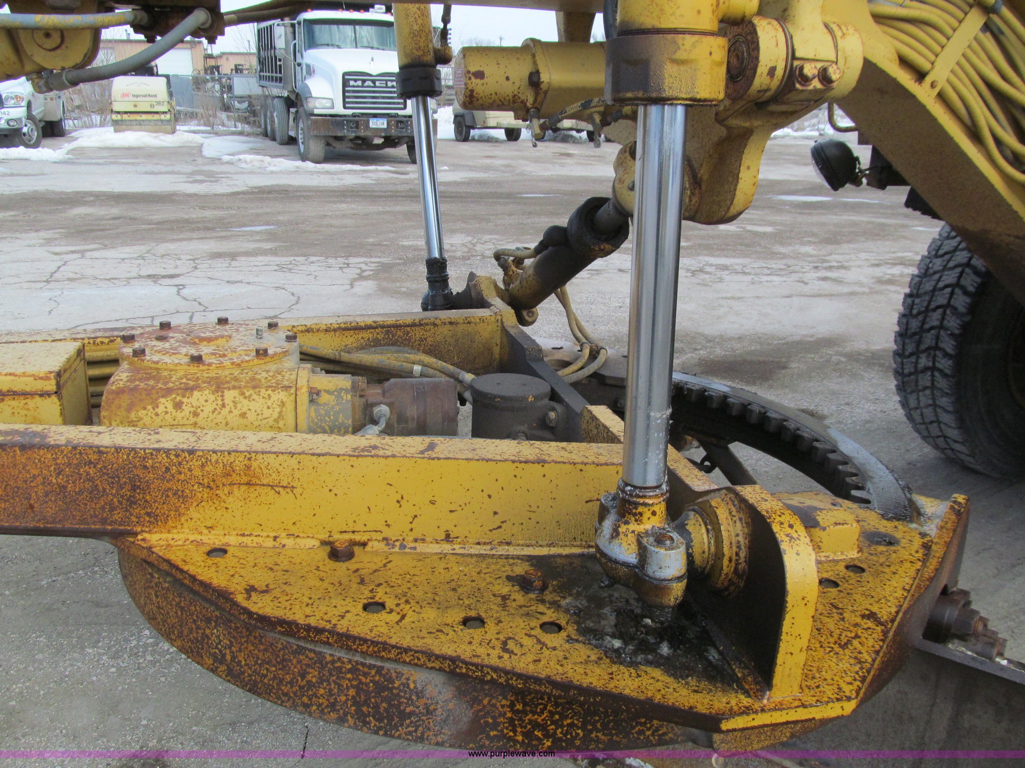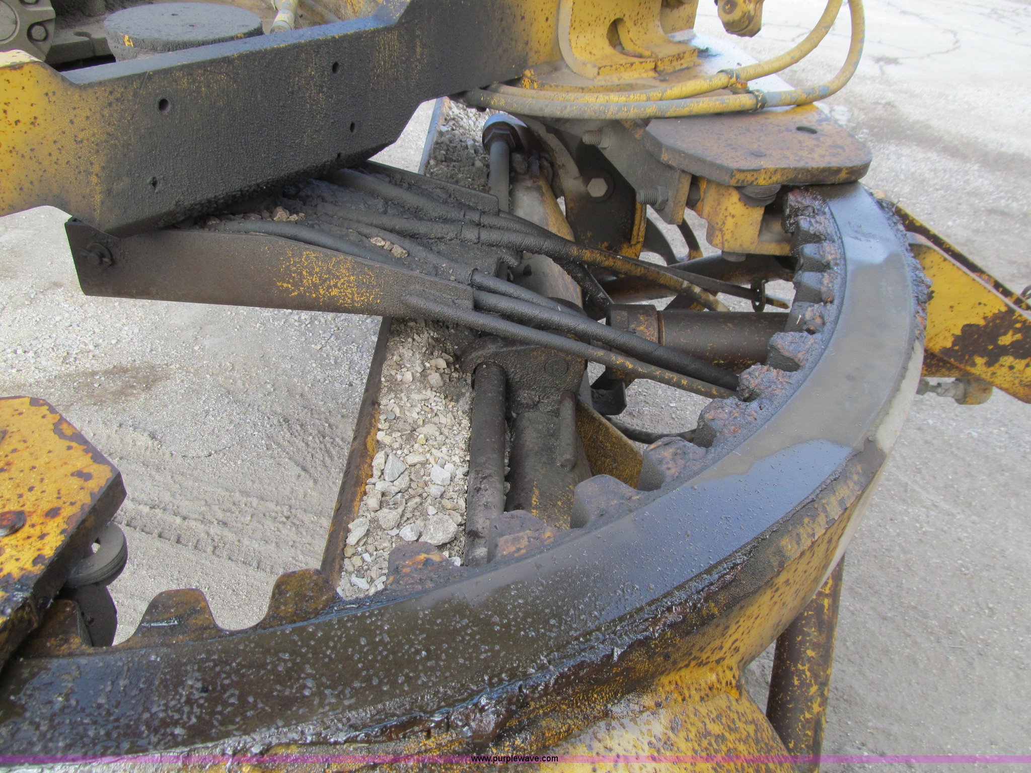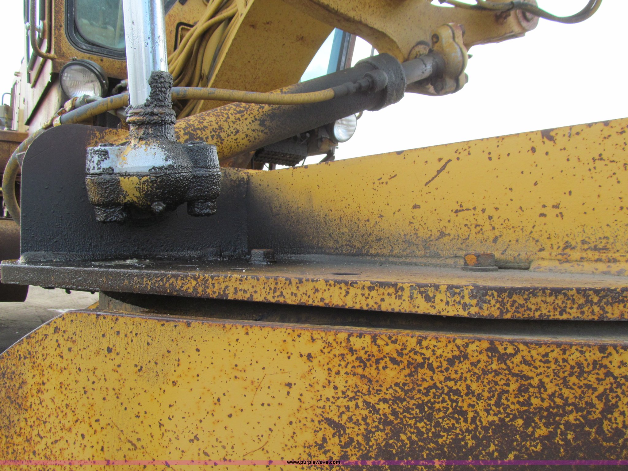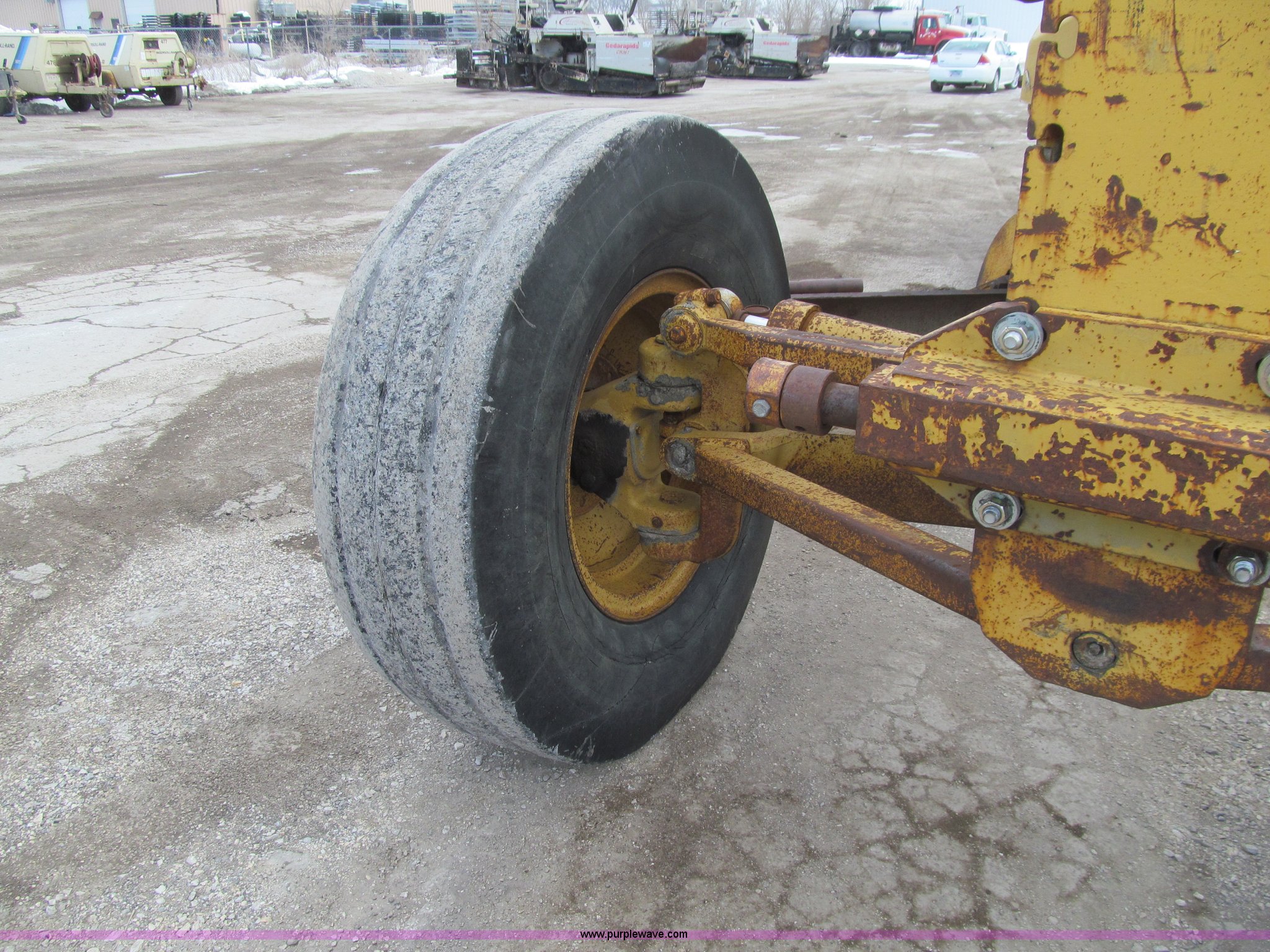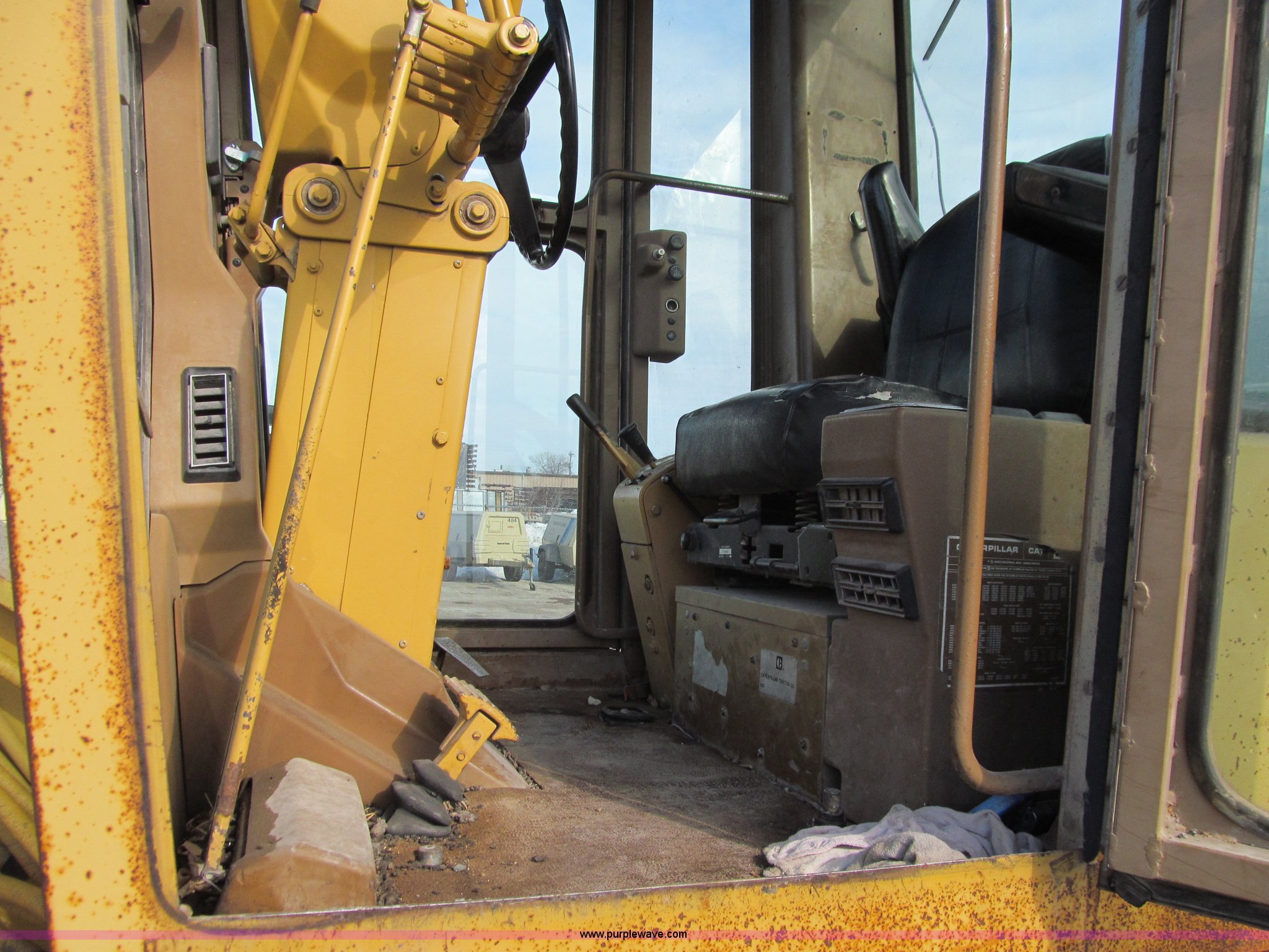 Purple Wave is selling a used Motor Grader in Iowa. This item is a 1984 Caterpillar 140G articulated motor grader with the following: 13,250 hours on meter, Caterpillar 3306 six cylinder turbo diesel engine, Powershift transmission, 6F-6R gears, EROPS, Heat, EMS panel, Suspension seat, High cab profile, Front work lights, Front and rear wipers, 12'W moldboard, Tip control, Side shift, Right and left moldboard bank slope, Mid-mount scarifier, (6) shanks, Unattached unit, 14.00-24 tires, 29,175 lbs. base operating weight, Moldboard lift cylinders seeping, Cab entry step bent, Door glass cracked, Headliner loose, Serial 72V07232
