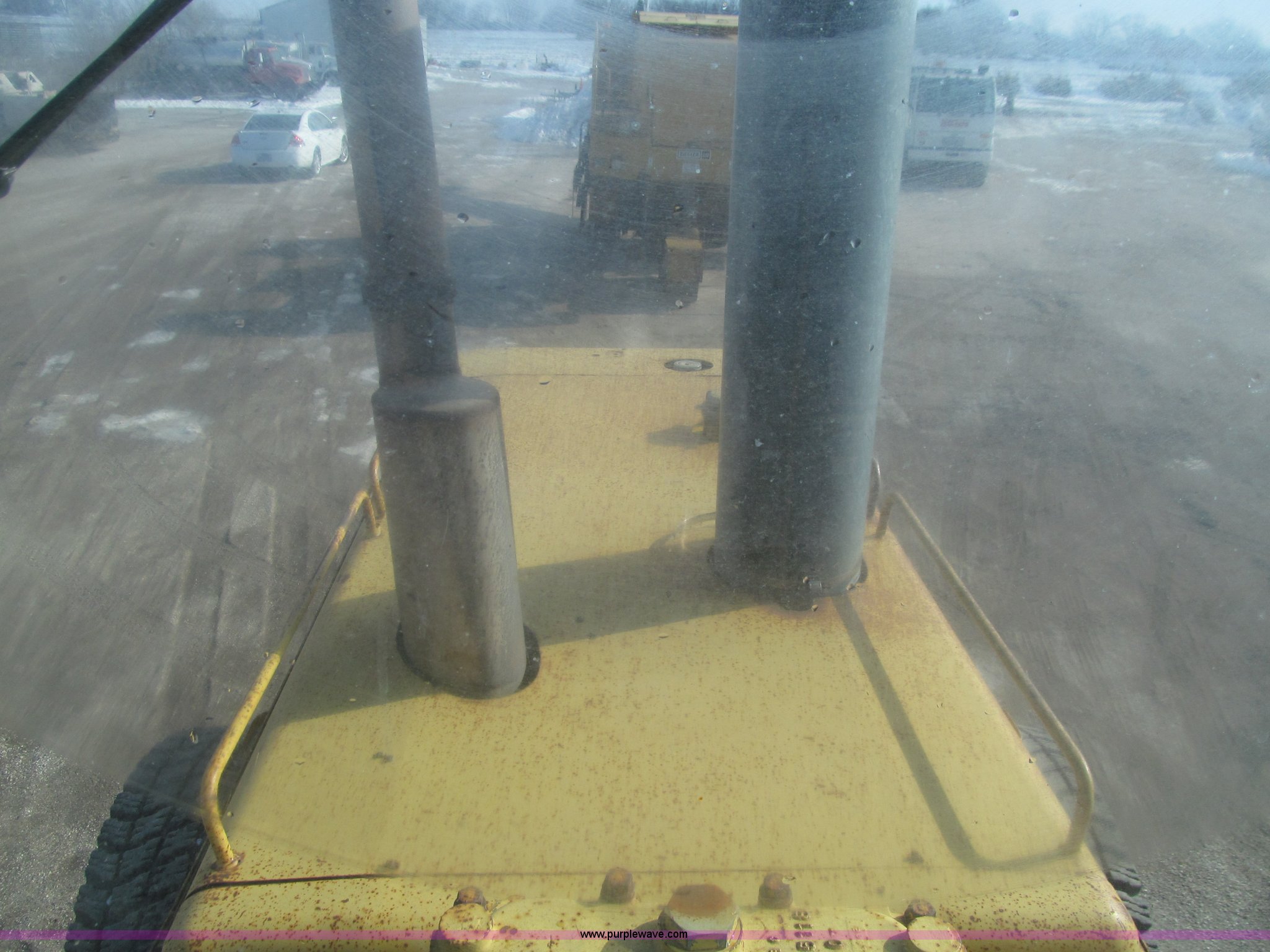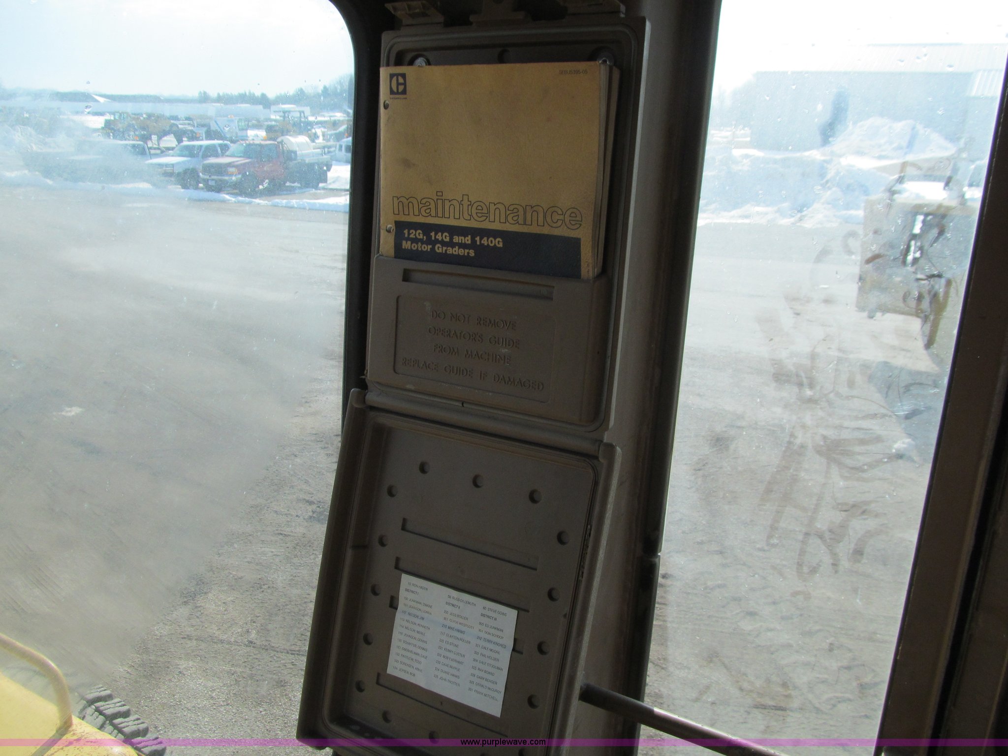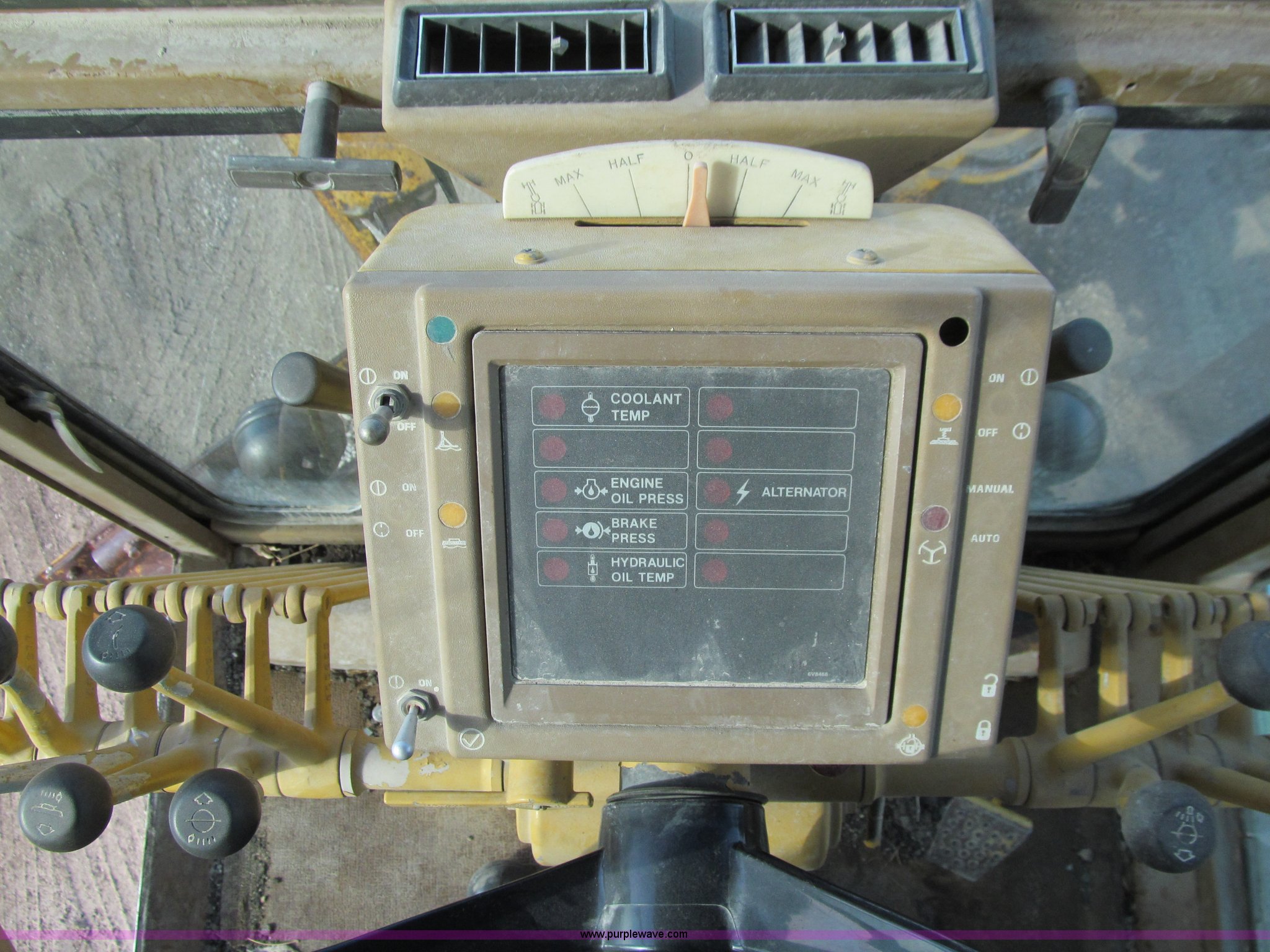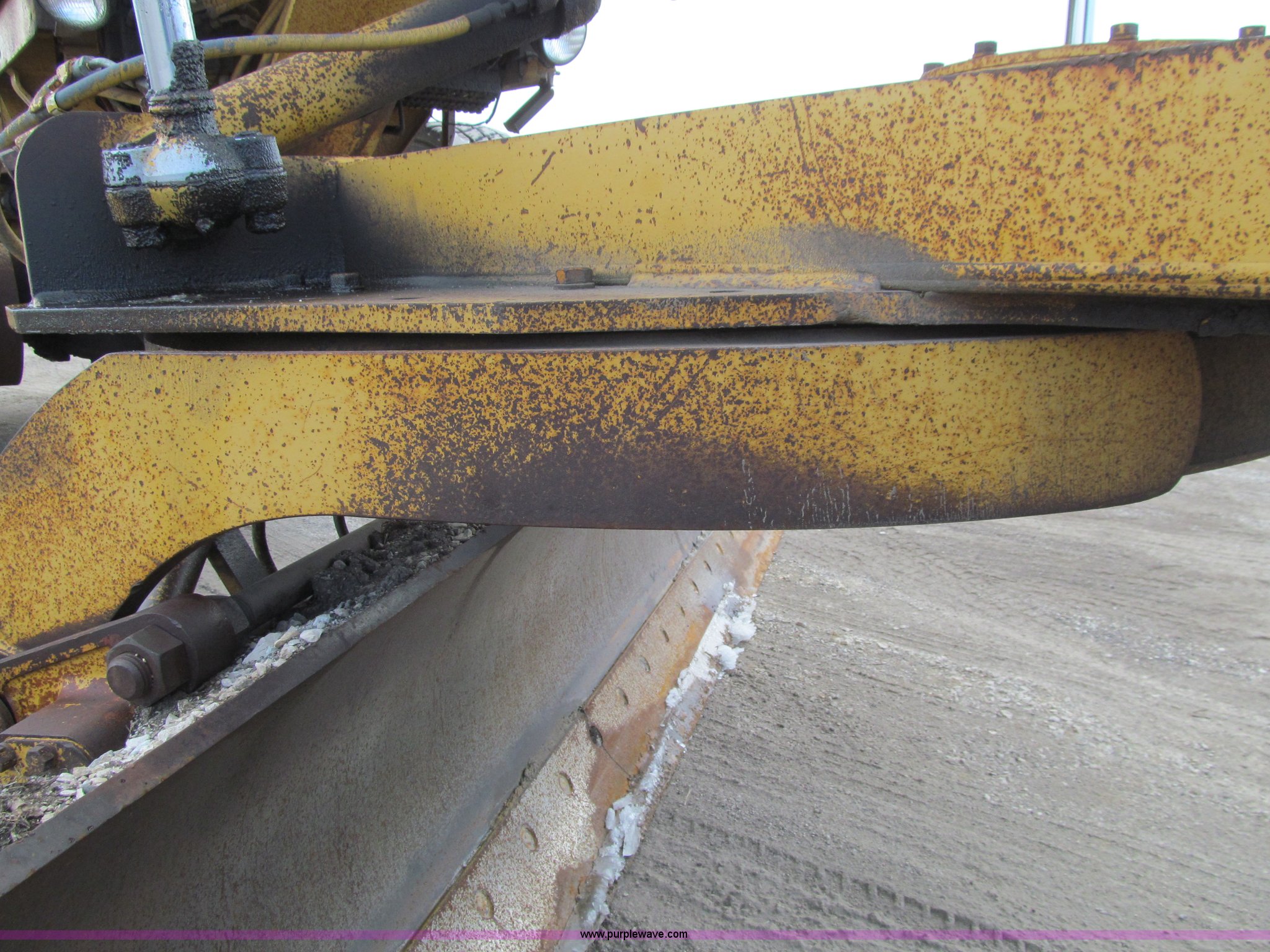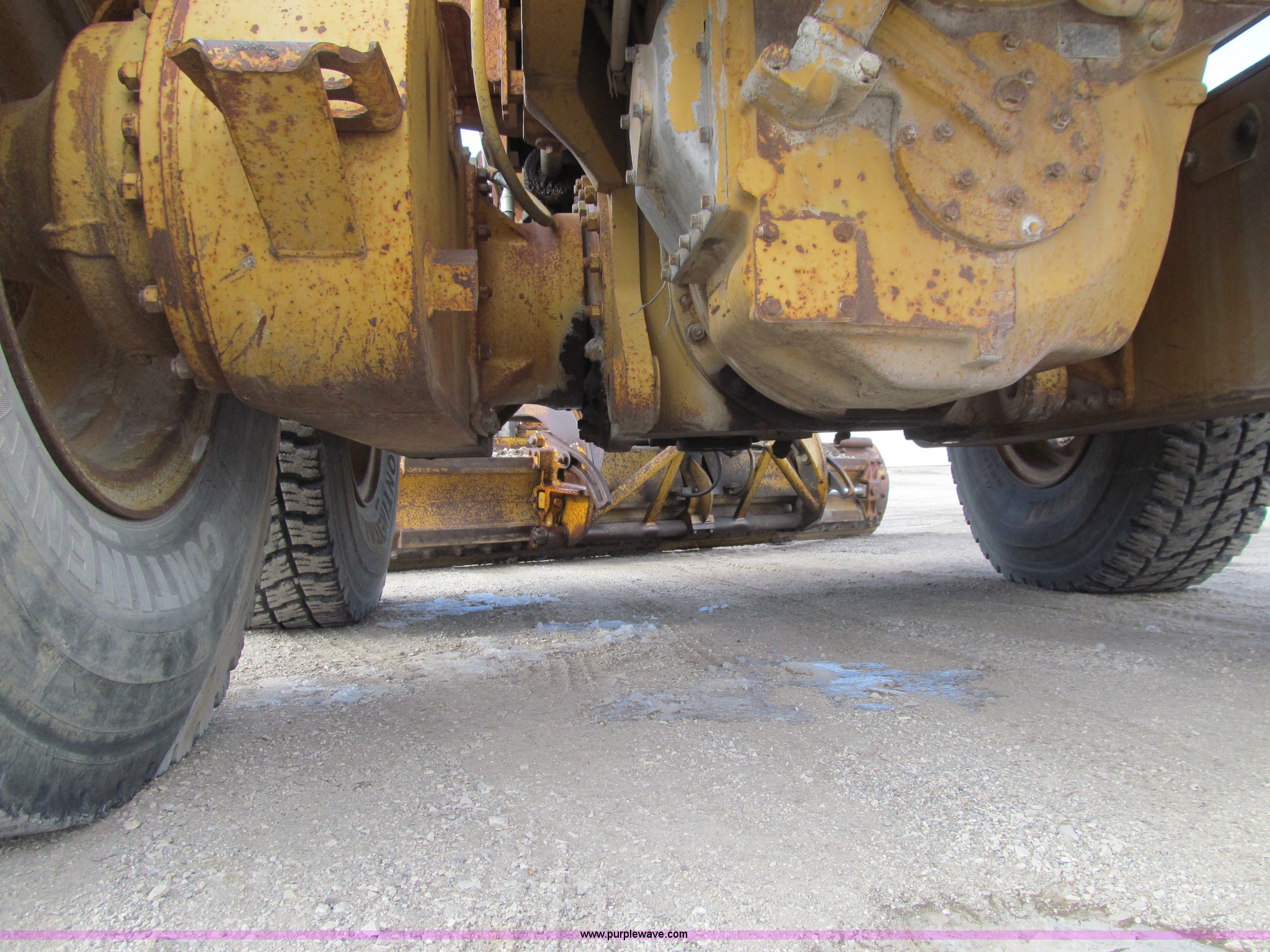 Purple Wave is selling a used Motor Grader in Iowa. This item is a 1984 Caterpillar 140G articulated motor grader with the following: 13,250 hours on meter, Caterpillar 3306 six cylinder turbo diesel engine, Powershift transmission, 6F-6R gears, EROPS, Heat, EMS panel, Suspension seat, High cab profile, Front work lights, Front and rear wipers, 12'W moldboard, Tip control, Side shift, Right and left moldboard bank slope, Mid-mount scarifier, (6) shanks, Unattached unit, 14.00-24 tires, 29,175 lbs. base operating weight, Moldboard lift cylinders seeping, Cab entry step bent, Door glass cracked, Headliner loose, Serial 72V07232