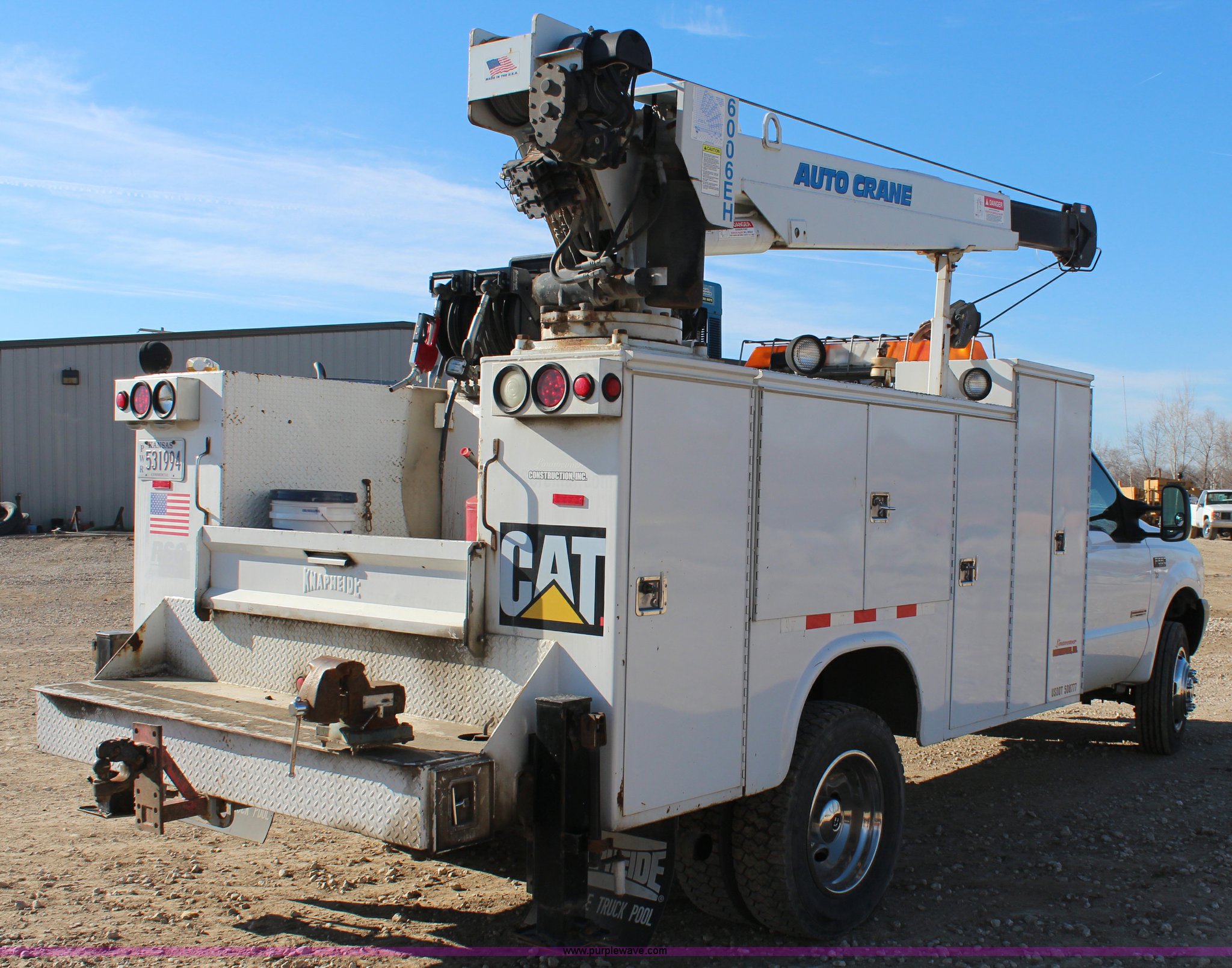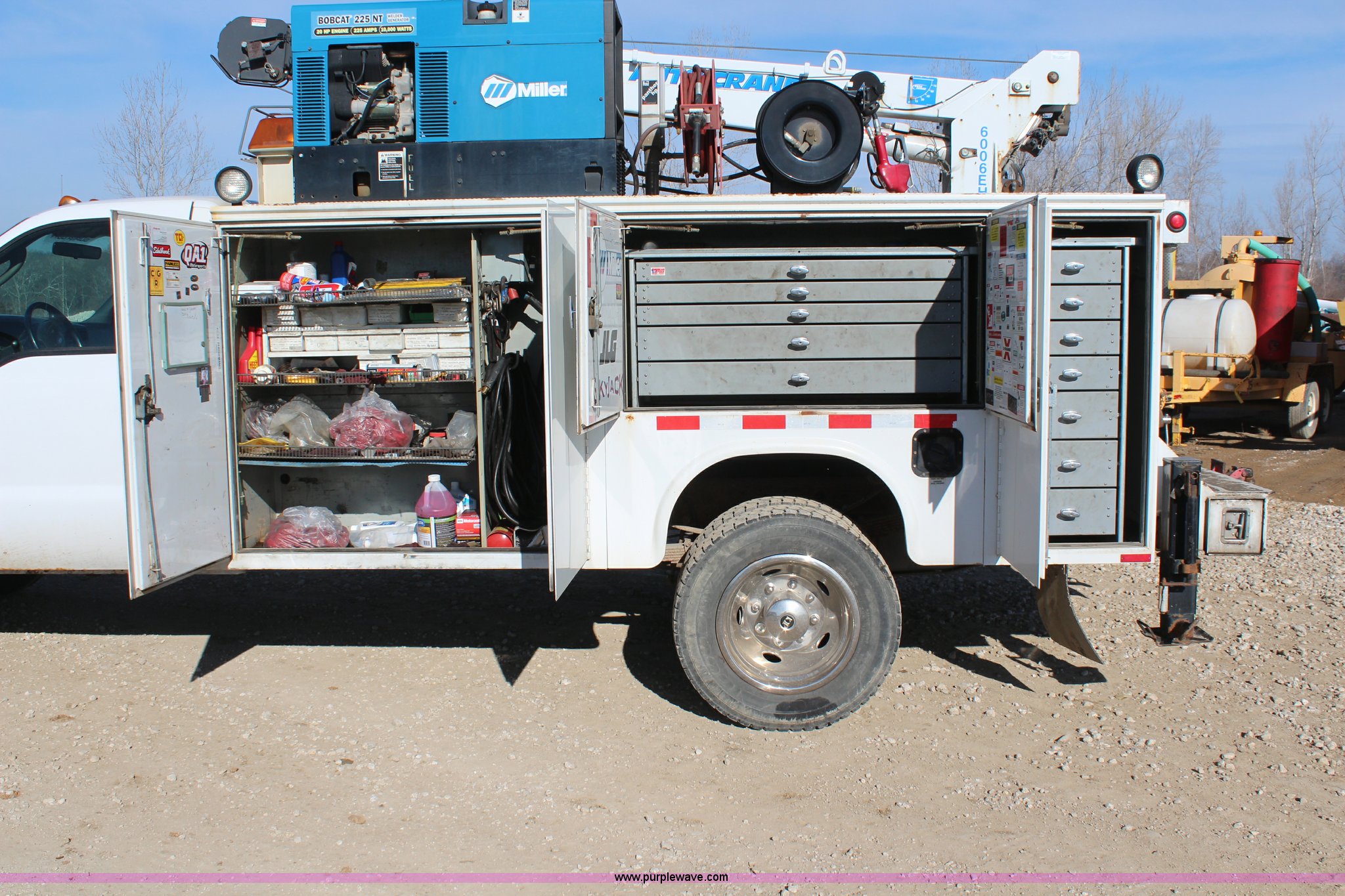 Purple Wave is selling a used Service Truck in Kansas. This item is a 2004 Ford F550 XL service truck with the following: 119,243 miles on odometer, 6.0L V8 OHV 32V turbo diesel engine, Automatic transmission, AC and heat, AM/FM, Manual windows and locks, Vinyl interior, Utility bed, Outriggers, Auto Crane 6006EH crane, 6,000 lbs maximum lift capacity, 20' boom, Miller Bobcat 22JNT welder/generator, Strobe light, Vice, Air compressor, Kohler Command Pro gas engine, 13 HP,, Fuel and lube tank, Oxygen Acetylene torch, No bottles,, Receiver hitch, 225/70R19.5 tires