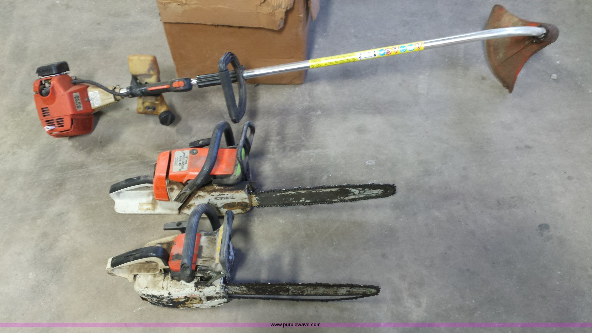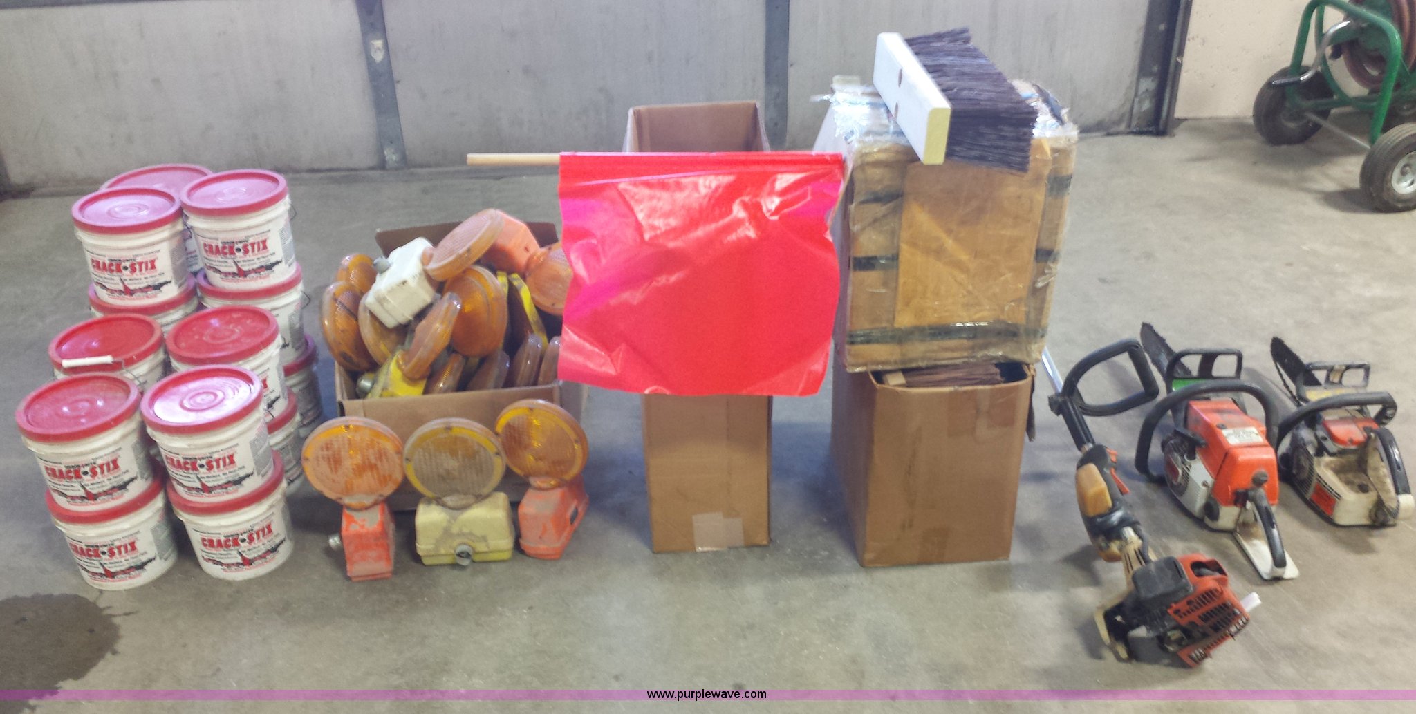 Purple Wave is selling a used Tools in Missouri. This item is a Assorted items with the following: (16) Crack-Stix buckets, (11) broom heads, (2) Stihl chainsaws, Weedeater, (22) caution blinking lights