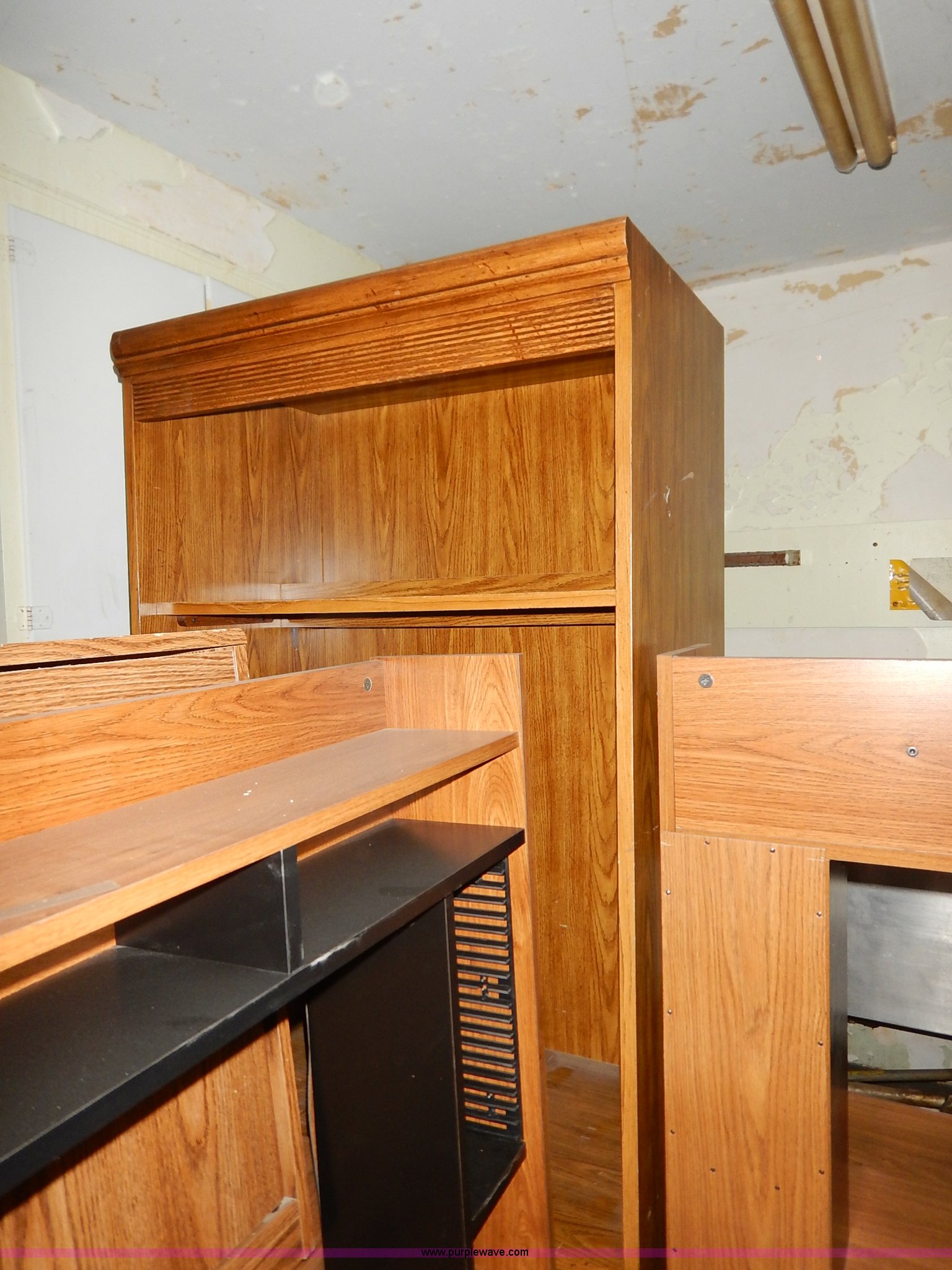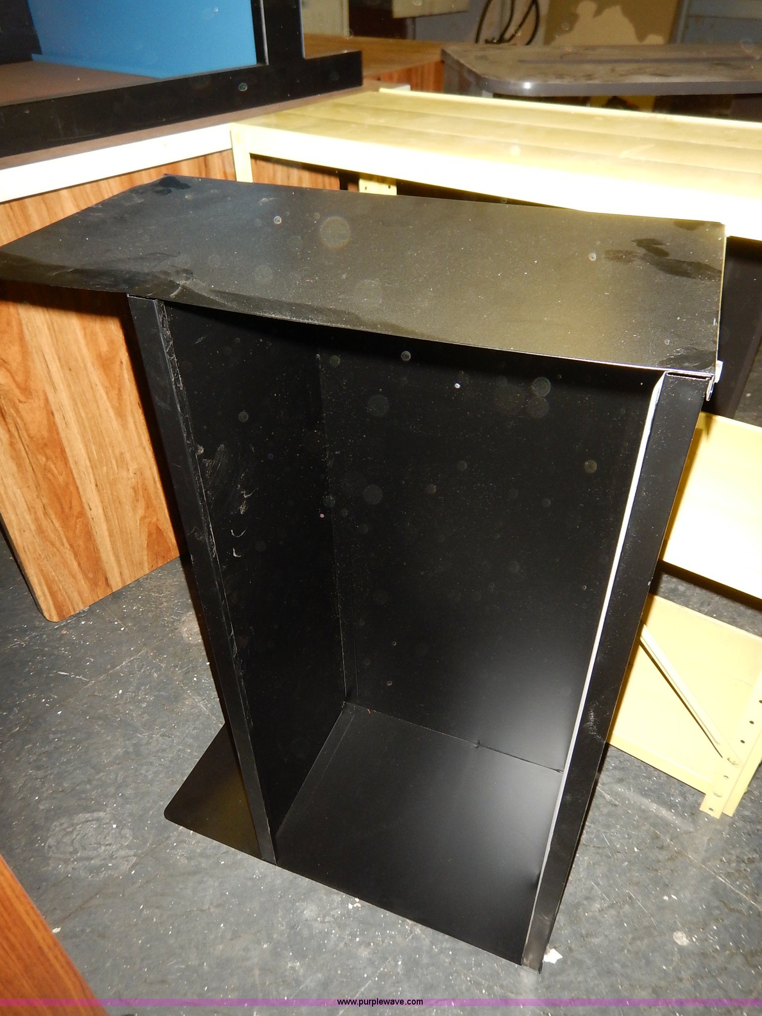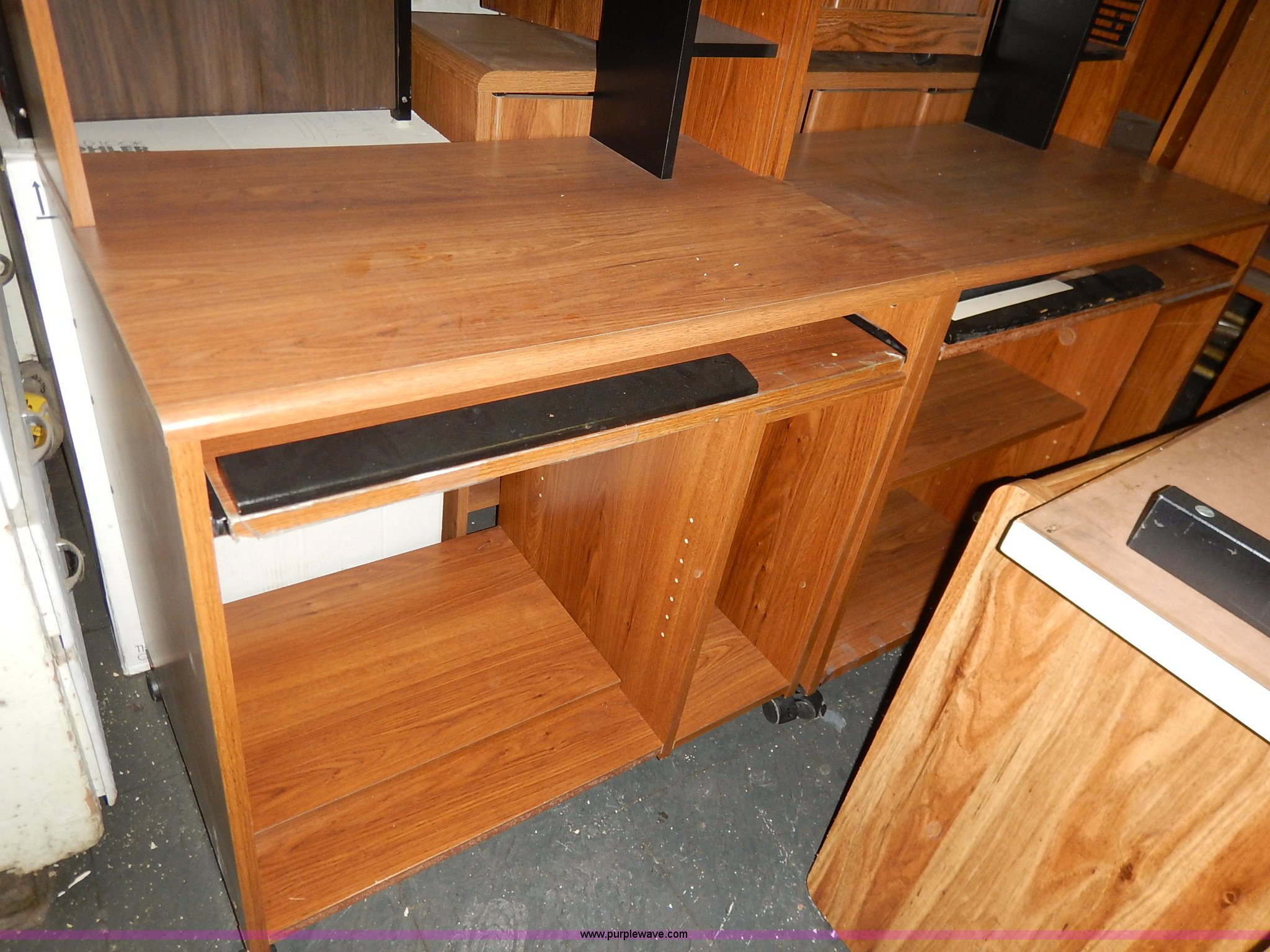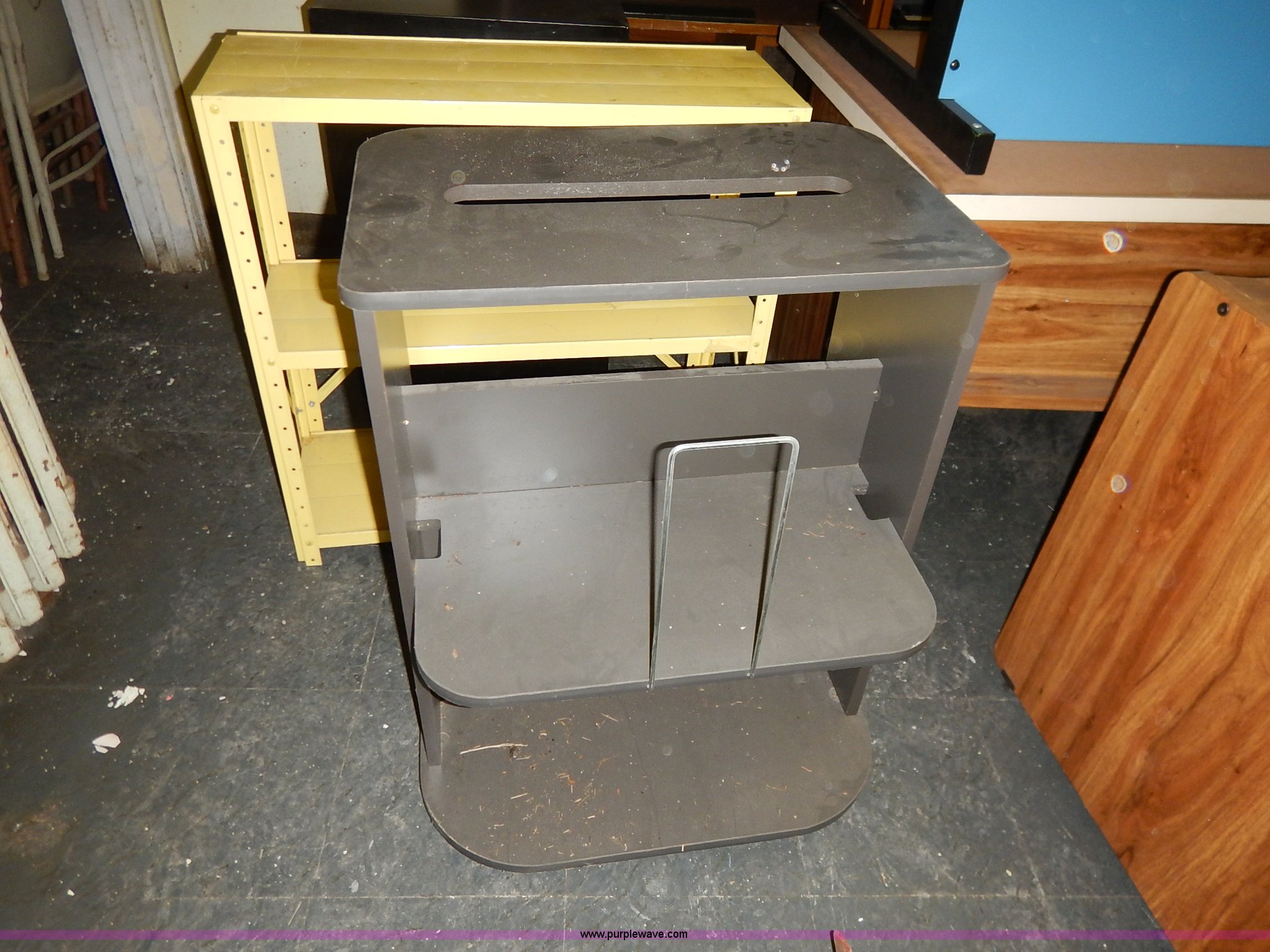 Purple Wave is selling a used Office Supplies and Equip. in Kansas. This item is a Assorted office equipment with the following: (4) computer stands, (5) desks, (3) book shelves, (2) printer stands, (2) metal shelves