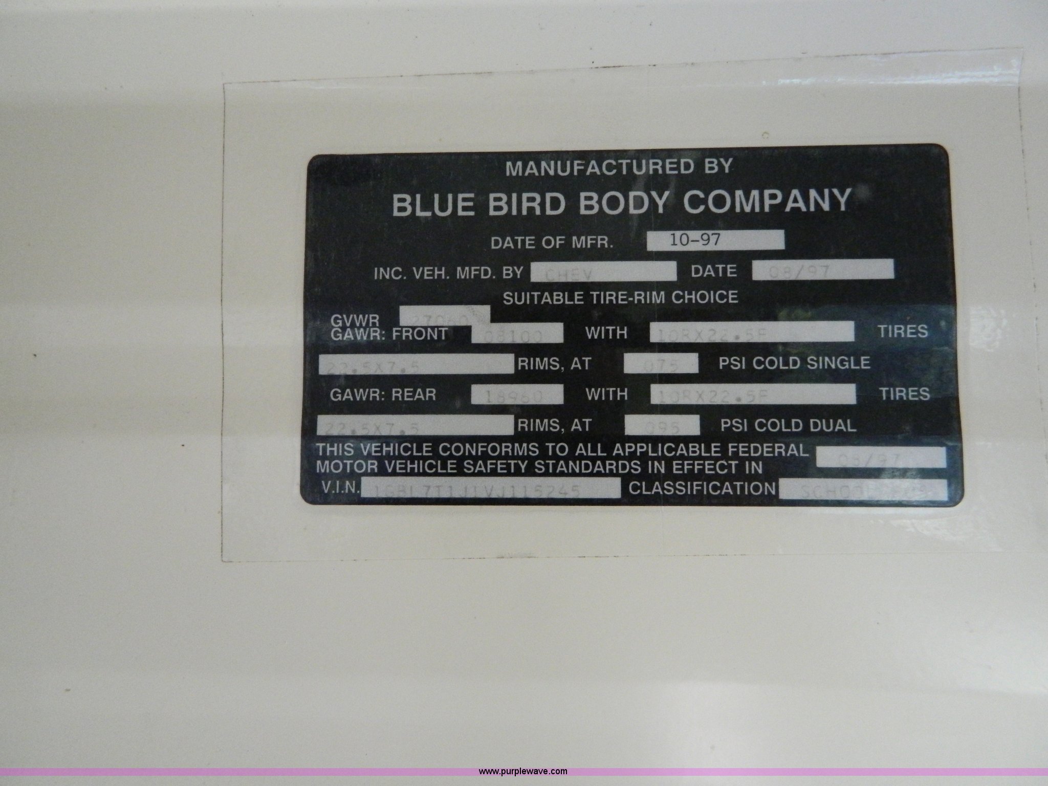 Purple Wave is selling a used Bus in Kansas. This item is a 1998 Chevrolet B7 Blue Bird school bus with the following: 155,828 miles on odometer, Caterpillar 3116 6.6L six cylinder diesel engine, Automatic transmission, Heat, AM/FM/cassette, PA system, 59 passenger capacity, Air brakes, 10R22.5 tires, GVWR 27,000 lbs, Injector issues