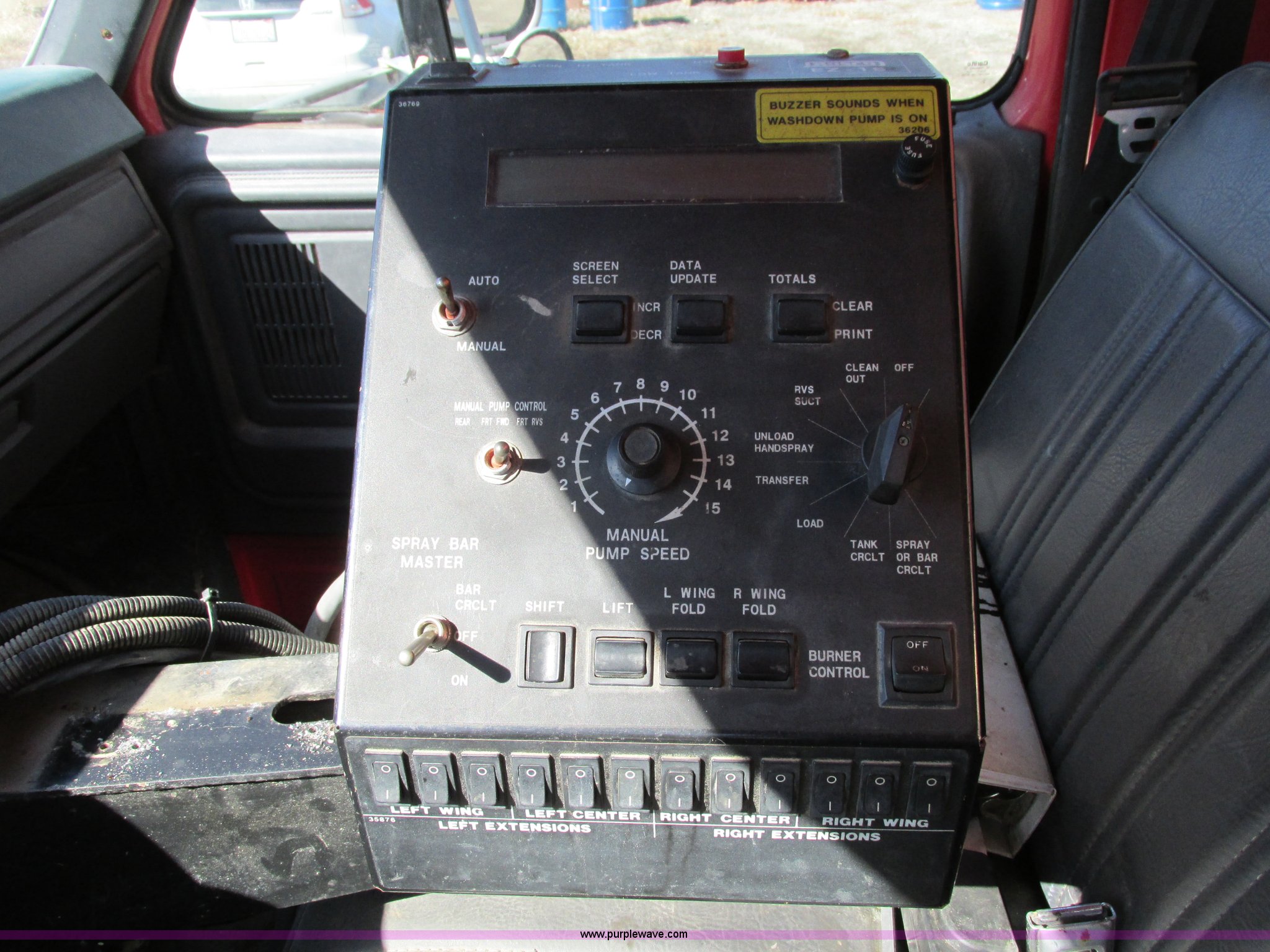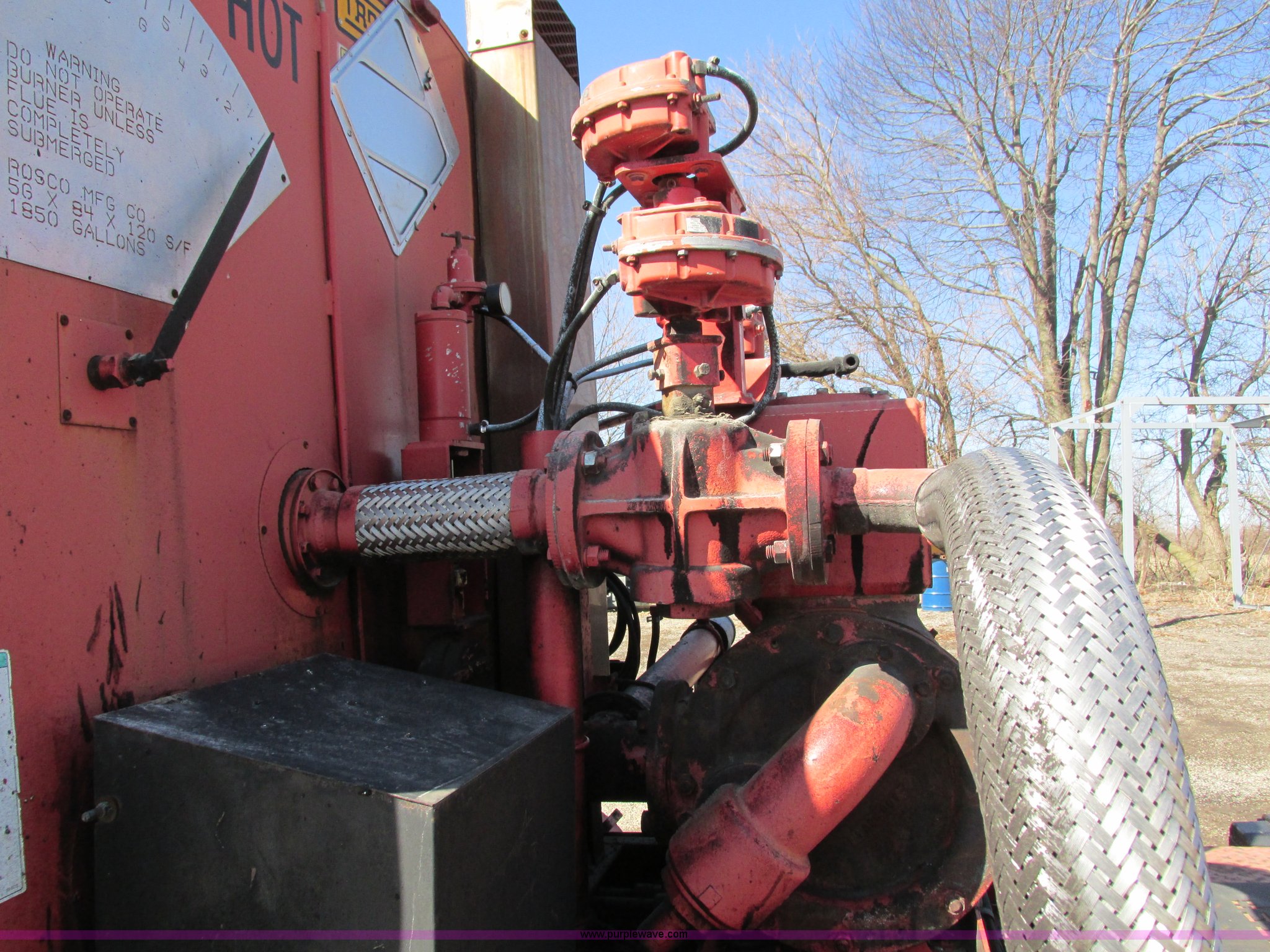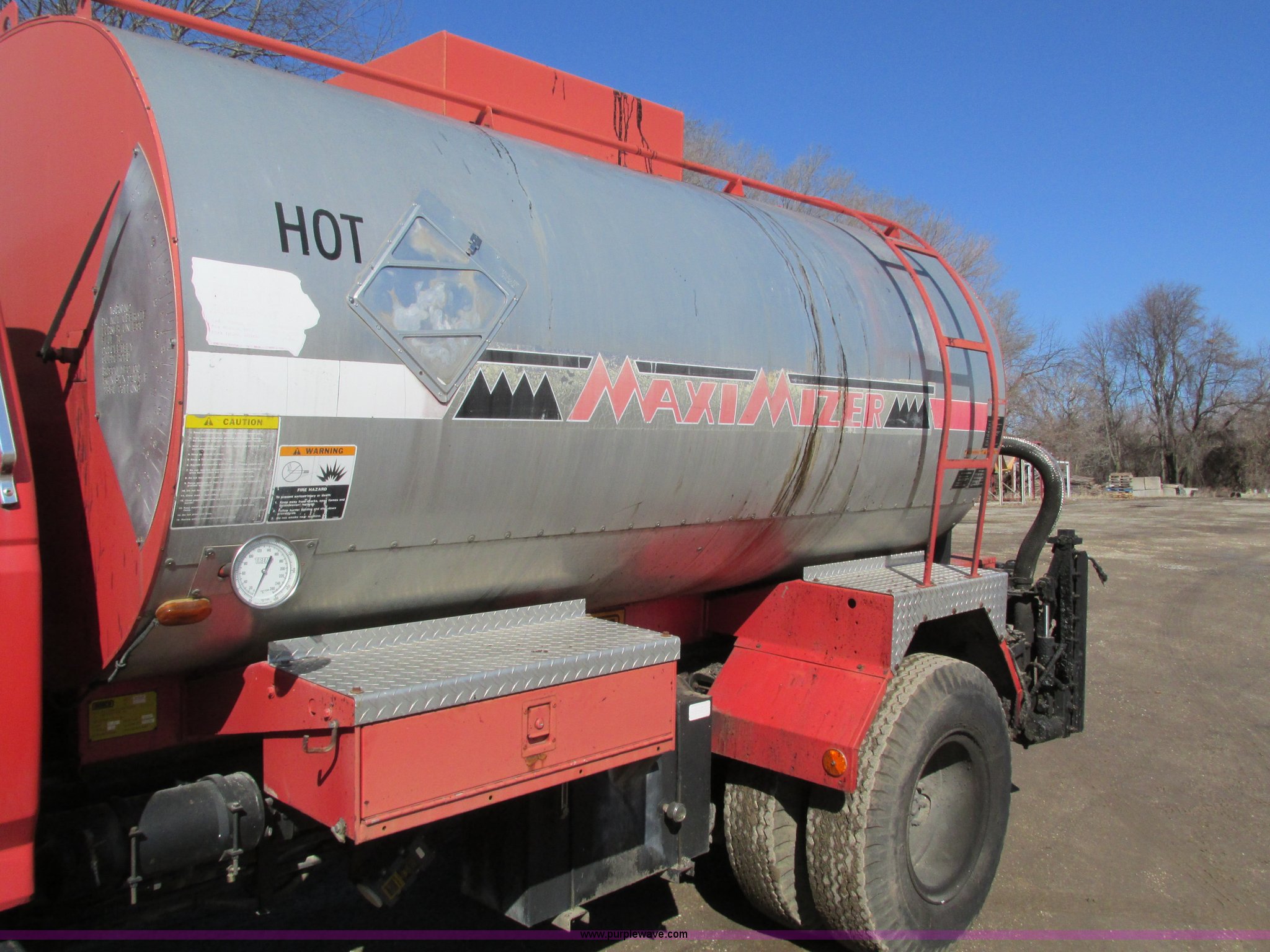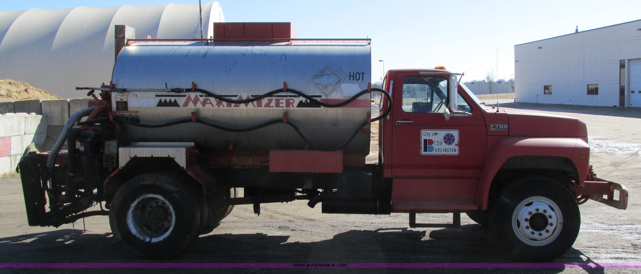 Purple Wave is selling a used Oil Distributor Truck in Iowa. This item is a 1994 Ford F700 oil distributor truck with the following: 9,419 miles on odometer, Cummins ISB 5.9L L6 diesel engine, Five speed manual transmission, Heat, AM/FM/cassette, Circulating fan, Rosco EZ-15 controller in cab, Rosco Maximizer distributor, 1,850 gallon tank, 14,985 lbs max weight, Ground speed external radar, (36) nozzles on spray bar, Left and right hydraulic fold, Hand wand hose, External wash down hose, External tank, Diesel fuel burner, Rear manual controls, Serial 33377, External hydraulic pump, Full time live hydrualics, 50 gallon fuel tanks, Front mount PTO, Spring suspension, Air brakes, 10.00-20 front tires, 11.00-20 rear tires, GVWR 33,000 lbs, FAWR 10,000 lbs, RAWR 23,000 lbs