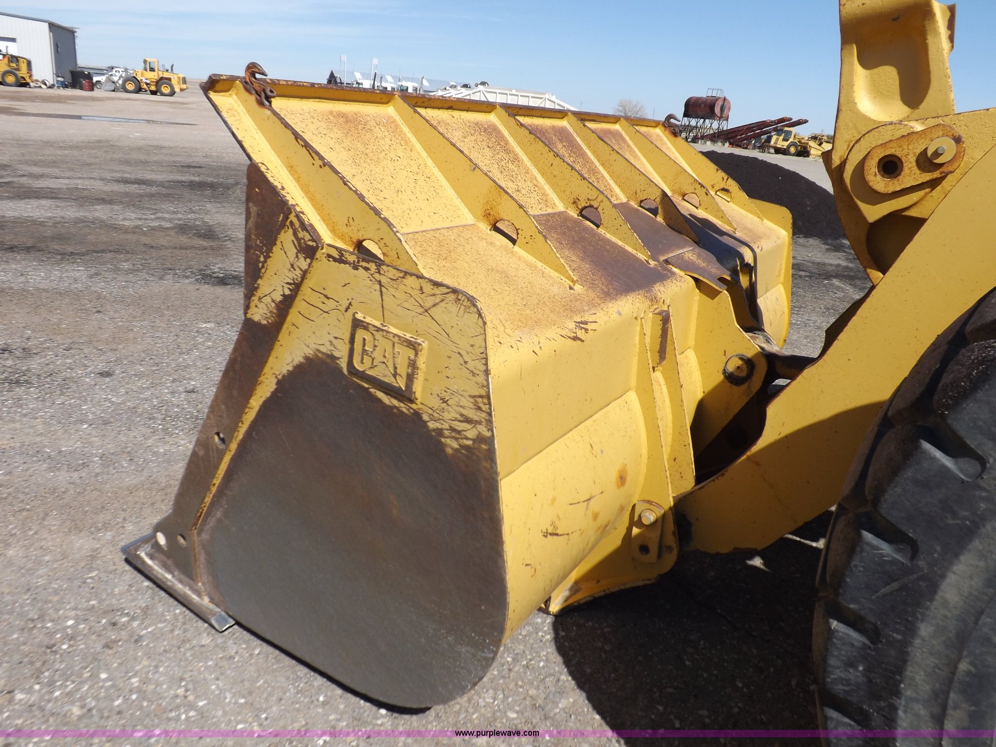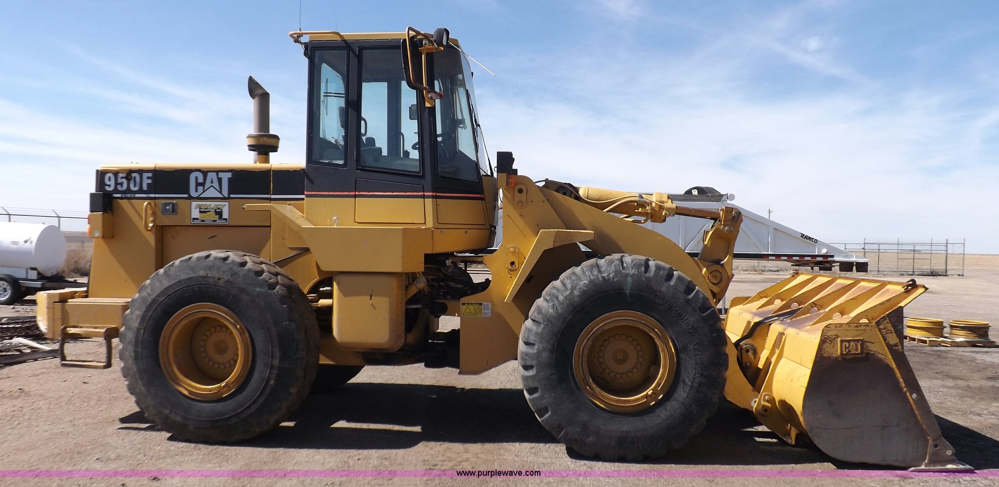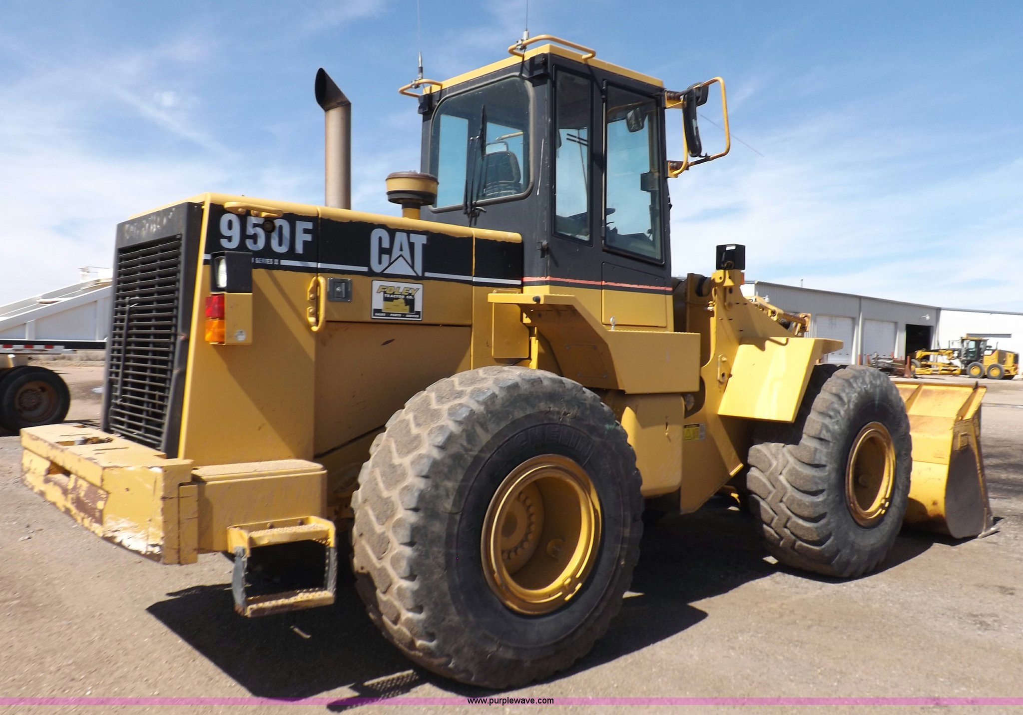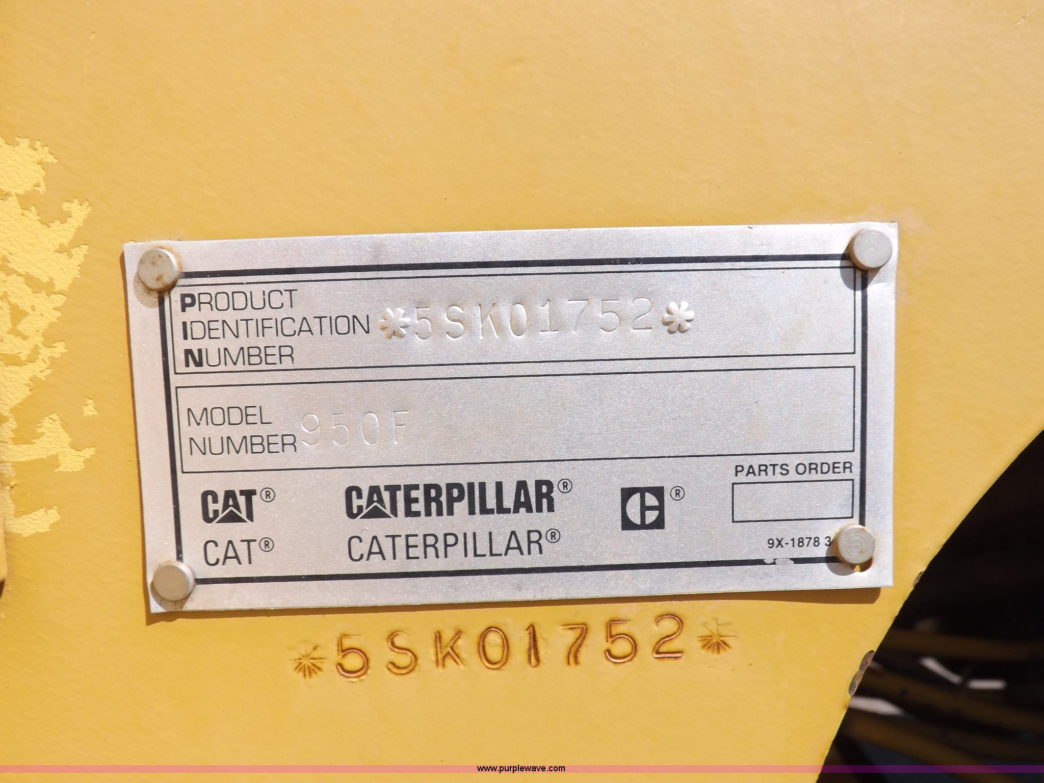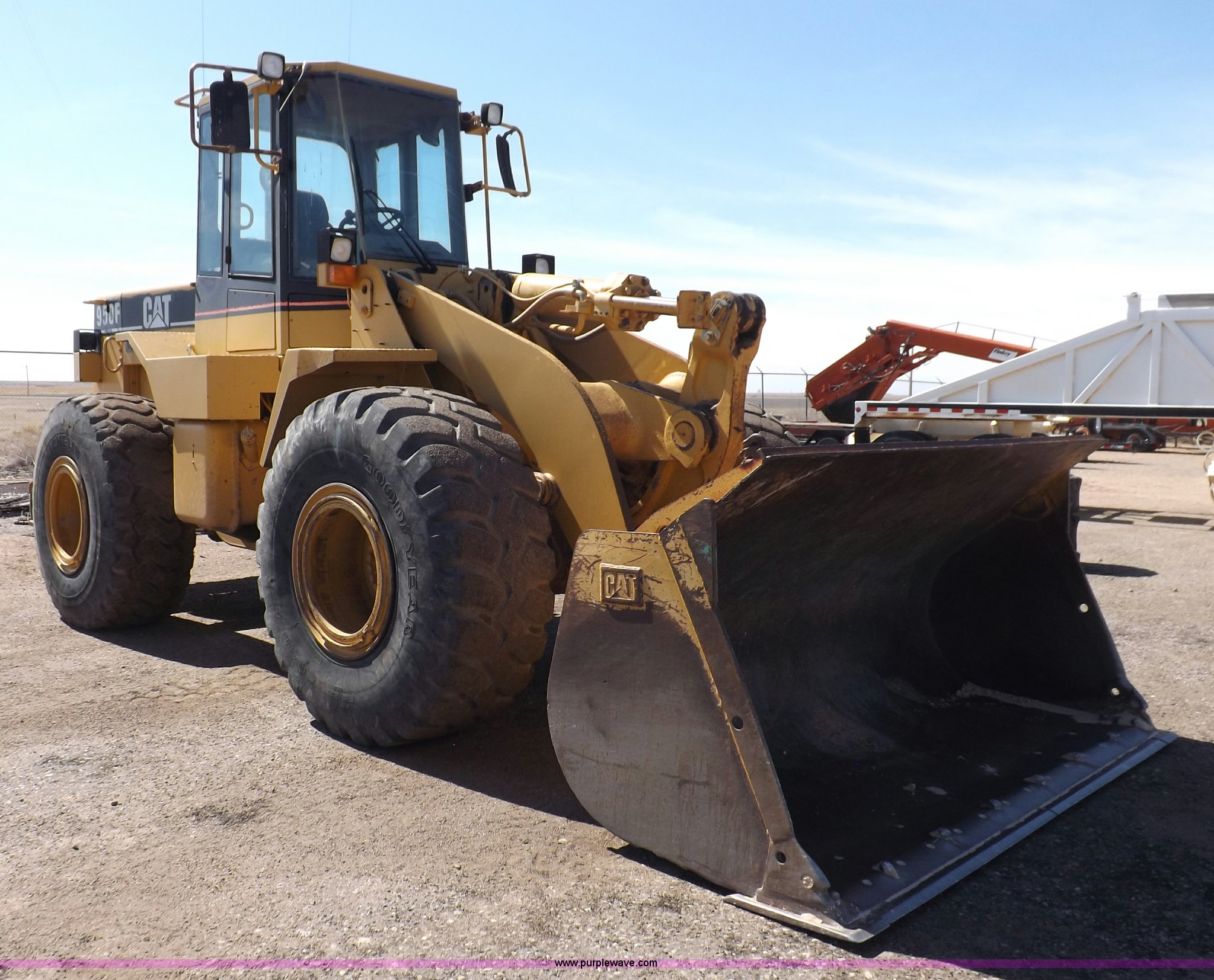 Purple Wave is selling a used Wheel Loader in Kansas. This item is a 1995 Caterpillar 950F Series II wheel loader with the following: 11,547 hours on meter, Caterpillar 3116 six cylinder turbo diesel engine, Shuttle shift transmission, 4F-4R gears, AC and heat, AM/FM/cassette, Tilt steering wheel, Two lever control, Front and rear wipers, Front and rear work lights, Caterpillar 9'W bucket, Approx. 3.5 yard capacity, Bolt-on cutting edge, 23.5-25 tires, 36,521 lbs. base operating weight, Interior/exterior cosmetic damage, Right front corner glass cracked, Seat upholstery damaged, Engine is weak, Serial 5SK01752