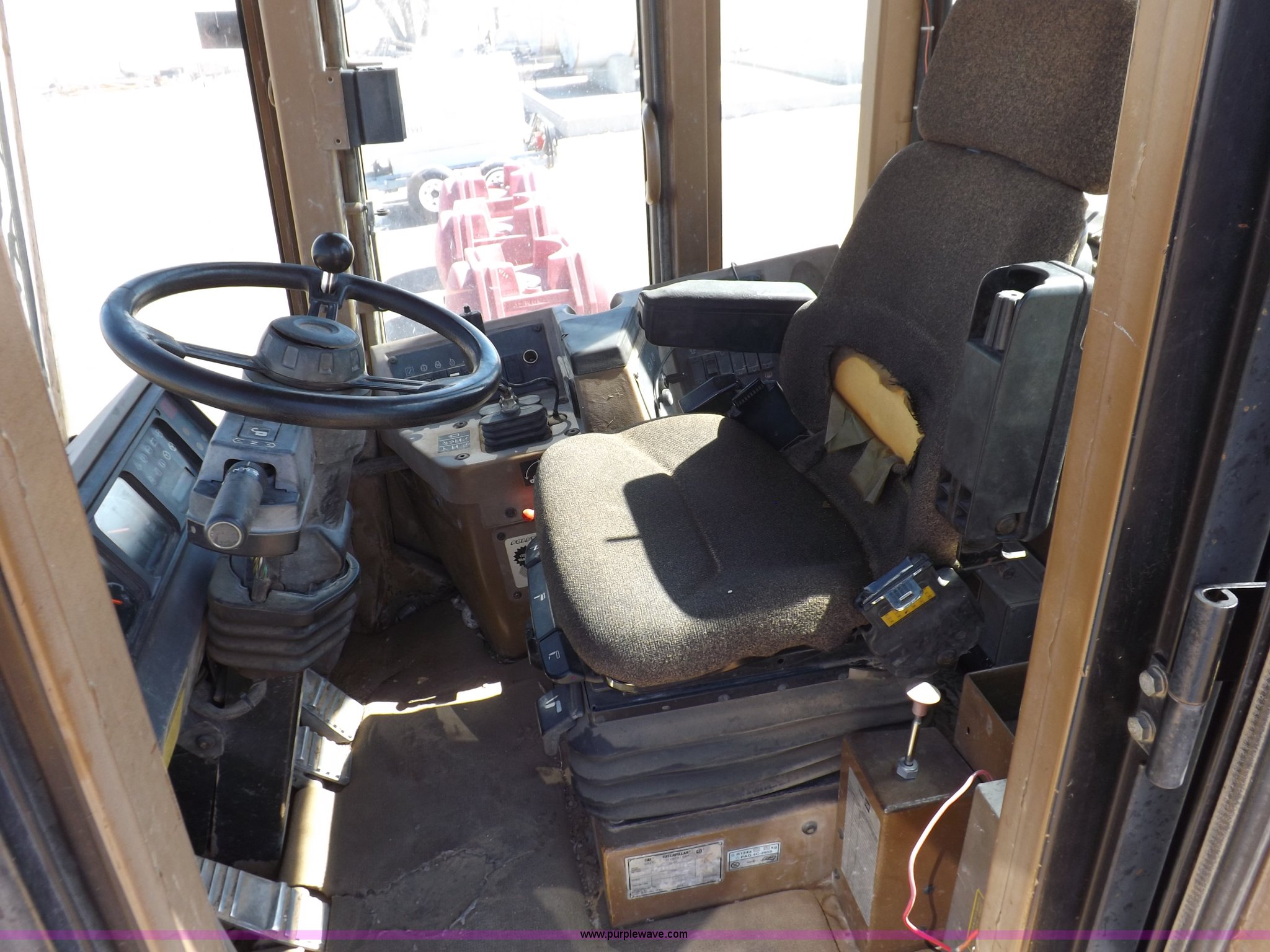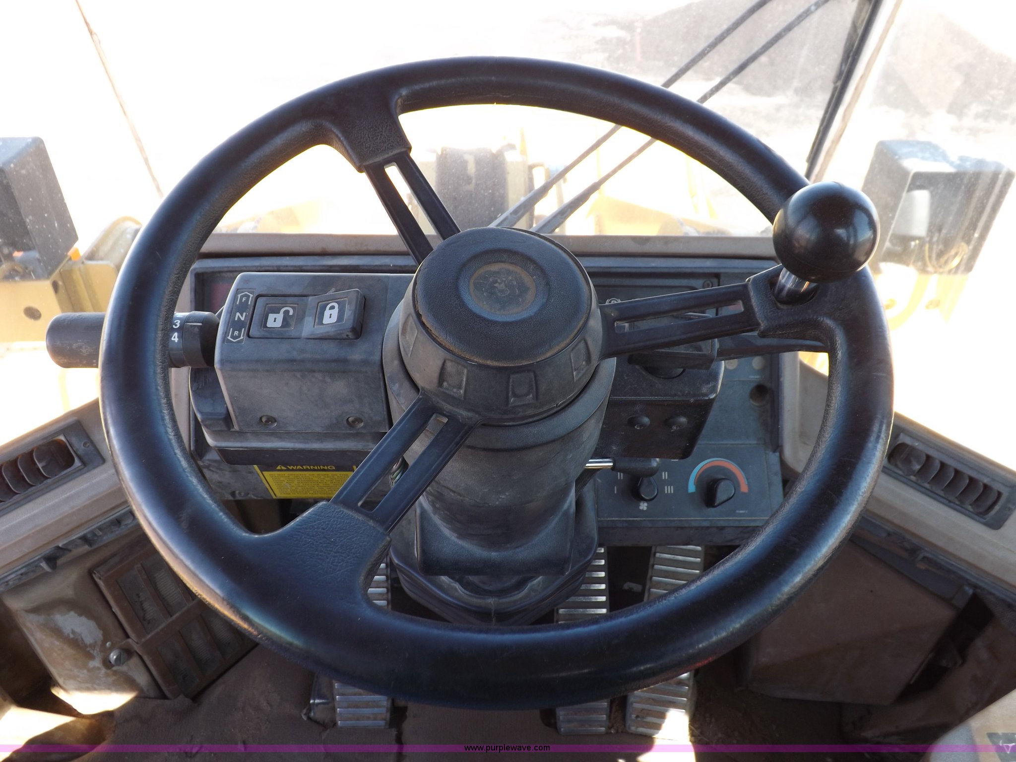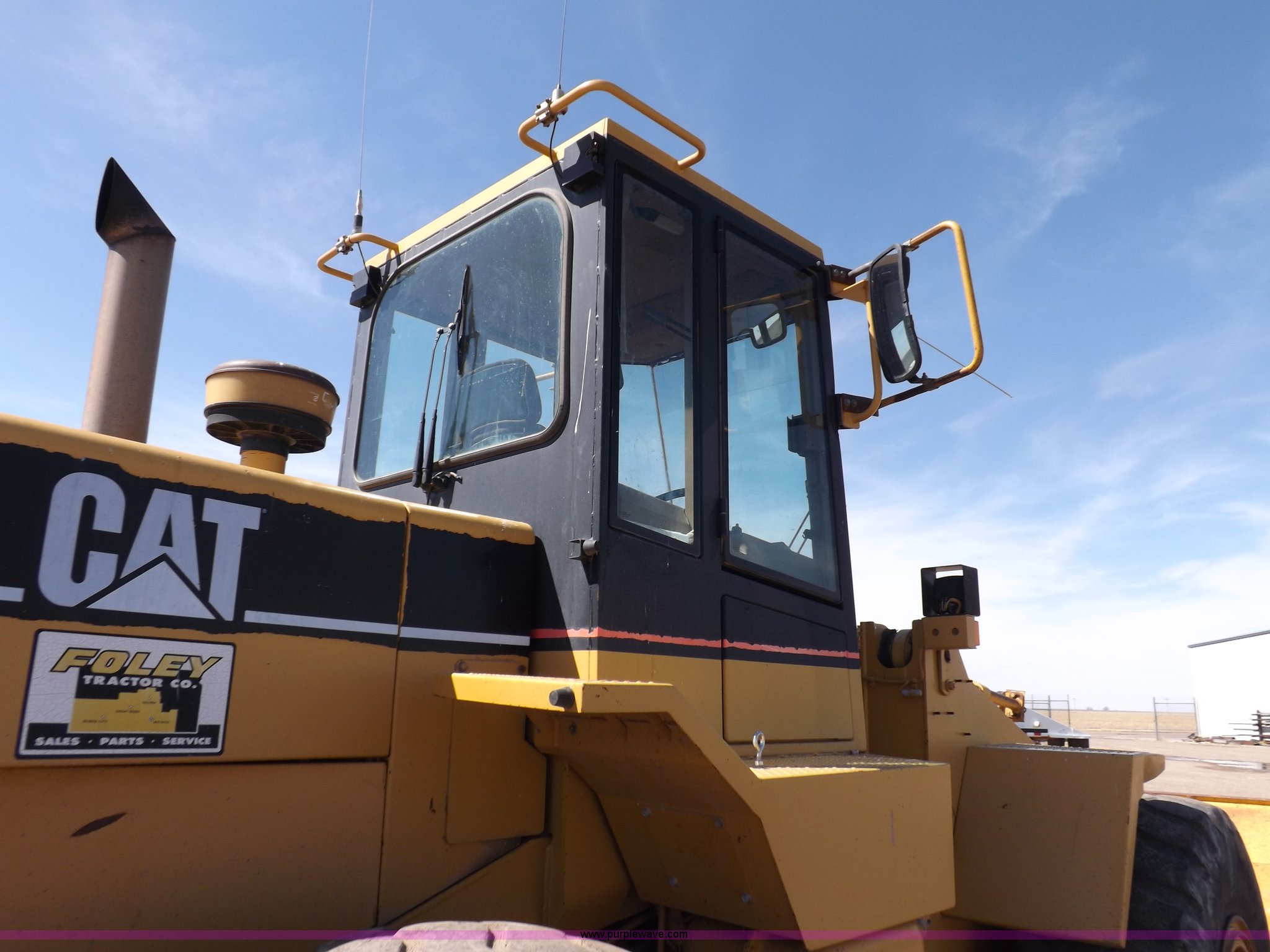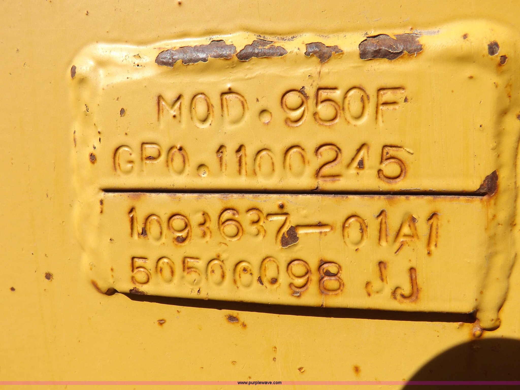 Purple Wave is selling a used Wheel Loader in Kansas. This item is a 1995 Caterpillar 950F Series II wheel loader with the following: 11,547 hours on meter, Caterpillar 3116 six cylinder turbo diesel engine, Shuttle shift transmission, 4F-4R gears, AC and heat, AM/FM/cassette, Tilt steering wheel, Two lever control, Front and rear wipers, Front and rear work lights, Caterpillar 9'W bucket, Approx. 3.5 yard capacity, Bolt-on cutting edge, 23.5-25 tires, 36,521 lbs. base operating weight, Interior/exterior cosmetic damage, Right front corner glass cracked, Seat upholstery damaged, Engine is weak, Serial 5SK01752