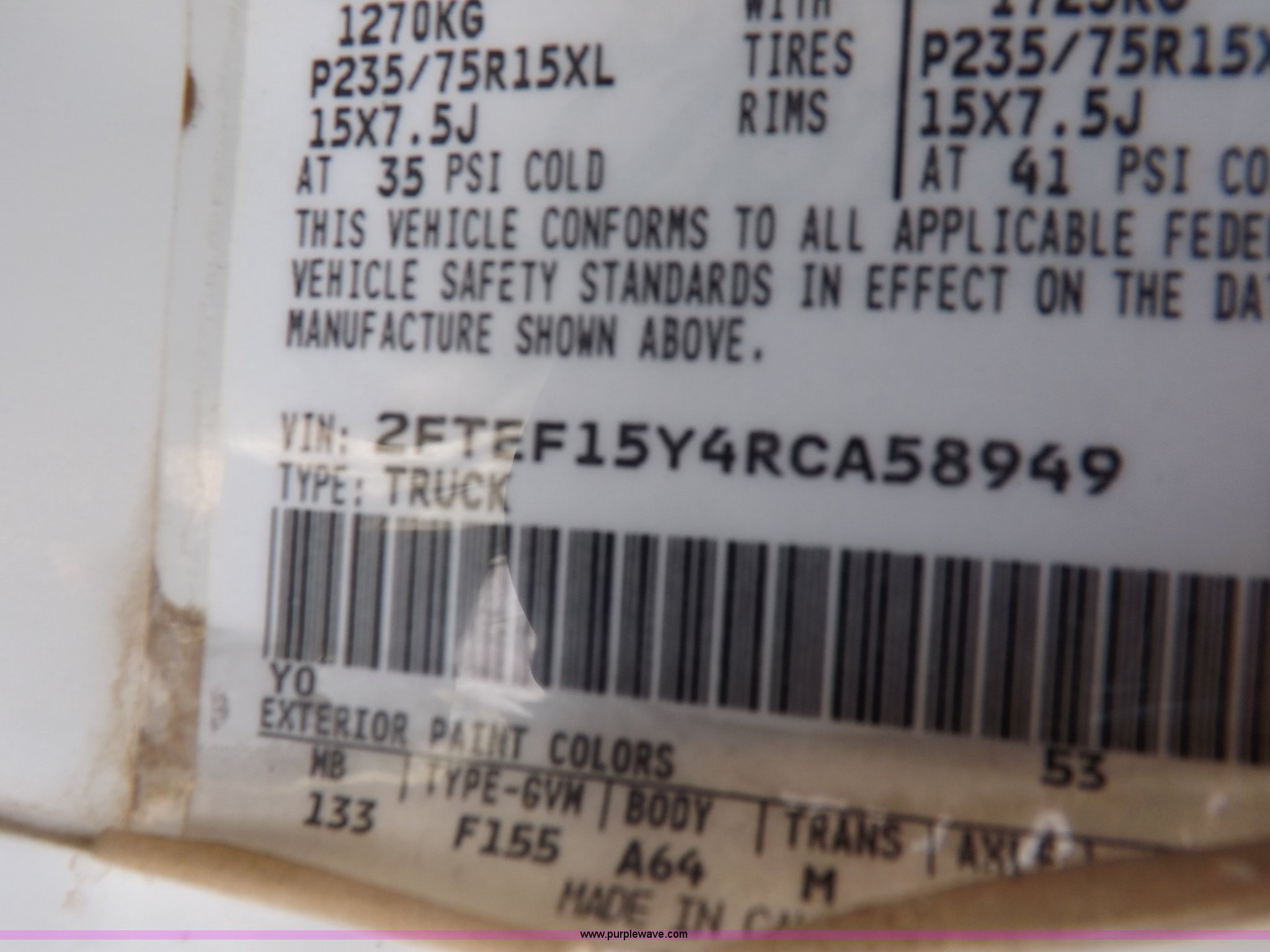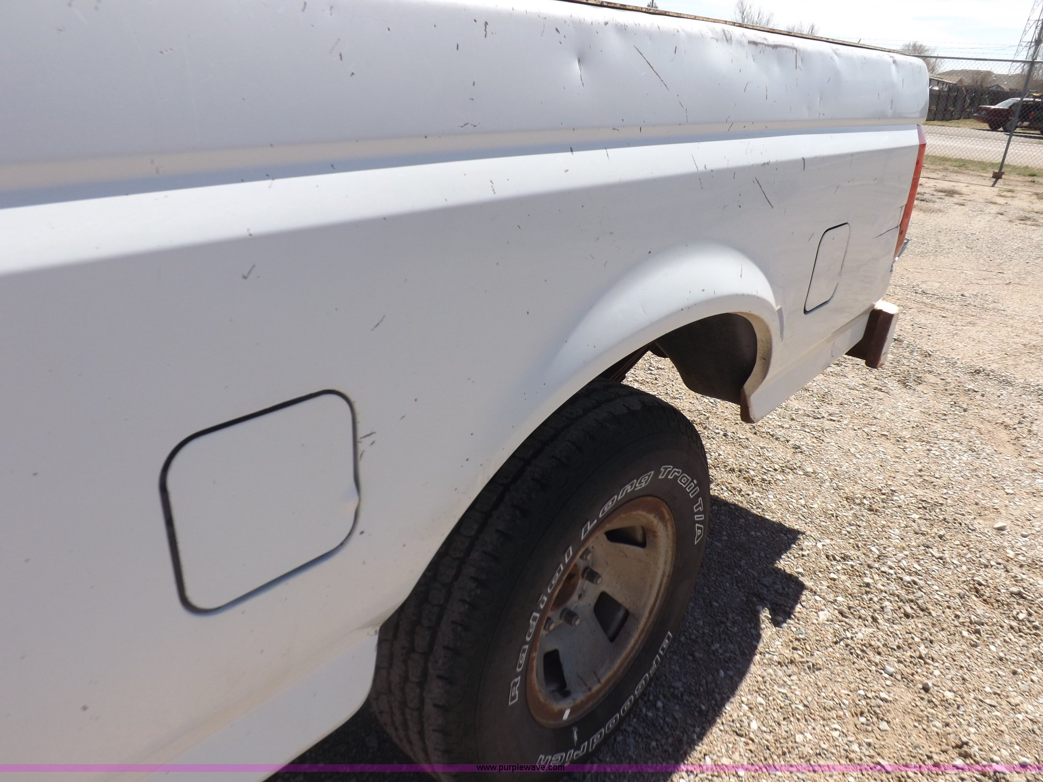1994 Ford F150 XL pickup truck. 140,195 miles on odometer, 4.9L L6 OHV 12V gas engine, Five speed manual transmission, Heat, AM/FM, Manual windows and locks, Vinyl interior, Long bed, Headache rack, Crossover toolbox Bottom is broken, Dual fuel tanks, Trailer wiring, 235/75R15 tires, Interior/exterior cosmetic damage, Rear bumper damage, Paint damage, Hail damage, Front bumper damage, Unit# 1. 2FTEF15Y4RCA58949. Haskell County Road Department. 401 Dennis St. Sublette, KS 67877