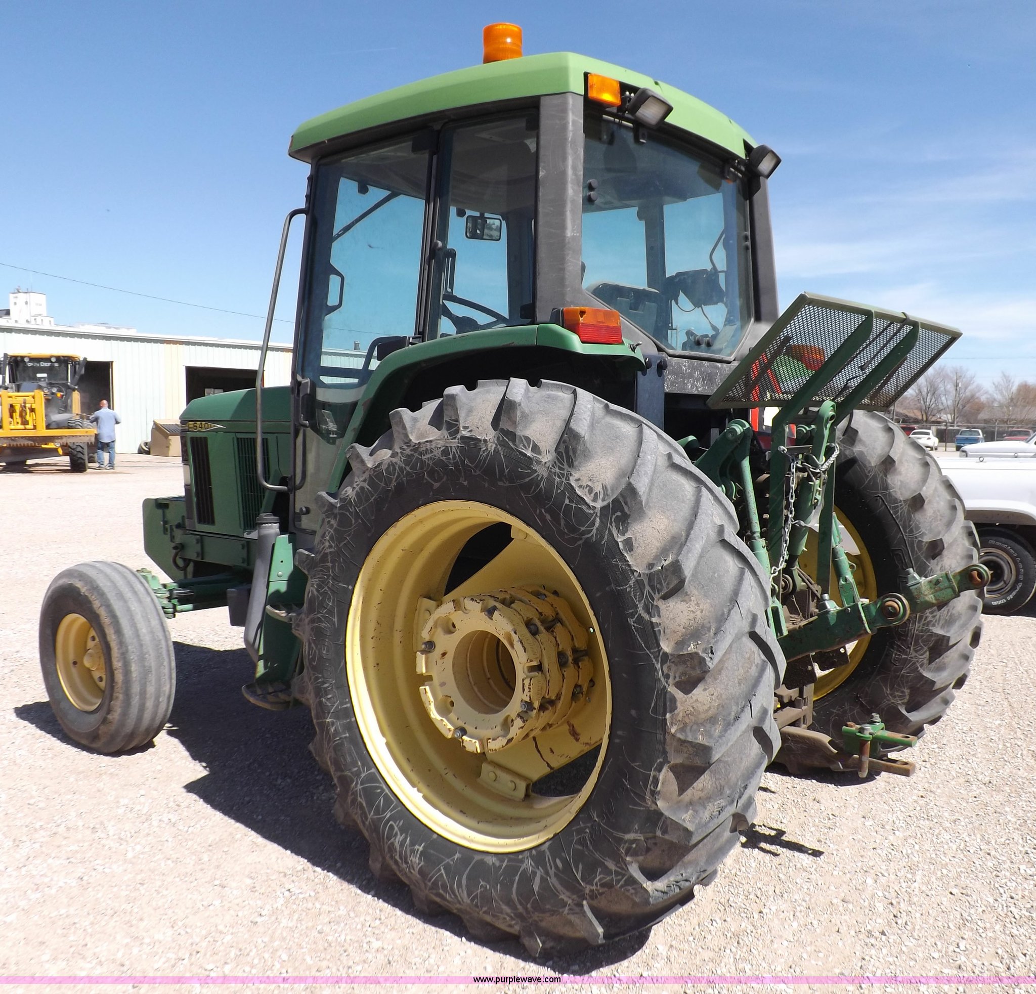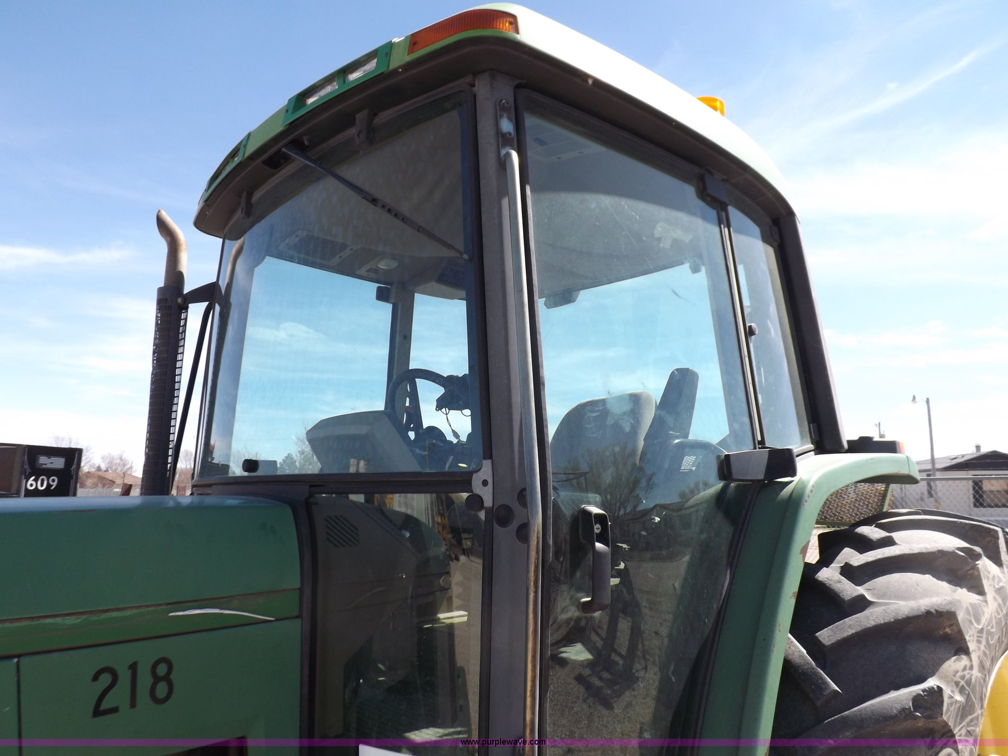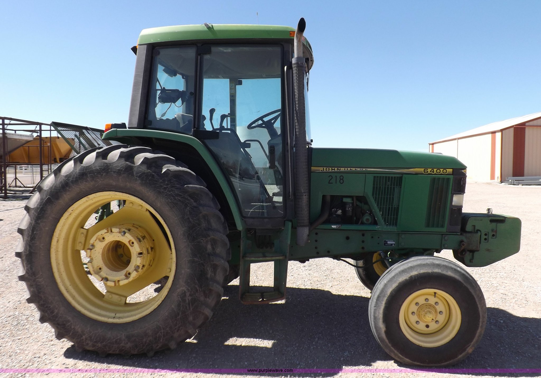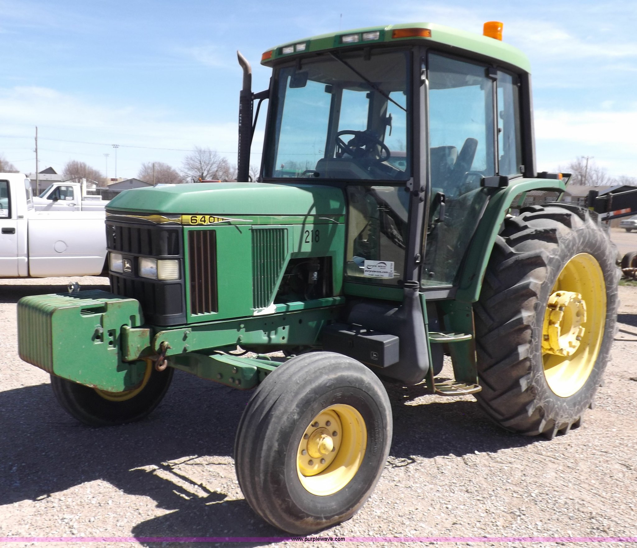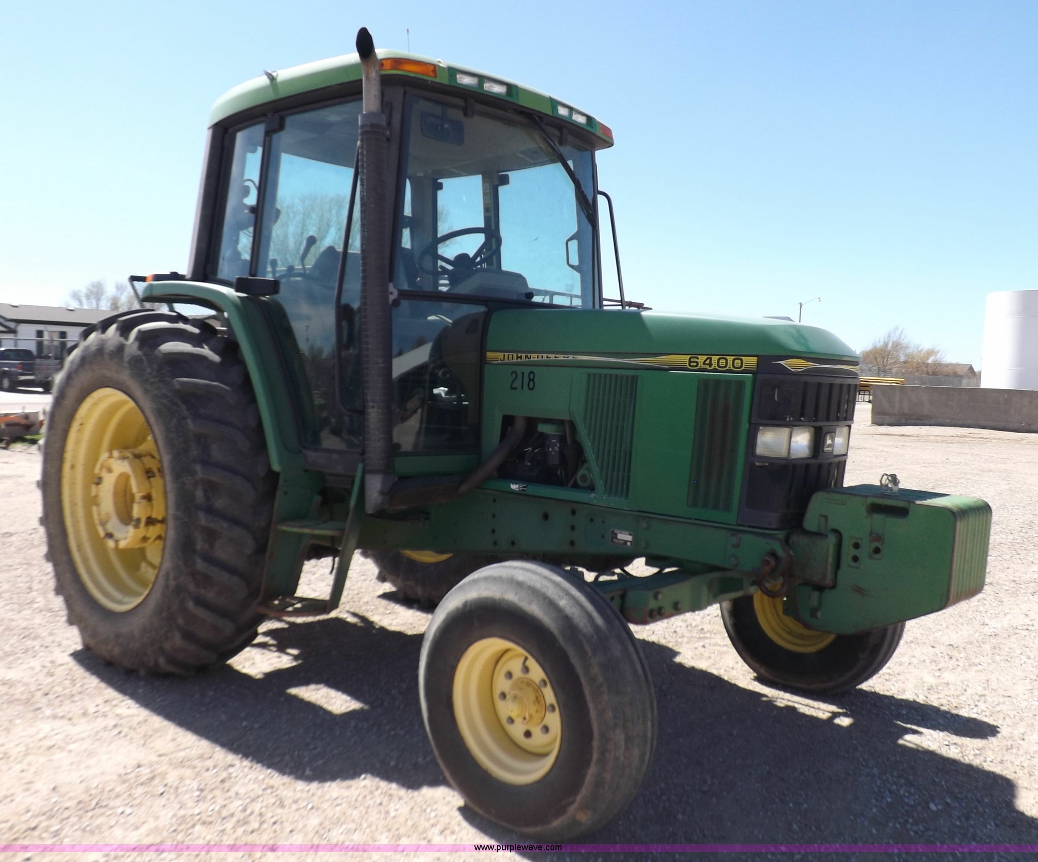 Purple Wave is selling a used Tractor in Kansas. This item is a 1997 John Deere 6400 tractor with the following: 6,079 hours on meter, John Deere CD4045T four cylinder diesel engine, Serial CD4045T340977, Powershift transmission, 16F-16R gears, Differential lock, AC and heat, AM/FM, Spring suspension seat, Tilt steering wheel, Rear glass guard, Three point, Draw bar, 540 and 1000 PTO, (3) rear hydraulic remotes, Suitcase weights, Wheel weights, 94" wheelbase, 10.00-16 front tires, 480/80R38 rear tires, Interior/exterior cosmetic damage, Interior trim damage, Serial L06400P200043, Unit# 218