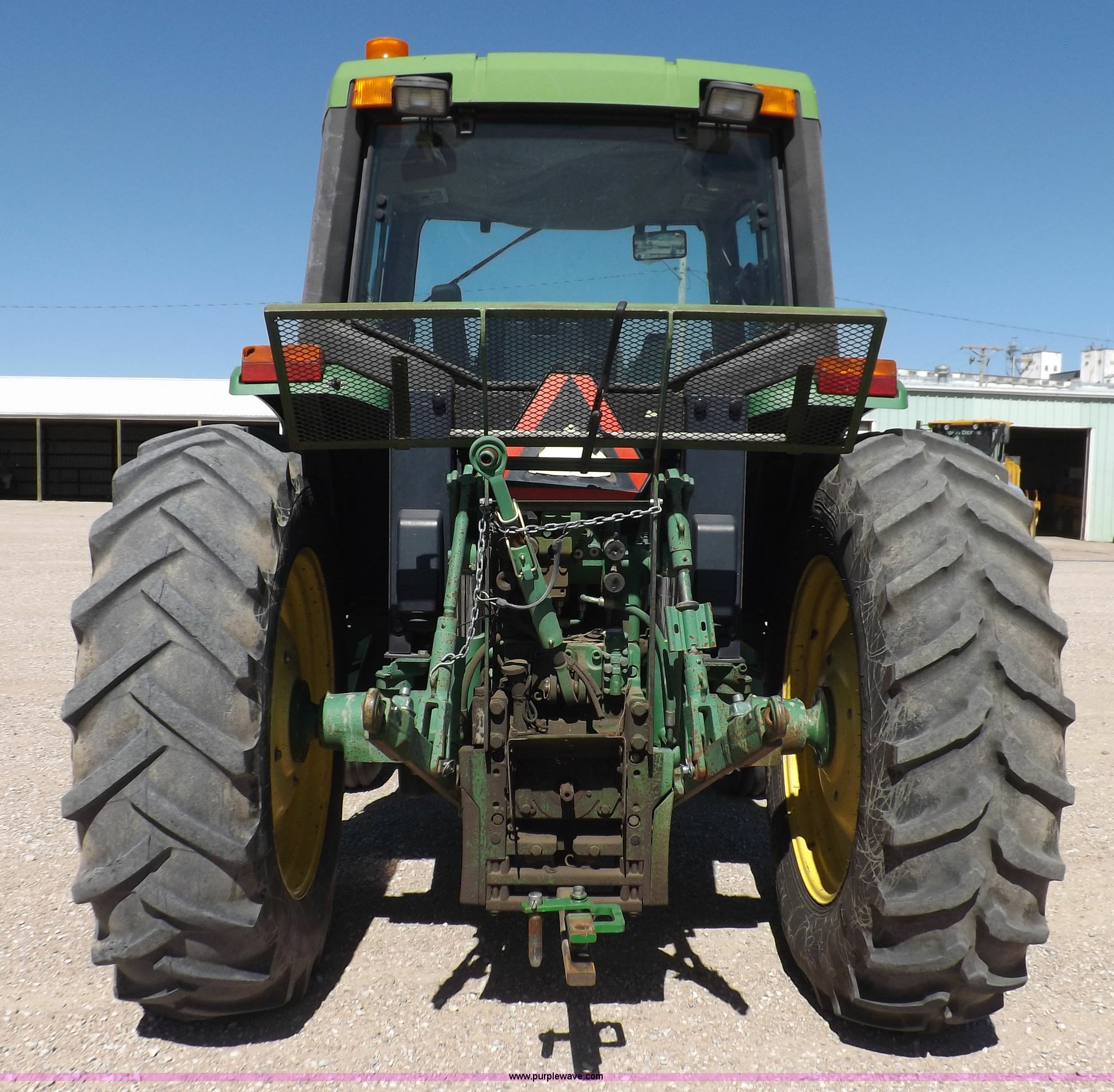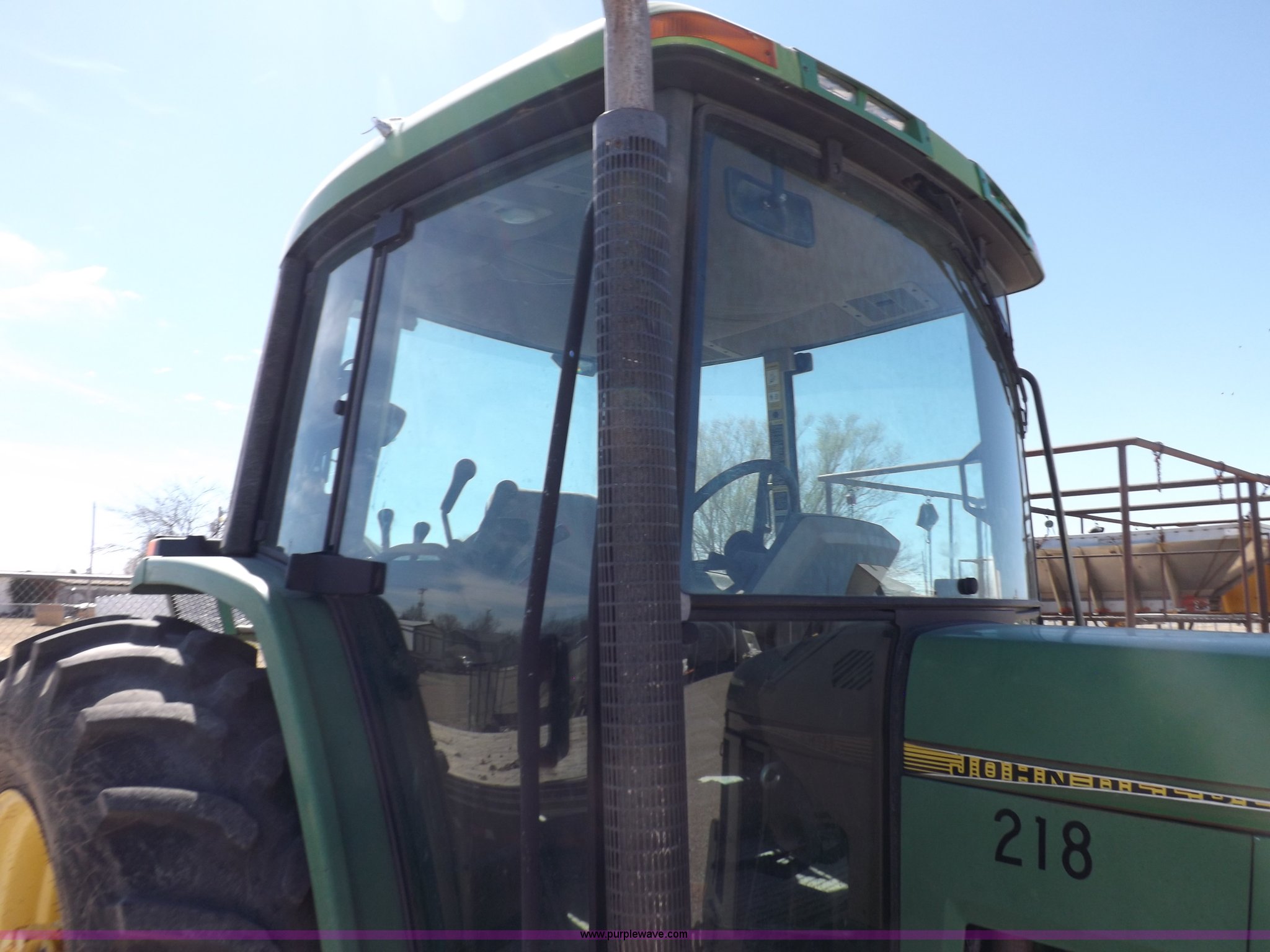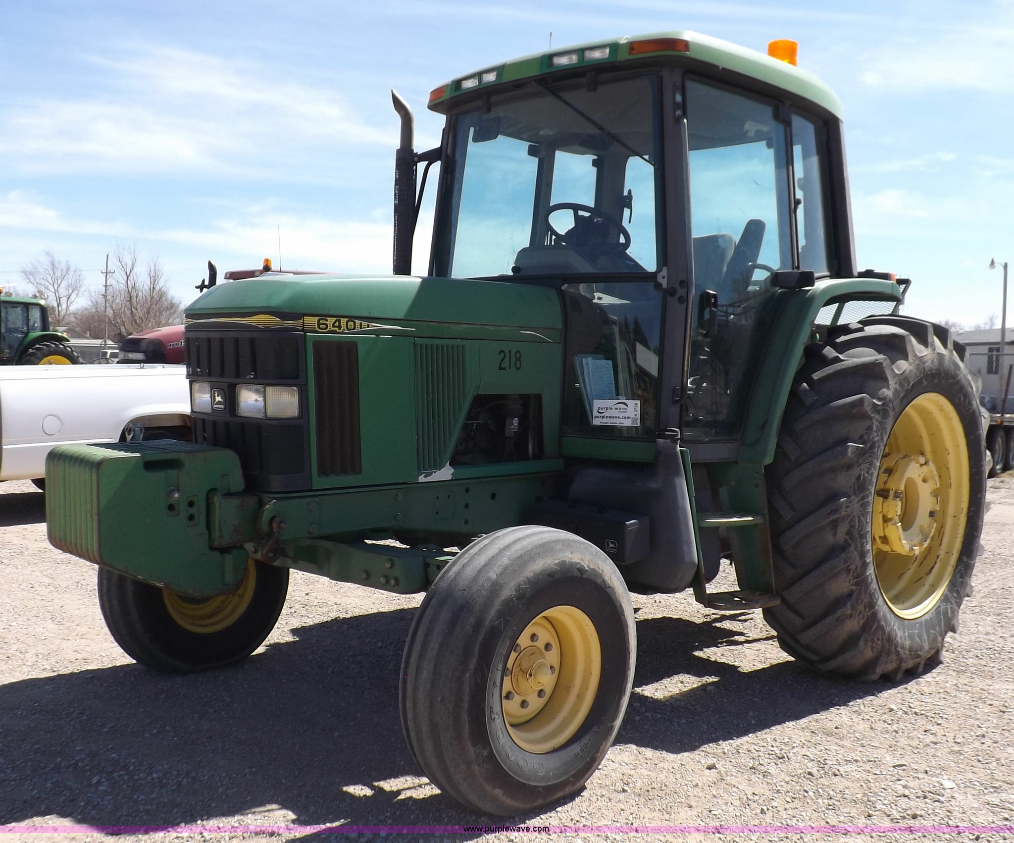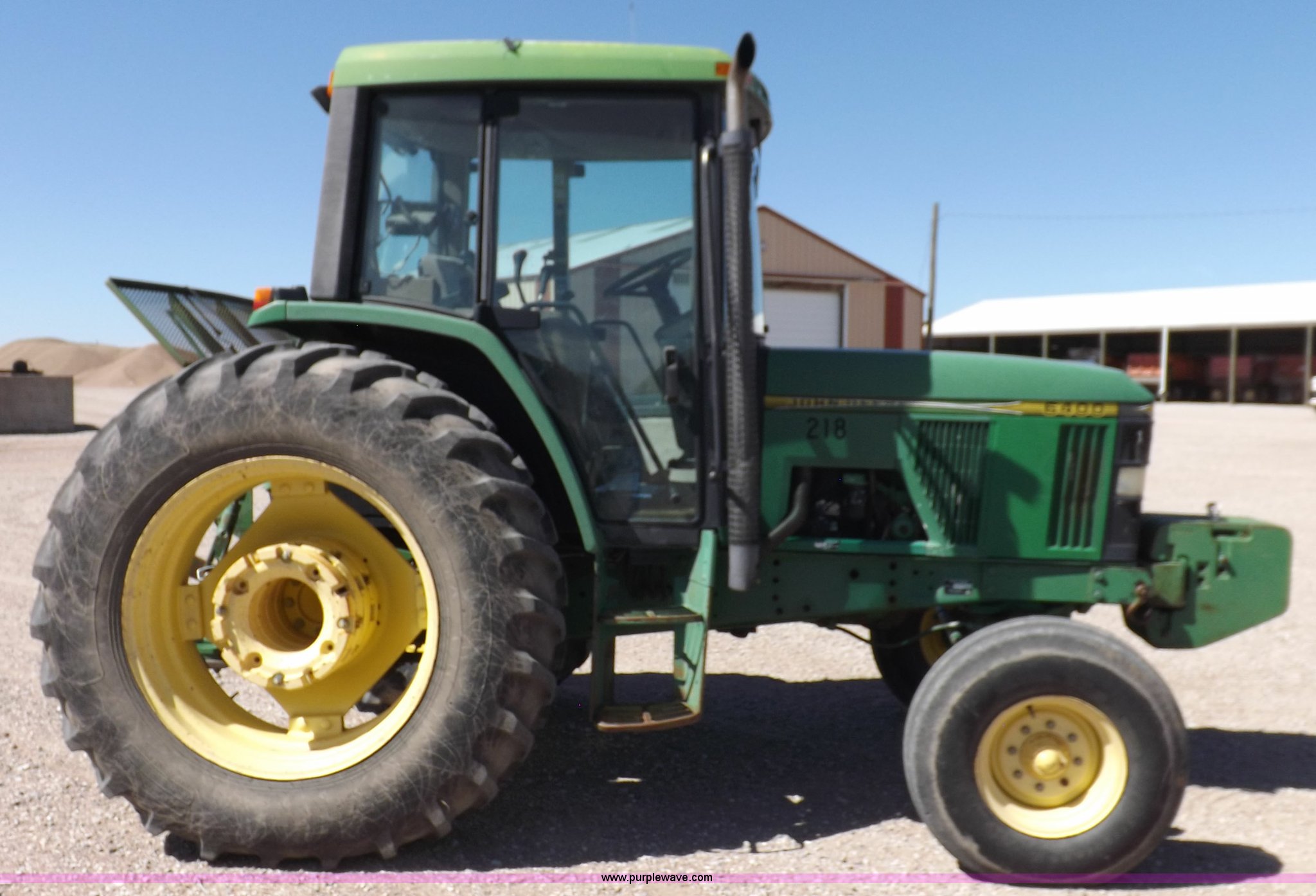 Purple Wave is selling a used Tractor in Kansas. This item is a 1997 John Deere 6400 tractor with the following: 6,079 hours on meter, John Deere CD4045T four cylinder diesel engine, Serial CD4045T340977, Powershift transmission, 16F-16R gears, Differential lock, AC and heat, AM/FM, Spring suspension seat, Tilt steering wheel, Rear glass guard, Three point, Draw bar, 540 and 1000 PTO, (3) rear hydraulic remotes, Suitcase weights, Wheel weights, 94" wheelbase, 10.00-16 front tires, 480/80R38 rear tires, Interior/exterior cosmetic damage, Interior trim damage, Serial L06400P200043, Unit# 218