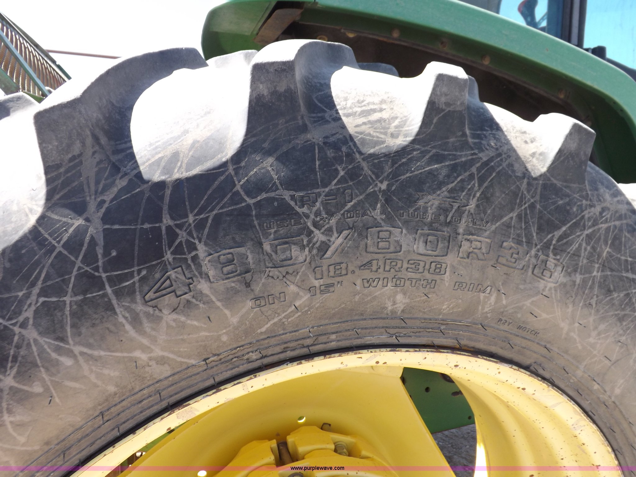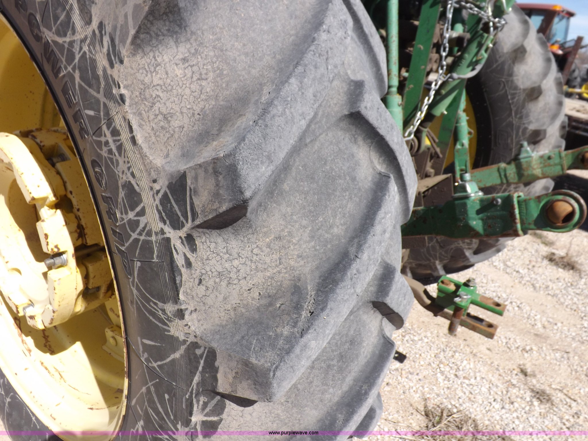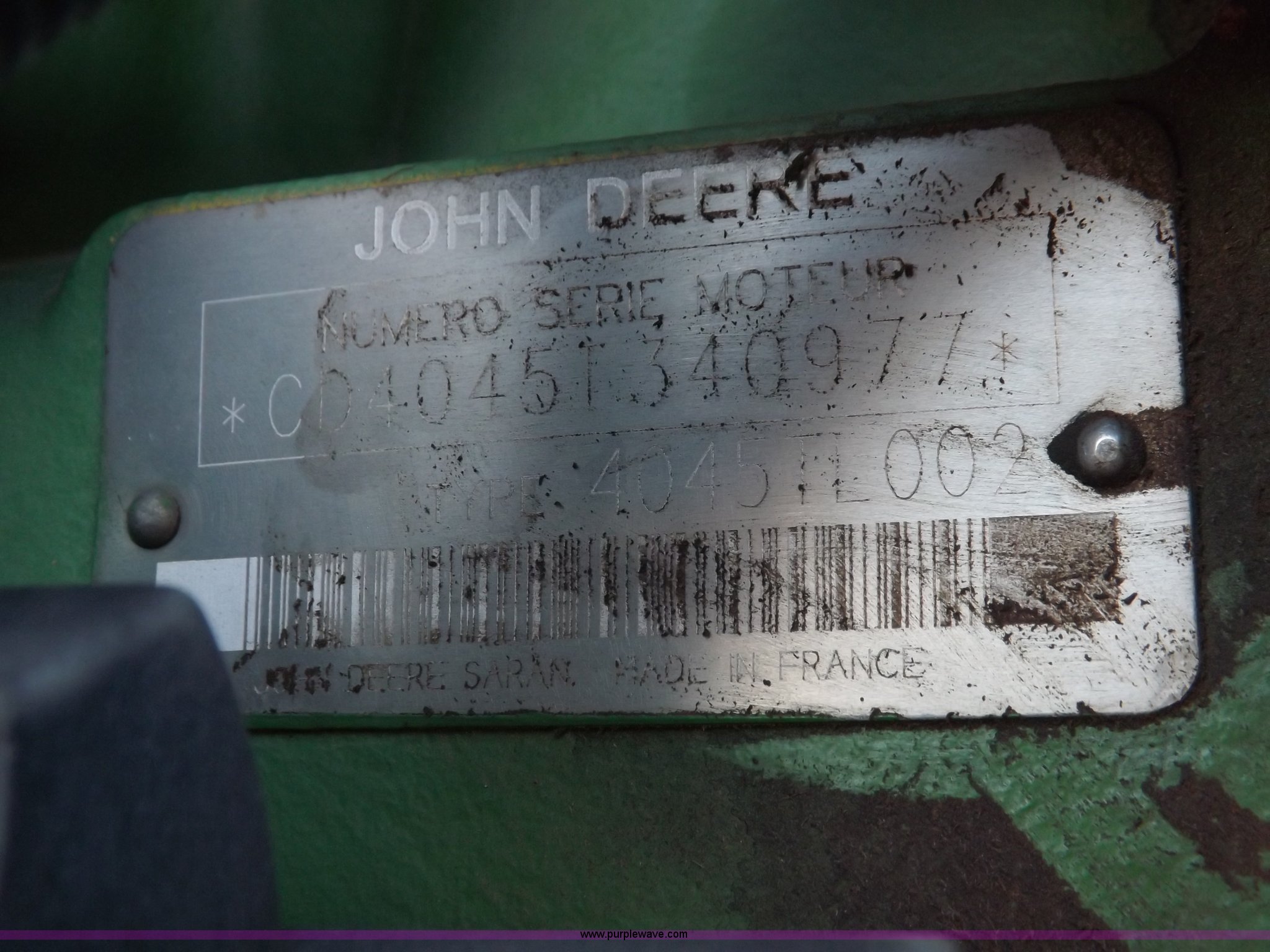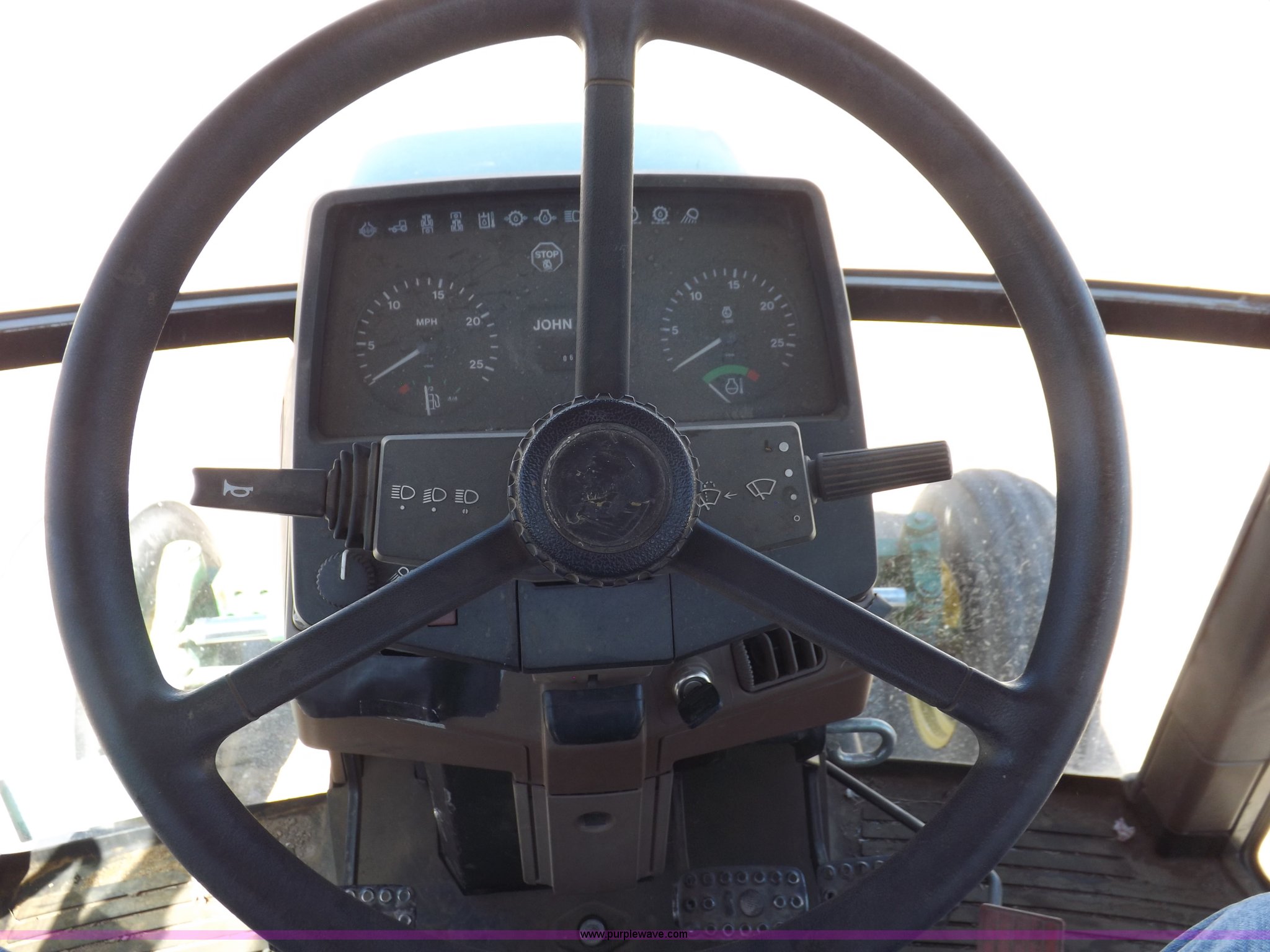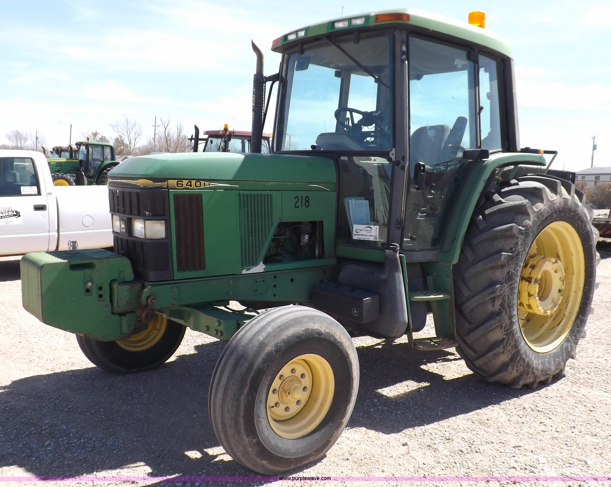 Purple Wave is selling a used Tractor in Kansas. This item is a 1997 John Deere 6400 tractor with the following: 6,079 hours on meter, John Deere CD4045T four cylinder diesel engine, Serial CD4045T340977, Powershift transmission, 16F-16R gears, Differential lock, AC and heat, AM/FM, Spring suspension seat, Tilt steering wheel, Rear glass guard, Three point, Draw bar, 540 and 1000 PTO, (3) rear hydraulic remotes, Suitcase weights, Wheel weights, 94" wheelbase, 10.00-16 front tires, 480/80R38 rear tires, Interior/exterior cosmetic damage, Interior trim damage, Serial L06400P200043, Unit# 218