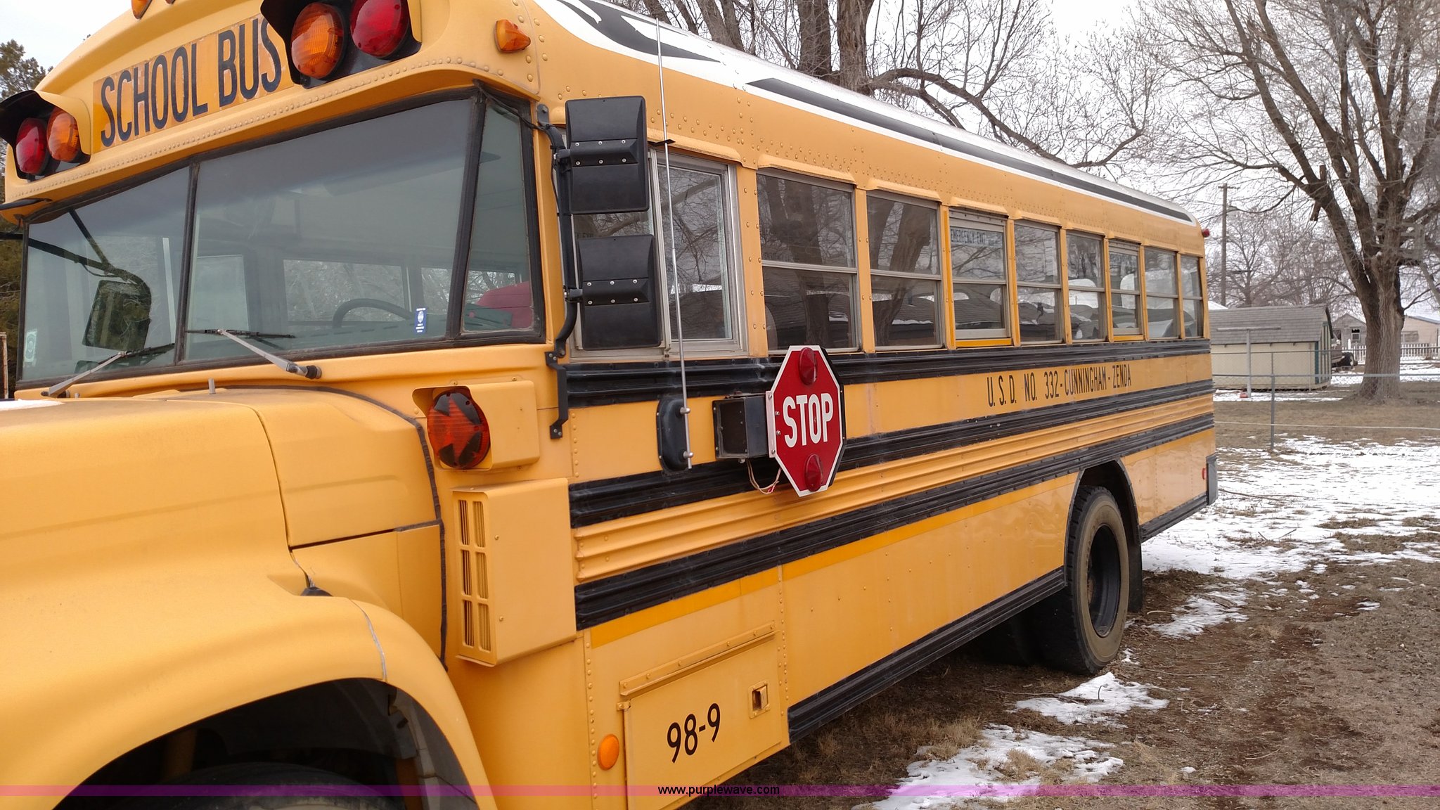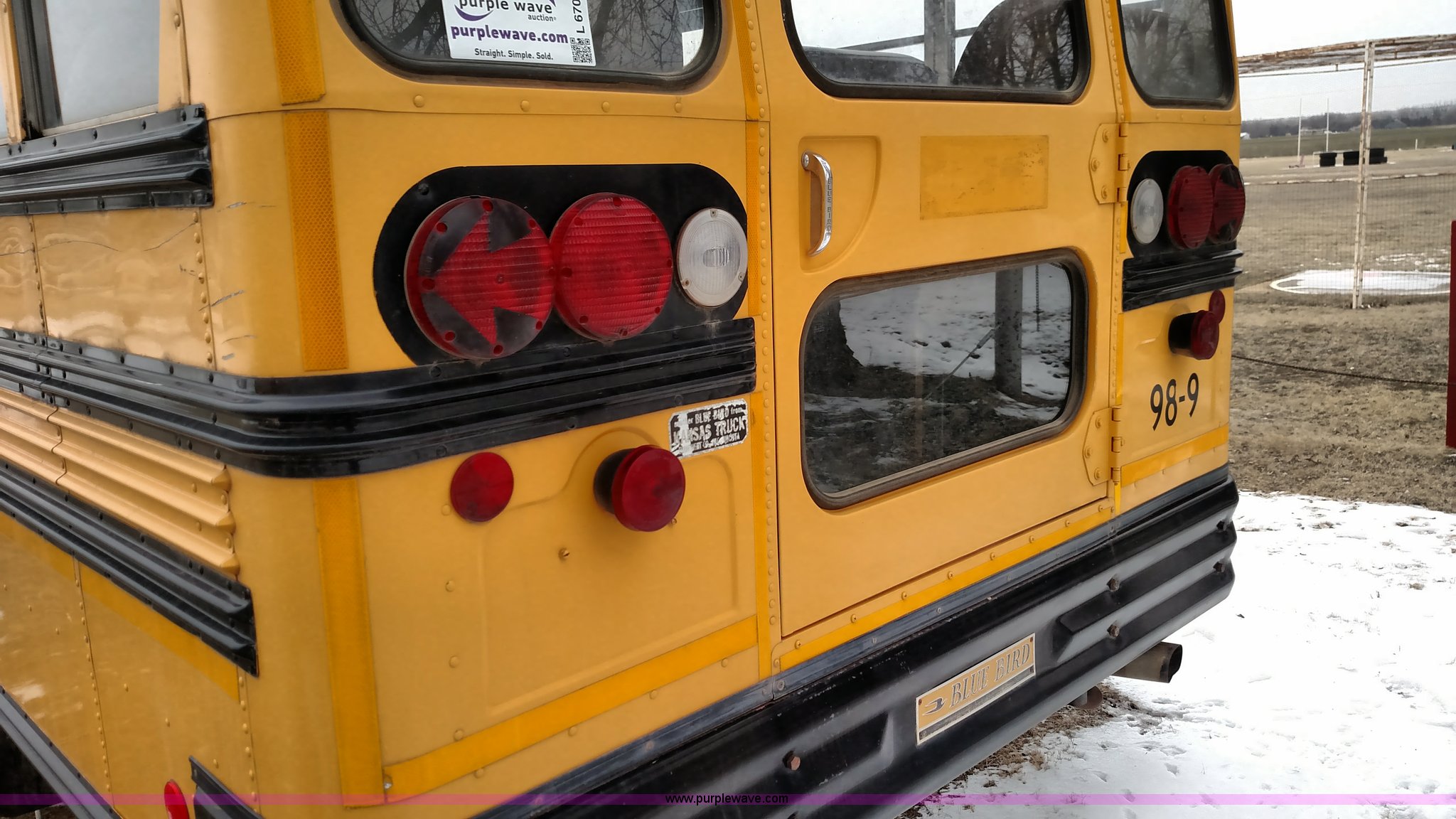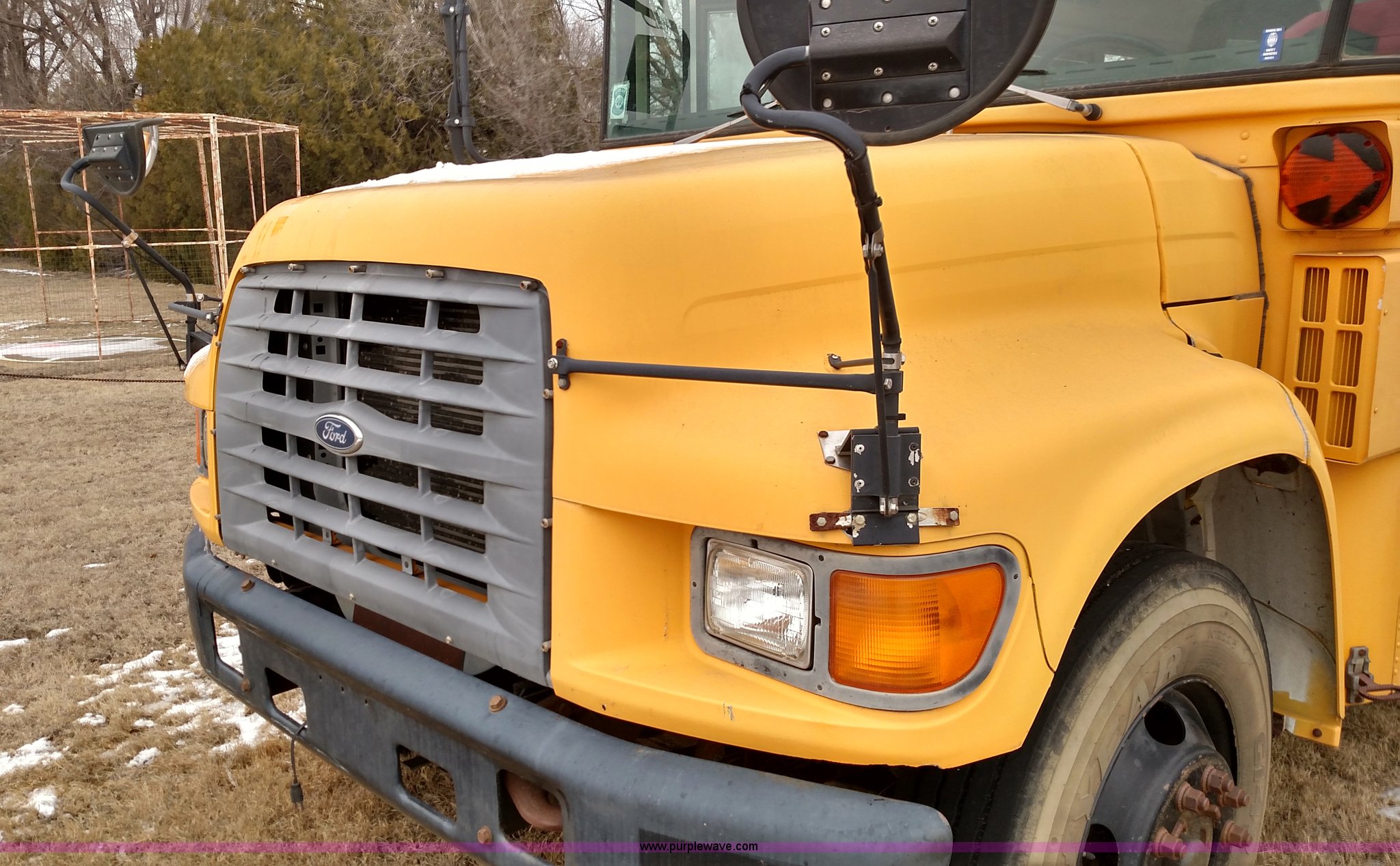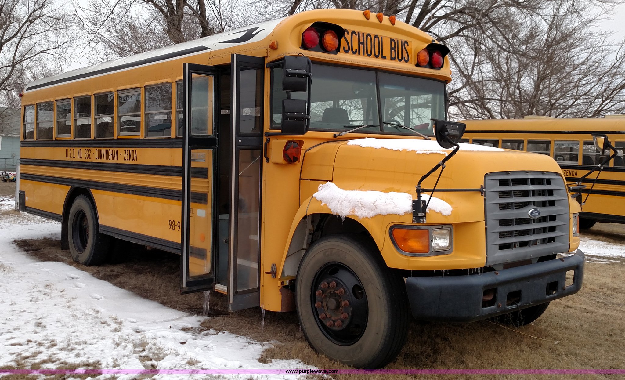 Purple Wave is selling a used Bus in Kansas. This item is a 1998 Ford B800 school bus with the following: 161,540 miles on odometer, Ford 5.9L L6 diesel engine, Automatic transmission, Heat, AM/FM, 47 passenger capacity, Blue Bird body, Model M84108, 10R22.5 tires, Interior/exterior cosmetic damage