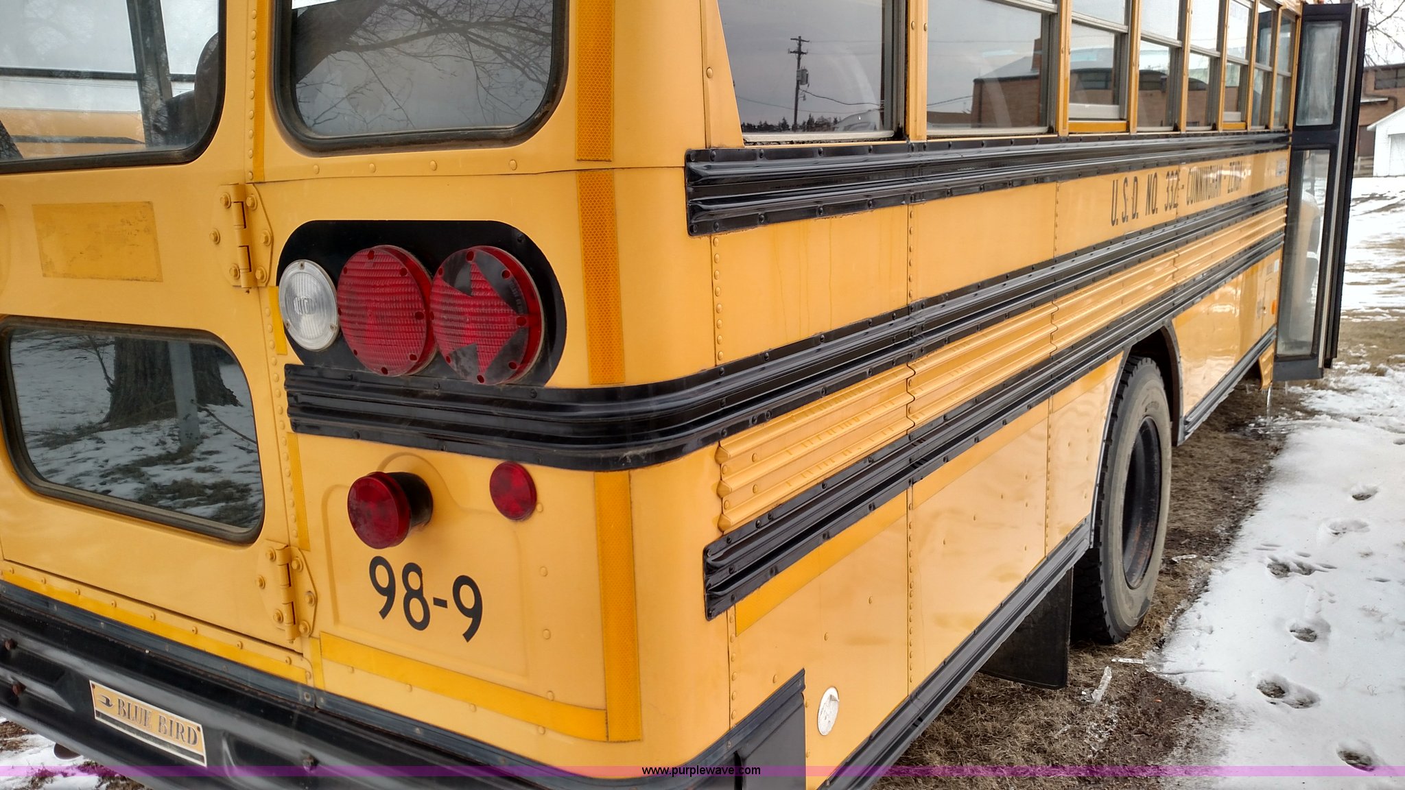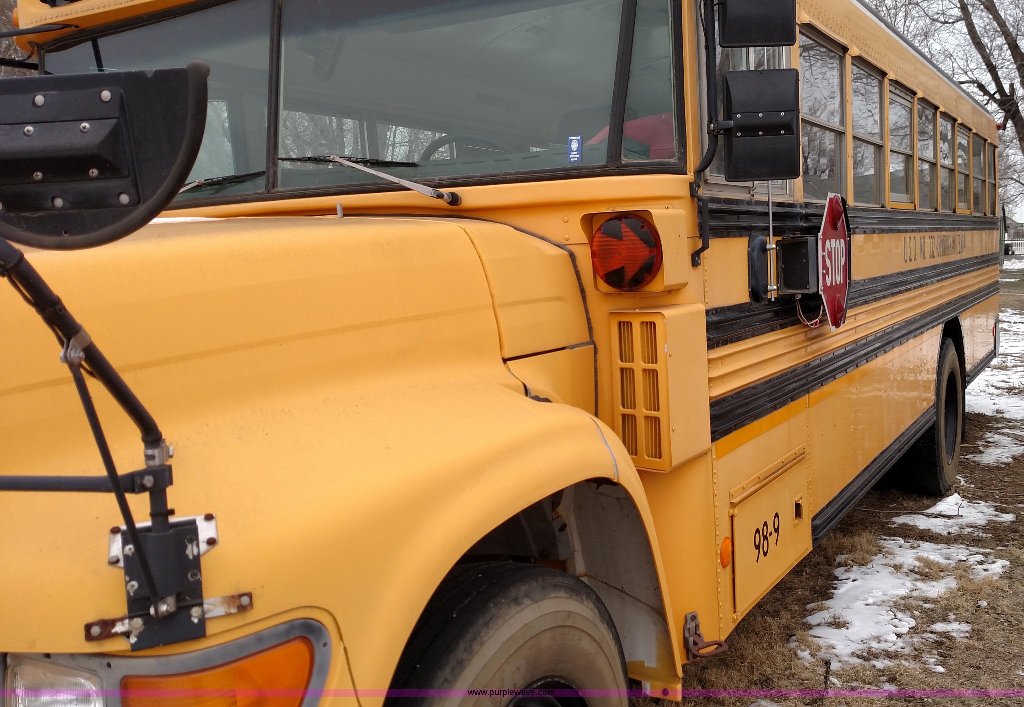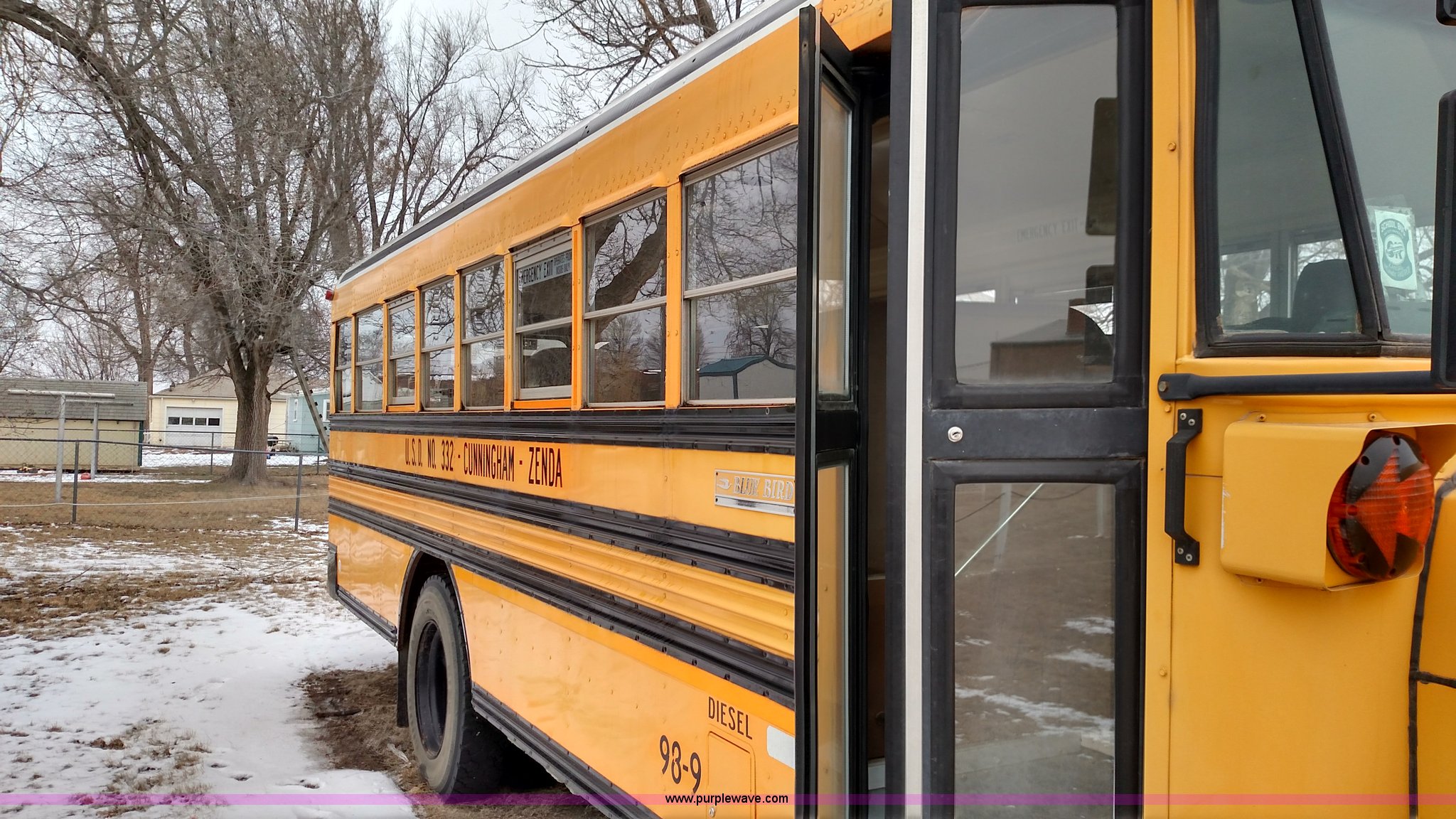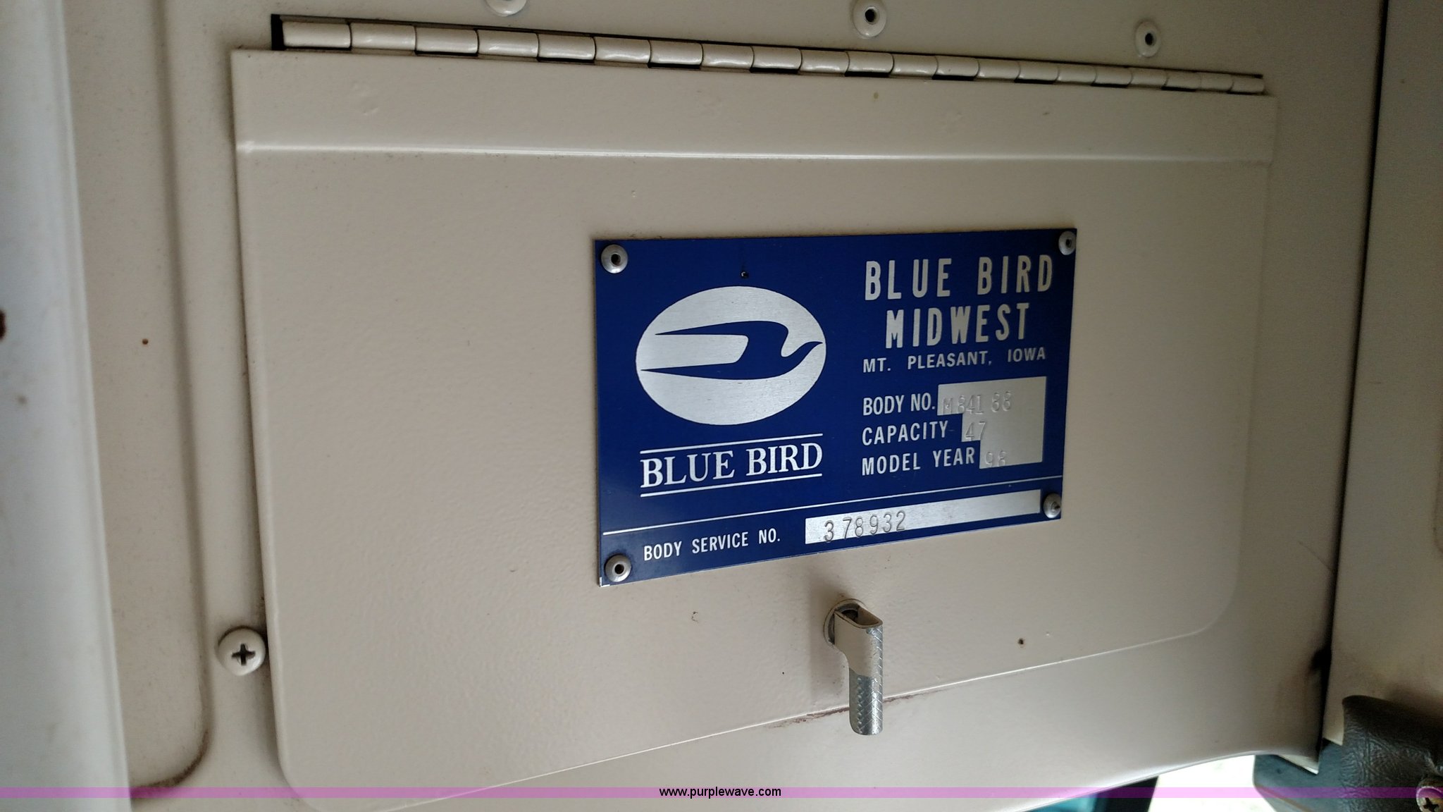 Purple Wave is selling a used Bus in Kansas. This item is a 1998 Ford B800 school bus with the following: 161,540 miles on odometer, Ford 5.9L L6 diesel engine, Automatic transmission, Heat, AM/FM, 47 passenger capacity, Blue Bird body, Model M84108, 10R22.5 tires, Interior/exterior cosmetic damage