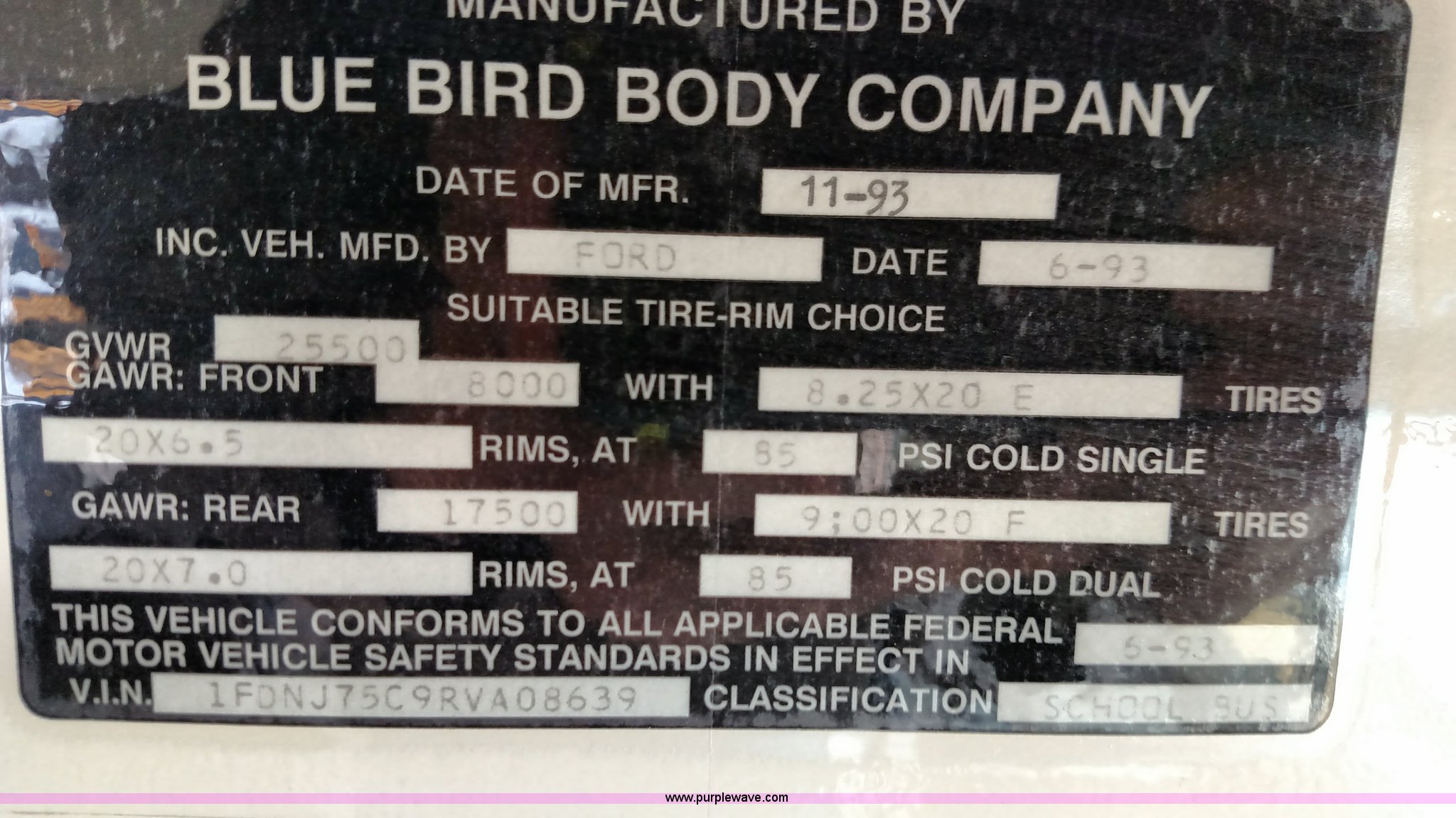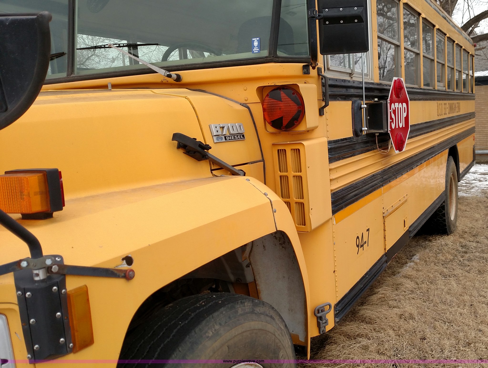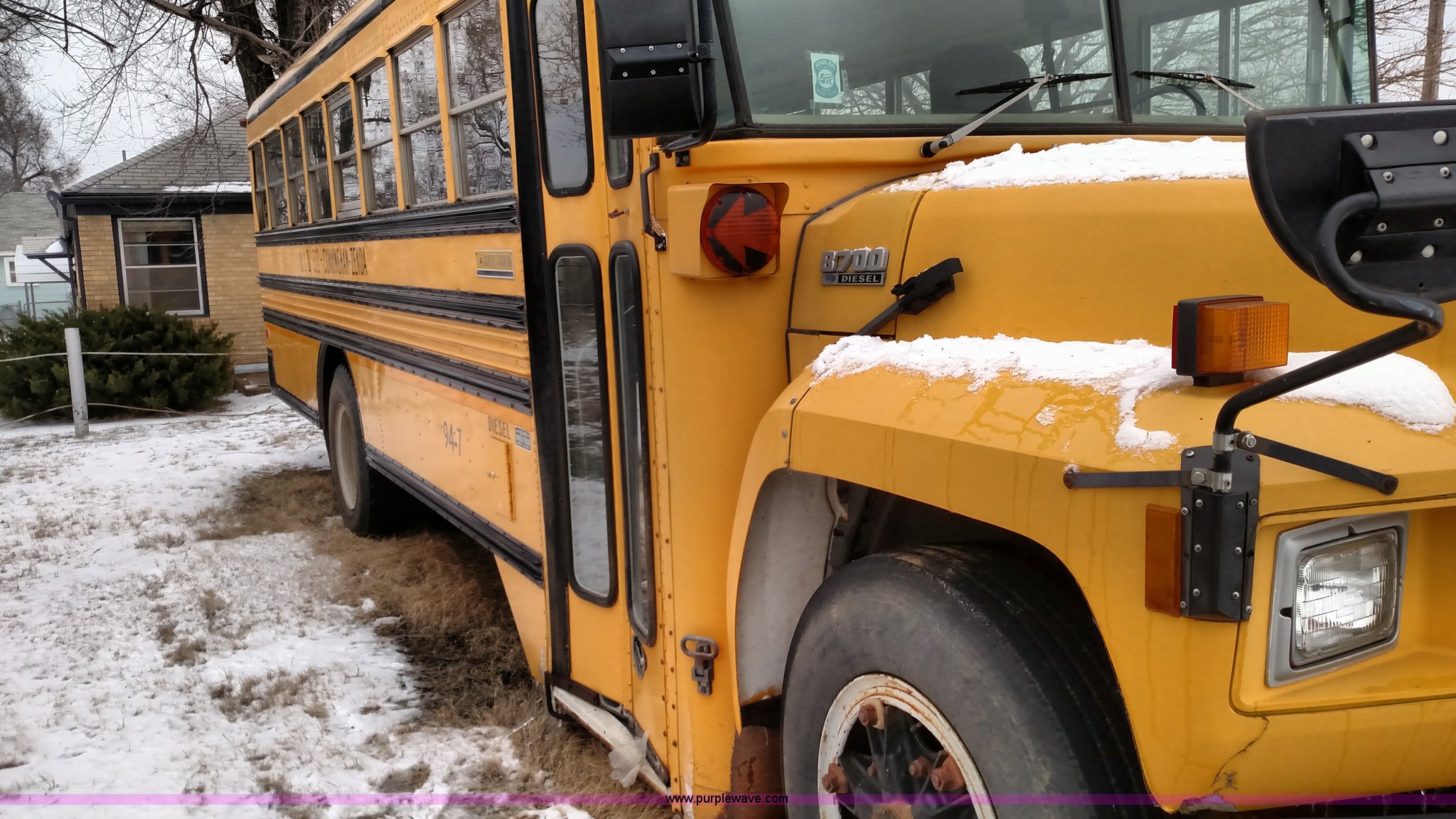 Purple Wave is selling a used Bus in Kansas. This item is a 1994 Ford B700 school bus with the following: 190,946 miles on odometer, Cummins ISB 5.9L L6 diesel engine, Automatic transmission, Heat, AM/FM, 47 passenger capacity, (2) front kid passenger seats, Blue Bird body, Model M66080, 9.00R20 tires, Interior/exterior cosmetic damage, Kenwood two-way radio not included