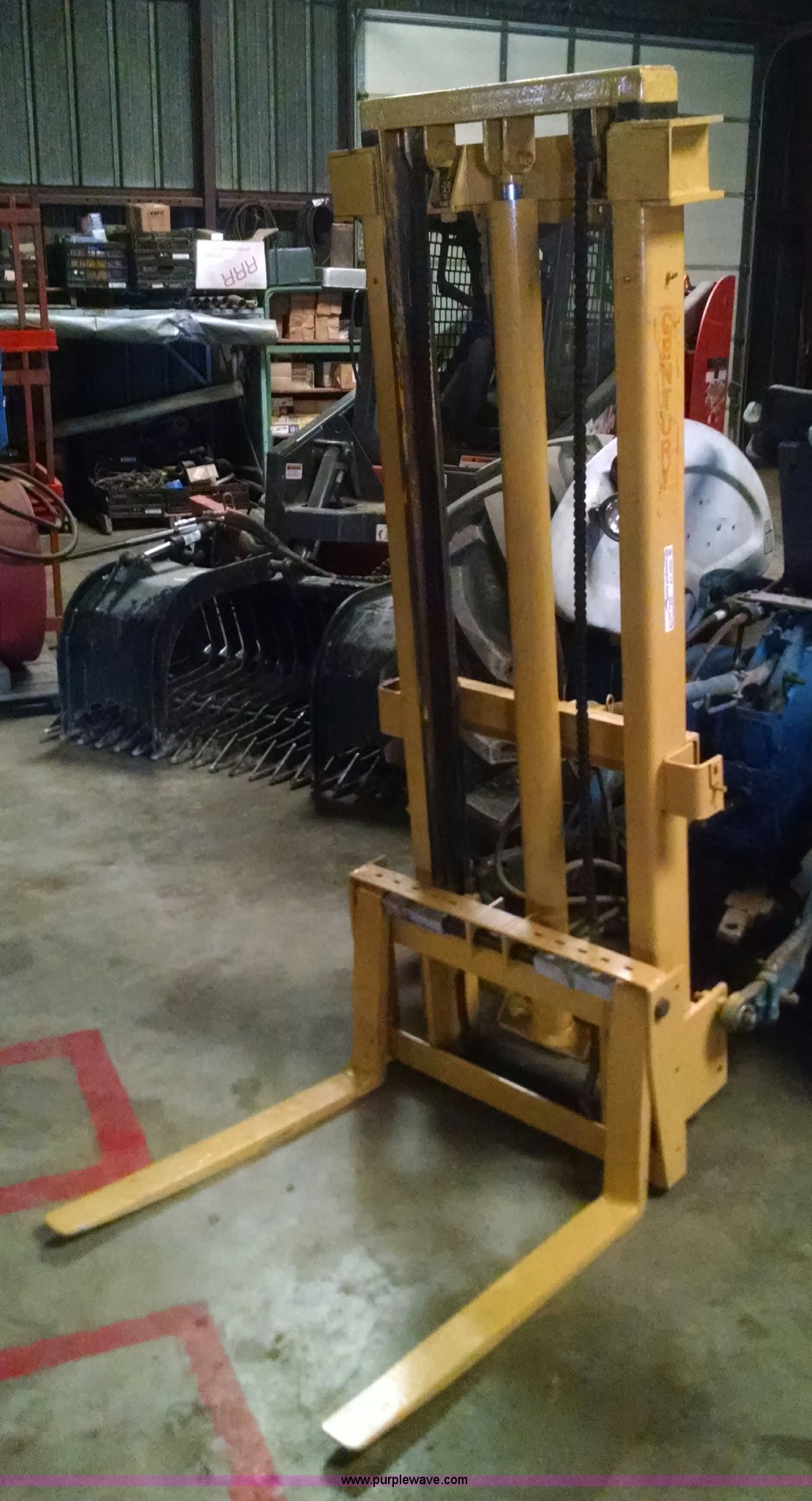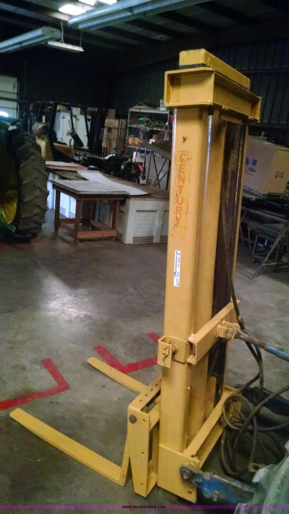 Purple Wave is selling a used Forklift Attach. in Missouri. This item is a Century forklift attachment with the following: Three point, 29" max width, 30"L x 3"W x 1" thick forks, Approx. 11' lift height