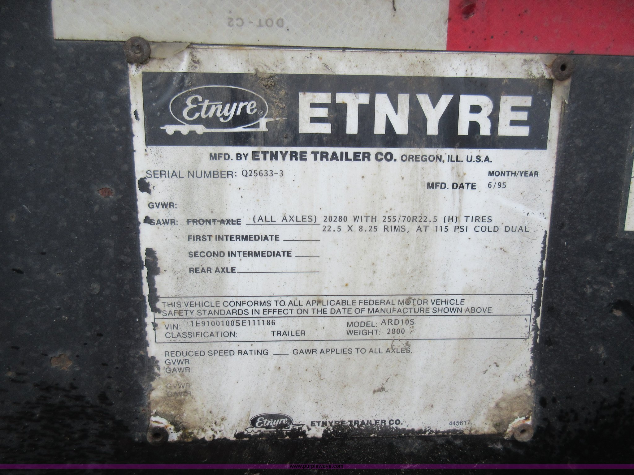 1995 Etnyre RTN50TD-TI equipment trailer. 25'L x 102"W deck, Wet kit or self contained detach Honda gas engine, 12" outriggers, 1995 Etnyre ARD10S tag axle Base weight 3,100 lbs, 1995 Etnyre ARD10S stinger Base weight 2,800 lbs, Air suspension, Air brakes, 255/70R22.5 tires, GVWR 21,240 lbs, Unit#. 1E9Y25203SE111185. Ace Blacktop Inc.. Inver Grove Heights, MN 55076