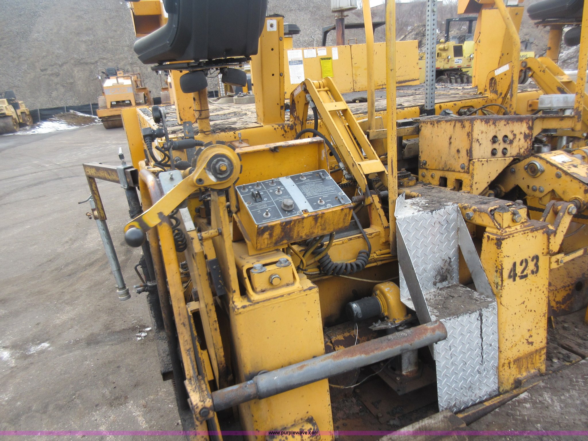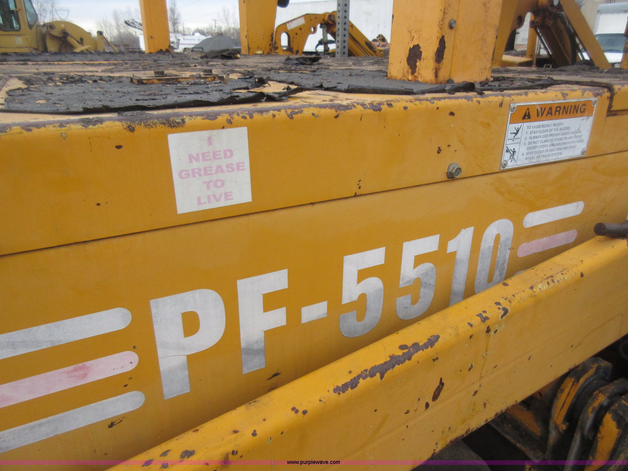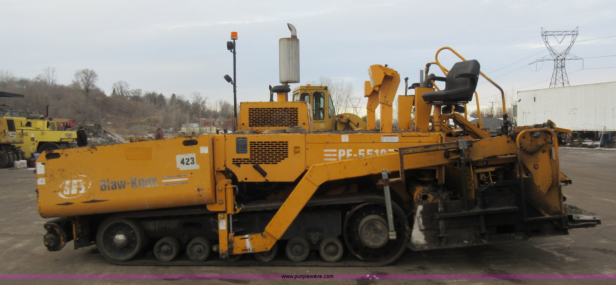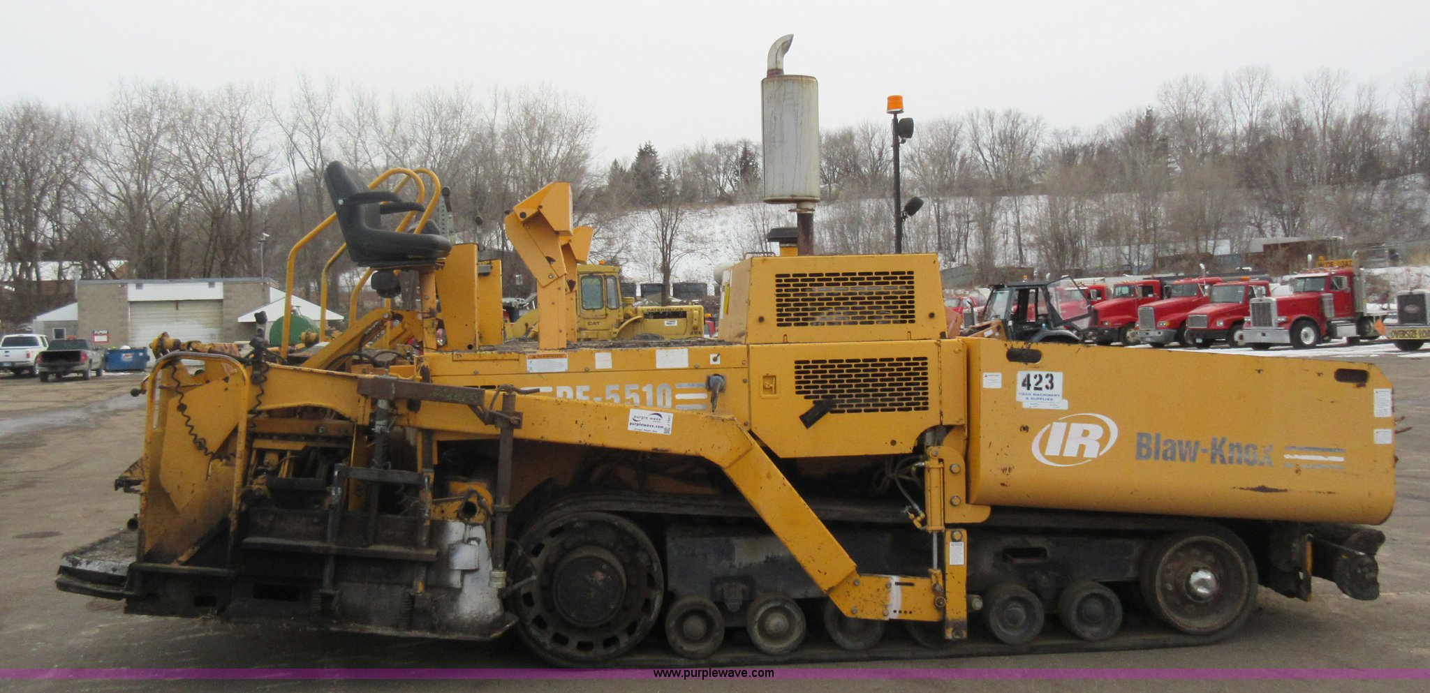 Purple Wave is selling a used Paver or Screed in Minnesota. This item is a 2002 Blaw Knox PF-5510 asphalt paver with the following: Cummins six cylinder diesel engine, Hydrostatic transmission, Dual operator stations, Grade controls, 10' to 16' paving width, Screed extensions, Work lights, 19"W rubber tracks, 36,950 lbs. base operating weight, Serial 551031-01, Unit# 423