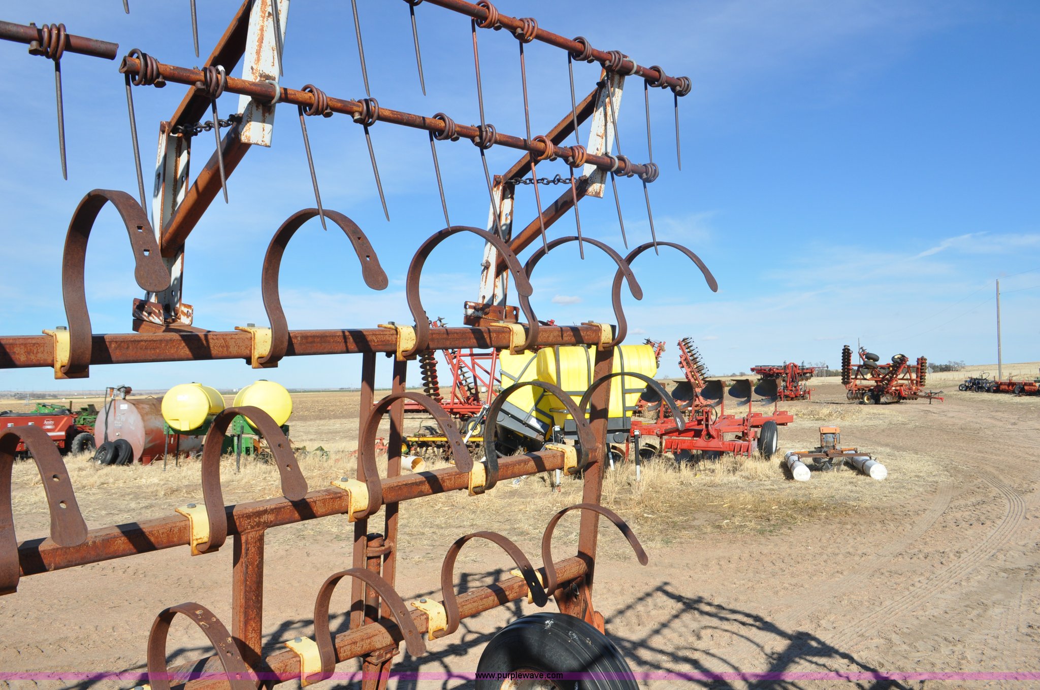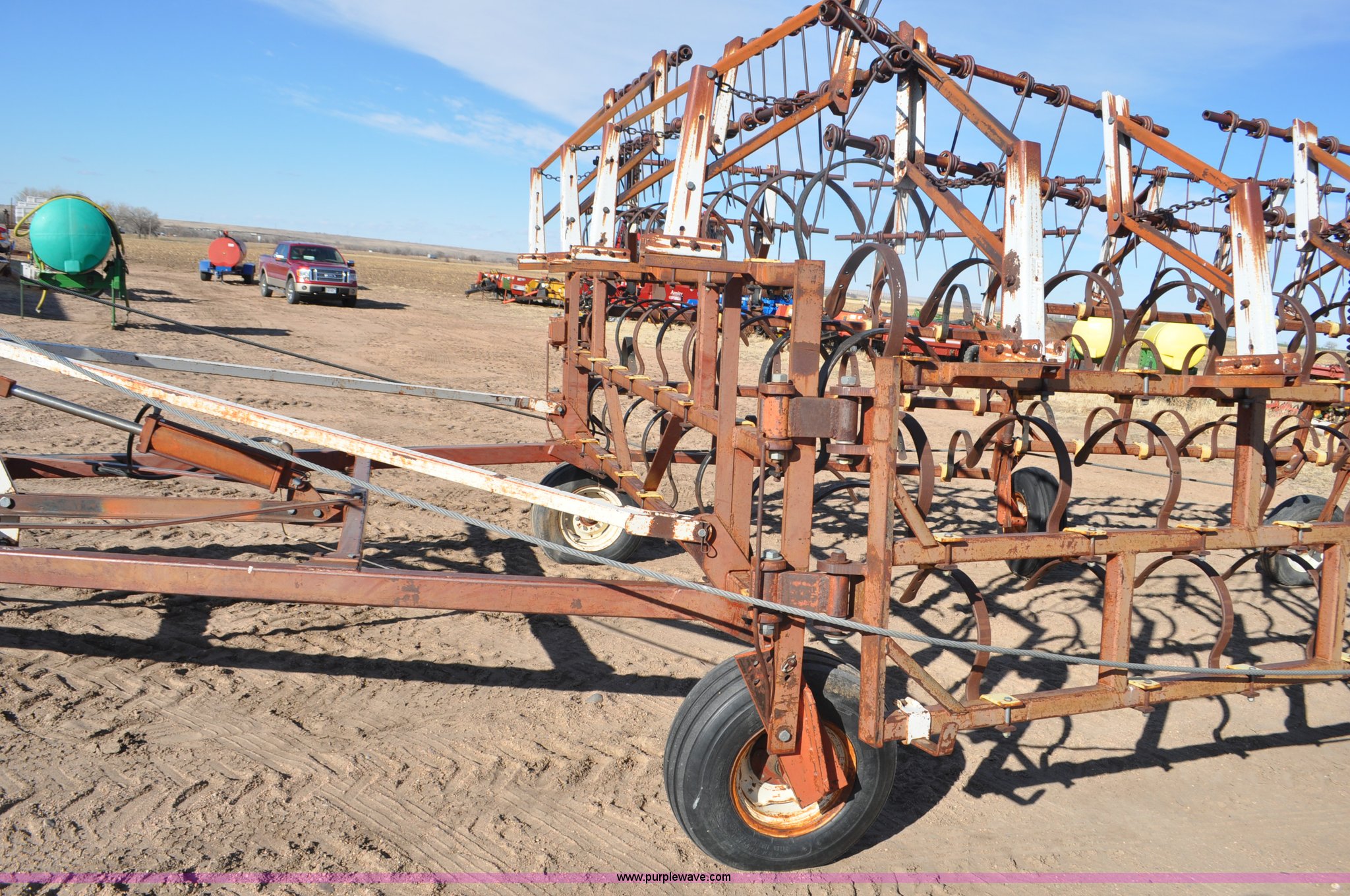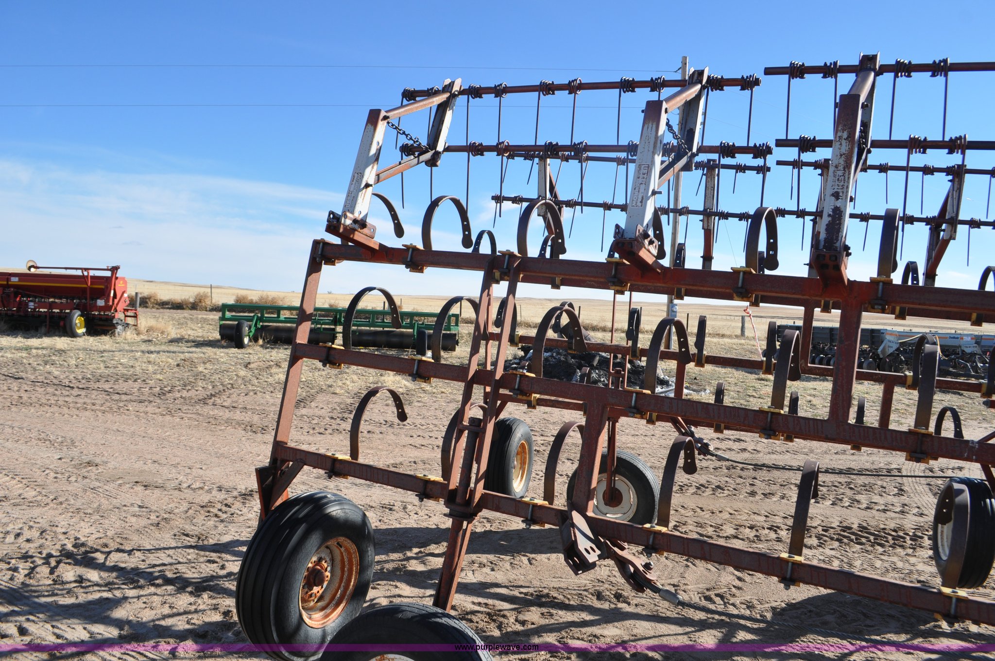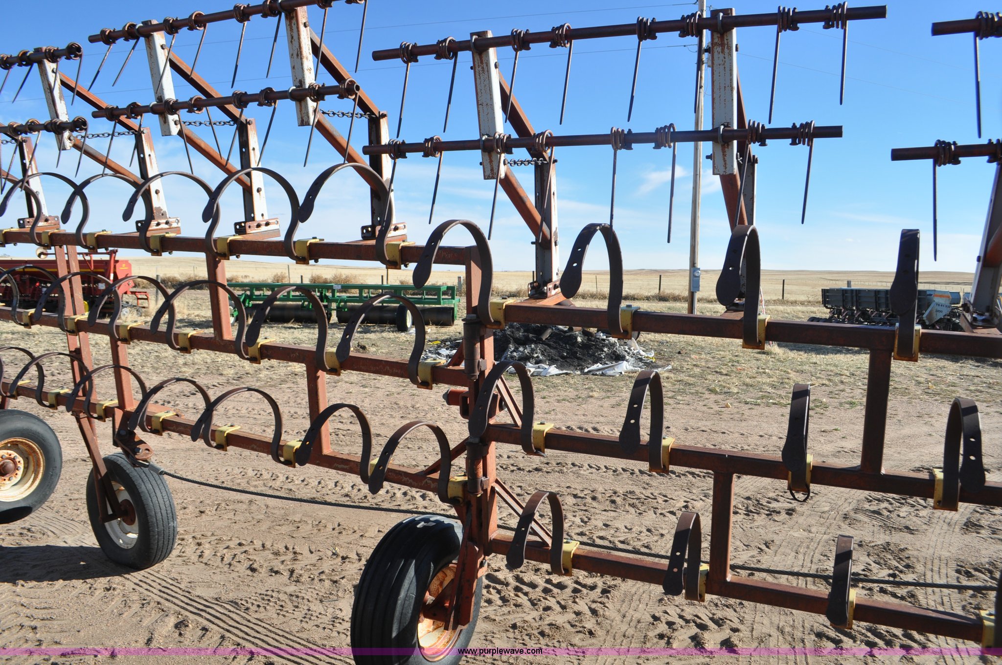 Purple Wave is selling a used Row Crop Cultivator in Colorado. This item is a Spring tooth harrow with the following: 55'W, Spring shanks, Lift to fold, Midwest two bar tine harrows, 9.5L tires