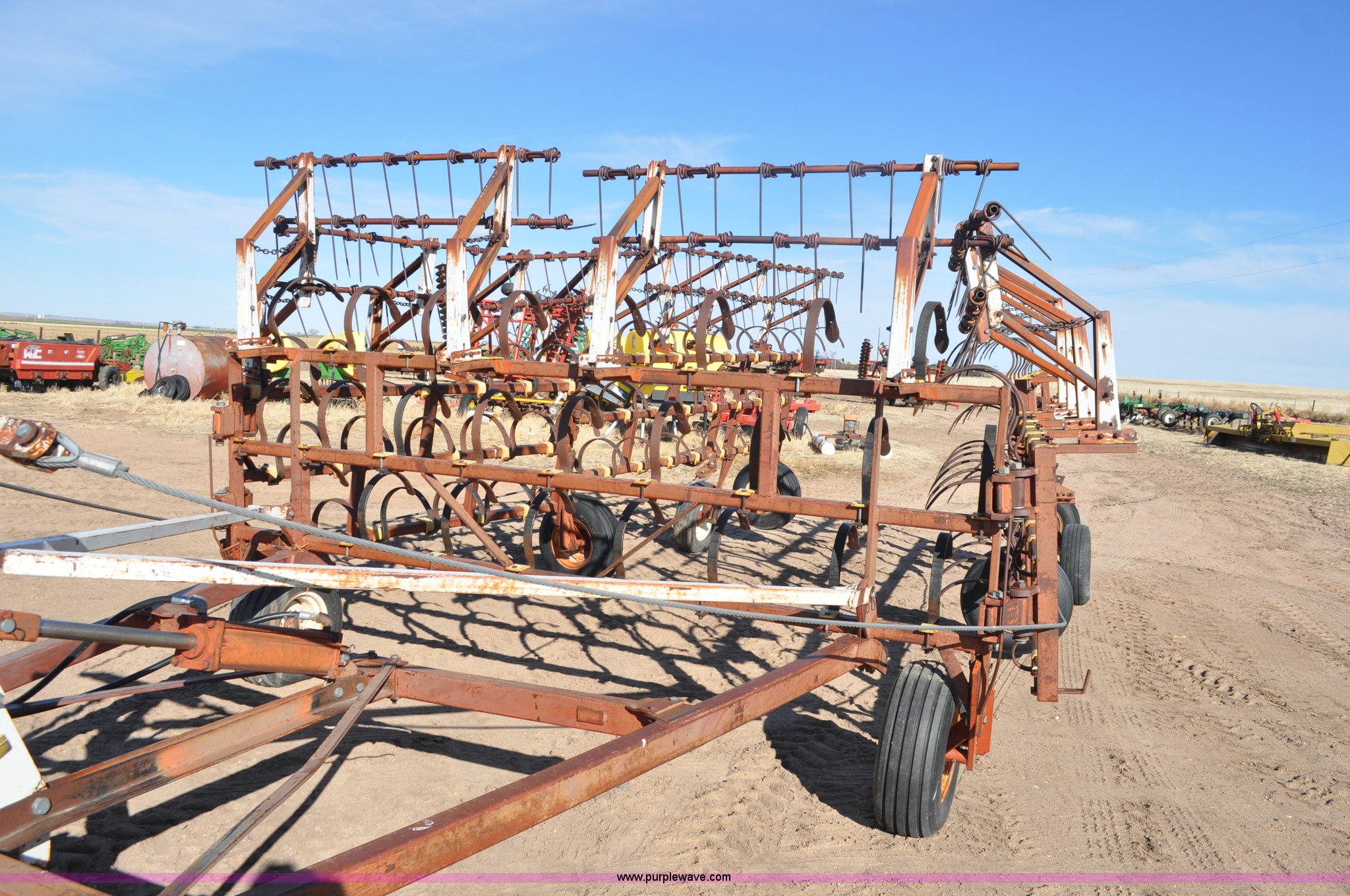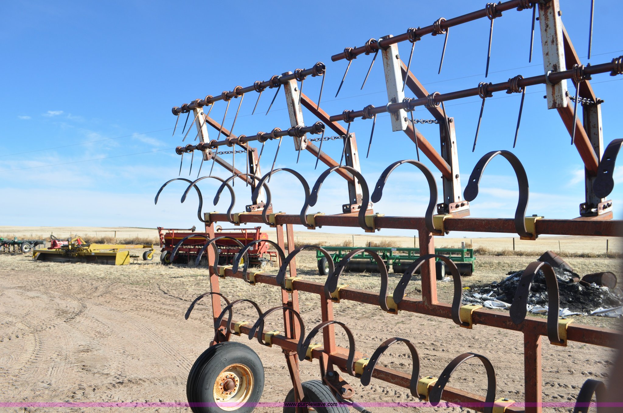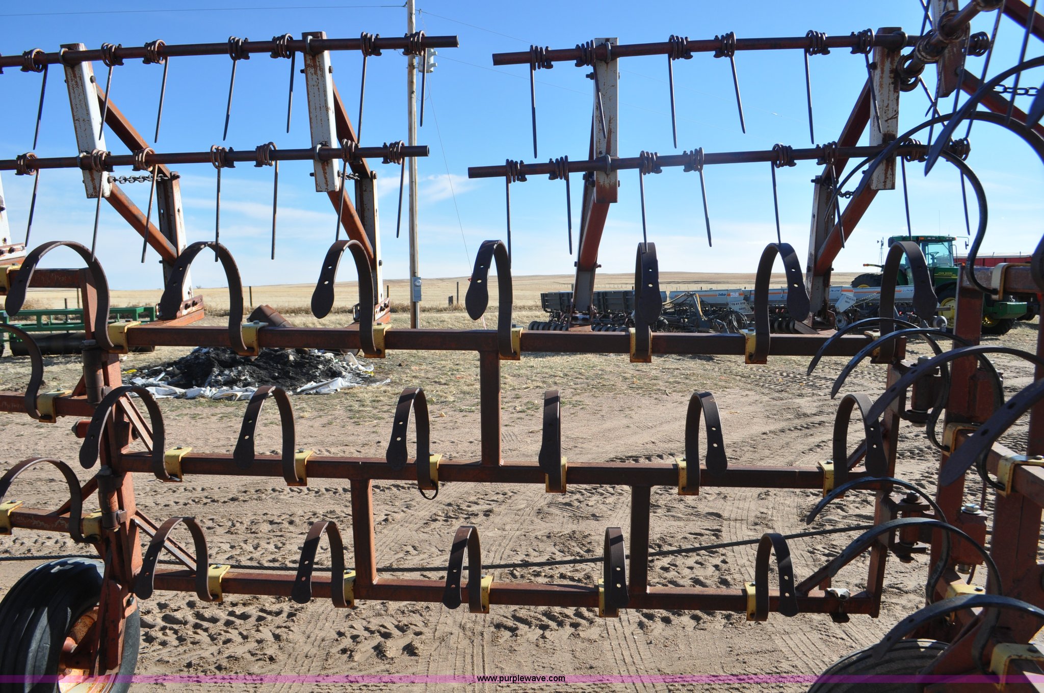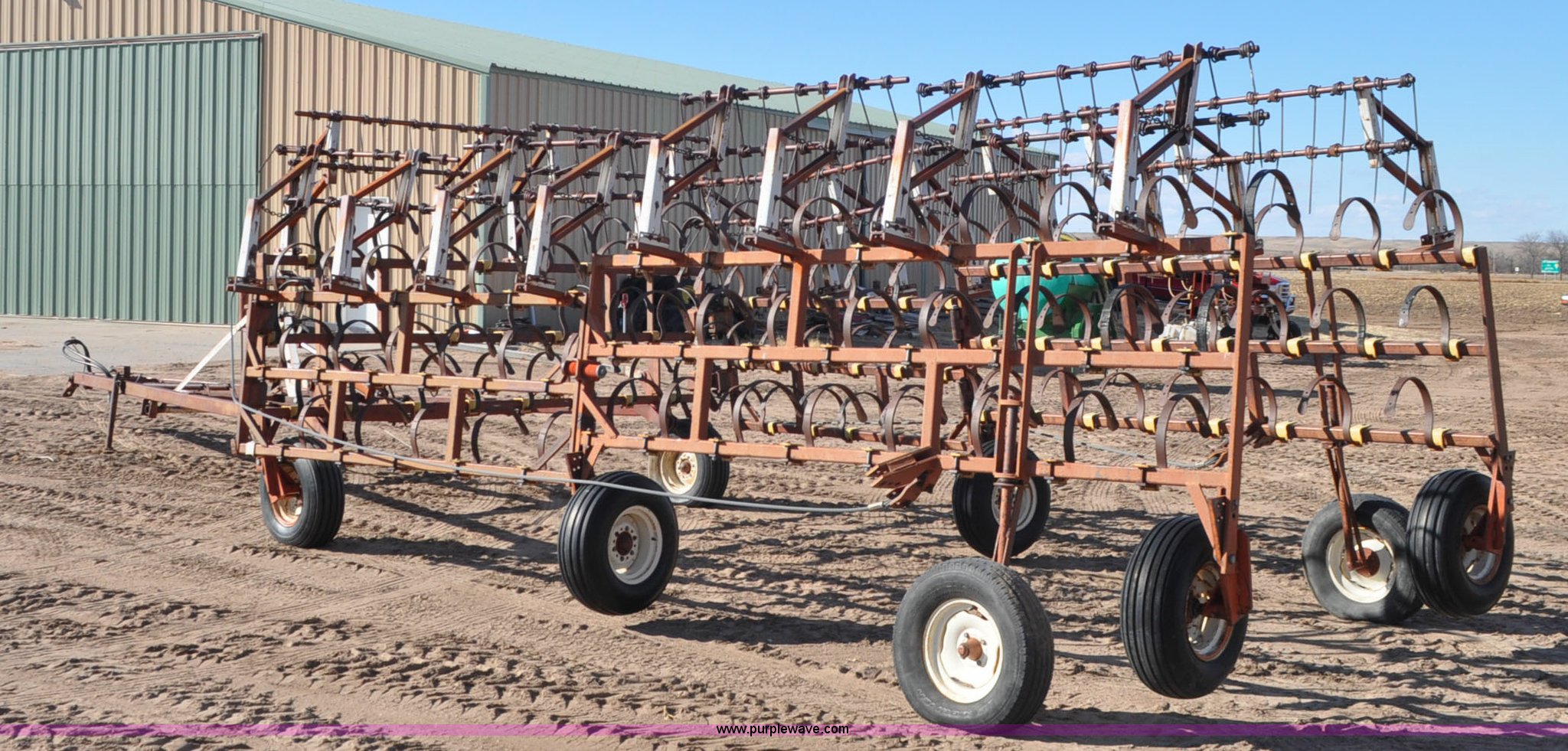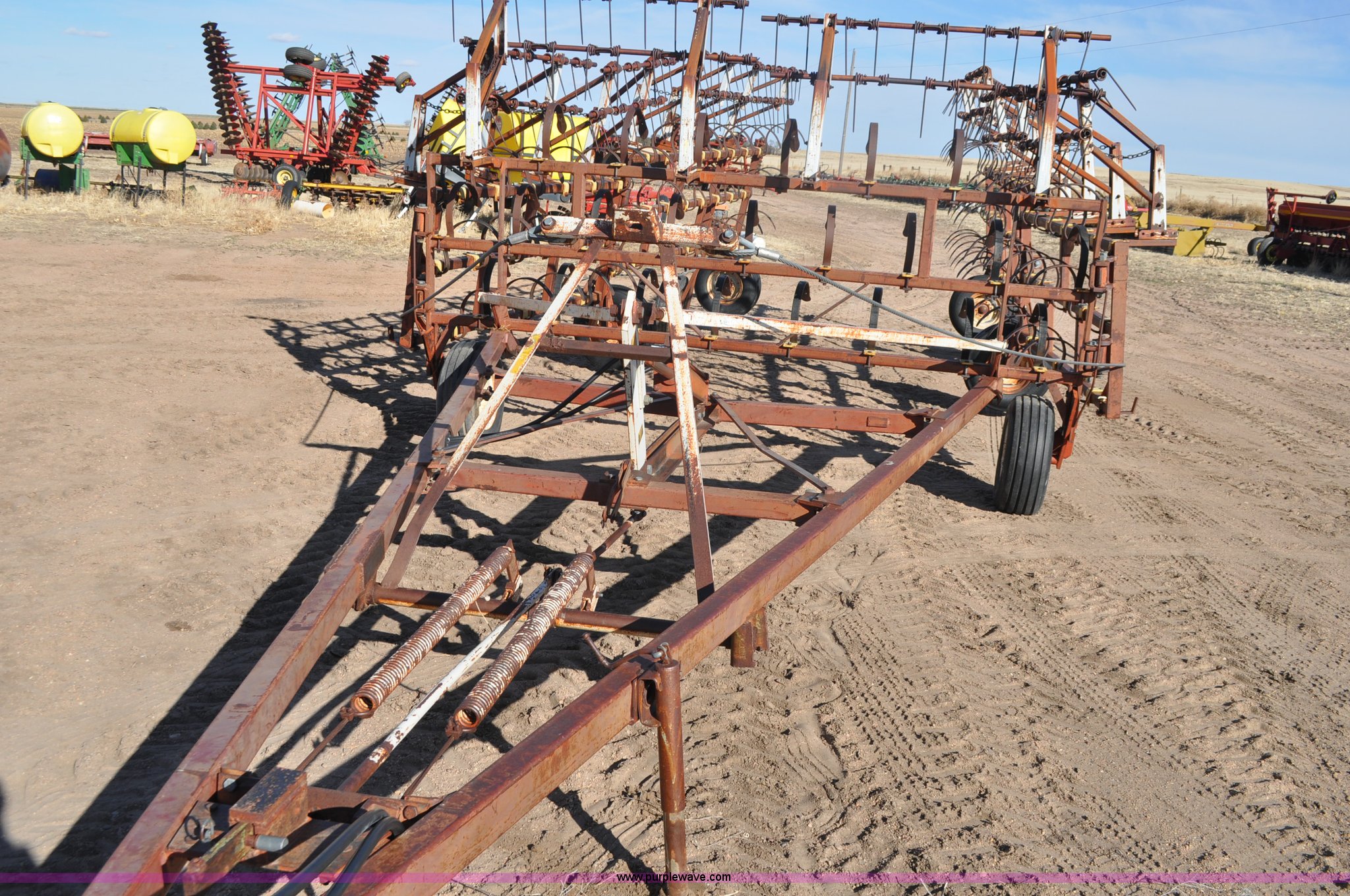 Purple Wave is selling a used Row Crop Cultivator in Colorado. This item is a Spring tooth harrow with the following: 55'W, Spring shanks, Lift to fold, Midwest two bar tine harrows, 9.5L tires