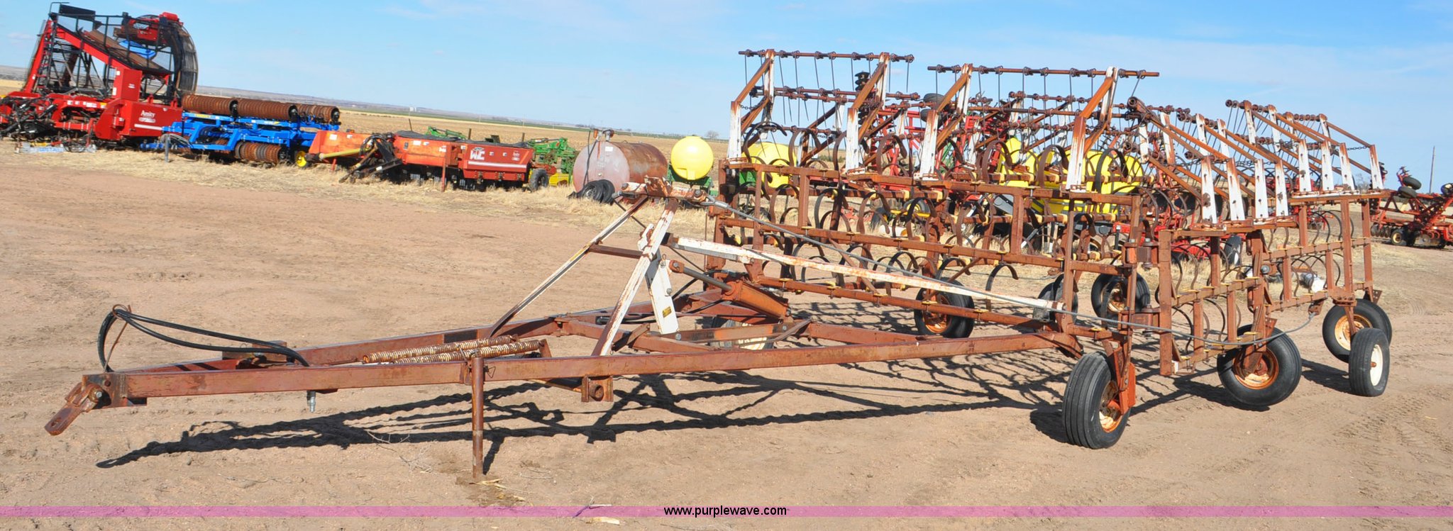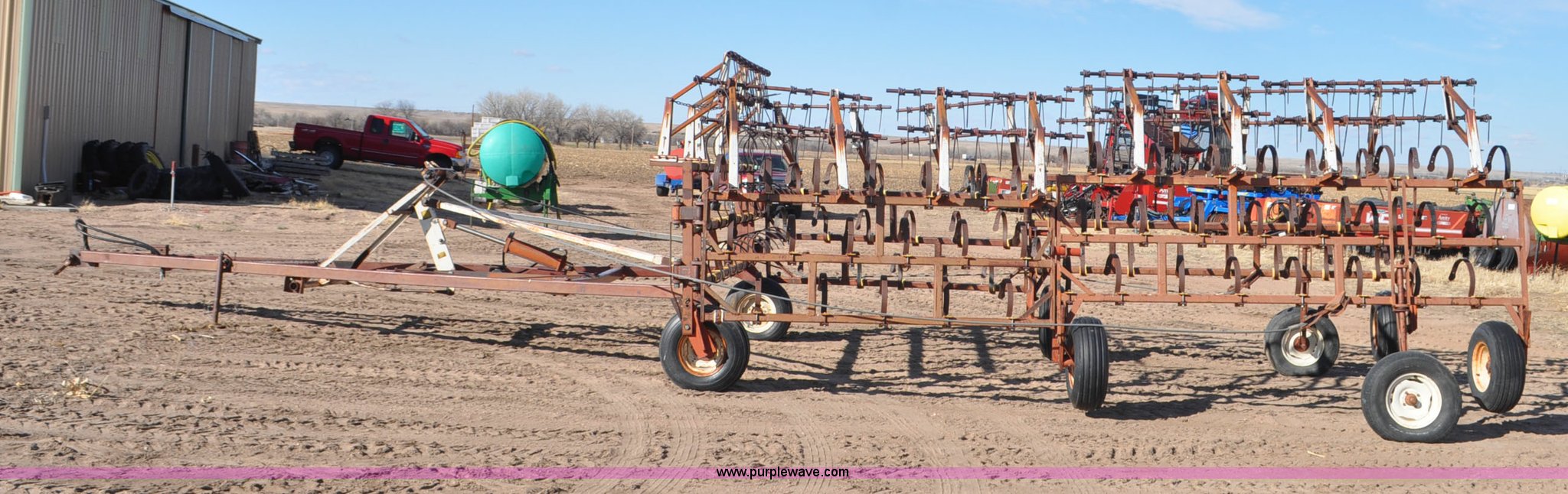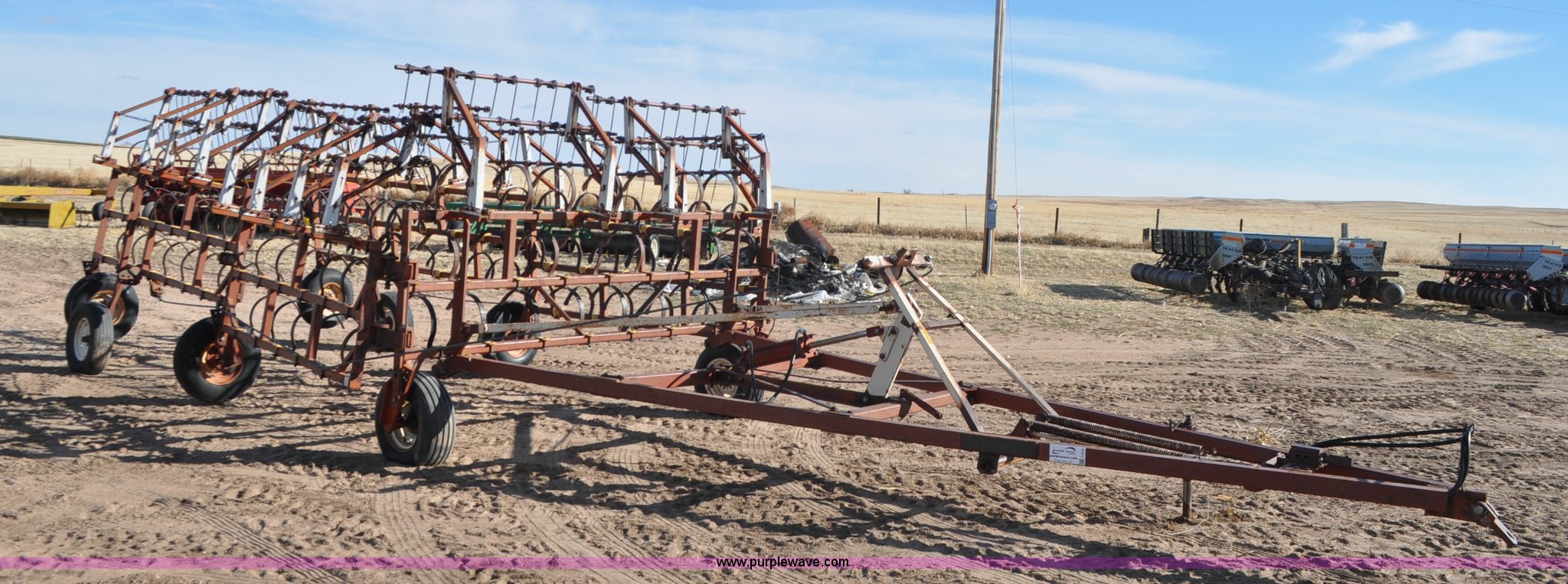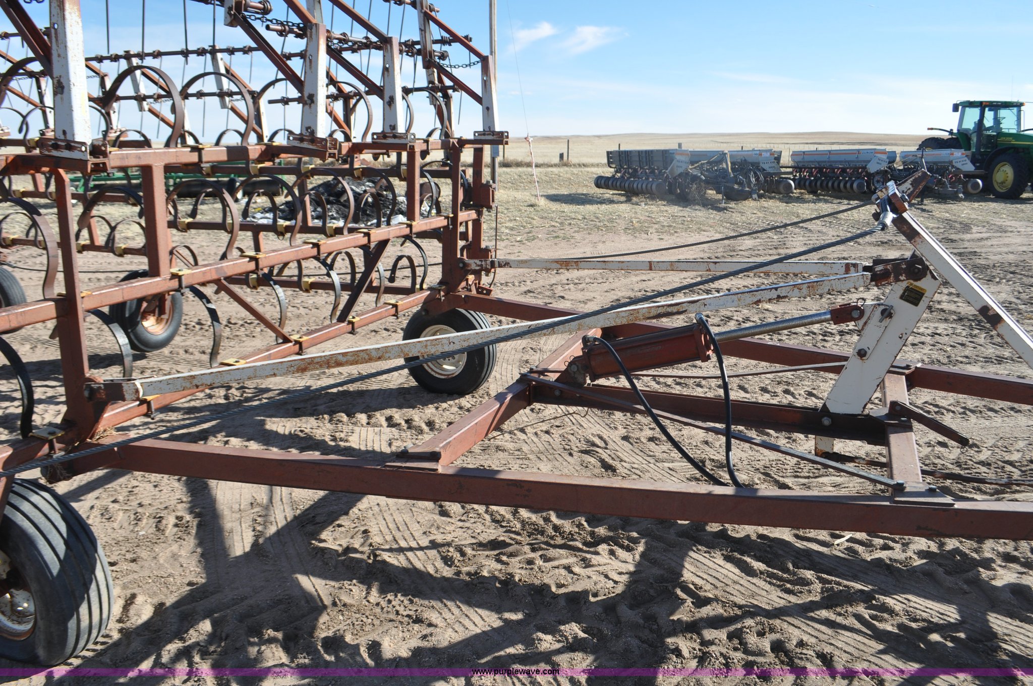 Purple Wave is selling a used Row Crop Cultivator in Colorado. This item is a Spring tooth harrow with the following: 55'W, Spring shanks, Lift to fold, Midwest two bar tine harrows, 9.5L tires