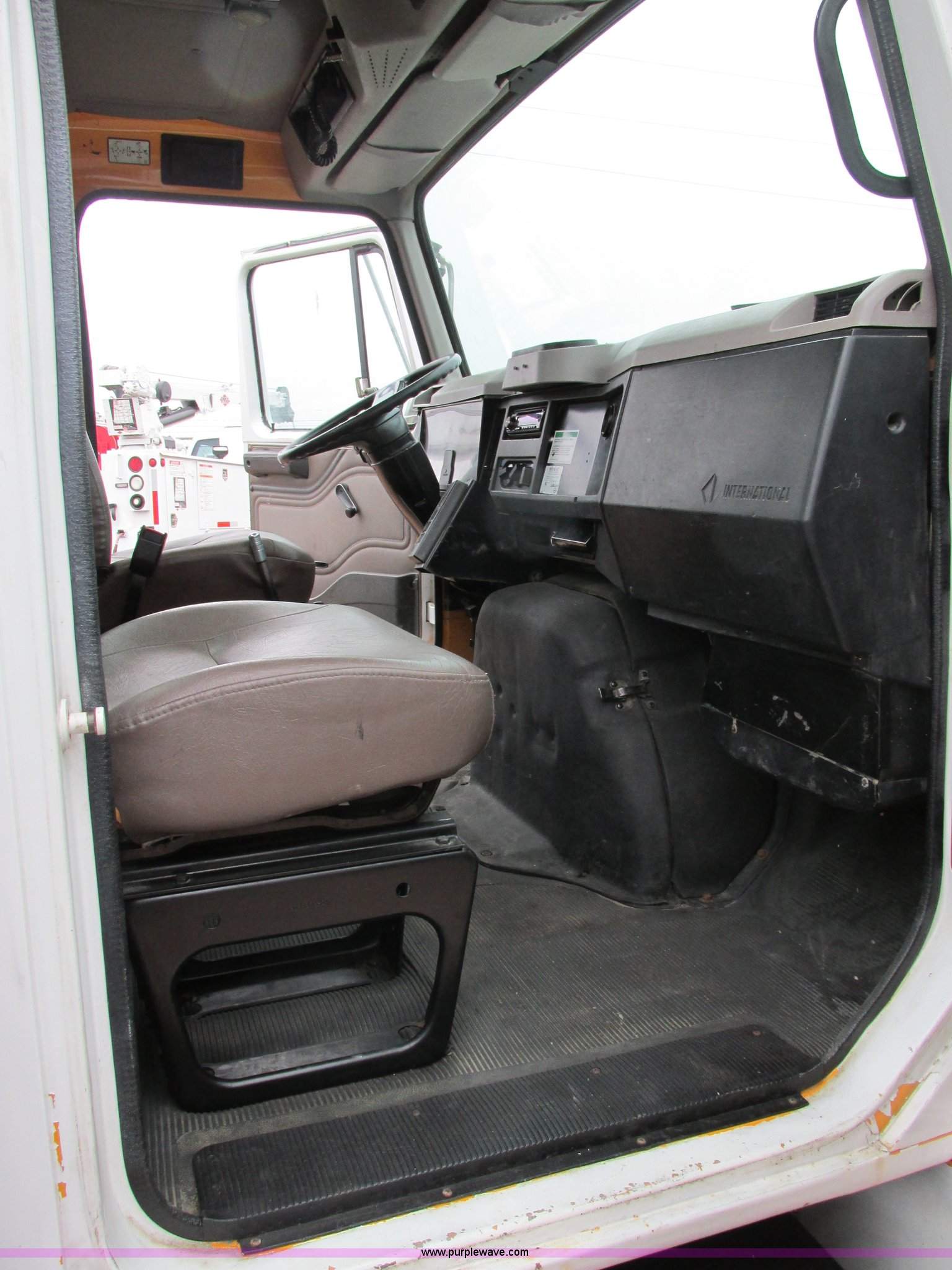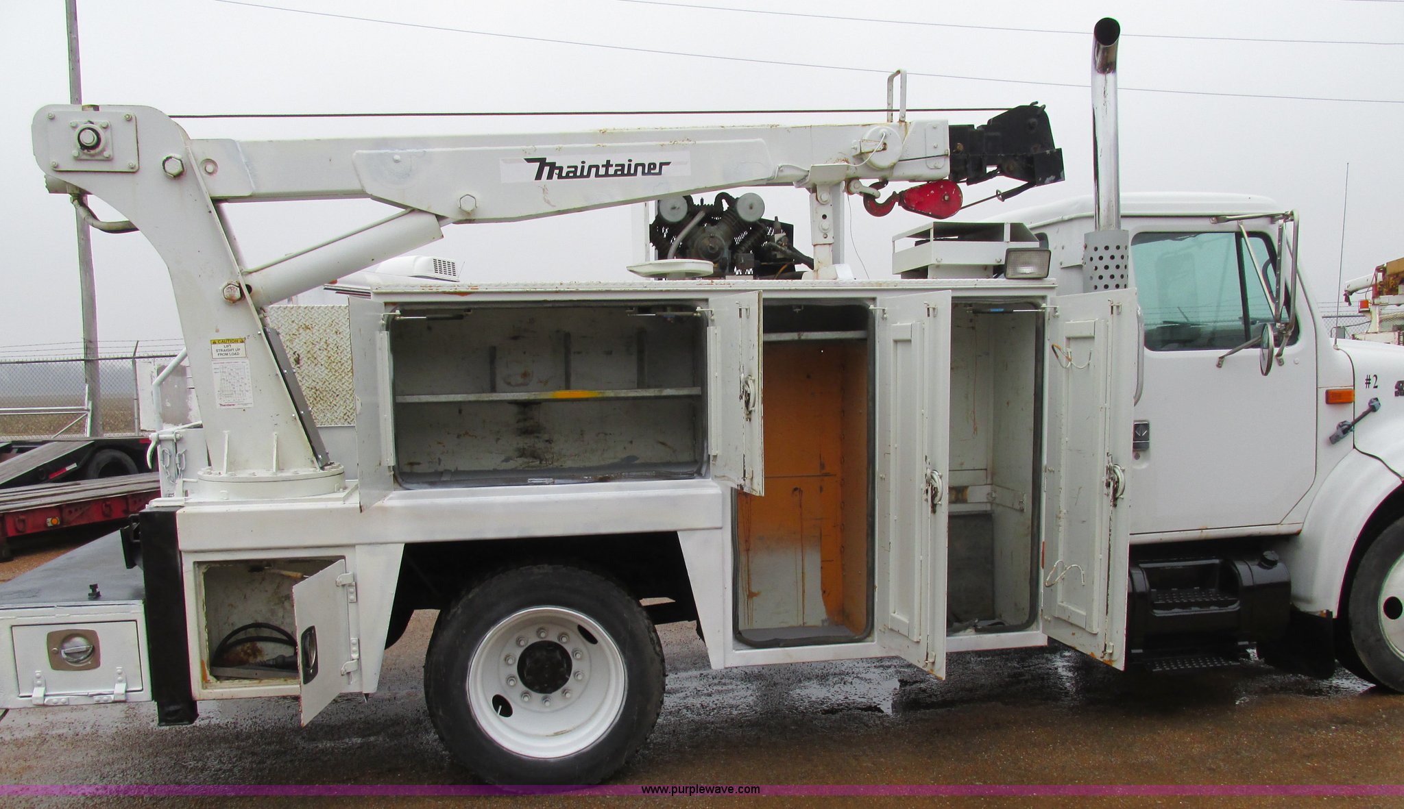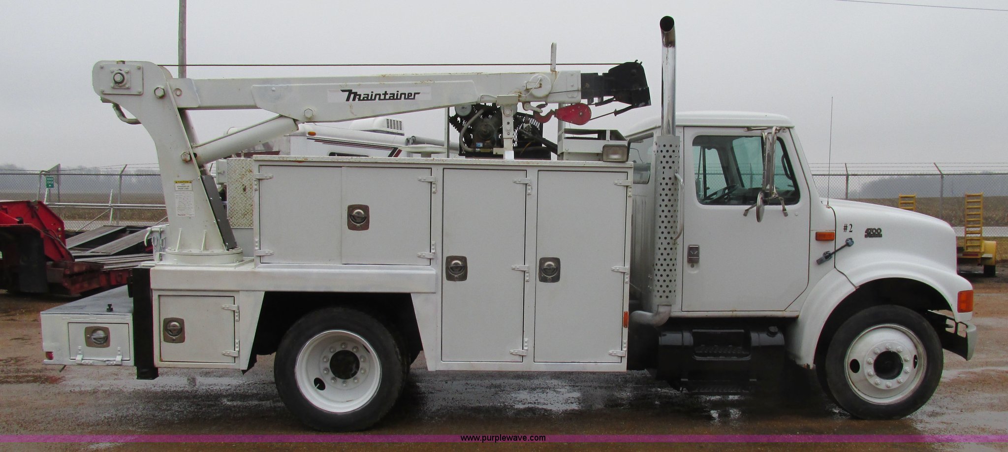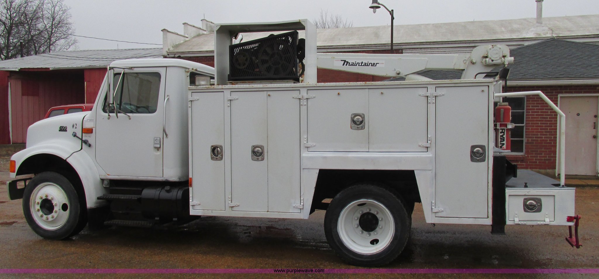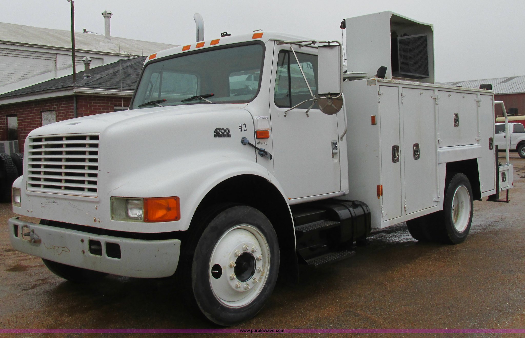 Purple Wave is selling a used Service Truck in Illinois. This item is a 1997 International 4700 service truck with the following: 307,948 miles on odometer, International DT466E 7.6L L6 diesel engine, Allison automatic transmission, Push button, AC and heat, Cruise, AM/FM/CD, Air suspension seat, Uniden CB radio, Maintainer M370 service bed, 11'L, Crane, 8,000 lbs capacity, Hydraulic operation, Serial 970701710528, Snatch block, Tethered remote, Hydraulic outriggers, Air hose reel, Air compressor, Front and rear work lights, Vented boxes, 26" x 94" rear work platform, Fire extinguisher, Dual fuel tanks, 45 and 25 gallon capacities, Hydraulic brakes, 225/70R22.5 tires, GVW 26,000 lbs, One passenger side box rusted
